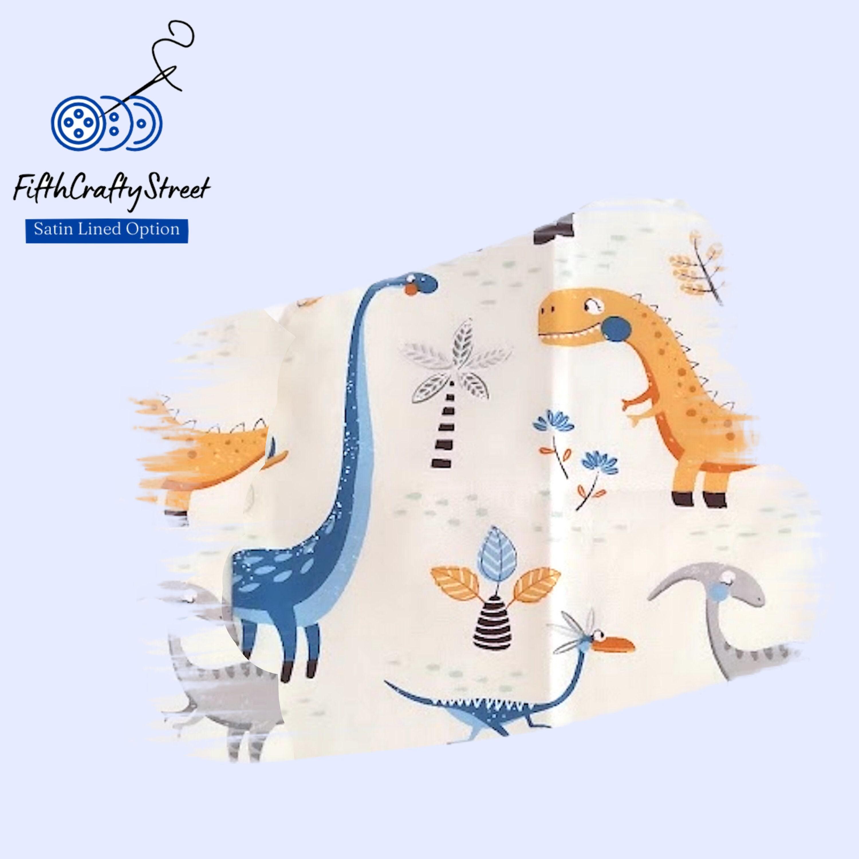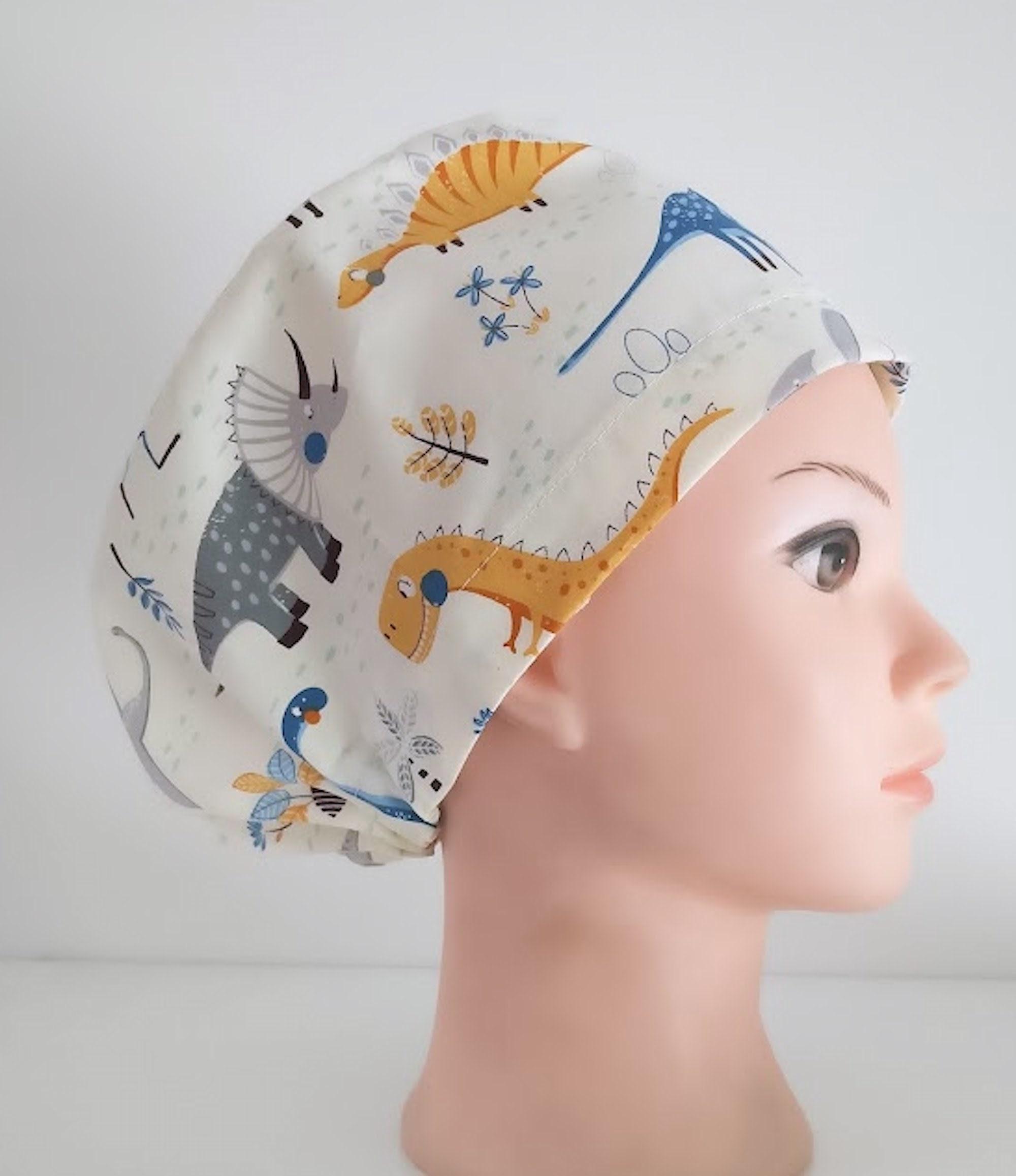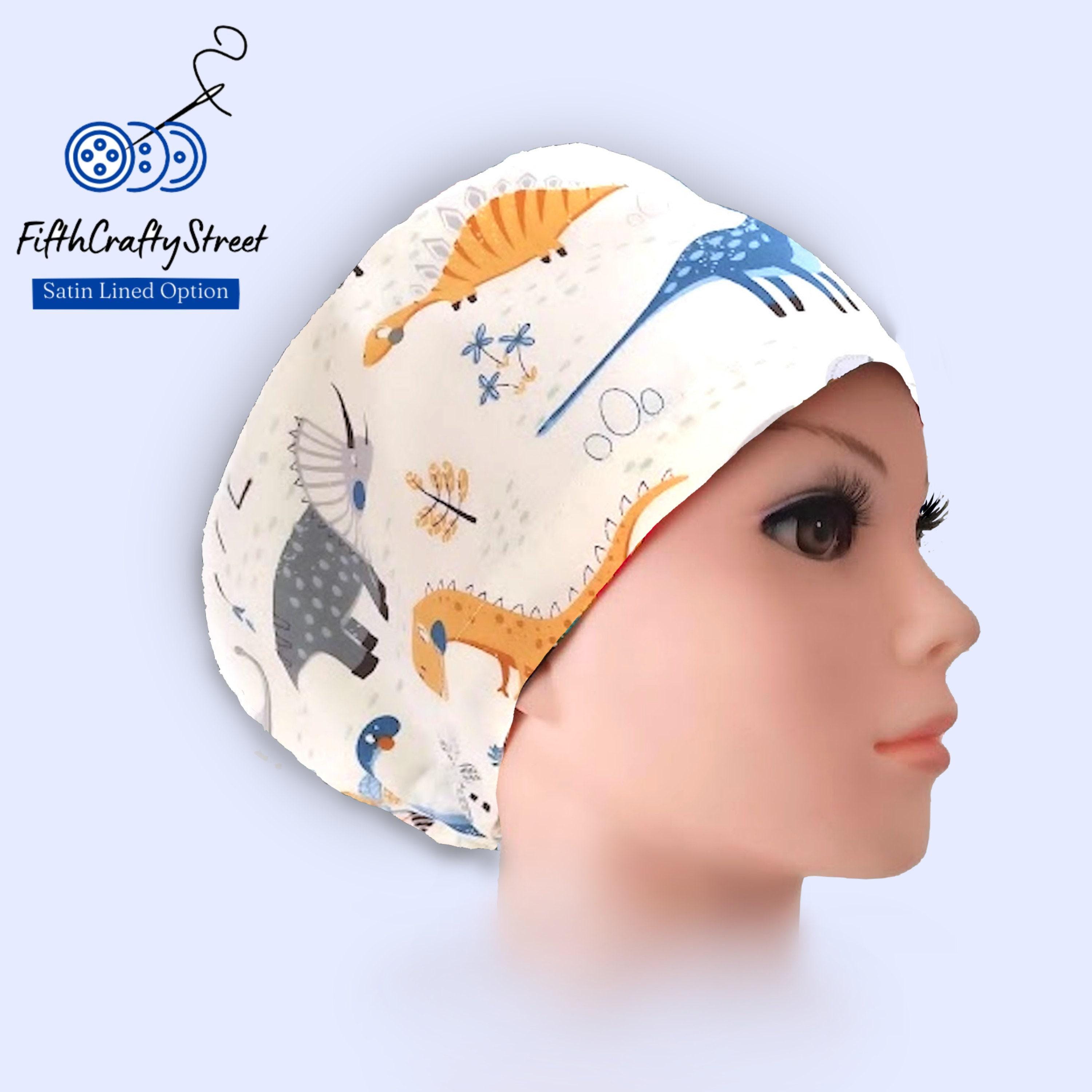 Euro Scrub Caps - Adjustable - Satin Lined option - Dinosaurs cream