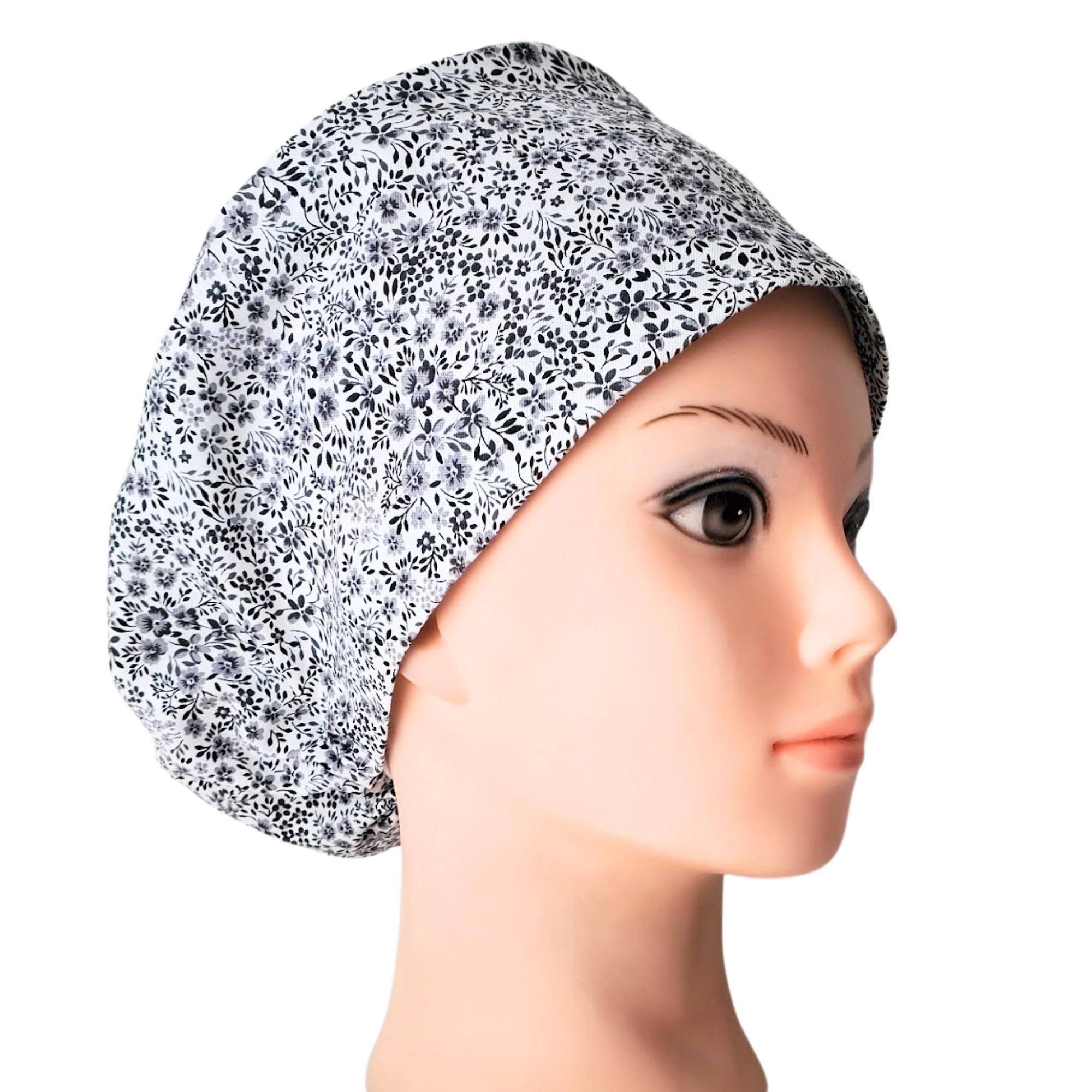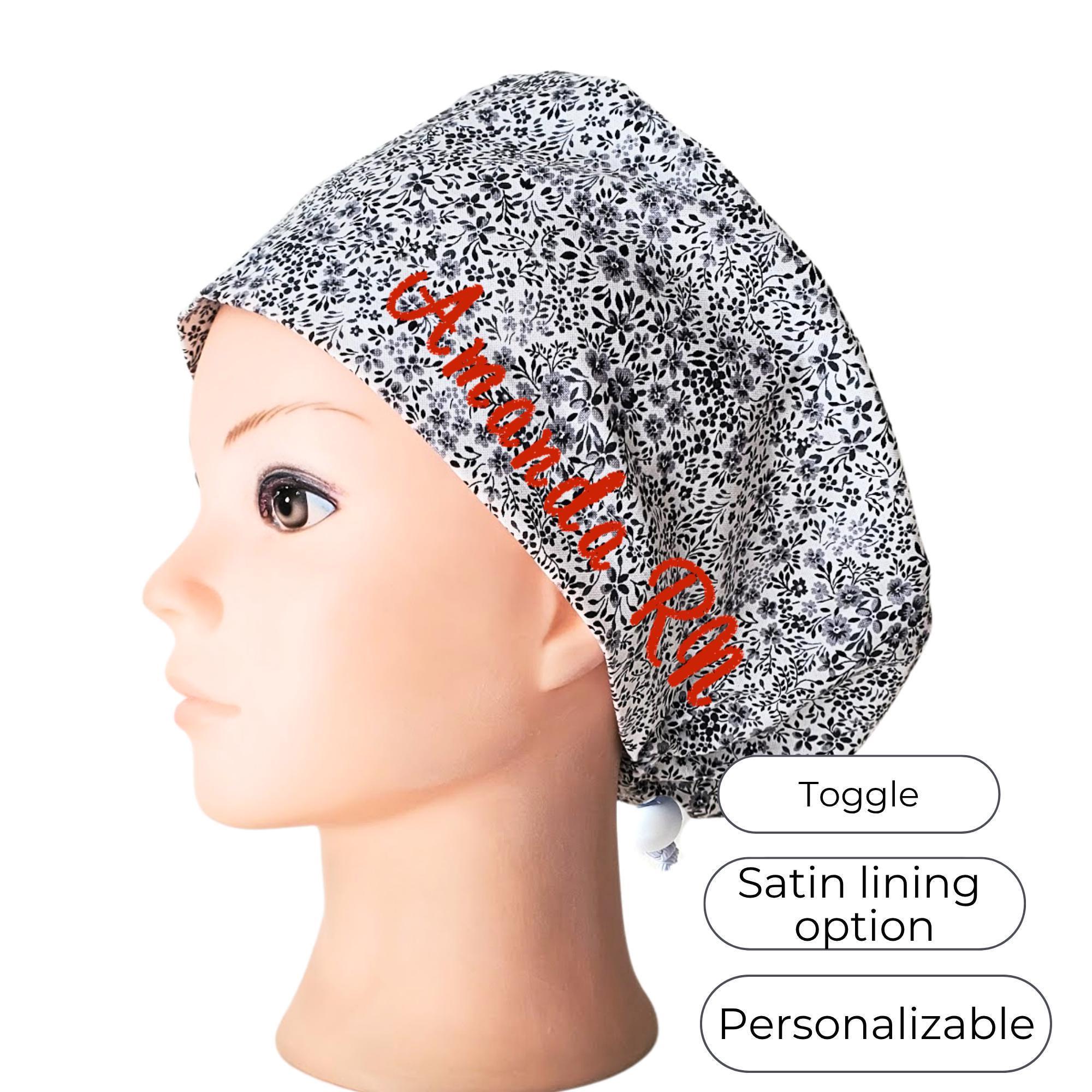 Euro Scrub Cap for Women - Floral black- Adjustable - Satin Lined option