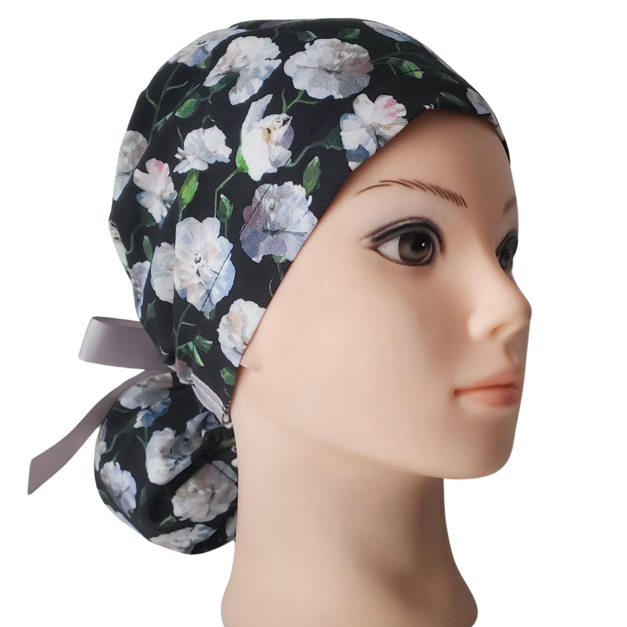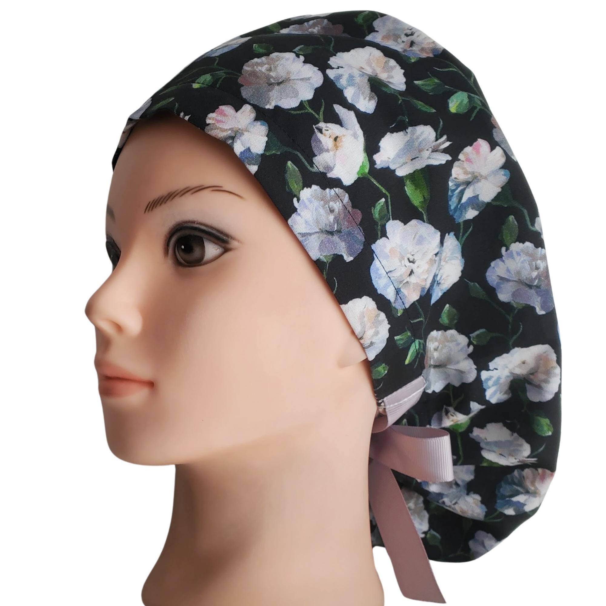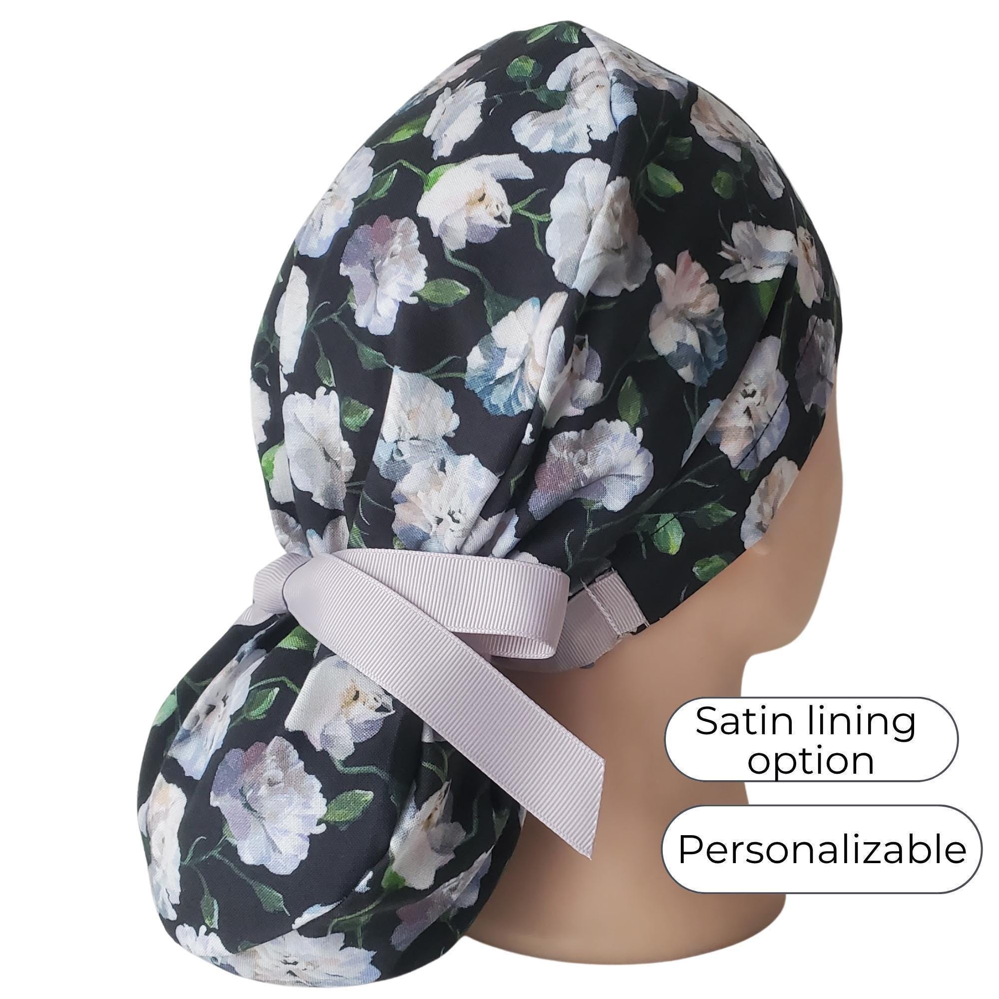 Surgical Cap Ponytail Style with Satin Lining and Personalization: Floral