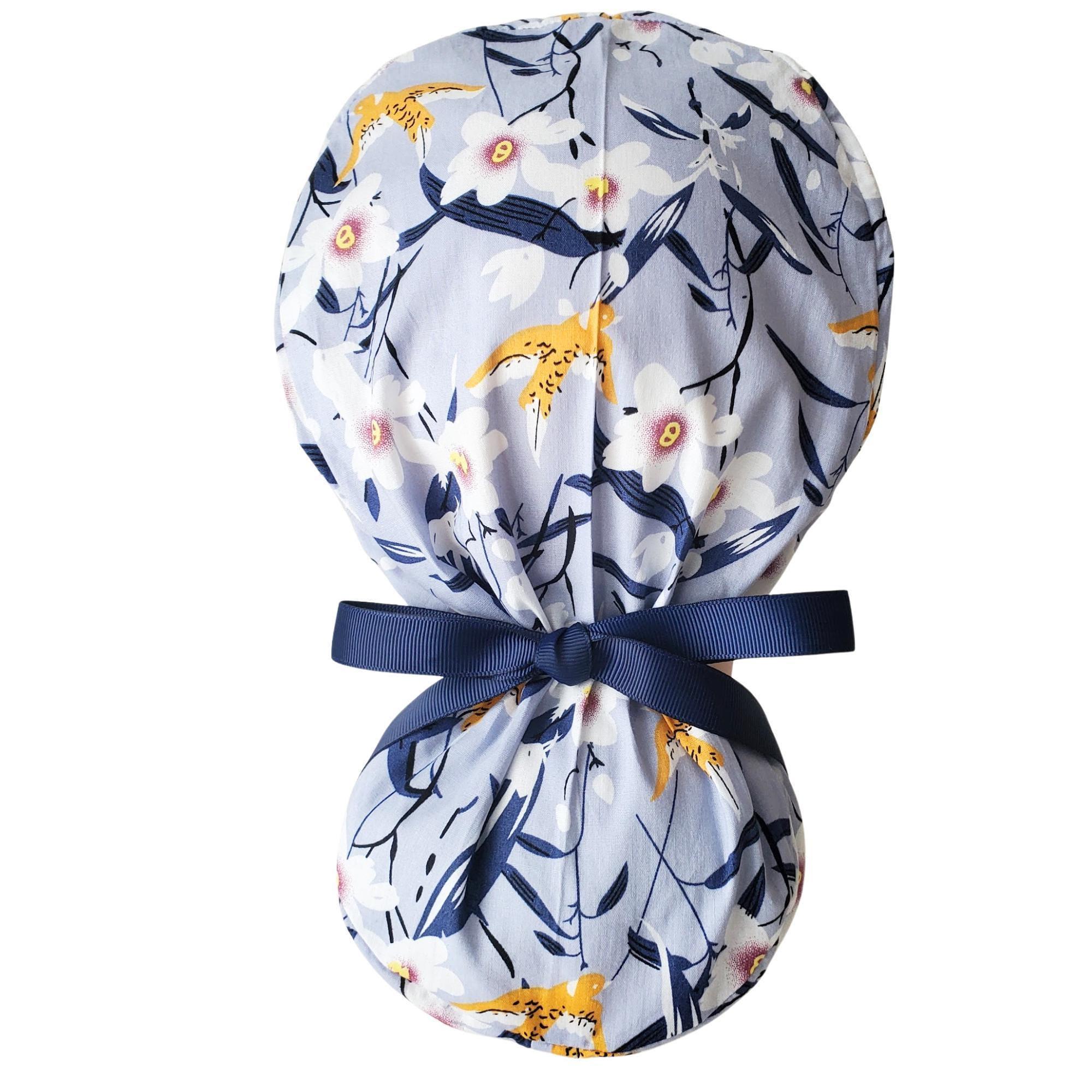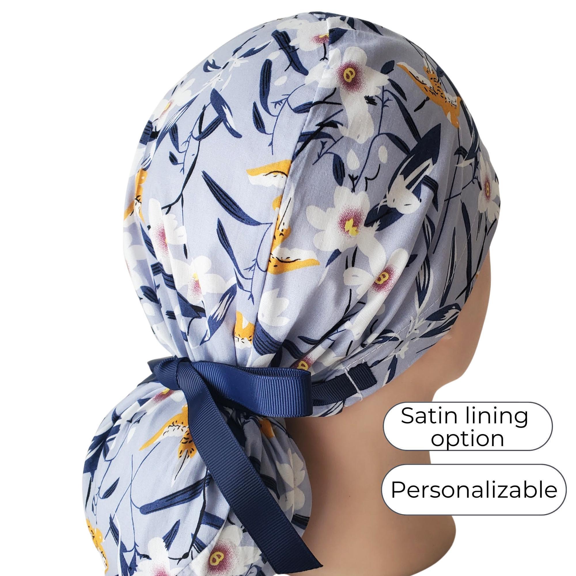 Floral Ponytail Scrub Cap: Gray Cotton Surgical Hat with Satin Lining