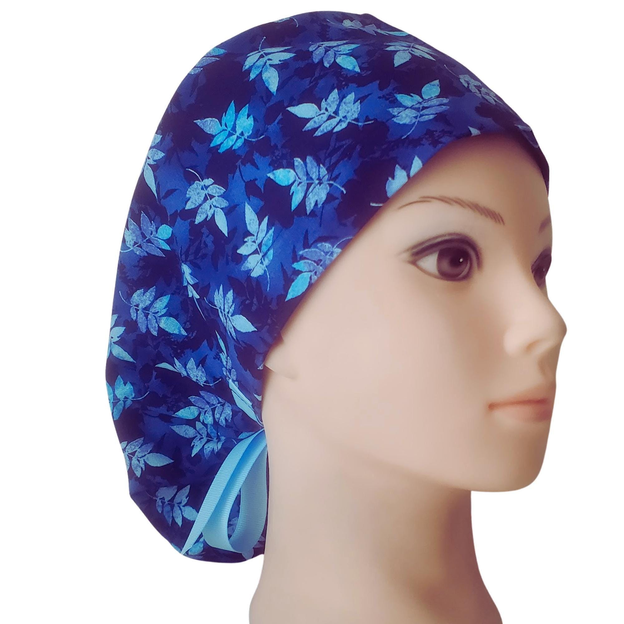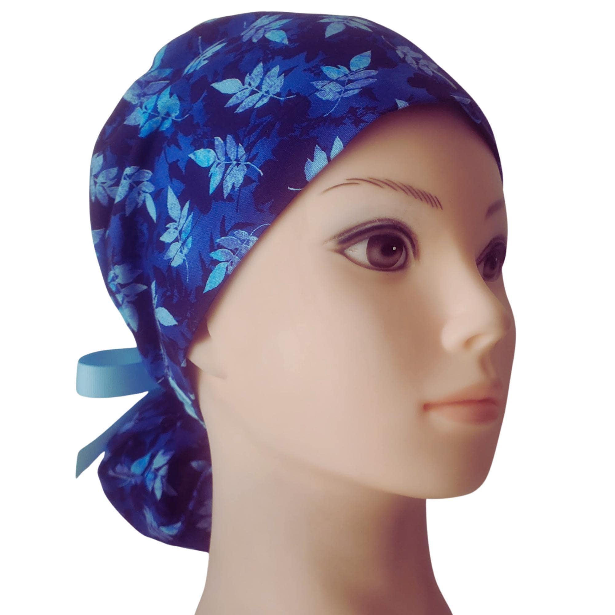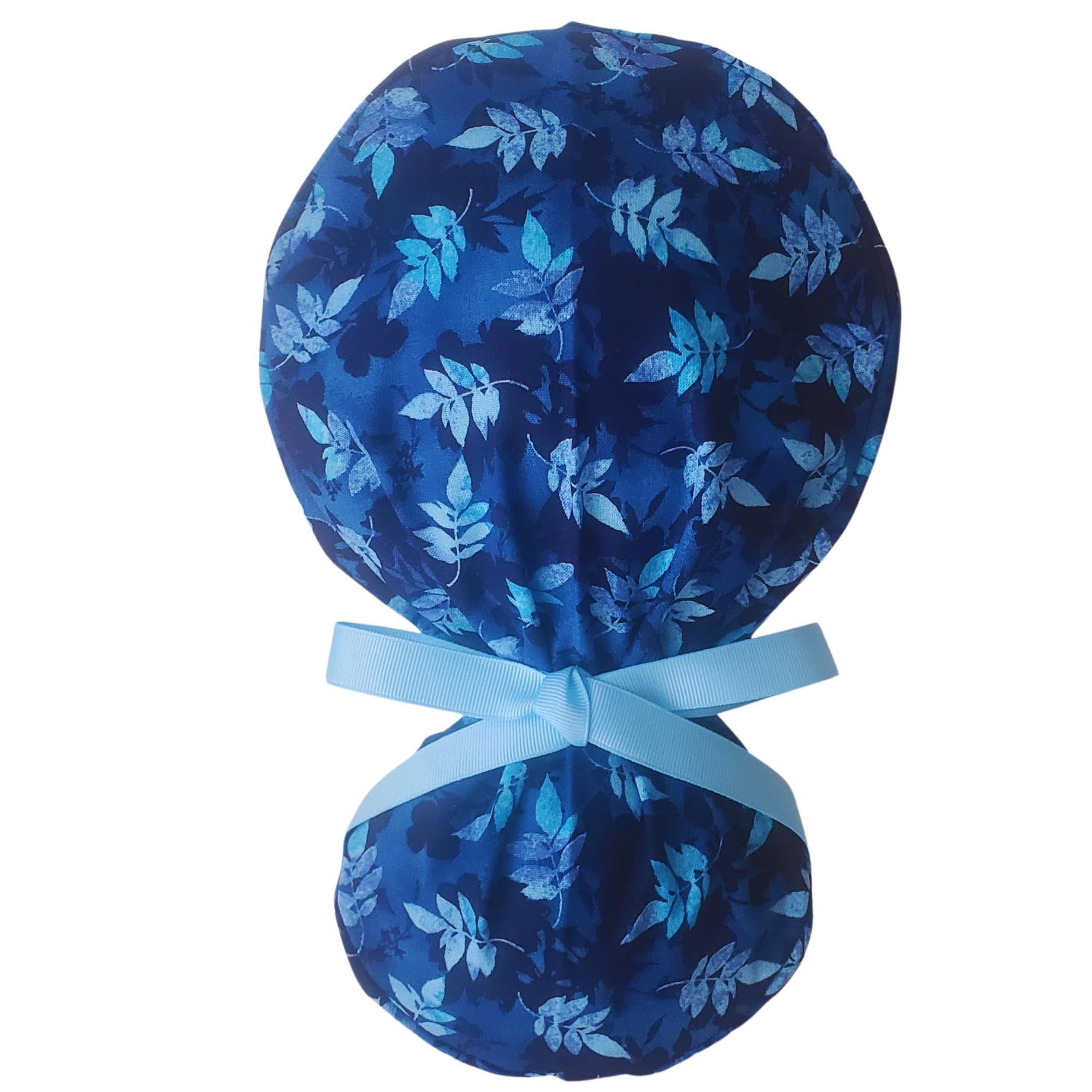Blue Pinnate - Ponytail Scrub Cap for Women - Surgical Cap Satin Lined Option -