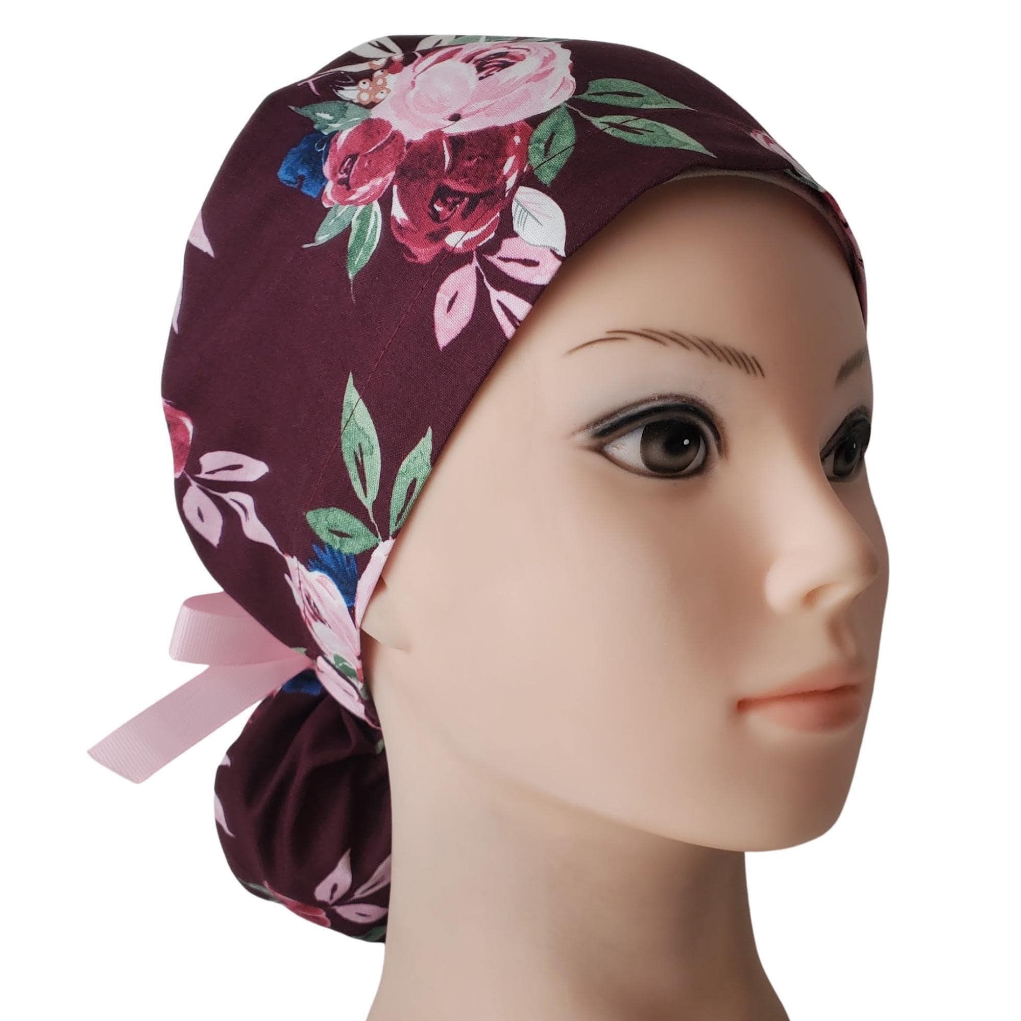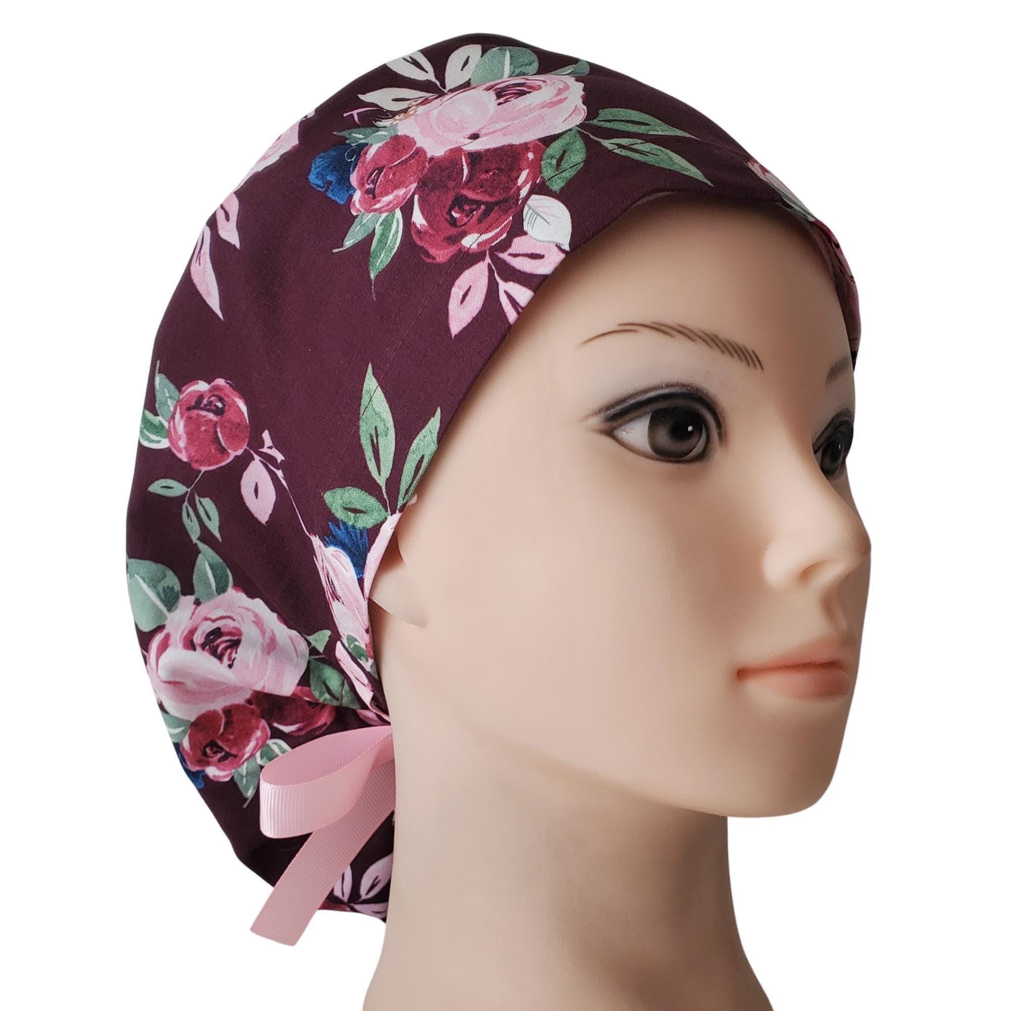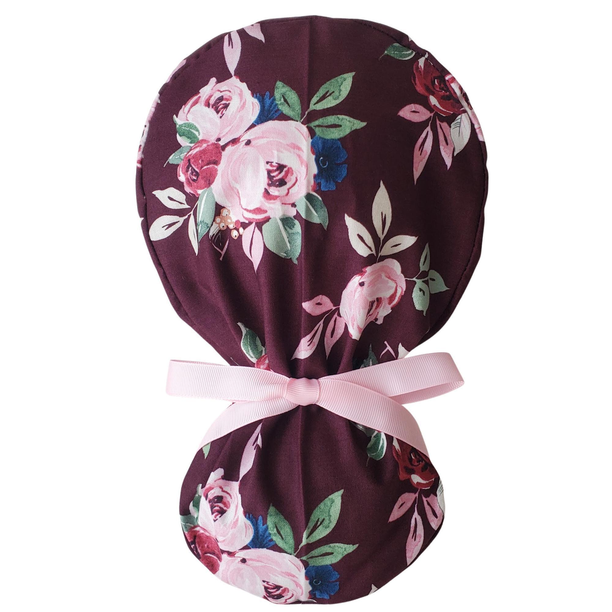Ponytail Scrub Cap for Women with Satin Lining and Buttons Option: Berry Rose