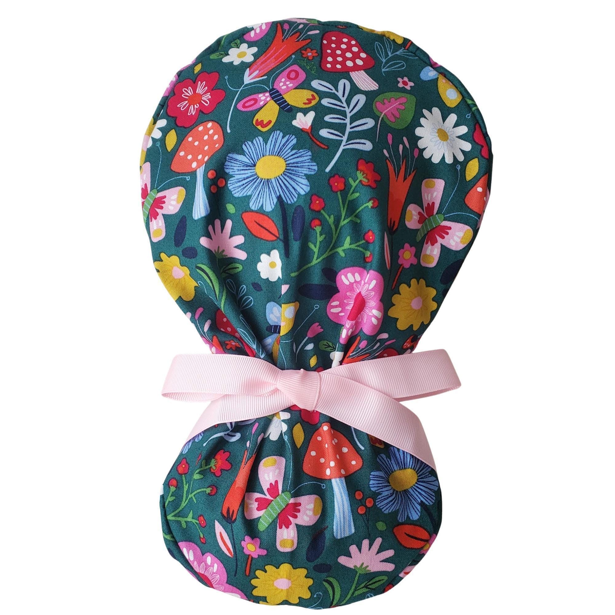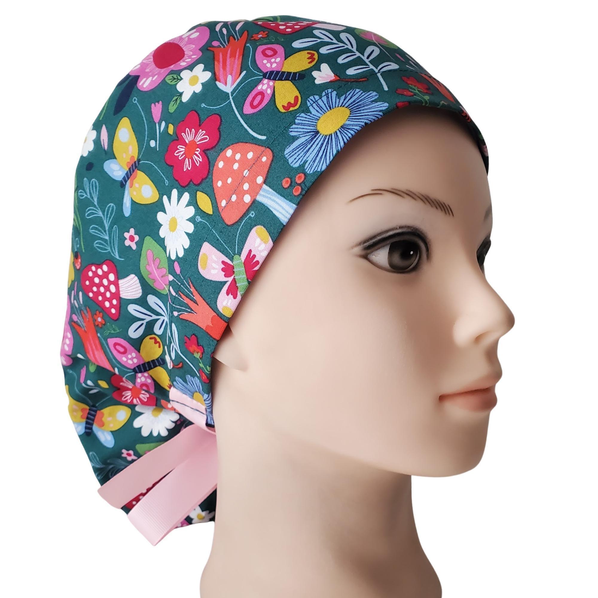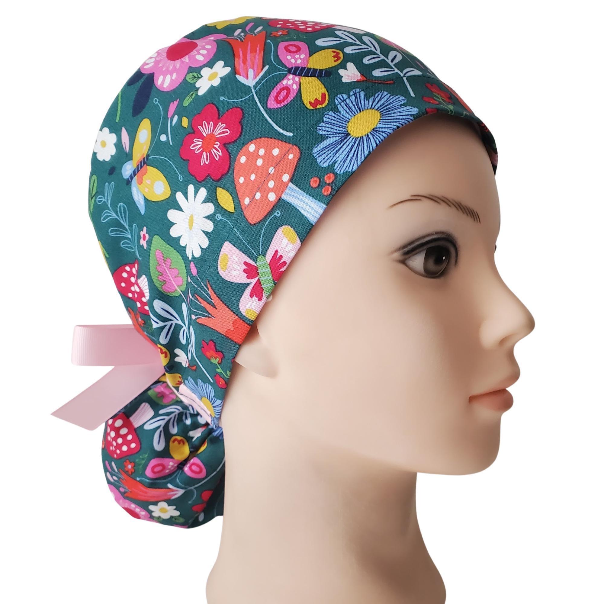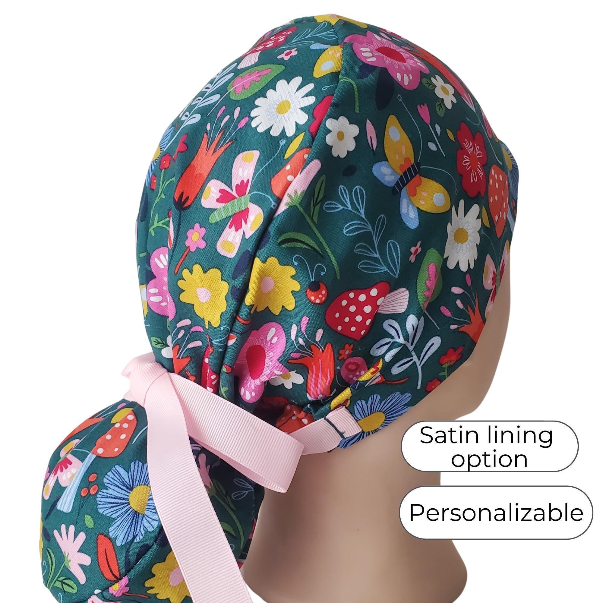 Scrub Cap Ponytail Style, Teal Garden, Mushroom: Satin Lining and Personalization Option