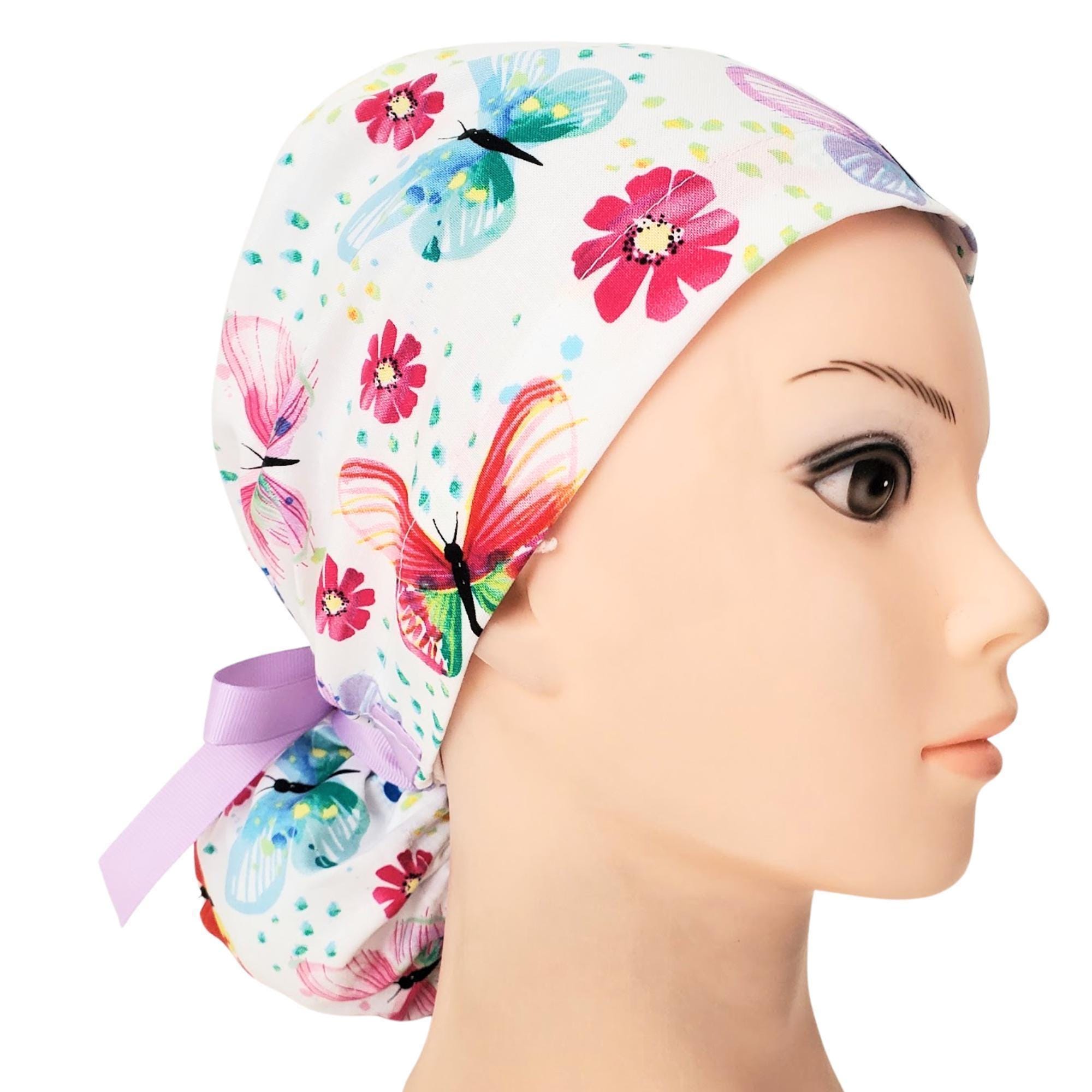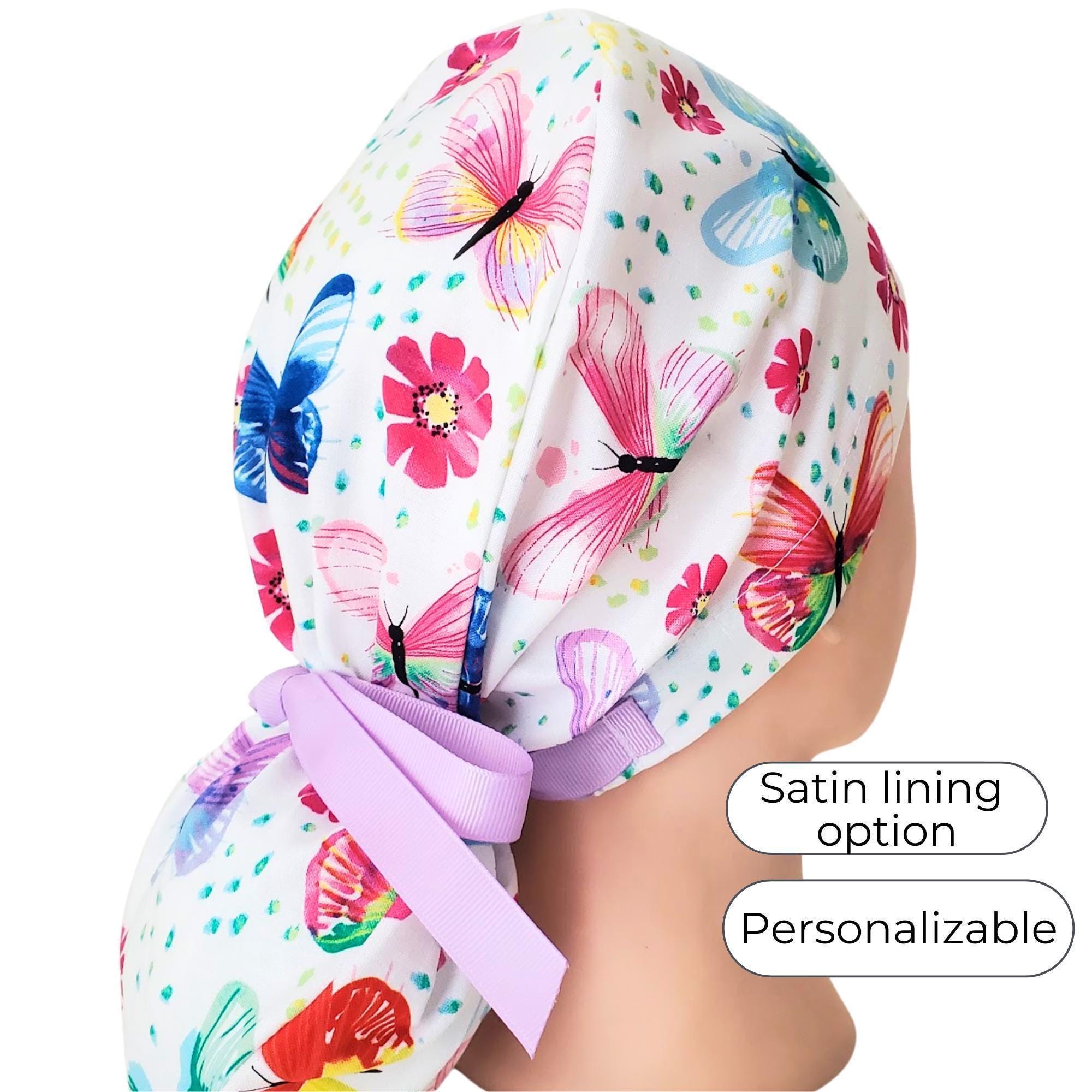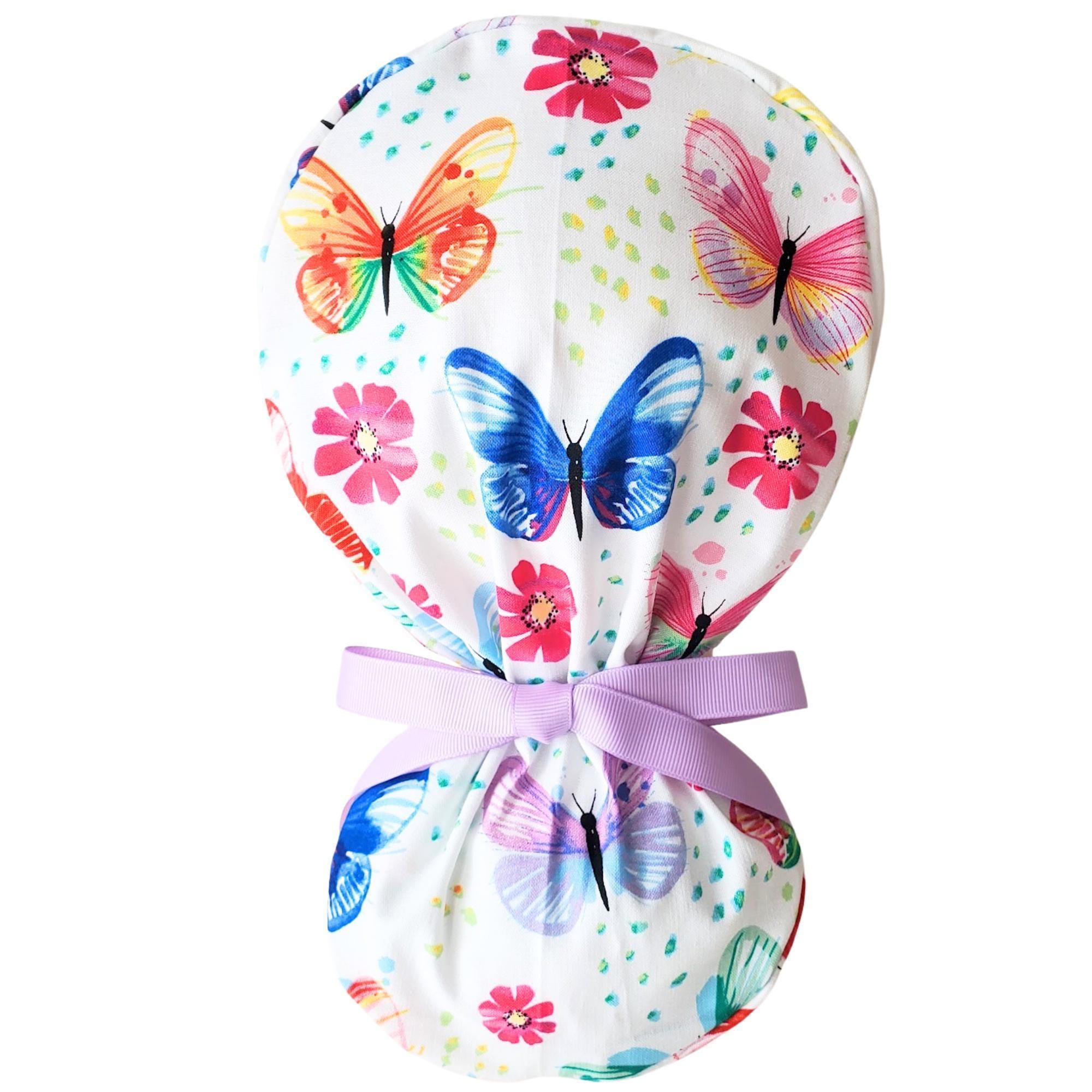 Ponytail Scrub Cap Satin Lined โ handmade surgical scrub hat designed for women with long hair. Featuring butterfly blossom pink and blue with a matching lavender ribbon tie, this cap is stylish, functional, and perfect for long shifts.