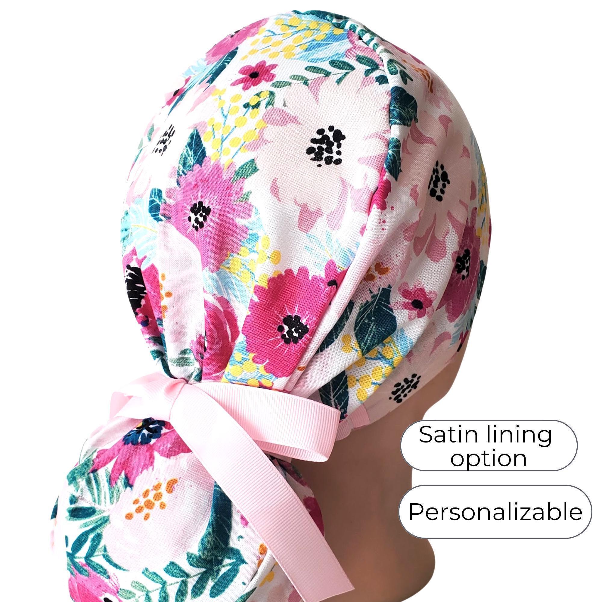 Ponytail Scrub Cap in Pink Floral Print – handmade surgical scrub hat designed for women with long hair. Featuring large pink blossoms with teal and yellow accents, this cap blends fresh floral style with comfort and secure fit for long shifts.