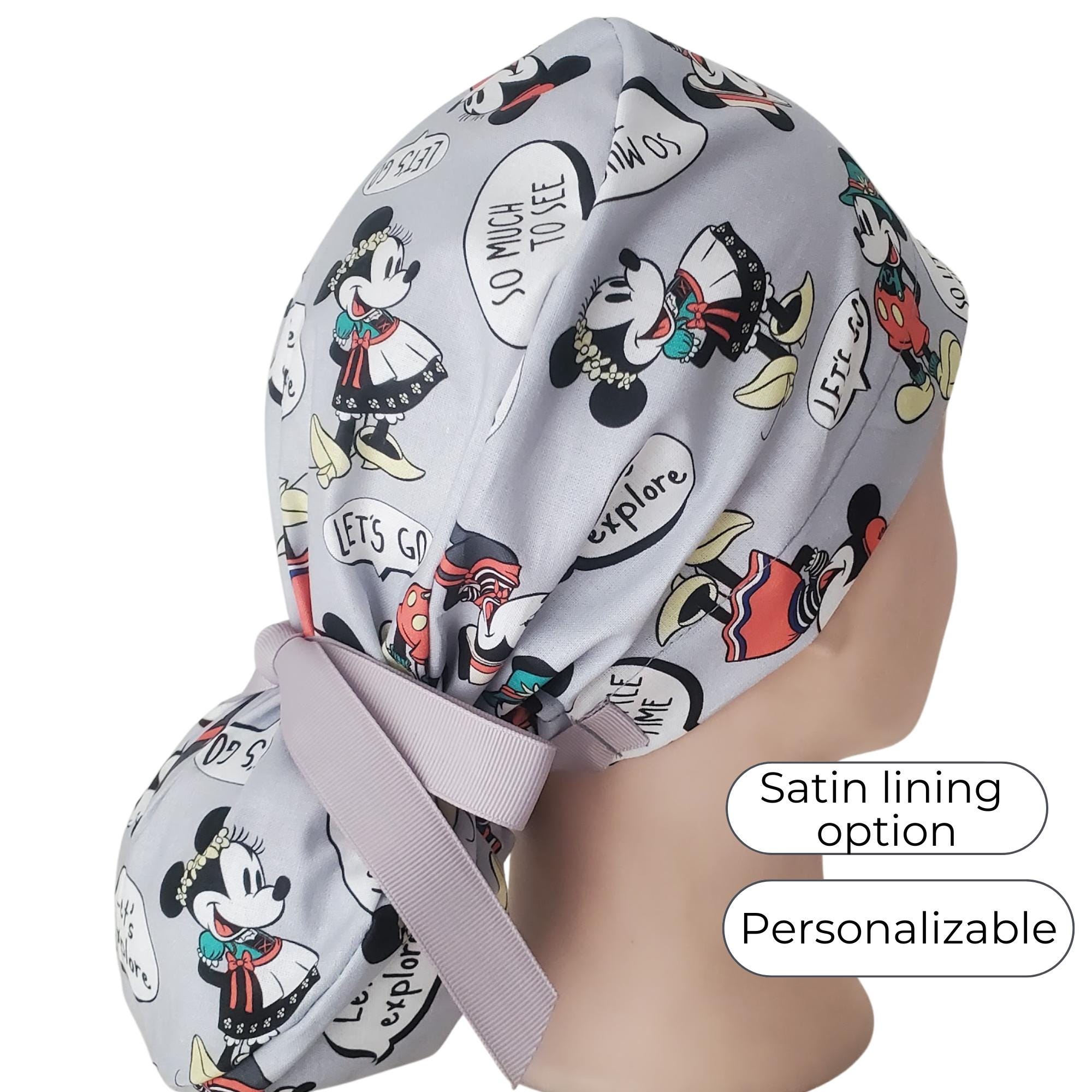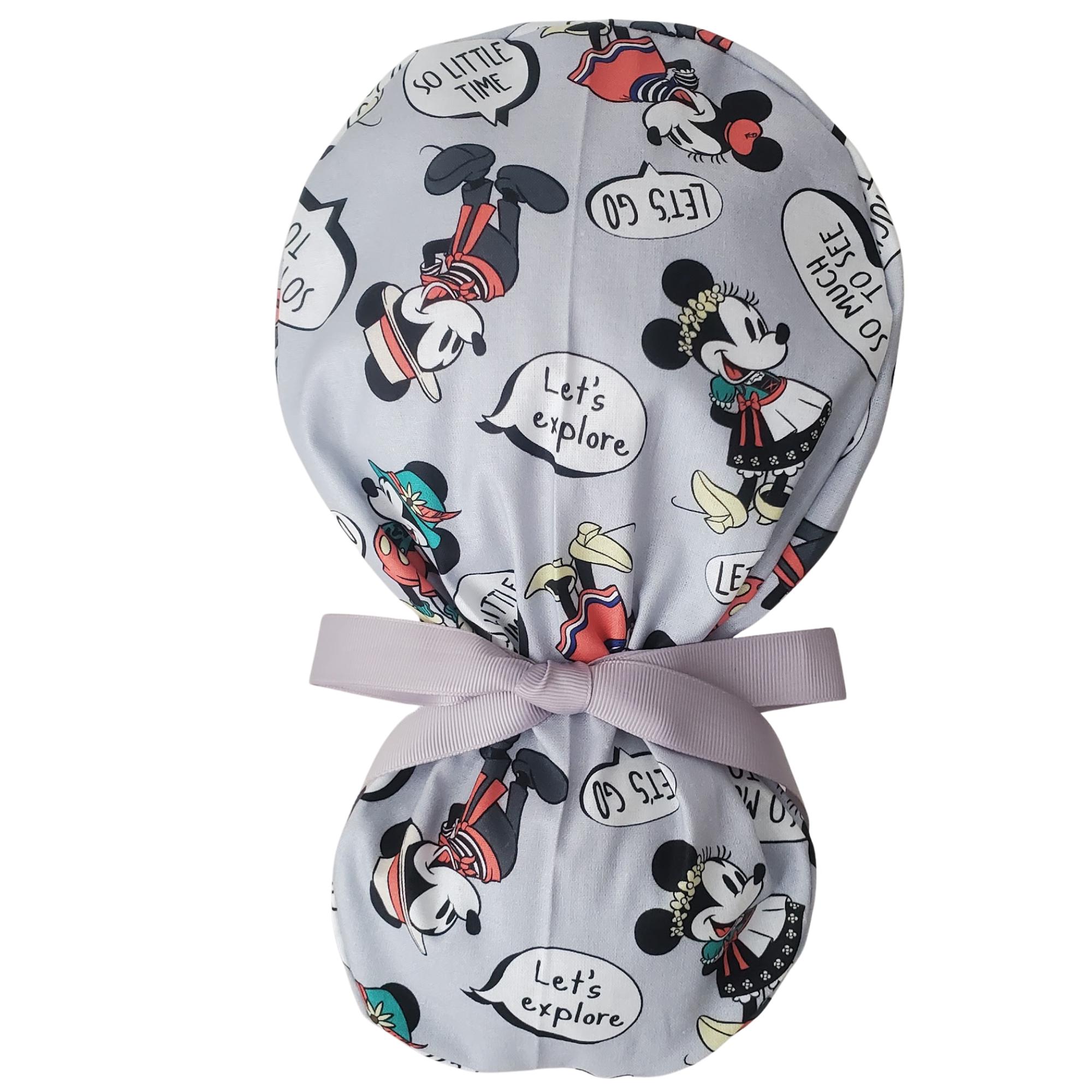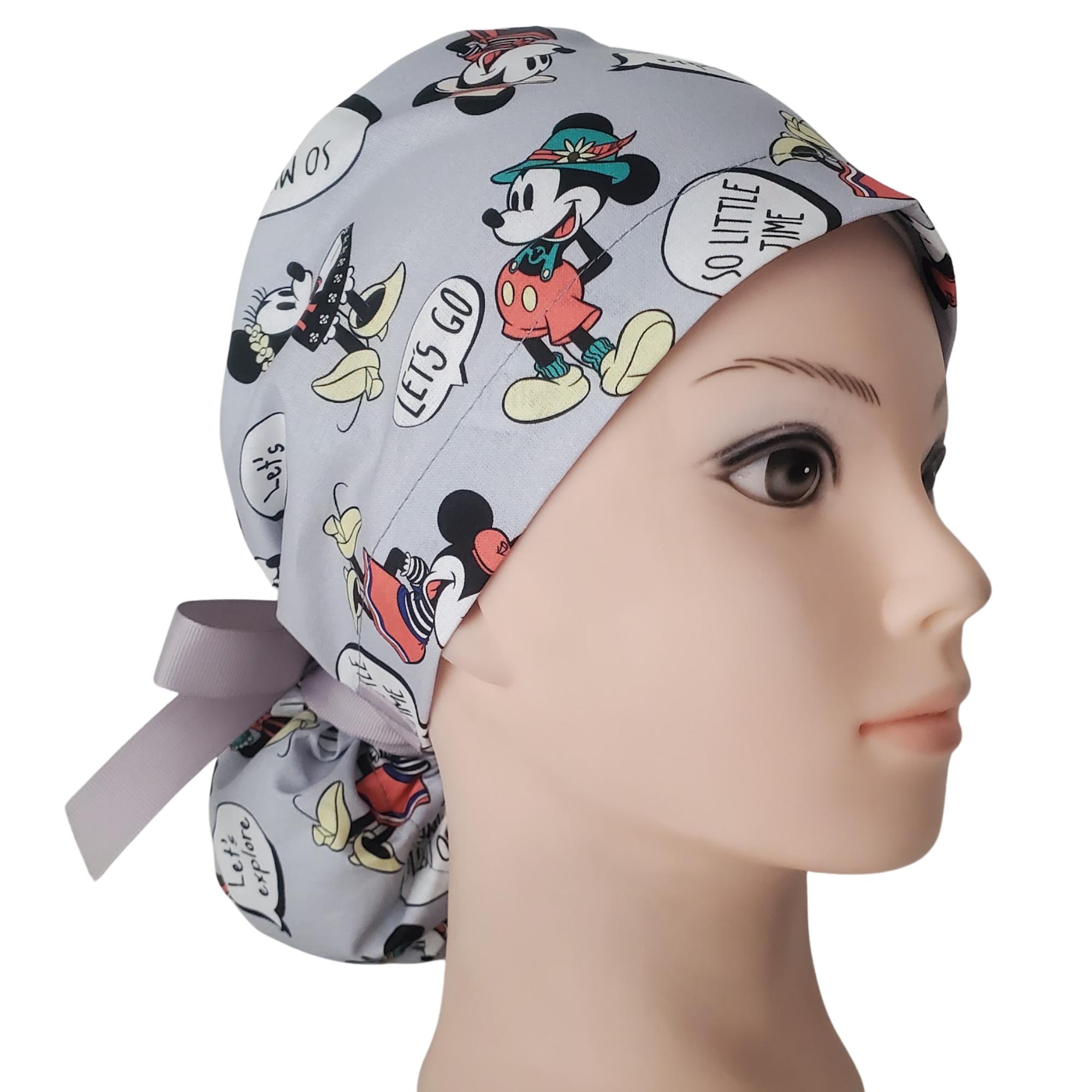 Ponytail Scrub Cap in Cartoon Print β handmade surgical scrub hat designed for women with long hair. Featuring a fun cartoon character design on denim-style fabric with a bold red ribbon, this cap combines playful style with comfort and practicality for long shifts.