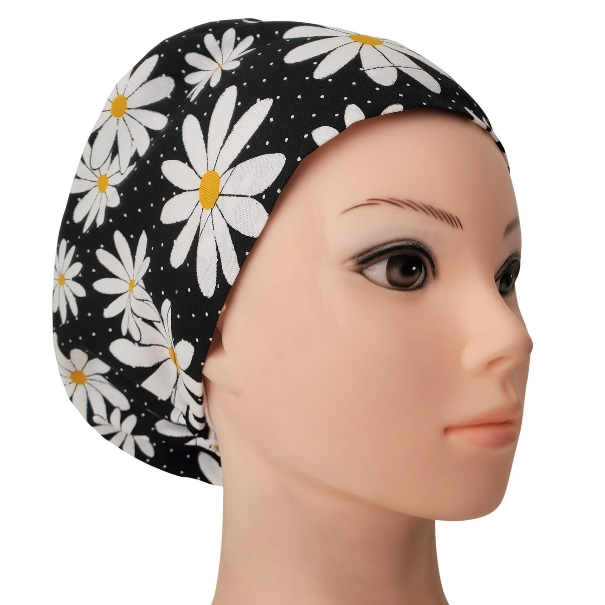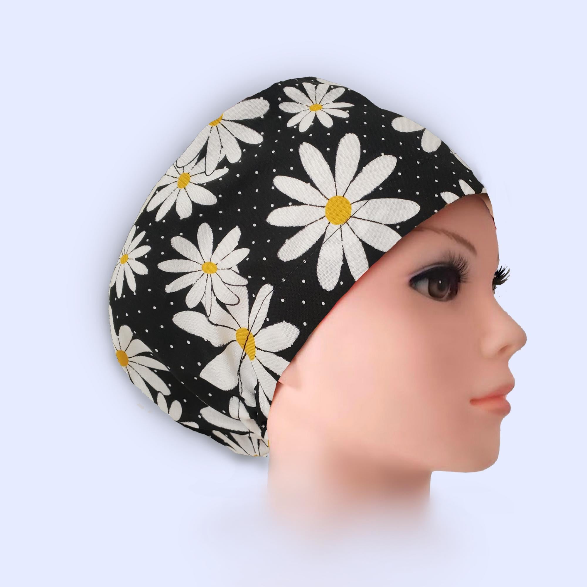 Euro Scrub Cap in Black Daisy Floral Print β handmade surgical scrub hat designed for women. This sleek euro style lies flat against the head, making it perfect for short to medium hair. Featuring bold white daisies with golden centers on a black background, this cap blends cheerful style with comfort and practicality.