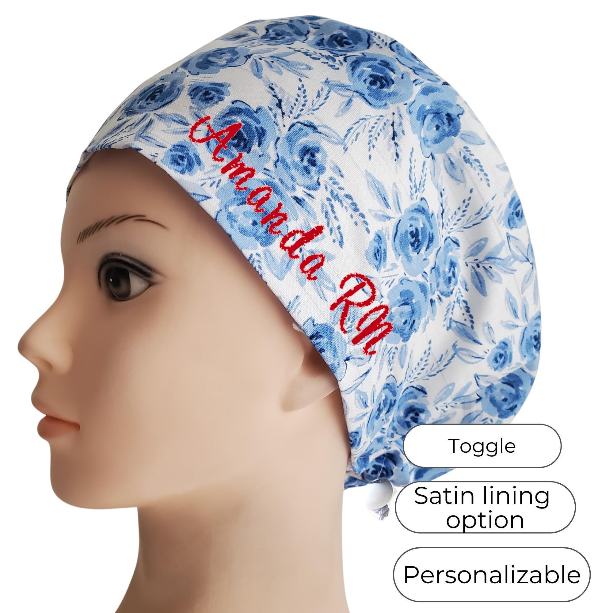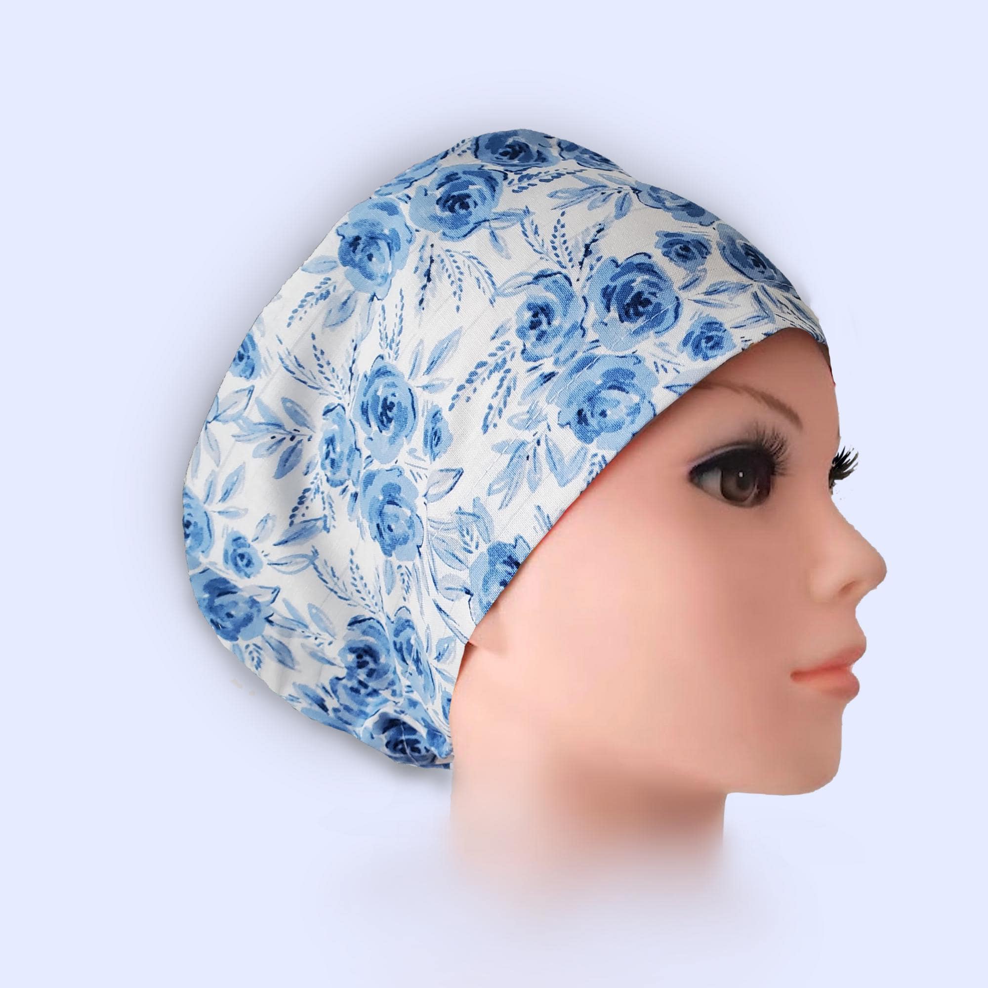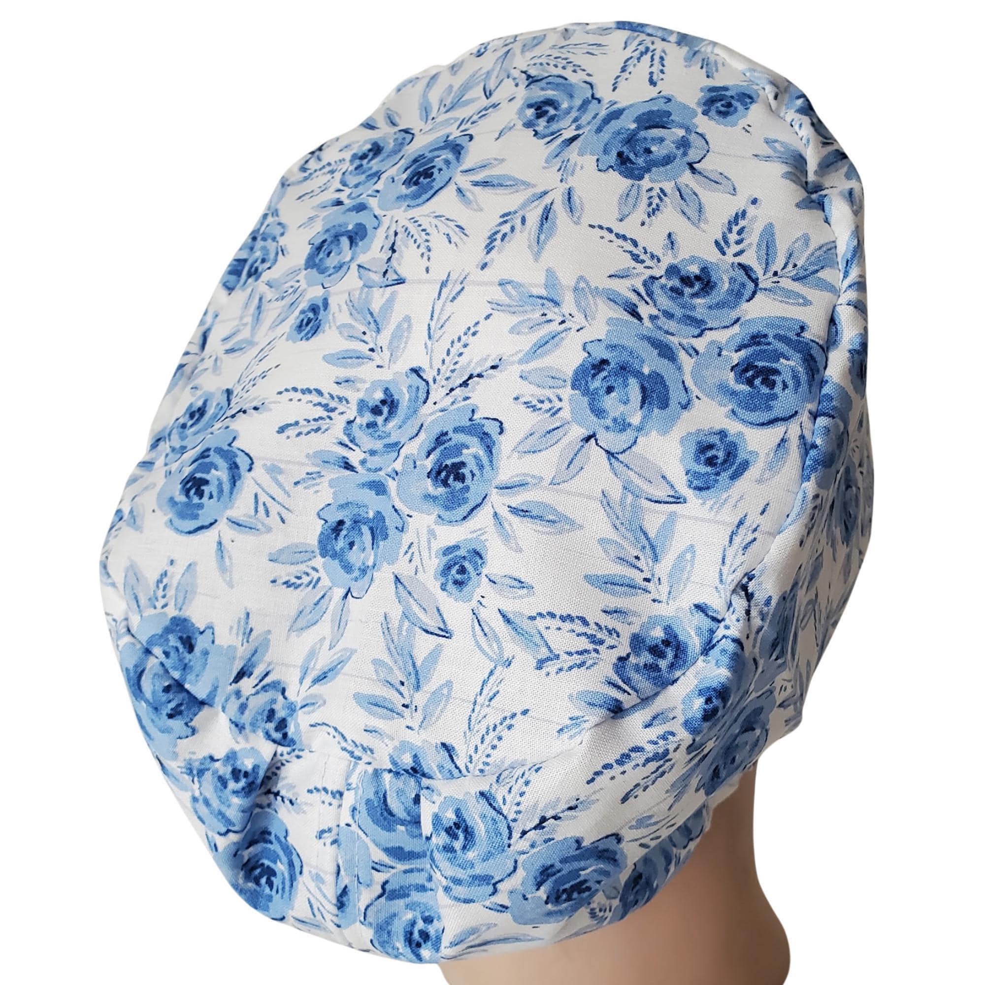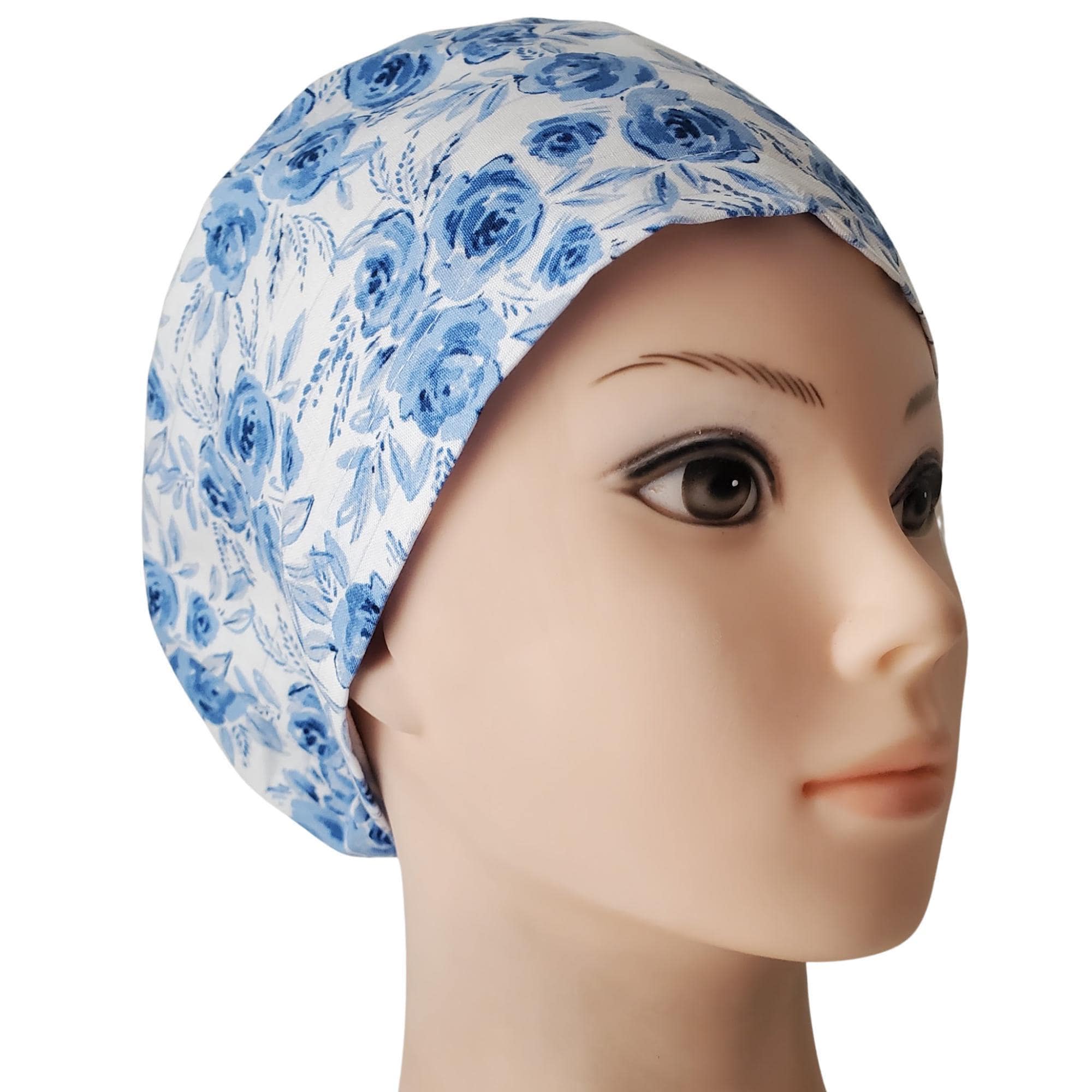 Euro Scrub Cap in Blue Rose Print β handmade surgical scrub hat designed for women. This sleek euro style lies flat against the head, making it perfect for short to medium hair. Featuring bold white daisies with golden centers on a black background, this cap blends cheerful style with comfort and practicality.