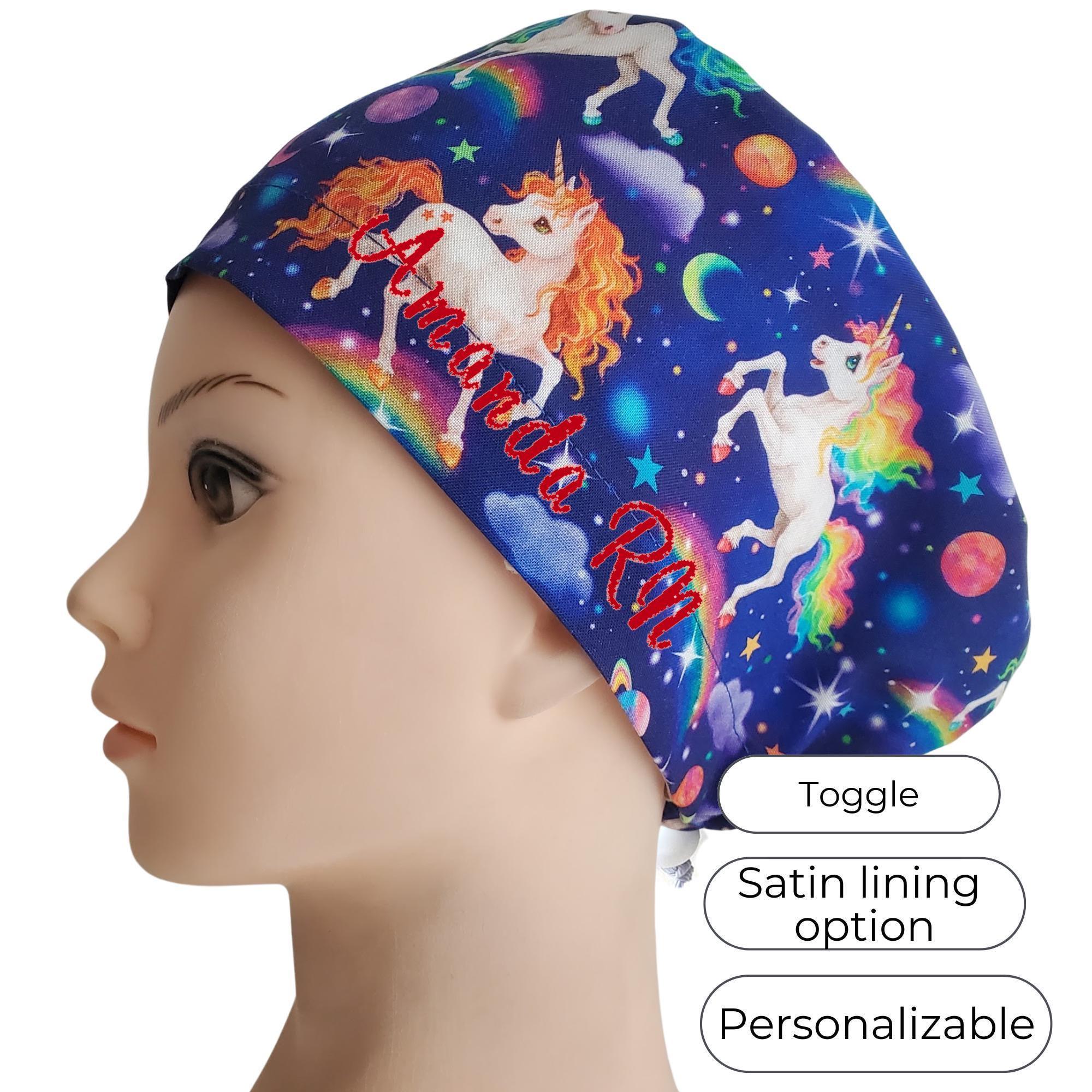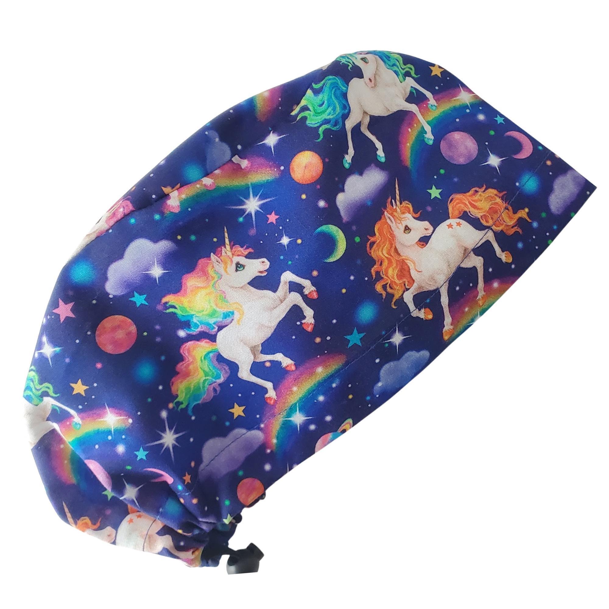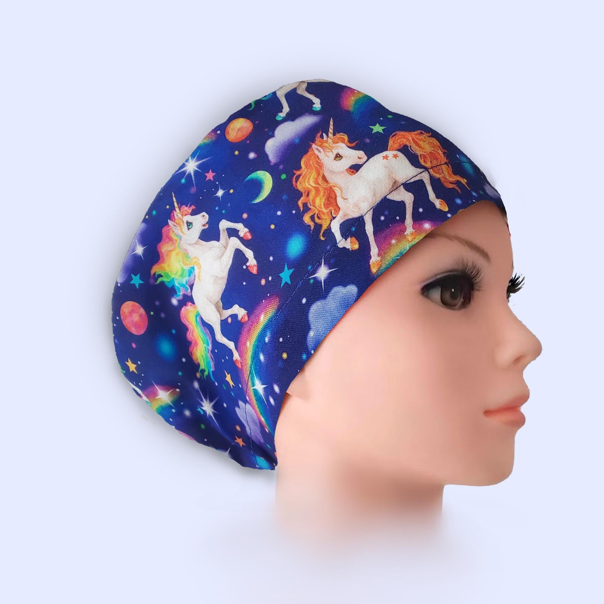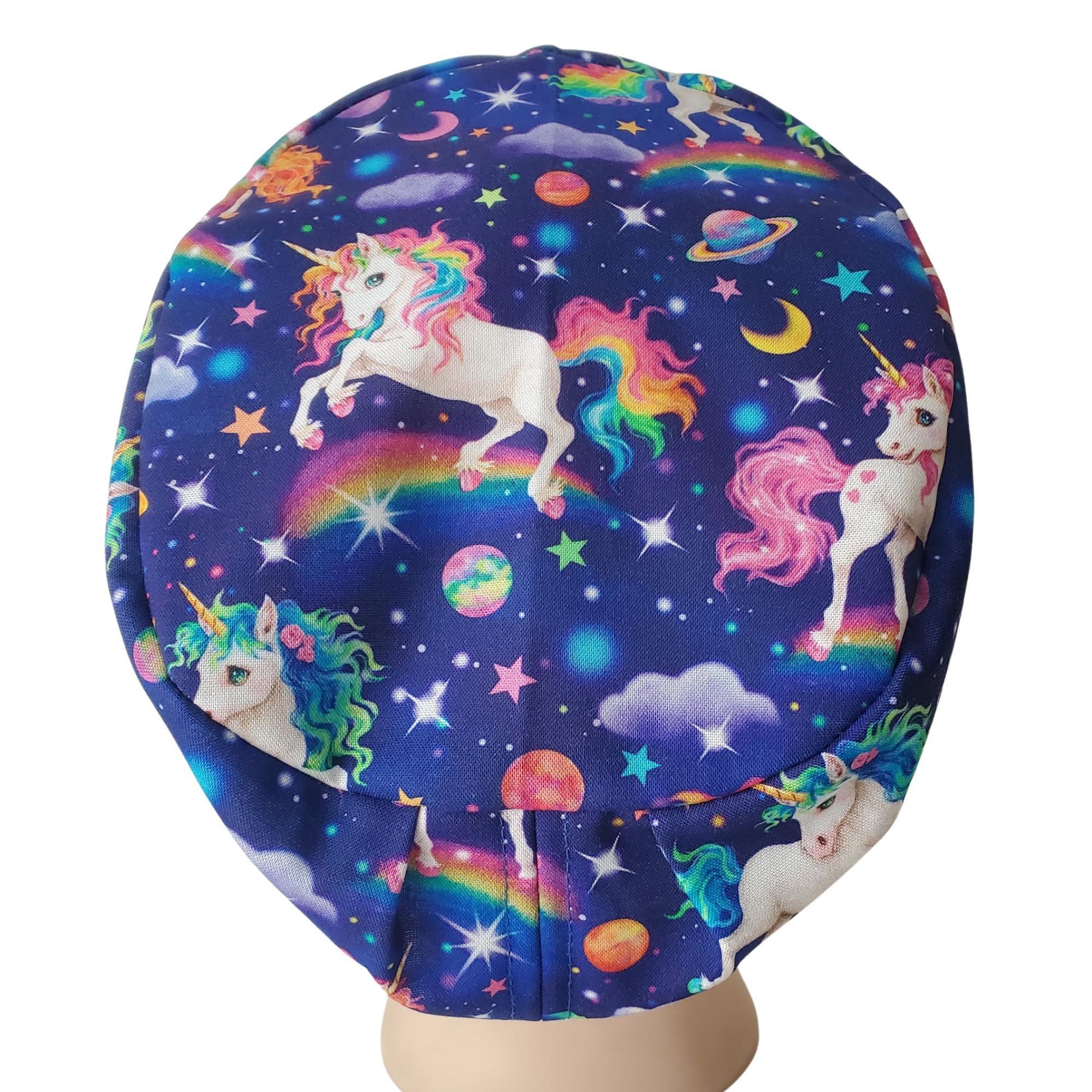 Euro Scrub Cap in Unicorn Galaxy Print β handmade surgical scrub hat designed for women. This euro style sits flat against the head, making it perfect for short to medium hair. With magical unicorns, rainbows, and galaxy stars on a deep navy background, this cap brings fantasy style to your workday while keeping you comfortable through long shifts.