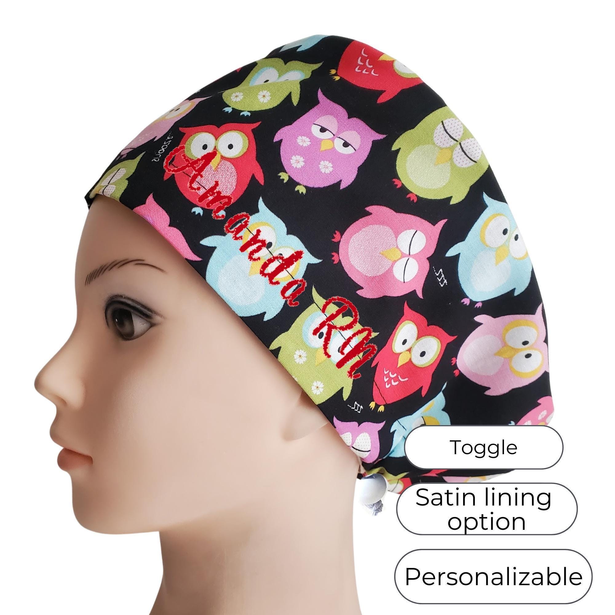Brighten your workday with this handmade euro scrub hat featuring a colorful owl design, perfect for nurses, doctors, and medical students who appreciate both style and function. Crafted with a breathable 100% cotton fabric and an optional silky satin lining, this scrub cap keeps hair protected and frizz-free during long shifts. The flat euro style fit lies comfortably against short to medium hair, combining a polished look with playful charm.