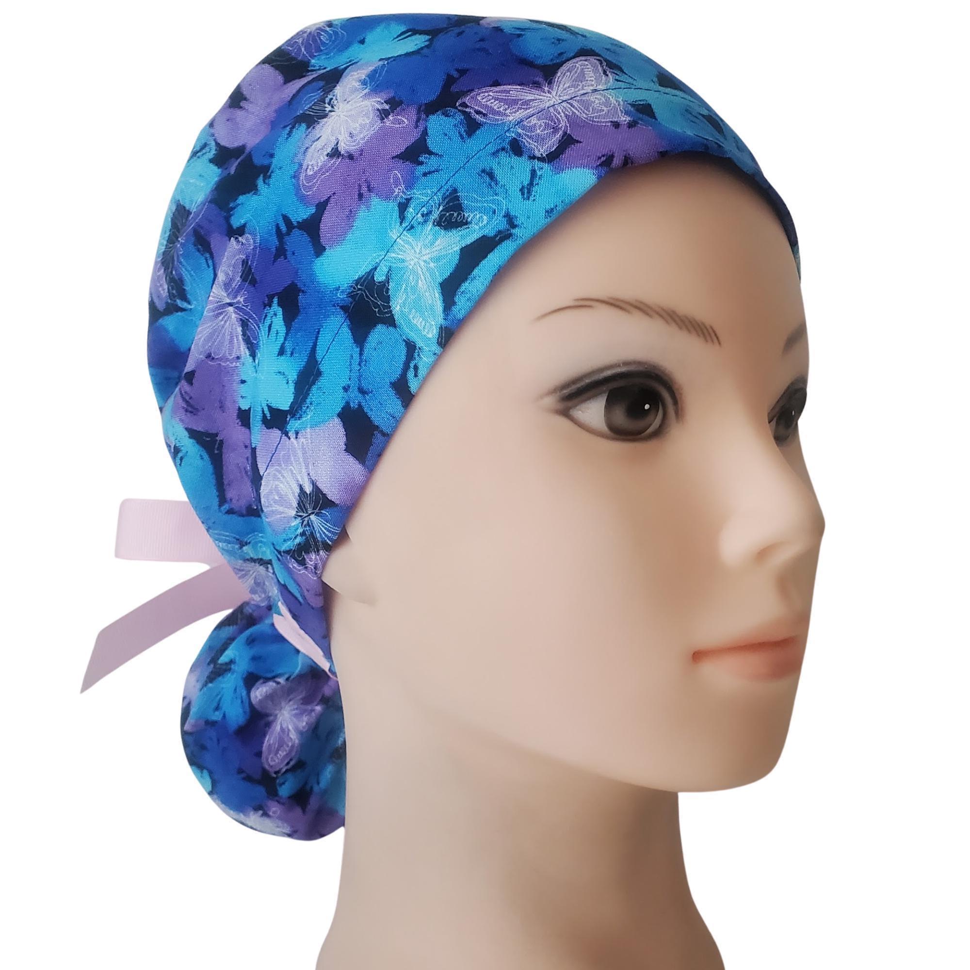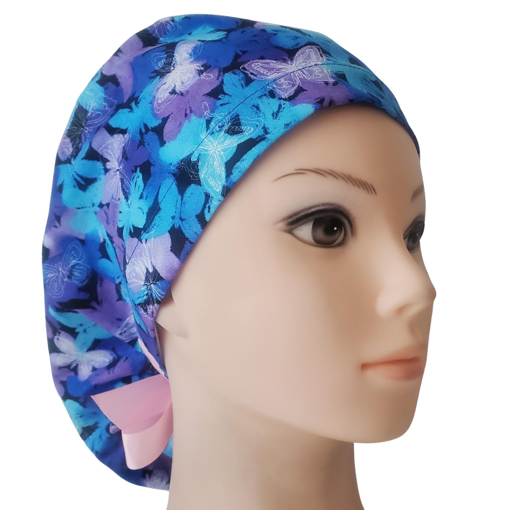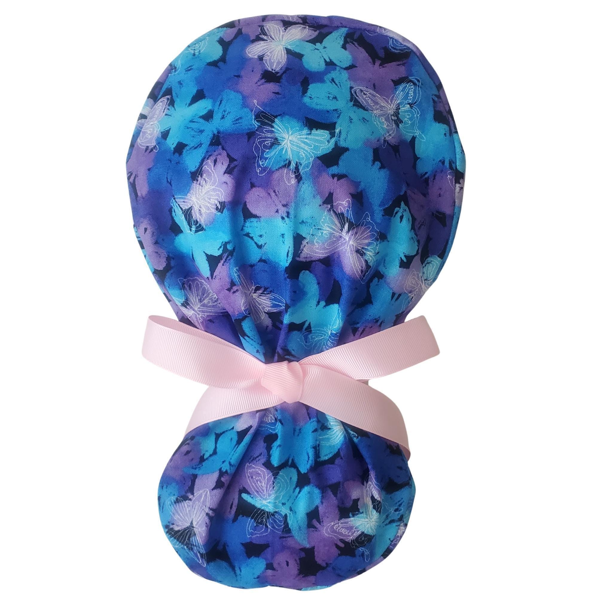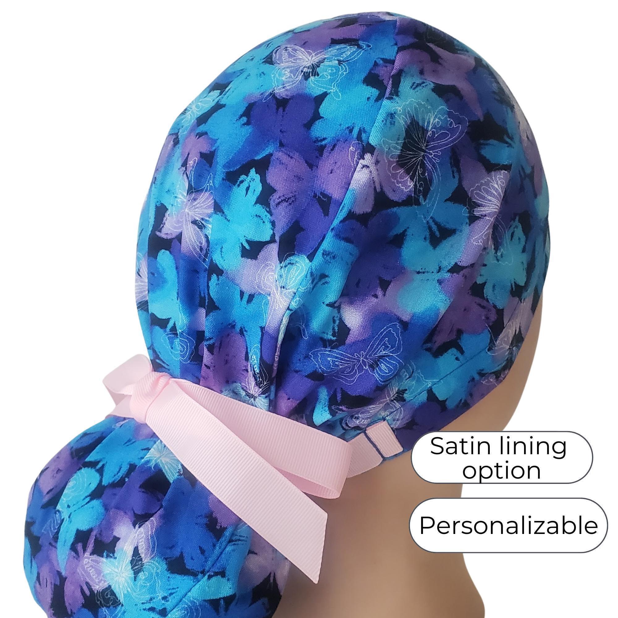 Show your vibrant style at work with this Butterfly Ponytail Scrub Cap. Featuring a lively mix of blue, purple, and indigo shades with delicate butterfly outlines, this scrub hat combines beauty and practicality. The roomy ponytail pouch keeps long hair tucked away neatly, while the optional satin lining helps reduce breakage, frizz, and dryness during long shifts.