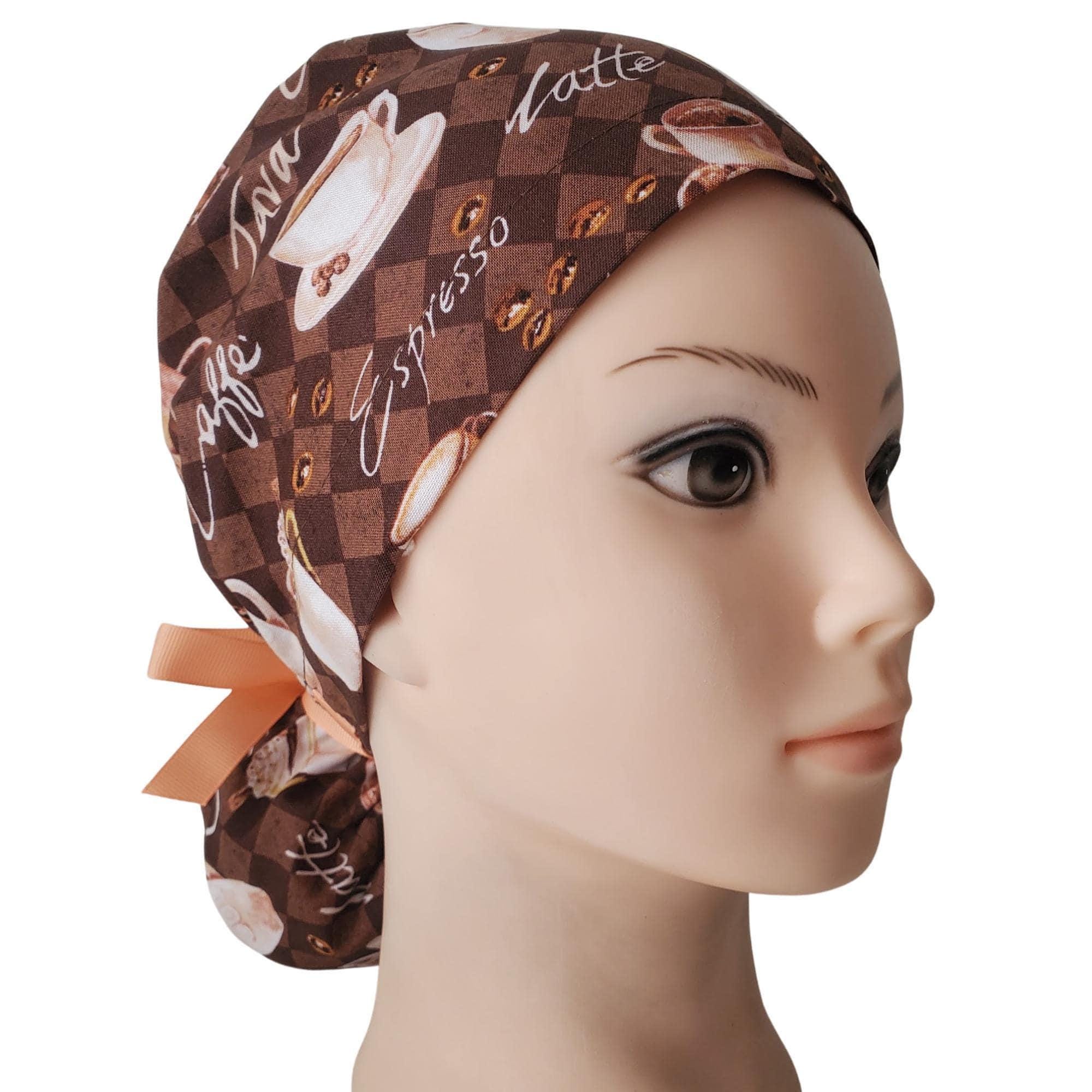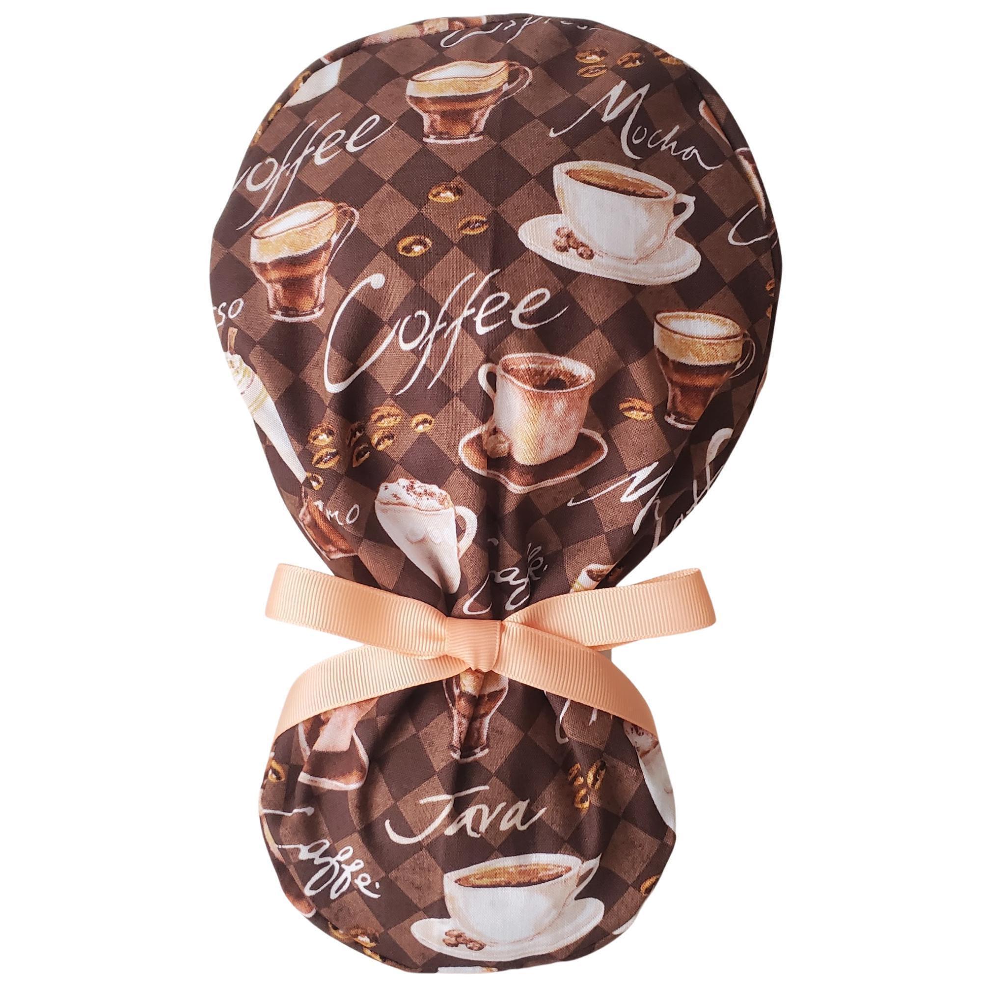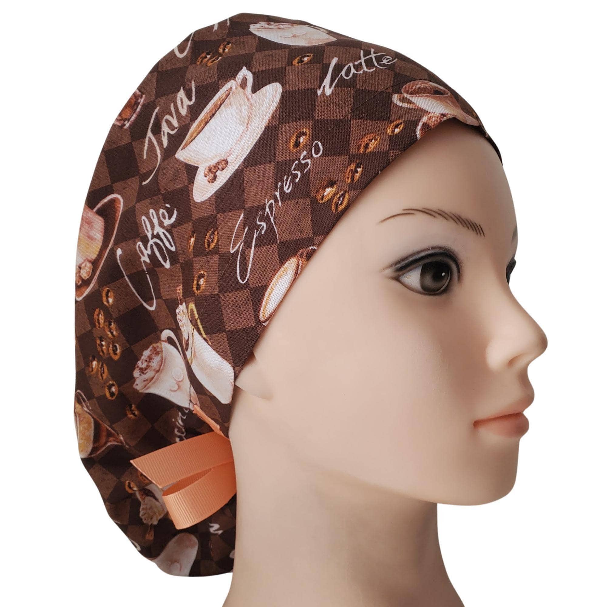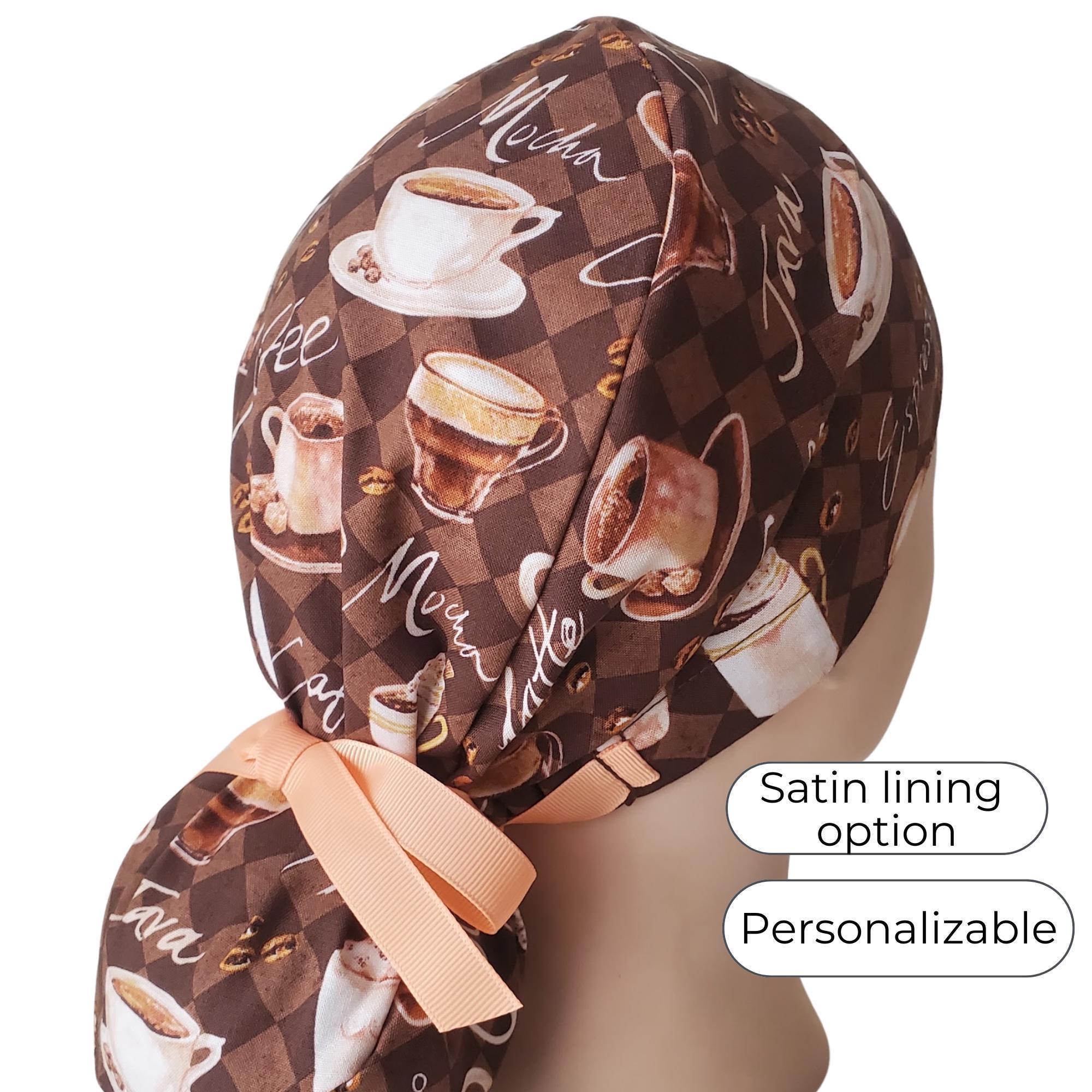 Fuel your workday style with this Coffee Lover Ponytail Scrub Cap. Featuring a cozy coffeehouse design with latte, espresso, and mocha cups in warm brown tones, this scrub hat is both fun and practical. The roomy ponytail pouch keeps long hair tucked away neatly, while the optional satin lining helps reduce breakage, frizz, and dryness during long shifts.