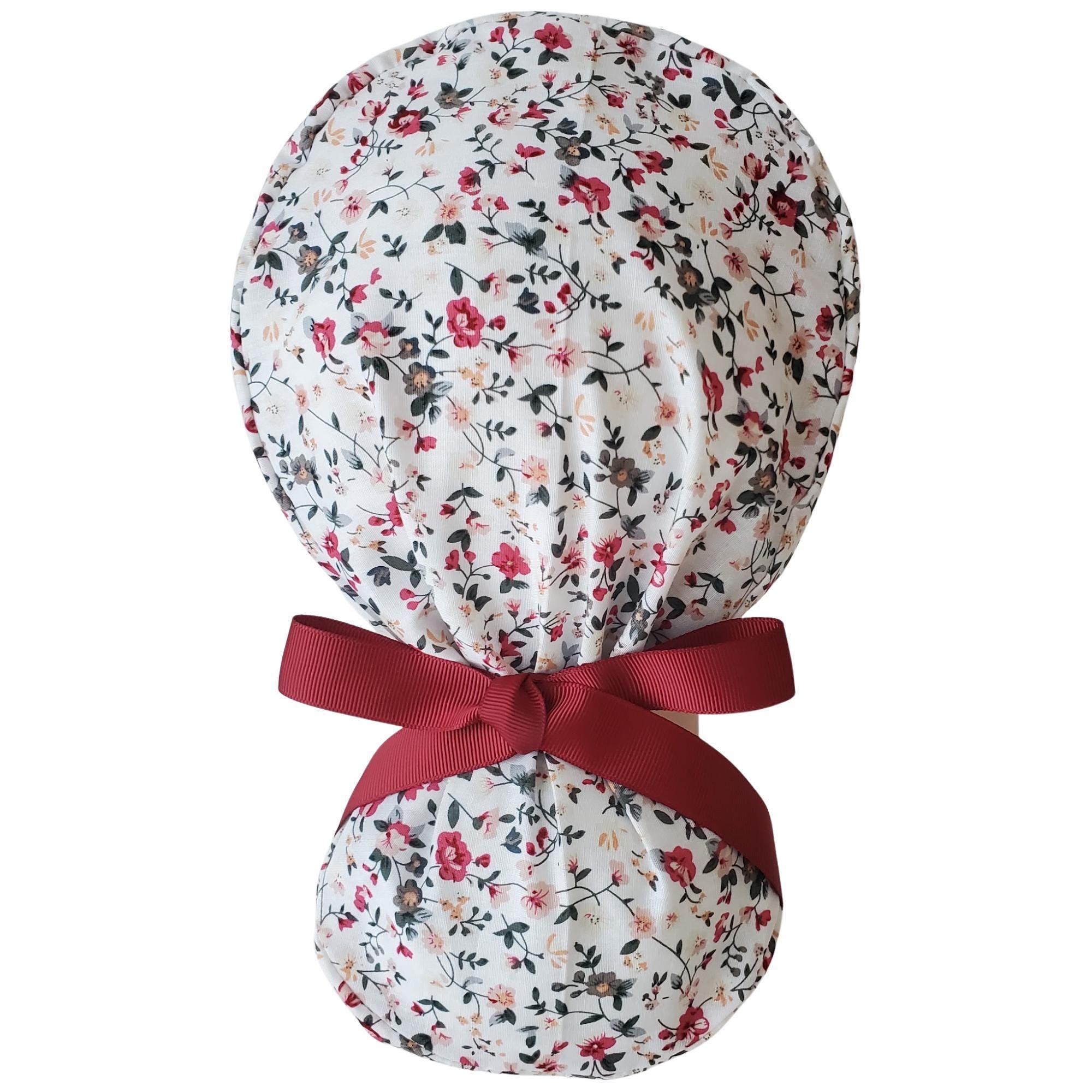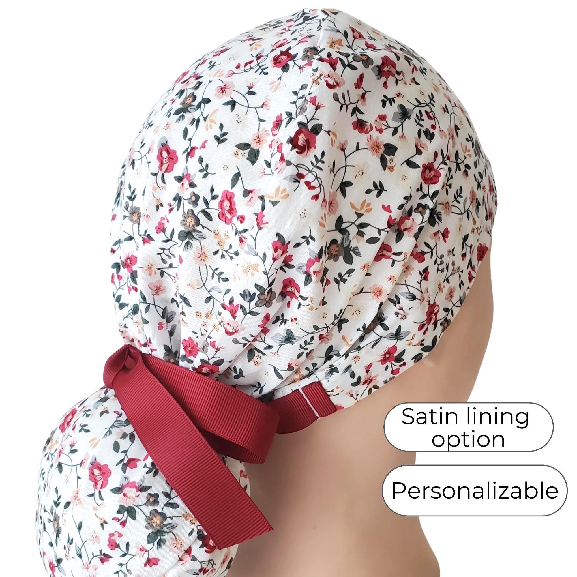Bring elegance and comfort to your shift with this Red Floral Ponytail Scrub Cap. Designed with a bright white background and delicate red, pink, and peach blossoms, this scrub hat combines feminine style with functionality. The roomy ponytail pouch keeps long hair neatly tucked away, while the optional satin lining helps reduce breakage, frizz, and dryness during long shifts.