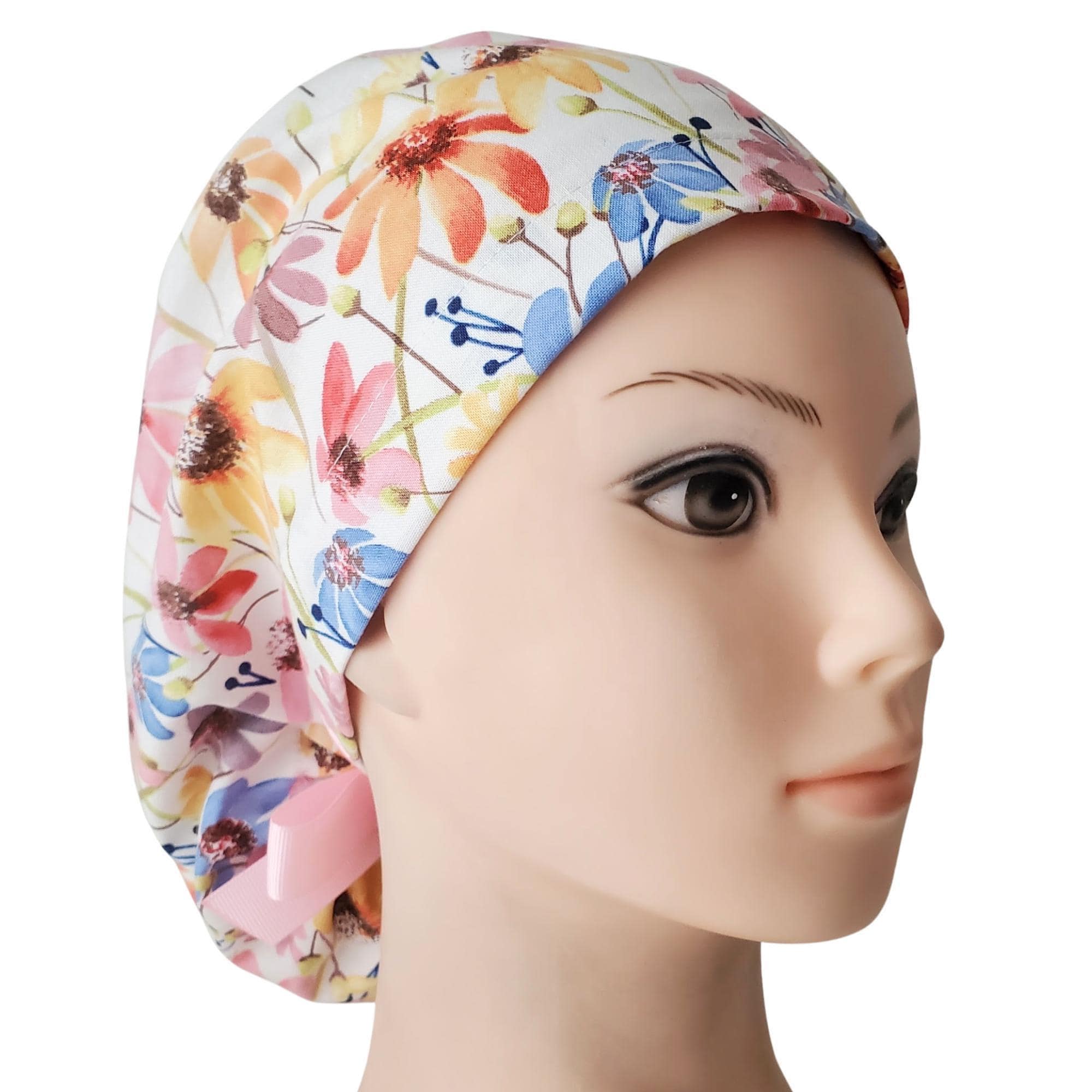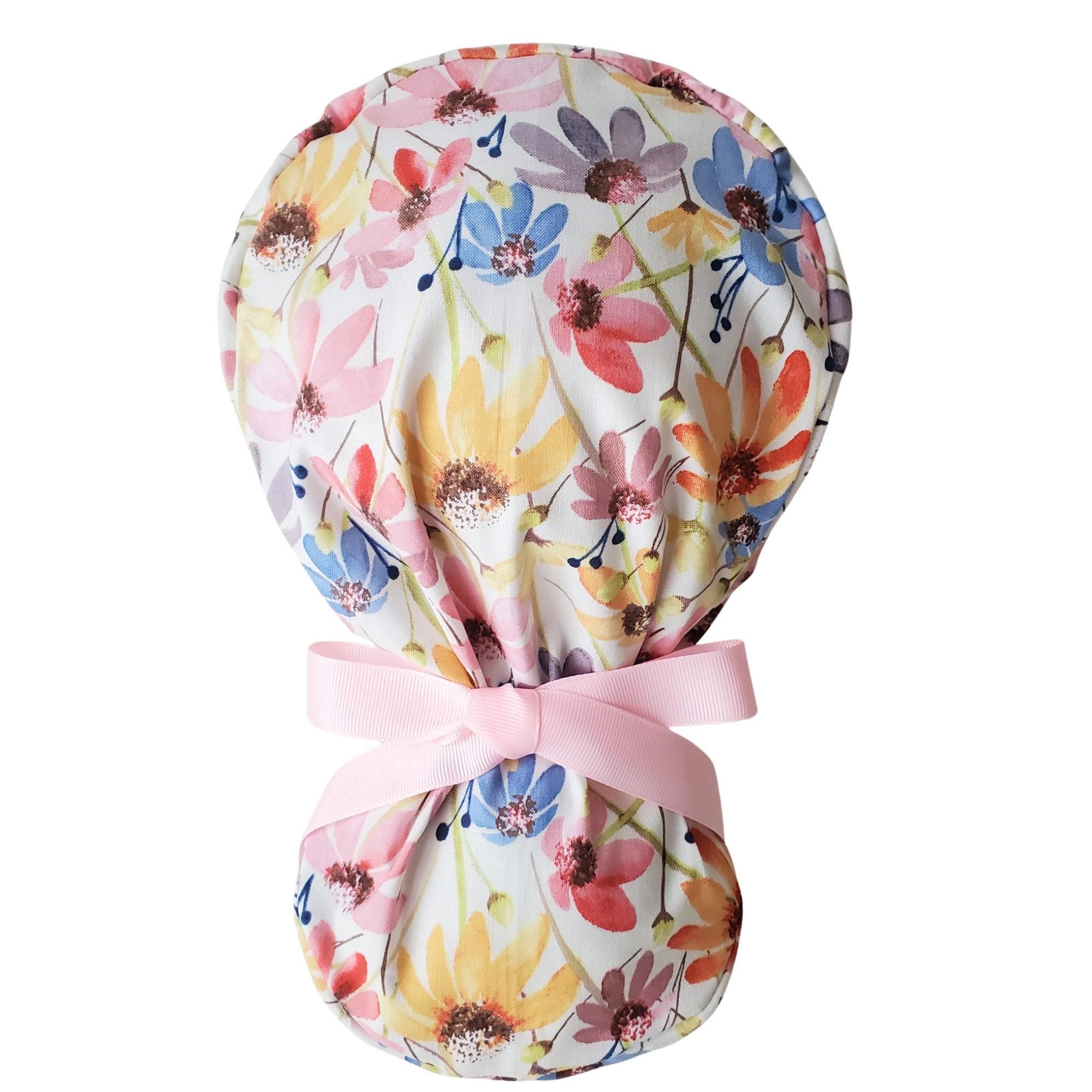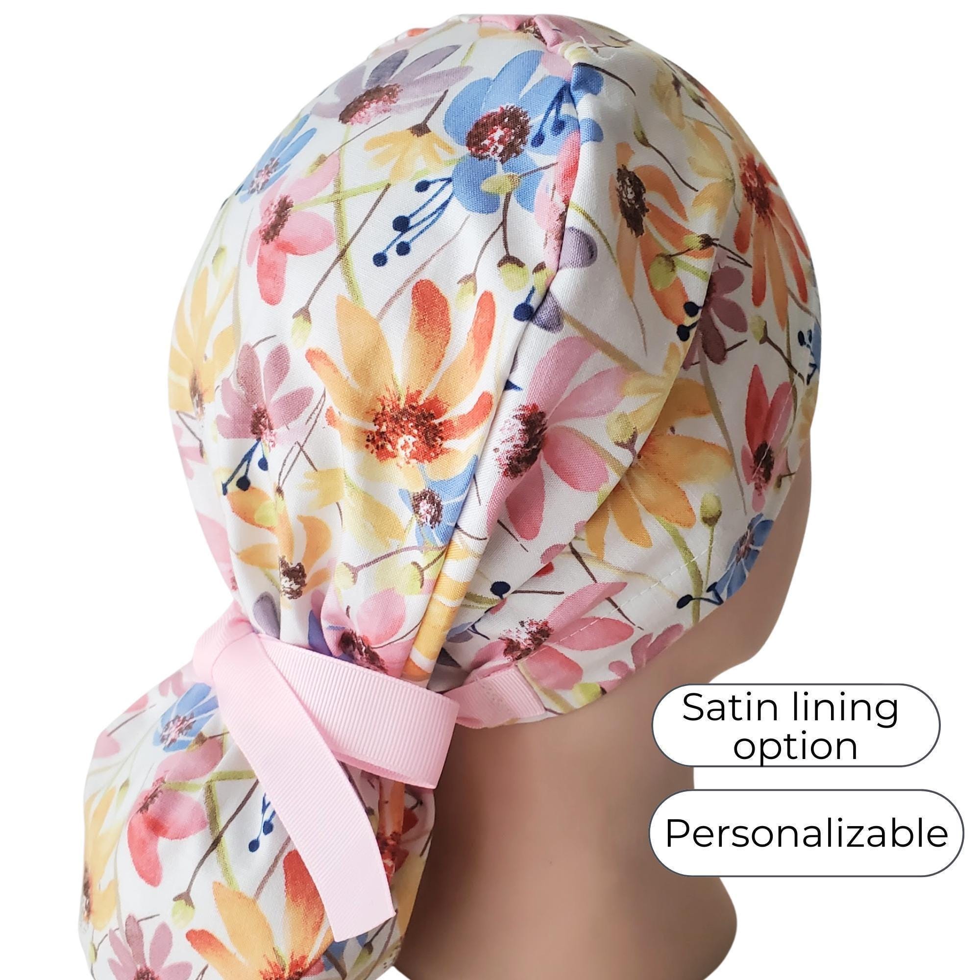 Add a burst of color to your workday with this Bright Floral Ponytail Scrub Cap. Featuring a lively mix of yellow, pink, and blue flowers on a fresh white background, this scrub hat is both fun and functional. The roomy ponytail pouch keeps long hair neatly tucked away, while the adjustable ties with a pink ribbon provide a secure, comfortable fit. For extra hair care, choose the optional satin lining to protect against frizz, dryness, and breakage during long shifts.