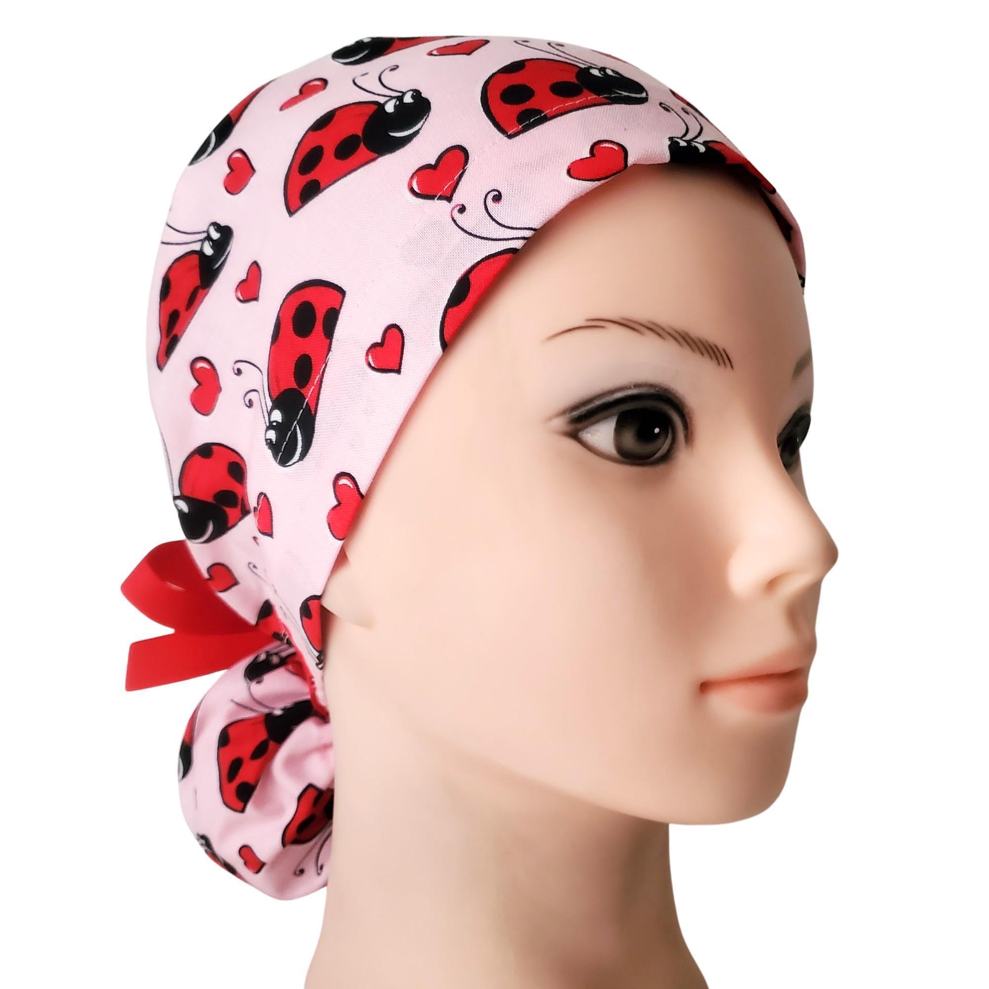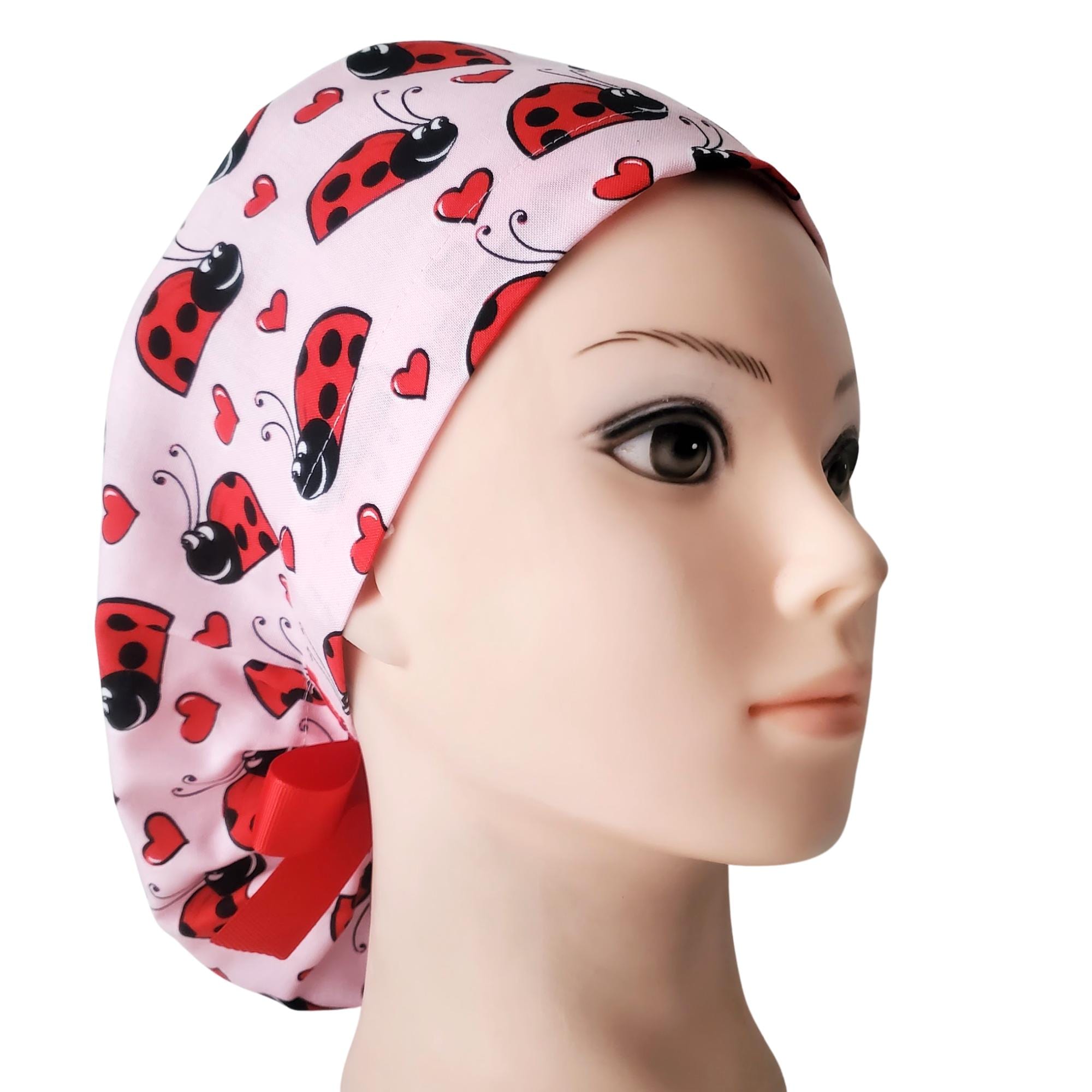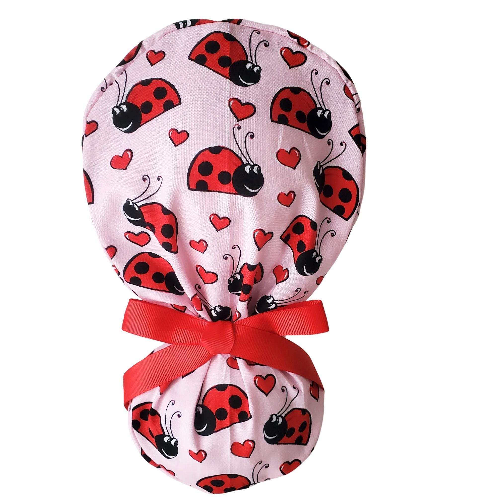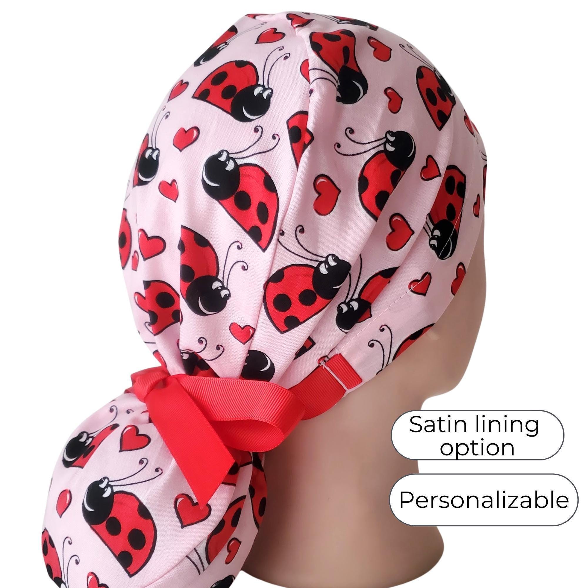 Bring joy to your workday with this Ladybug Ponytail Scrub Cap, featuring adorable red ladybugs and hearts on a soft pink background. This fun and cheerful design is perfect for adding personality to your uniform while keeping it professional. The roomy ponytail pouch neatly secures long hair, while the adjustable ties with a red ribbon bow offer a comfortable, secure fit. Choose the optional satin lining to protect your hair from frizz, dryness, and breakage during long shifts.