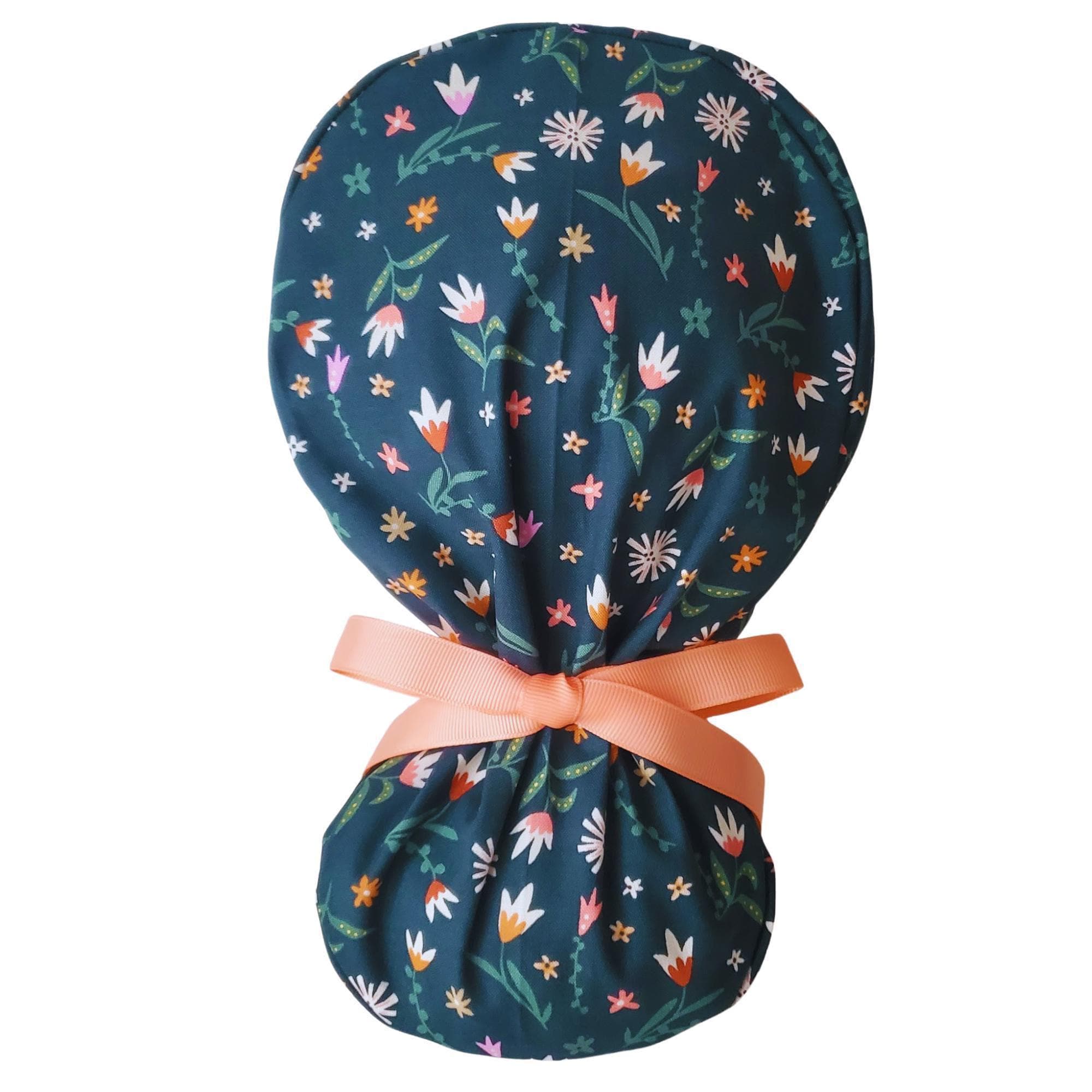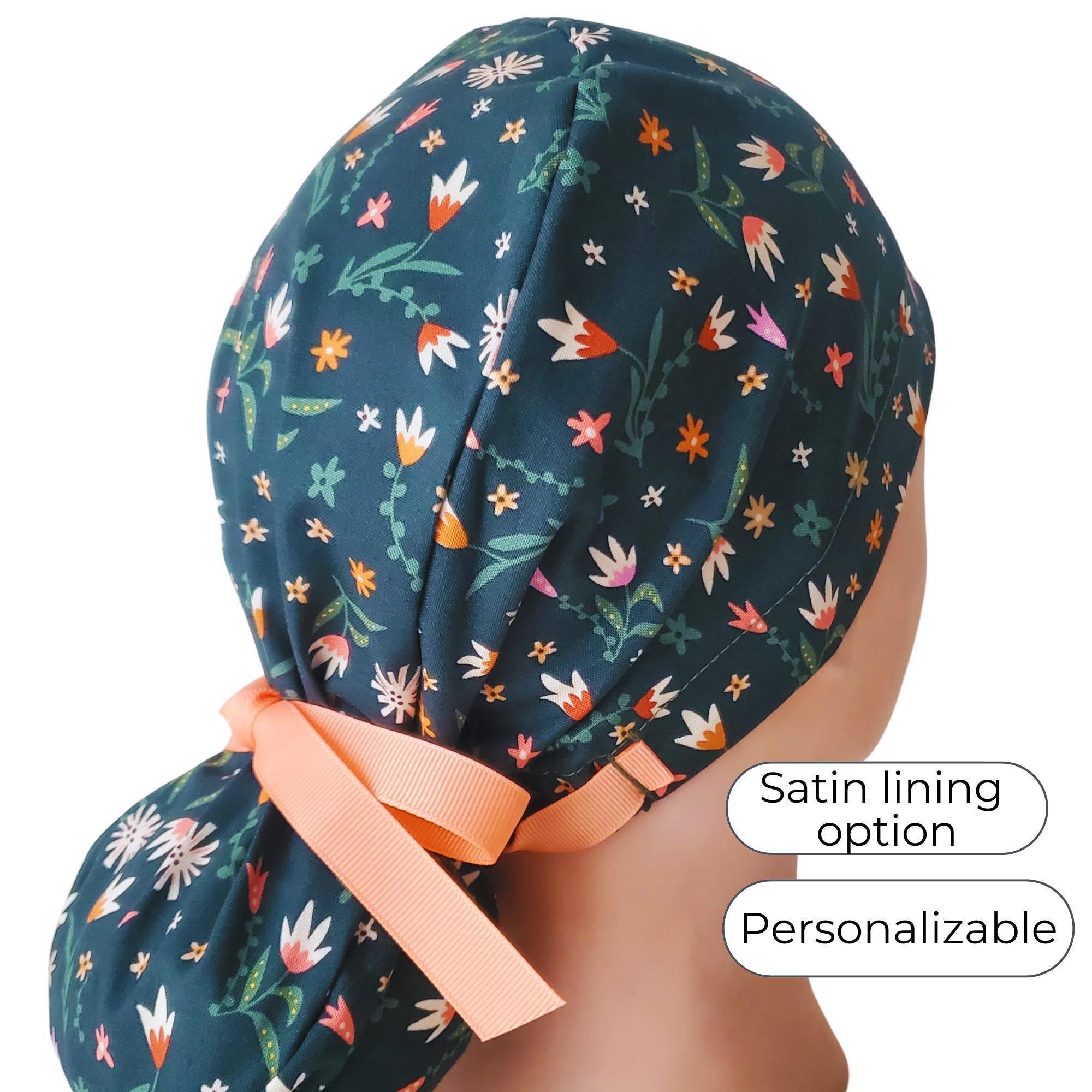 Show your bold style at work with this Teal Floral Ponytail Scrub Cap. Featuring a classic camouflage print in earthy greens, browns, and tans, this scrub hat is both practical and stylish. The roomy ponytail pouch keeps long hair tucked away neatly, while the optional satin lining helps reduce breakage, frizz, and dryness during long shifts.