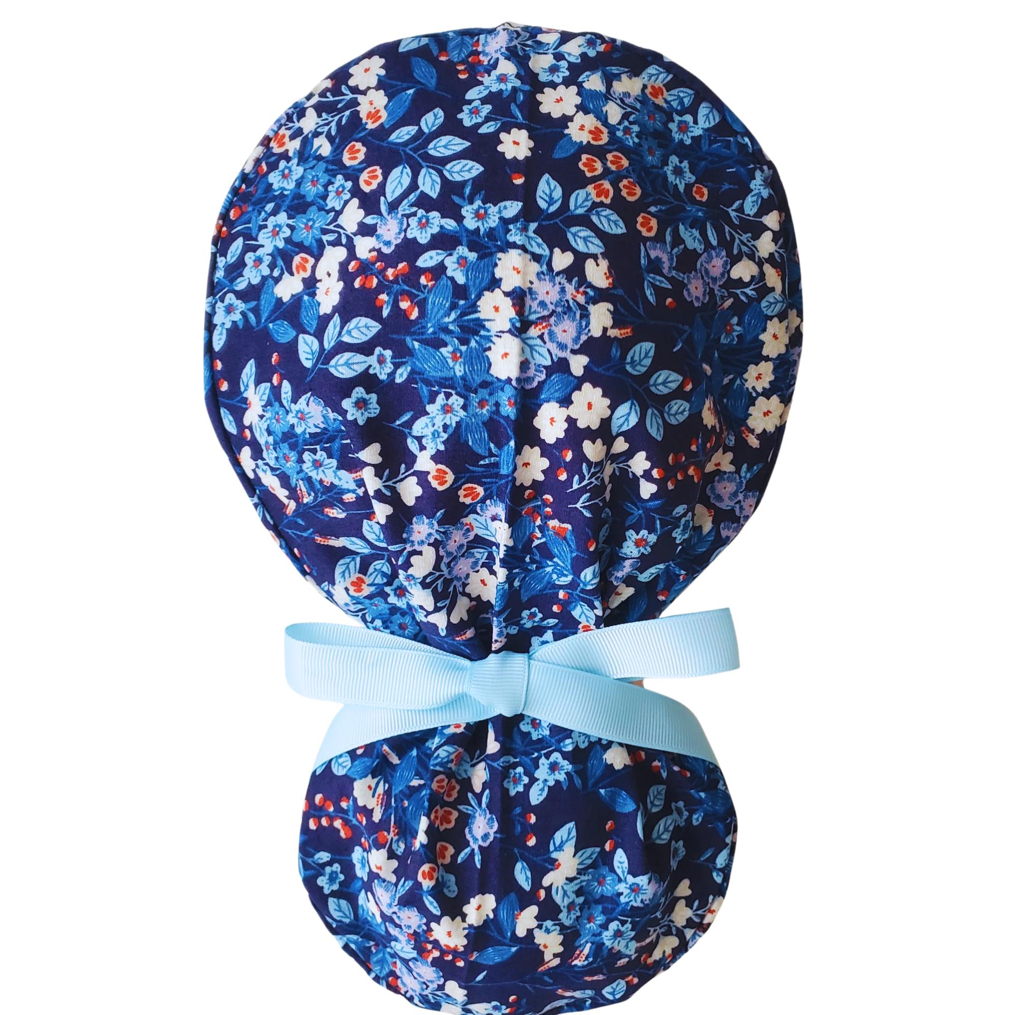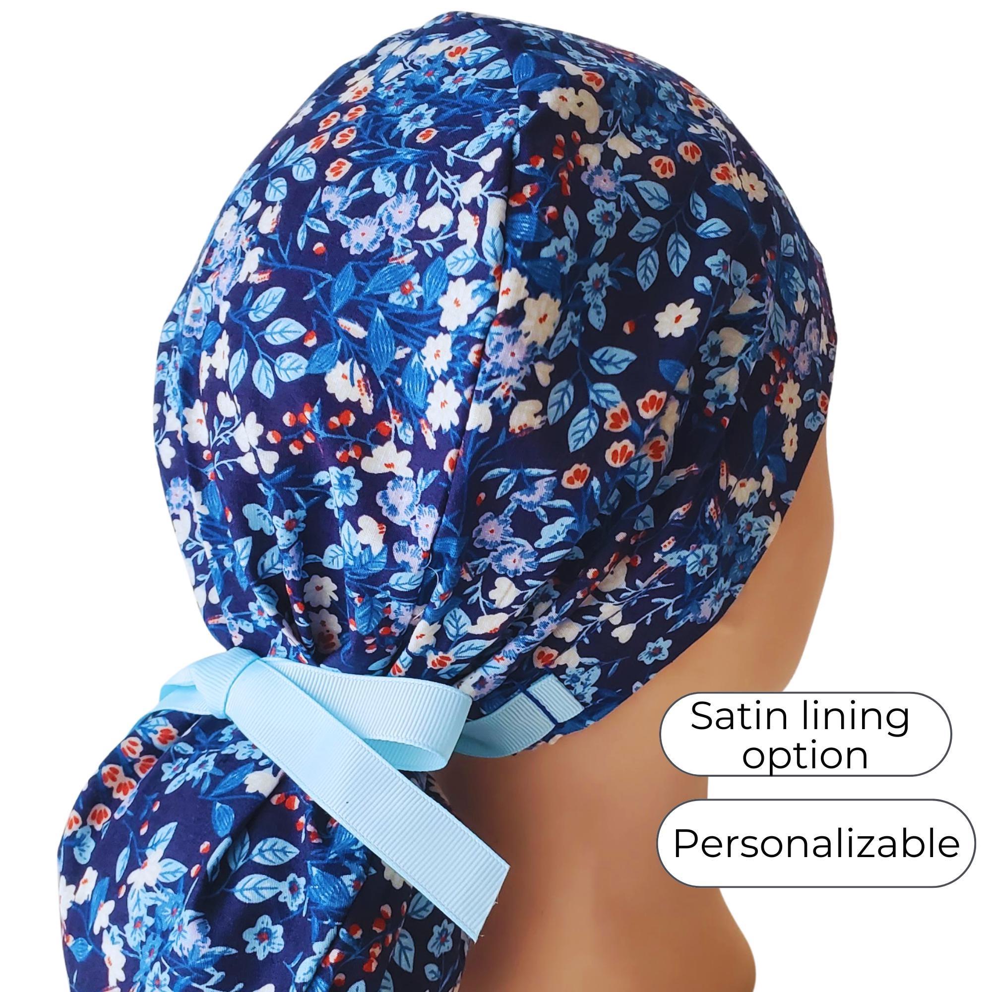 Brighten your shift with this Navy Blue Floral Ponytail Scrub Cap. Featuring a rich navy background with delicate white and blue blossoms, this scrub hat combines timeless elegance with everyday practicality. The spacious ponytail pouch keeps long hair securely tucked, while the optional satin lining helps reduce frizz and dryness throughout your shift.
