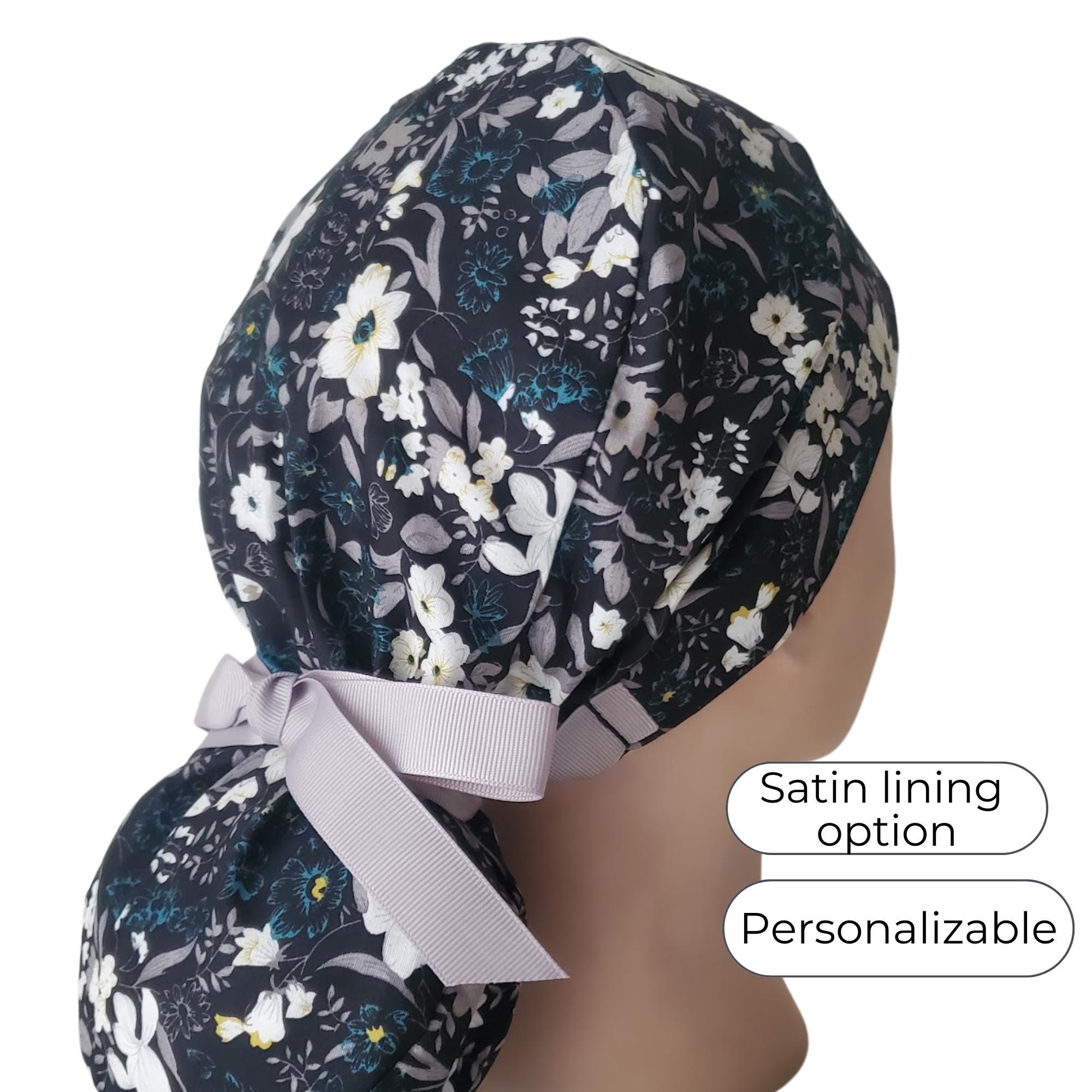 Stay elegant through every shift with this Black Floral Ponytail Scrub Cap. Designed for comfort and sophistication, it features a deep black background with white and teal flowers, giving it a timeless, polished look. The roomy ponytail pouch keeps long hair secure and tangle-free, while the optional satin lining helps protect hair from frizz and dryness — perfect for long hospital shifts.