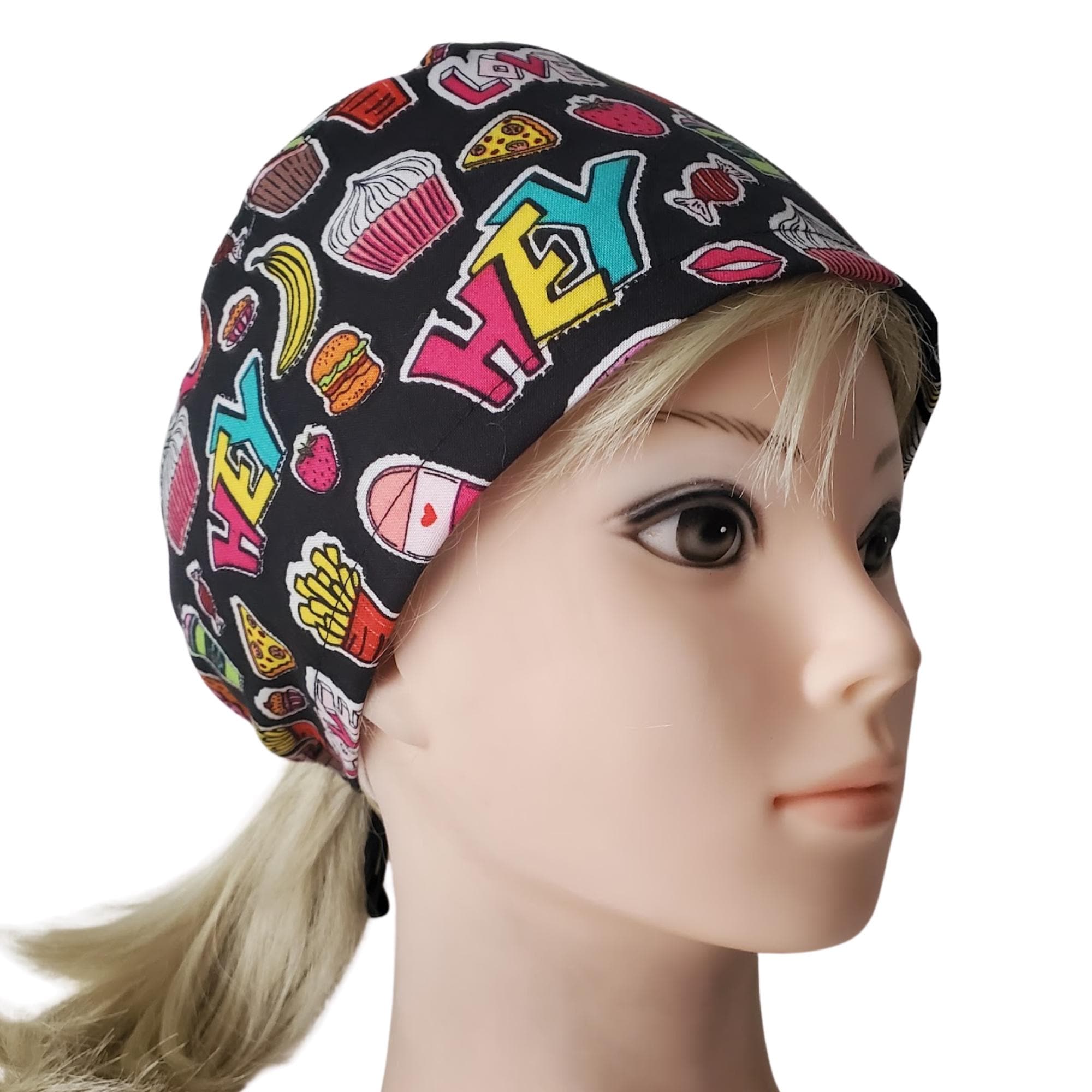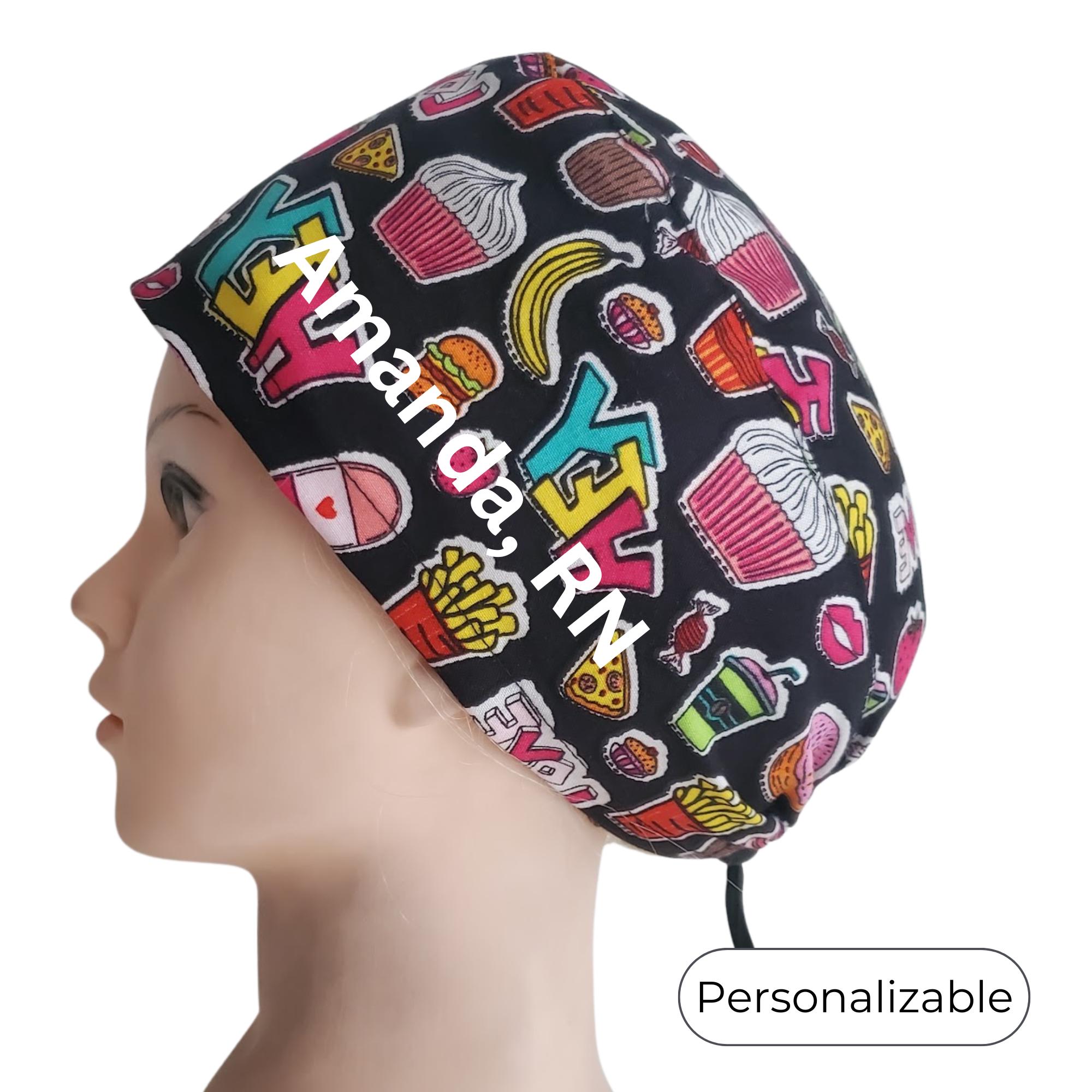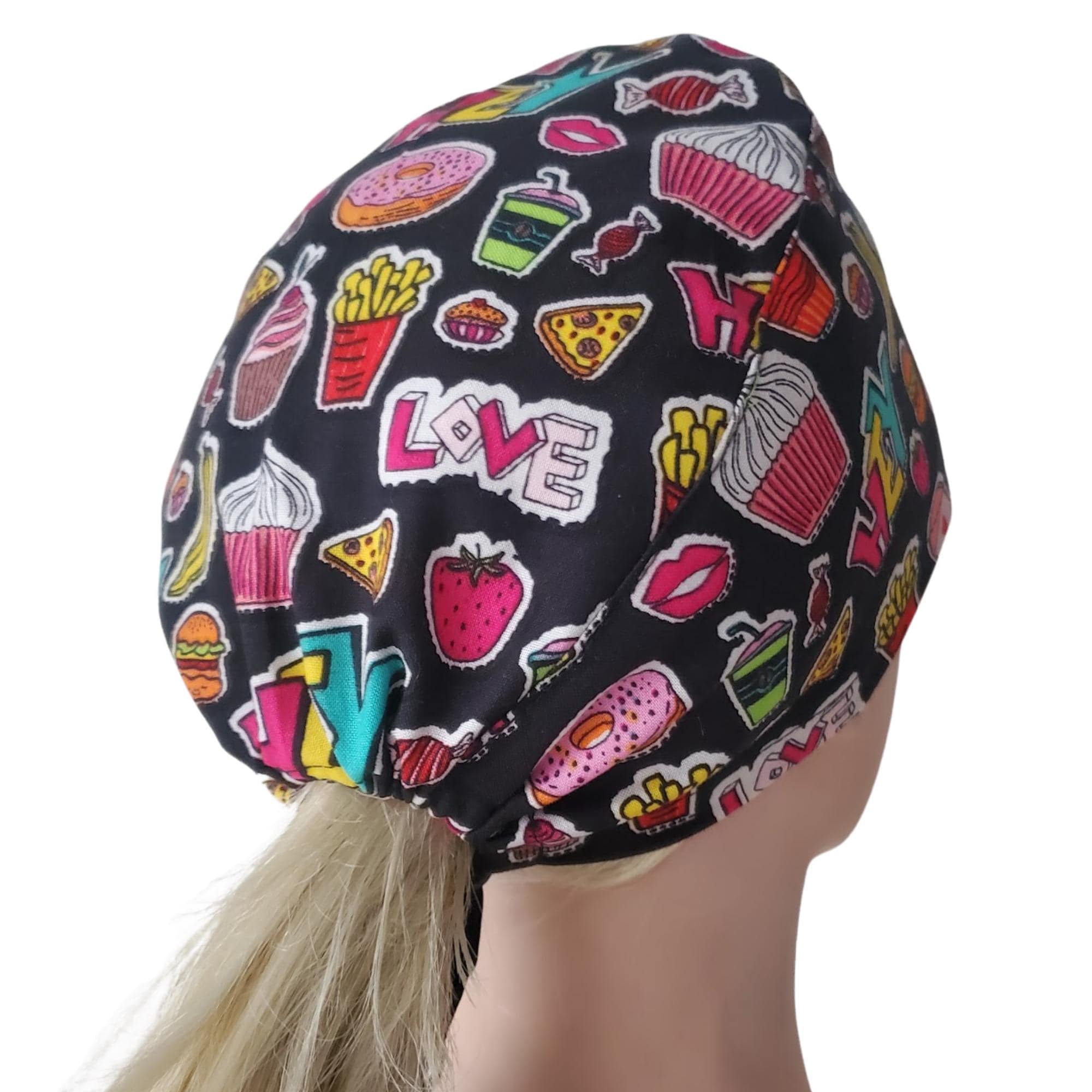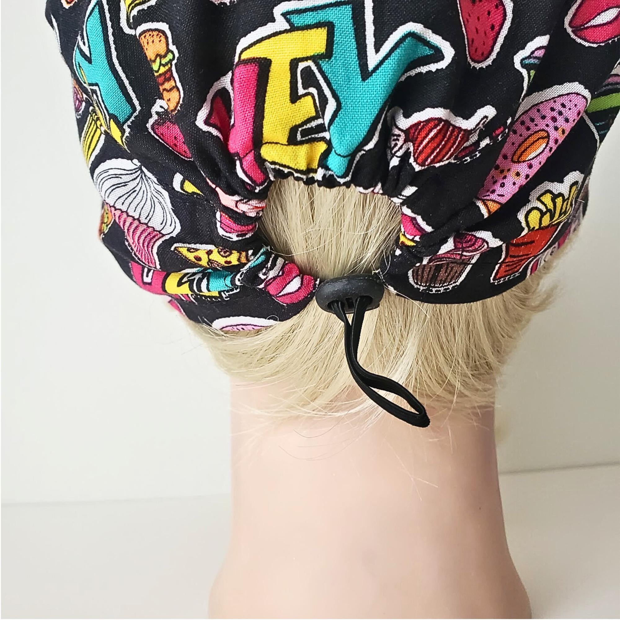 Bring fun energy to your shift with this Colorful Fast Food Print Tie Back Scrub Cap! 🍩🍟