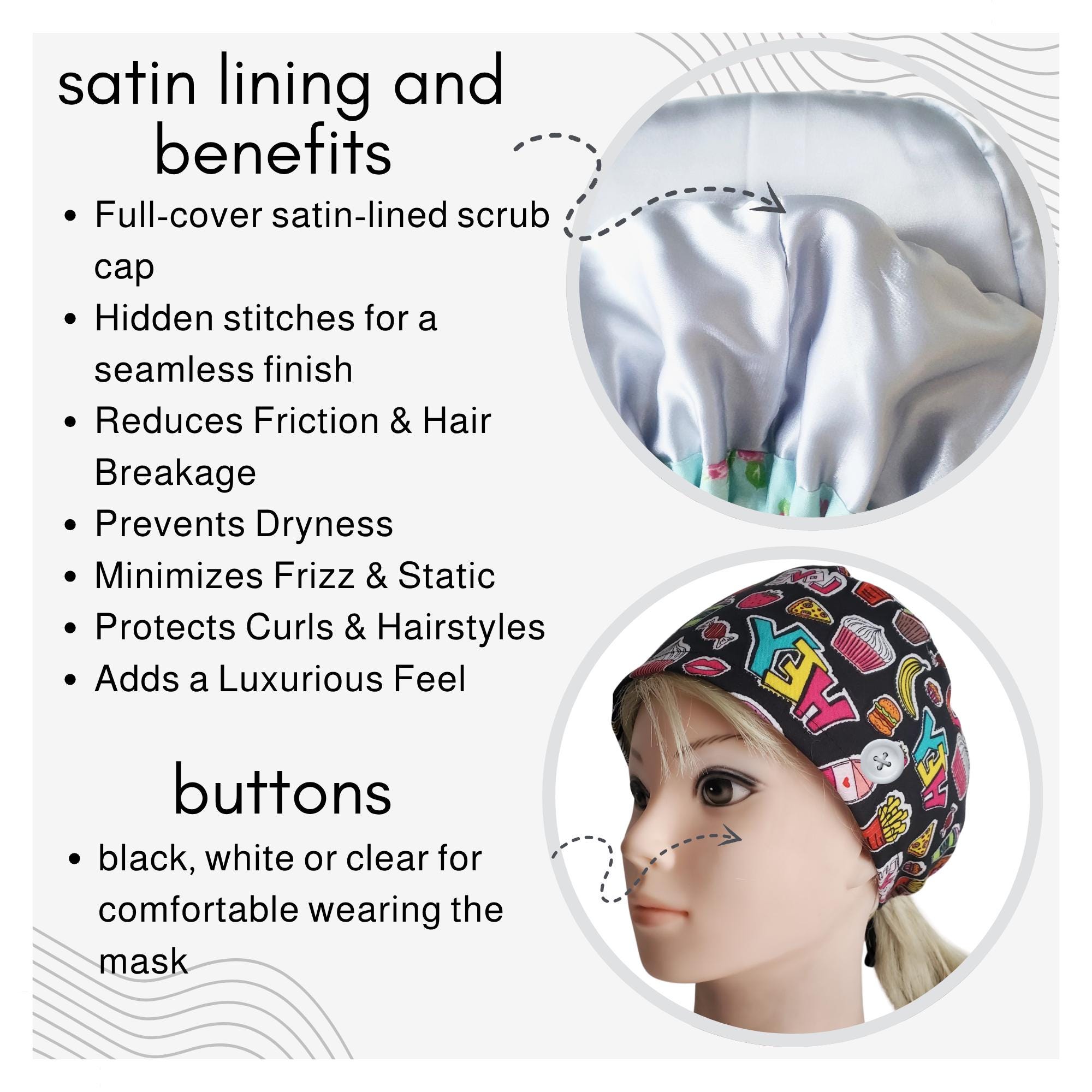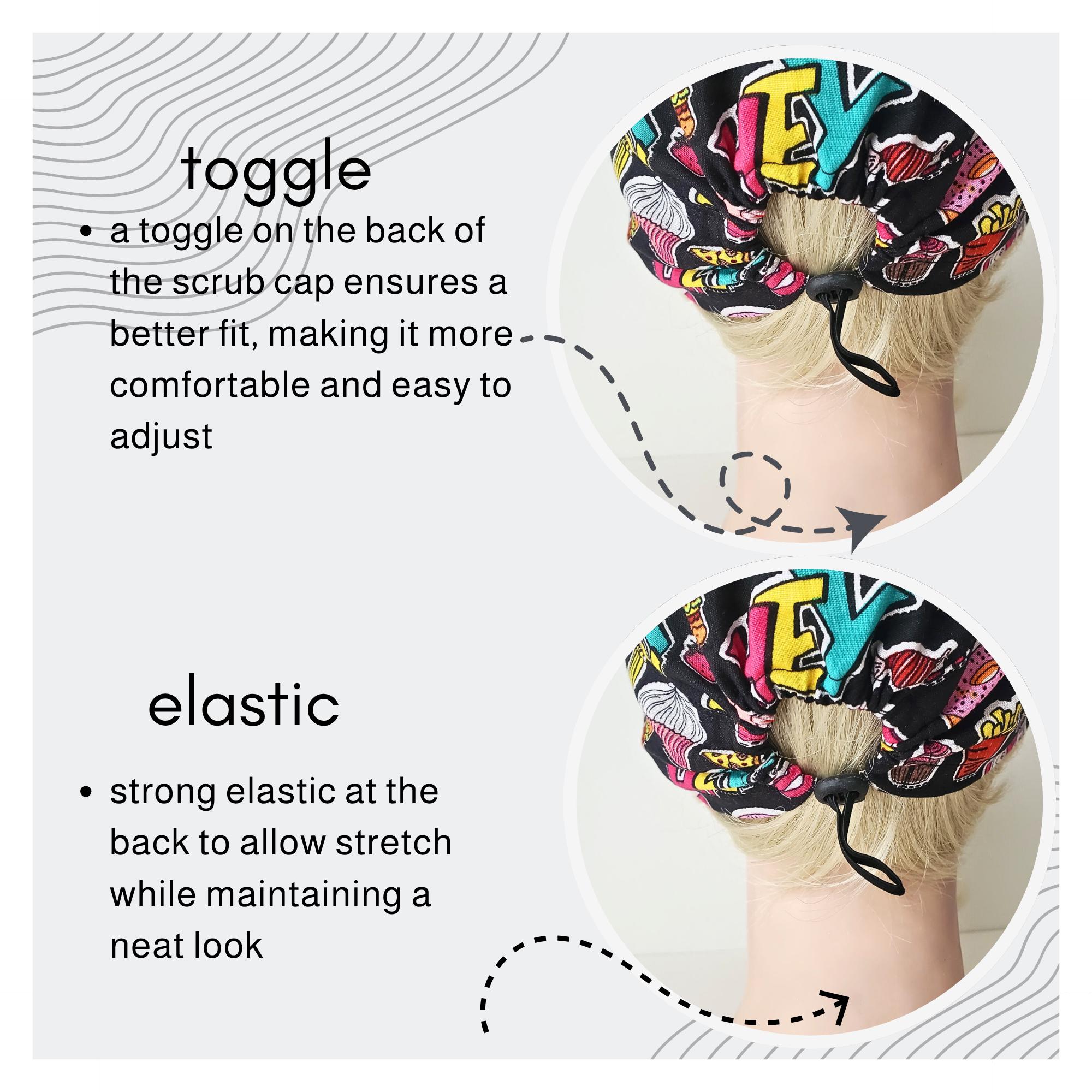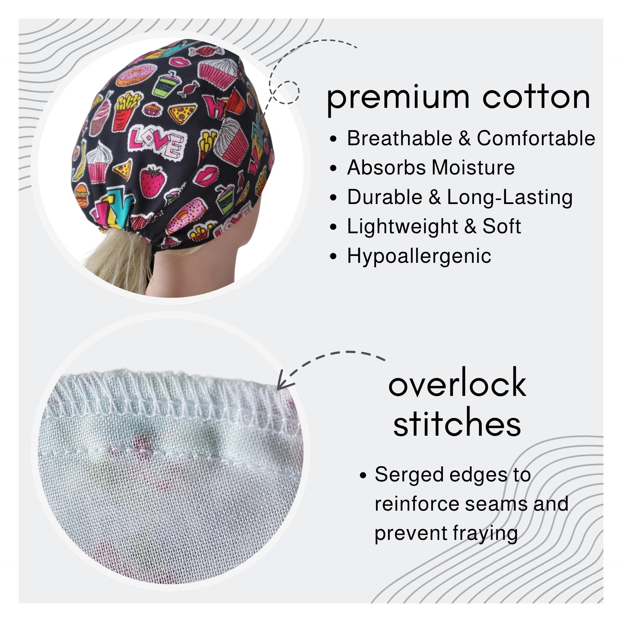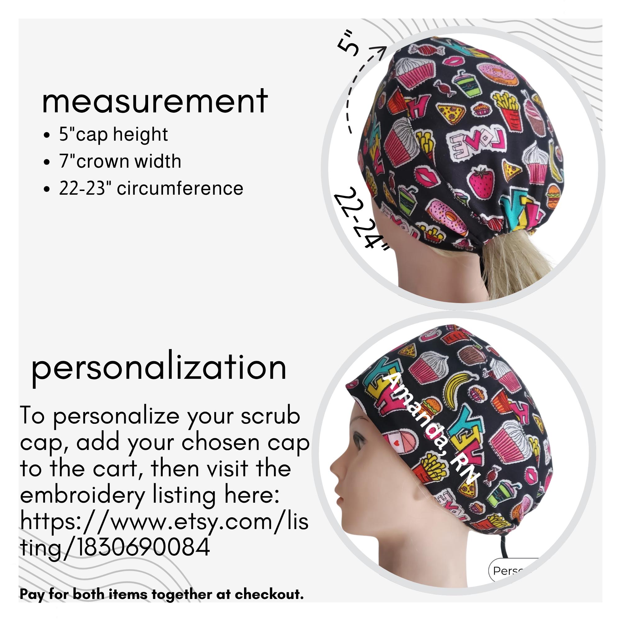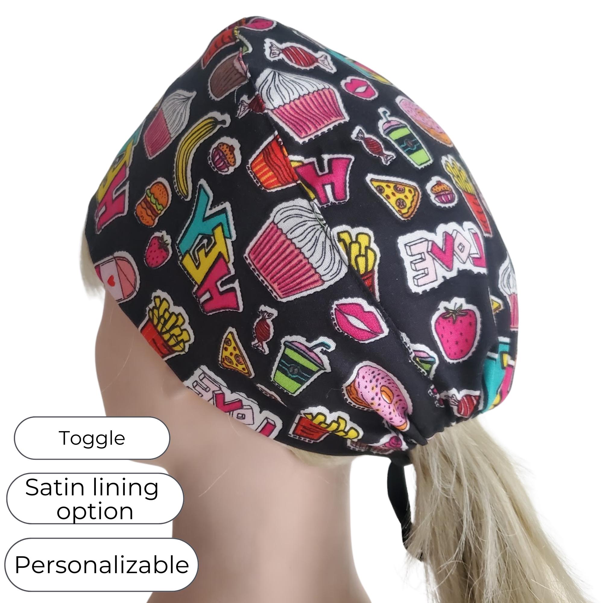 Bring fun energy to your shift with this Colorful Fast Food Print Tie Back Scrub Cap! 🍩🍟