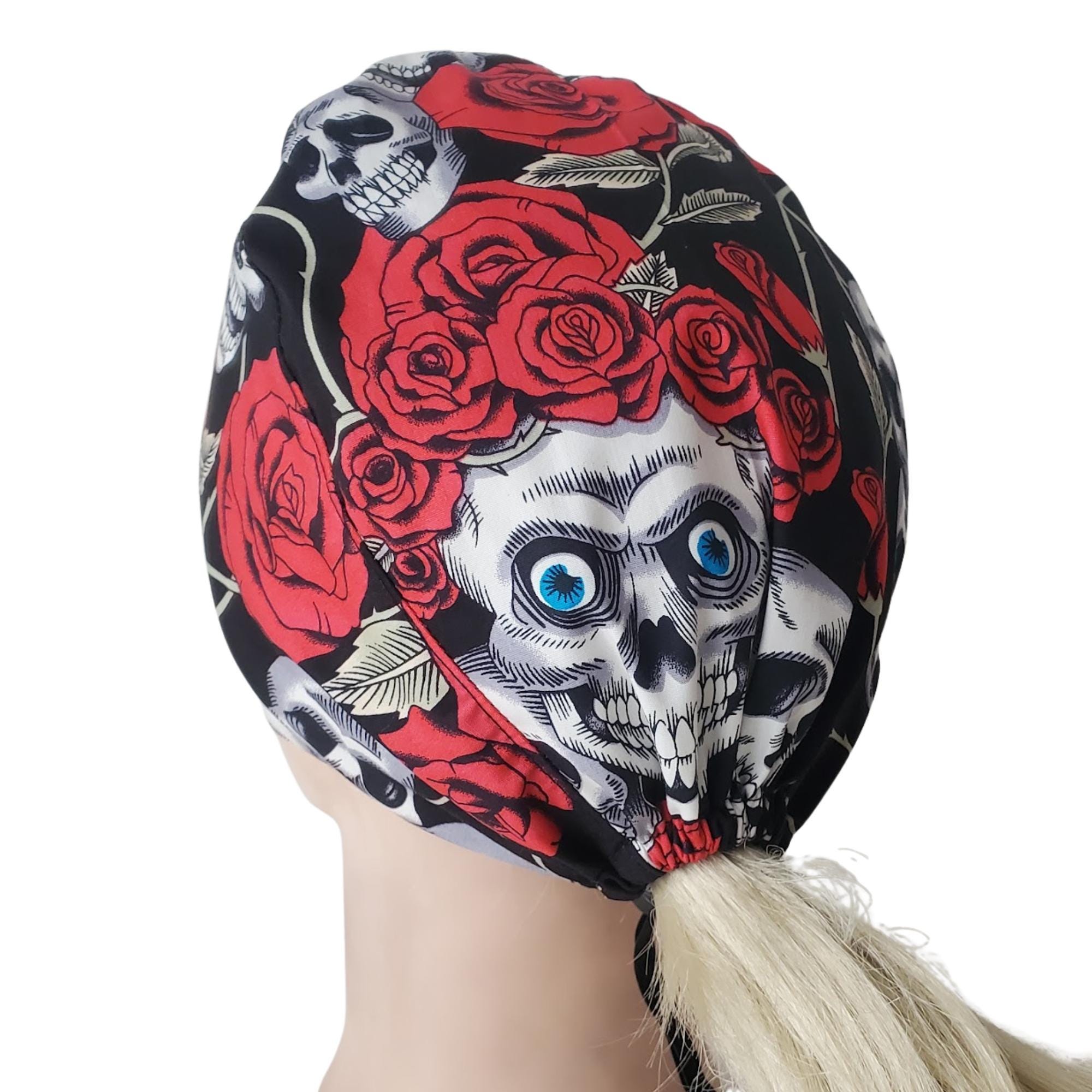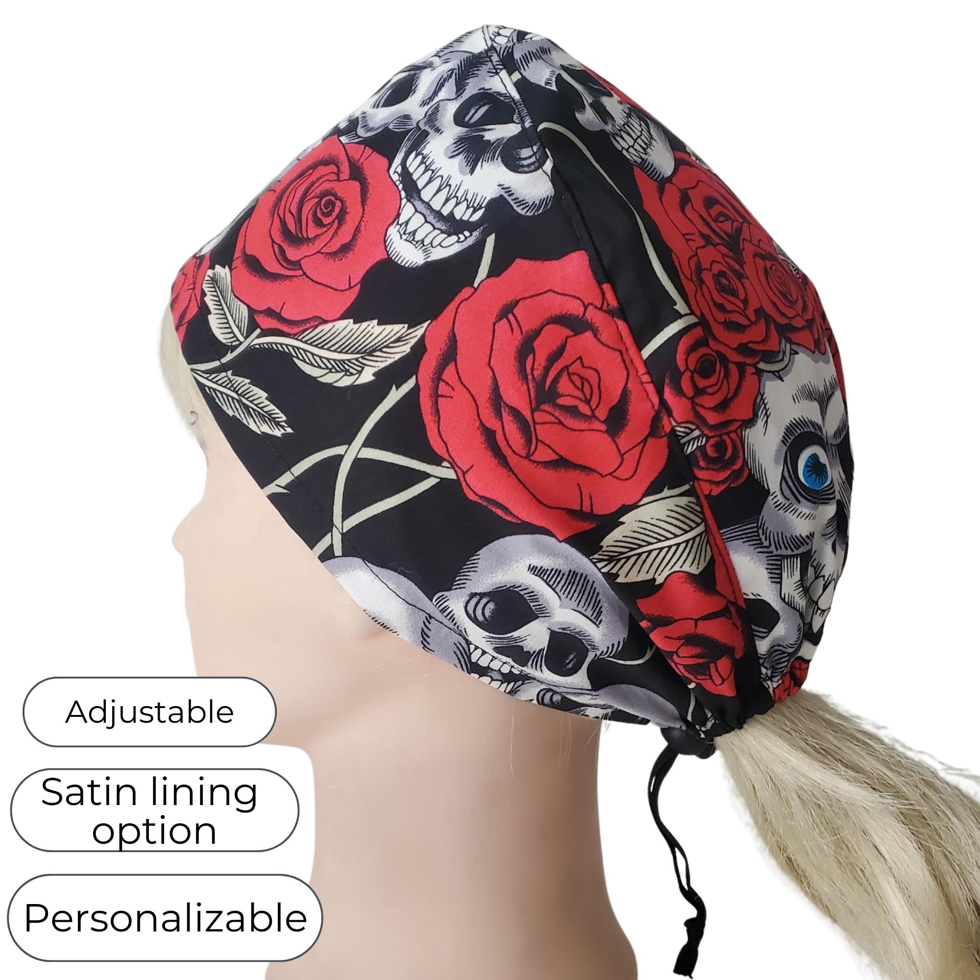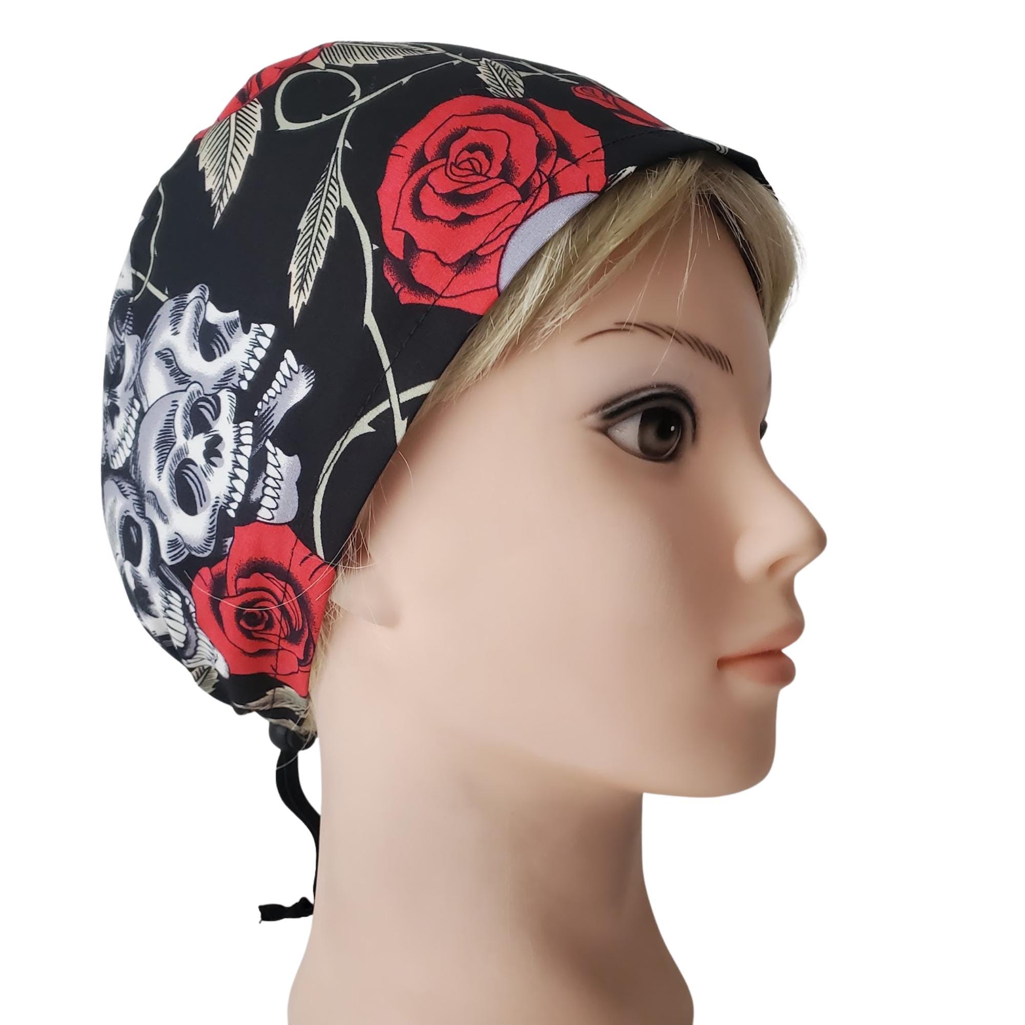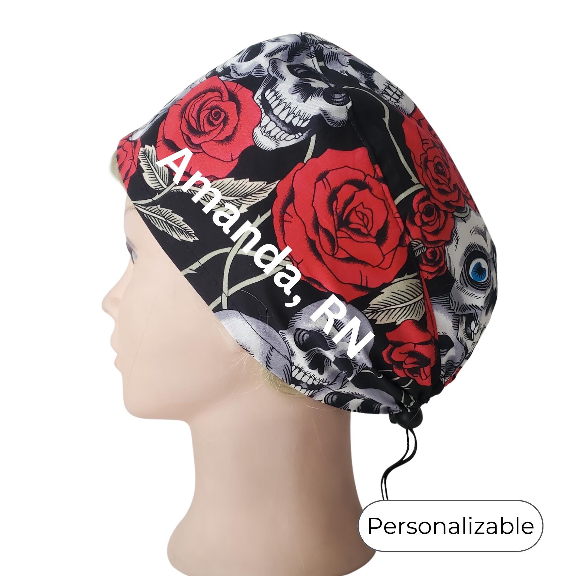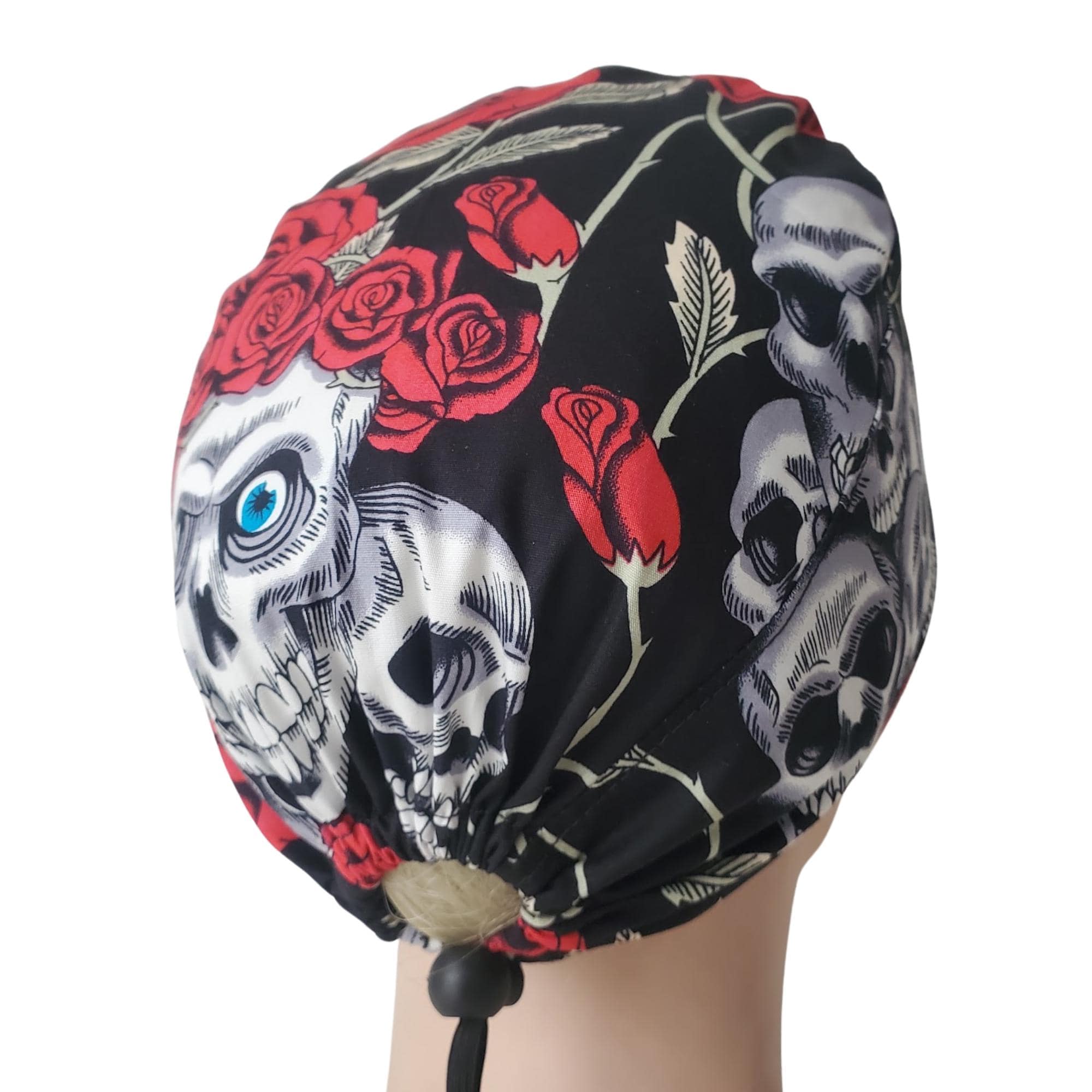 Make a bold statement on your shift with this Skull and Roses Tie Back Scrub Cap.