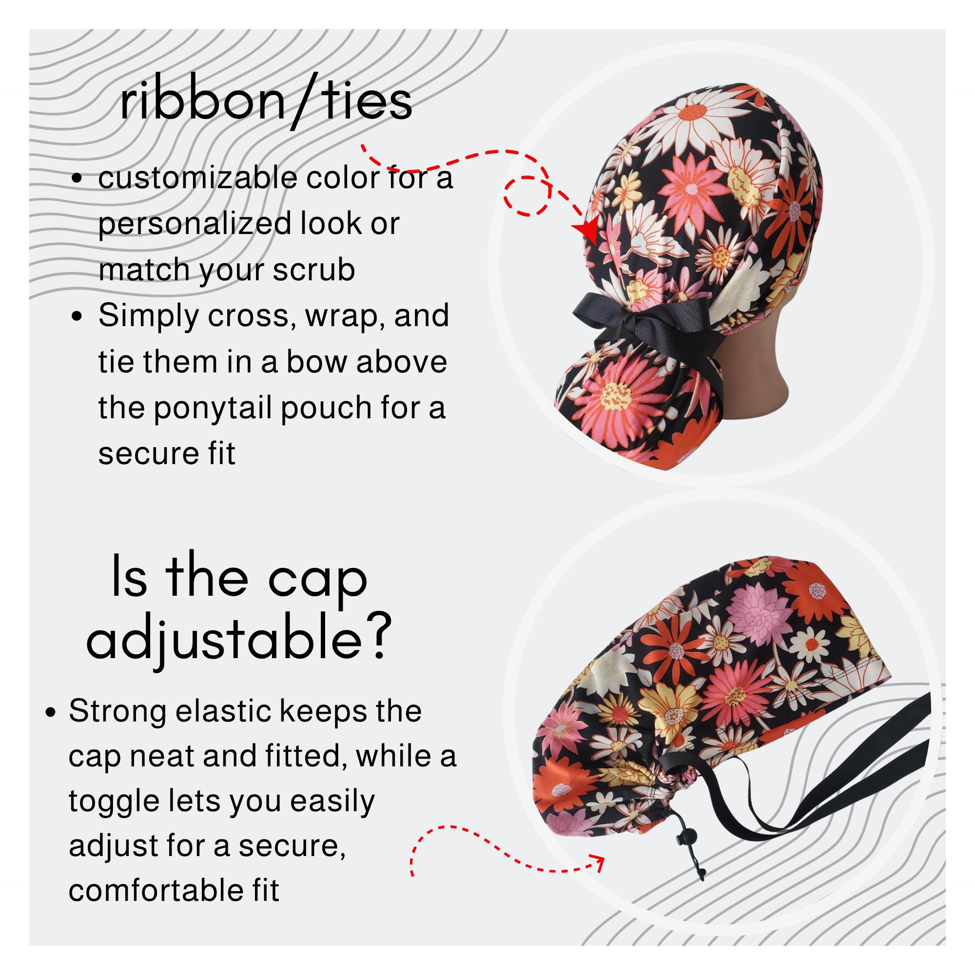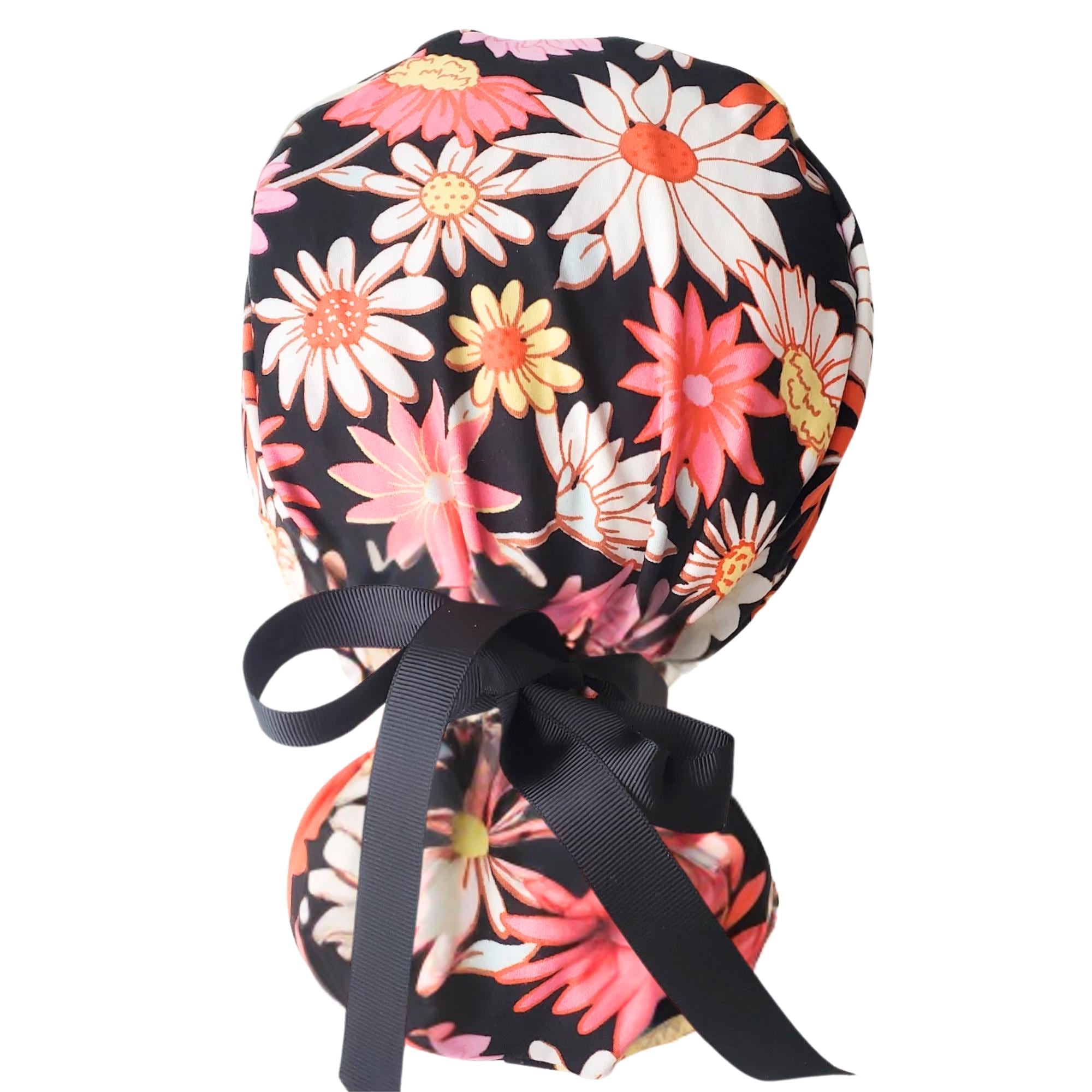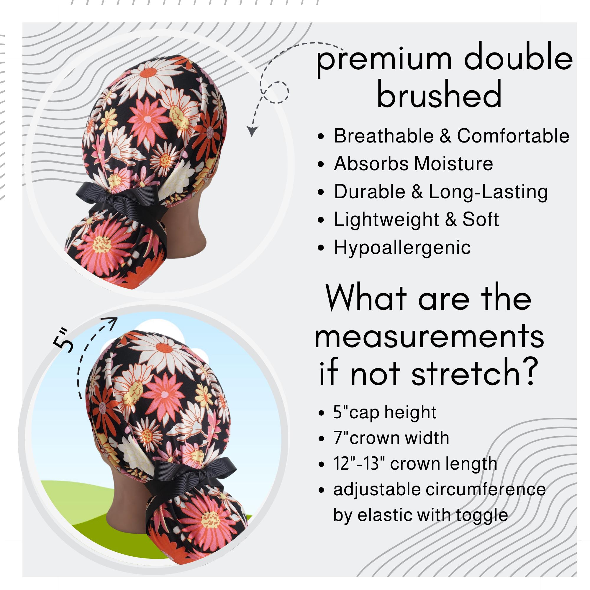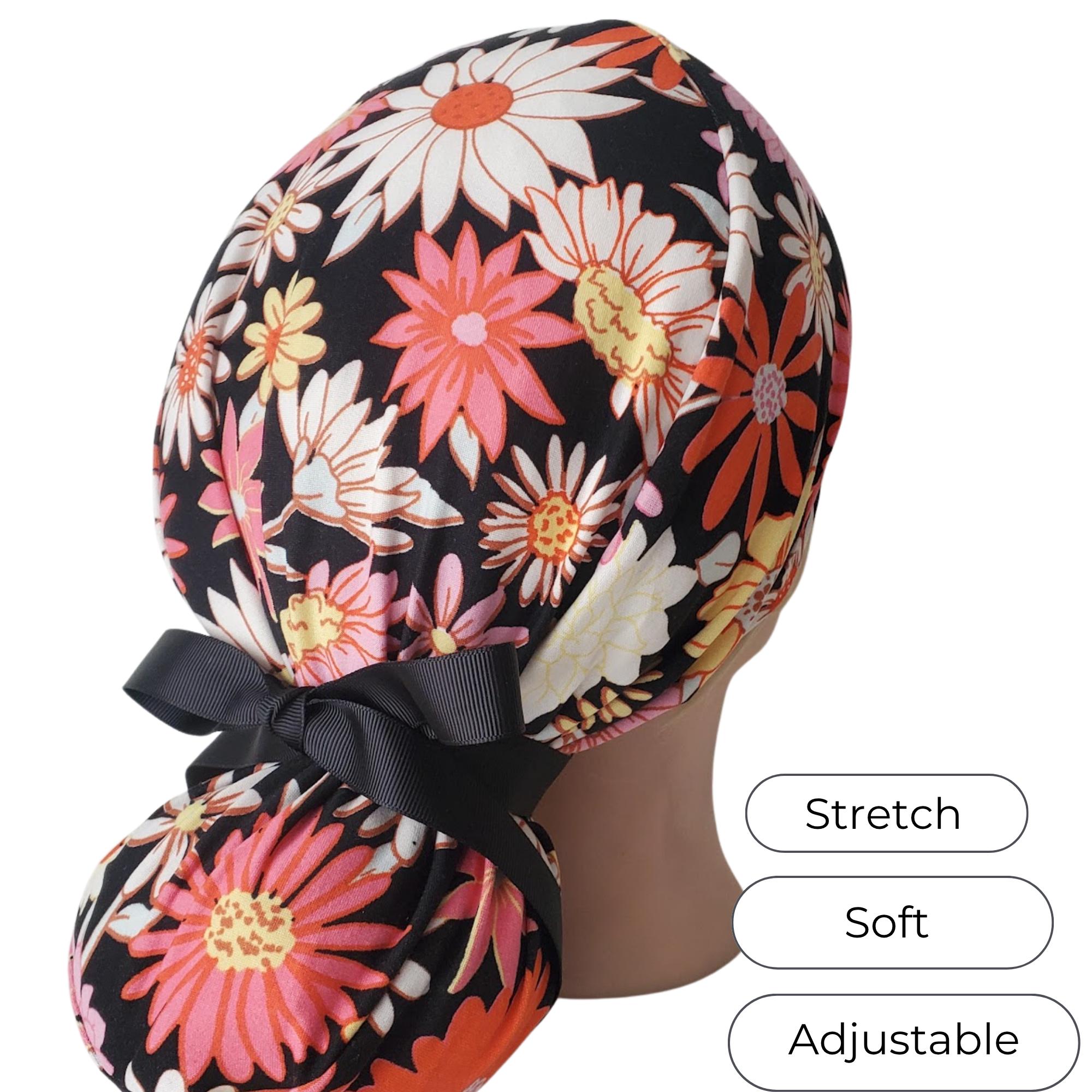 Stay comfortable and stylish through every shift with this ponytail scrub cap featuring a bright daisy floral print on a black background. Made from double brushed polyester, it’s exceptionally soft, stretchy, and easy to care for — no ironing needed.