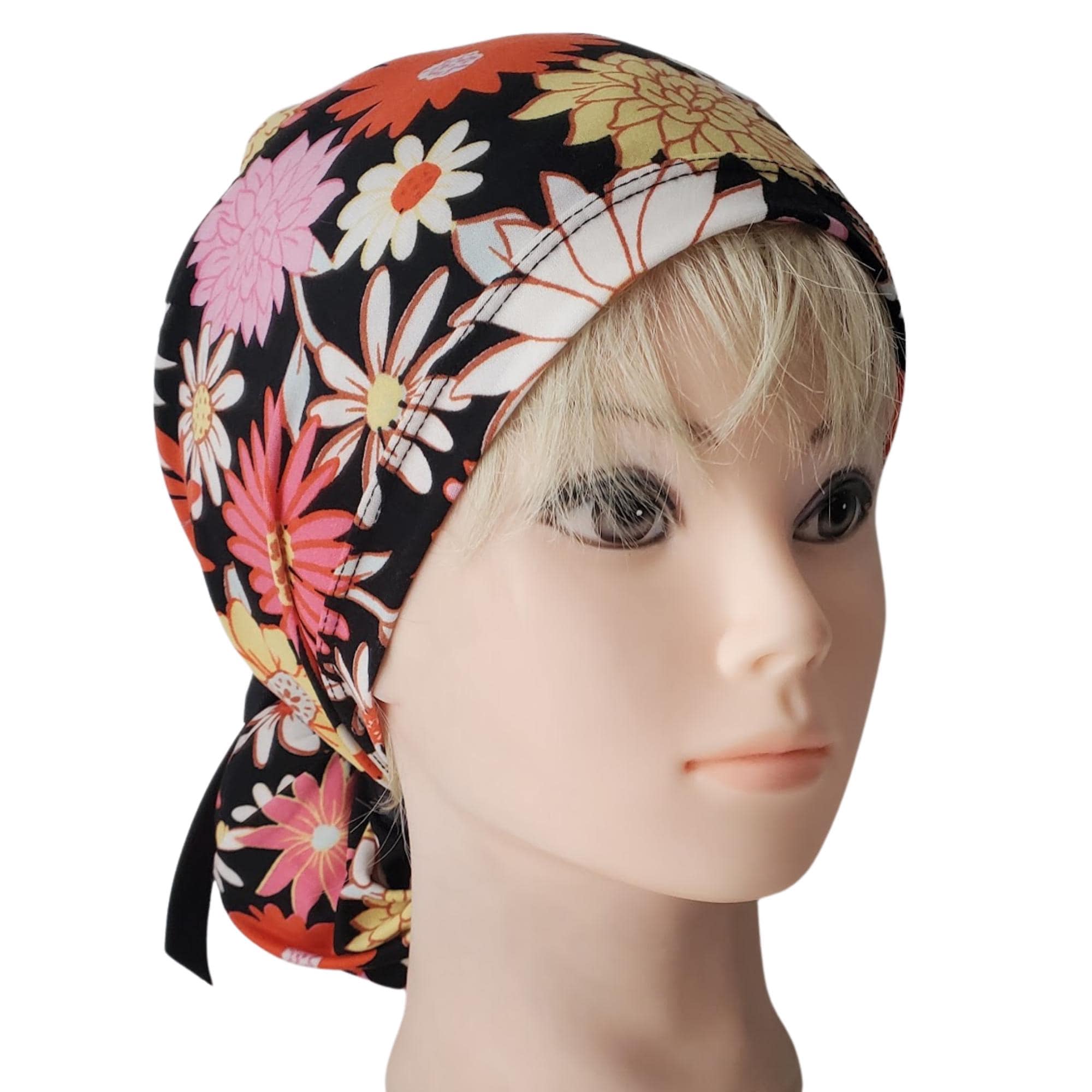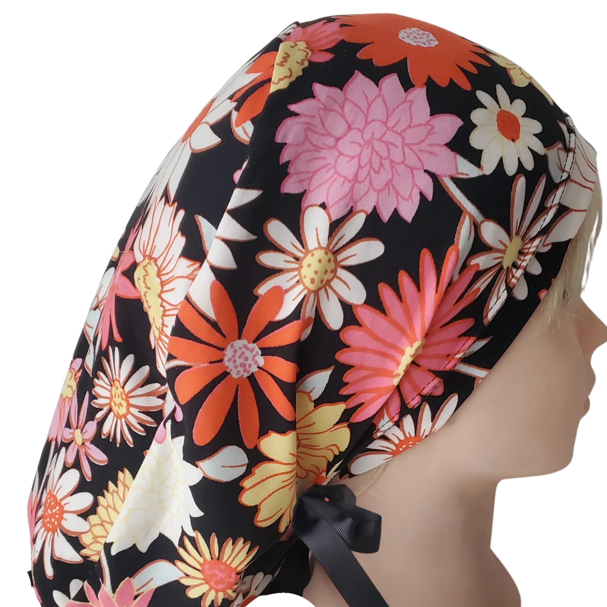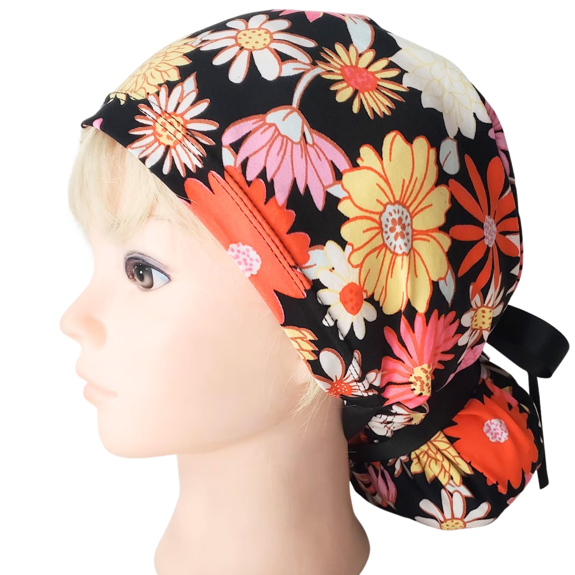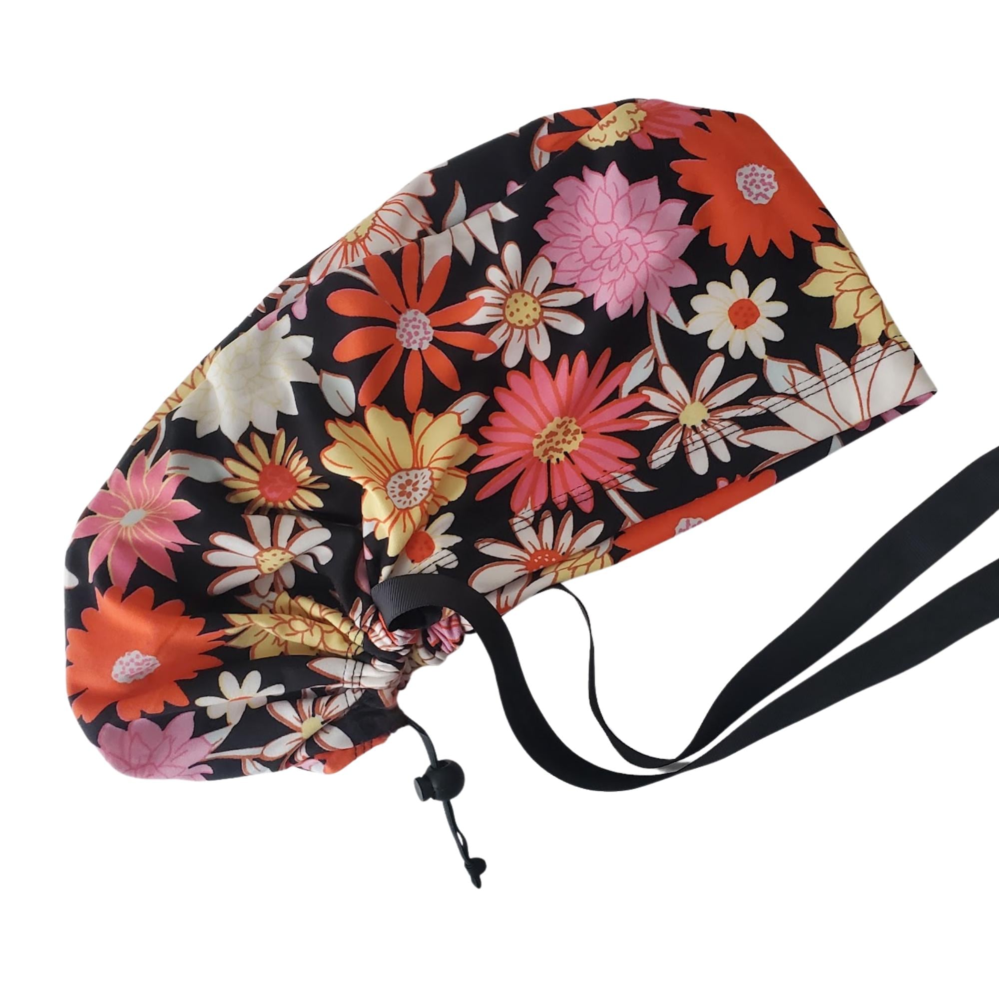 Stay comfortable and stylish through every shift with this ponytail scrub cap featuring a bright daisy floral print on a black background. Made from double brushed polyester, it’s exceptionally soft, stretchy, and easy to care for — no ironing needed.