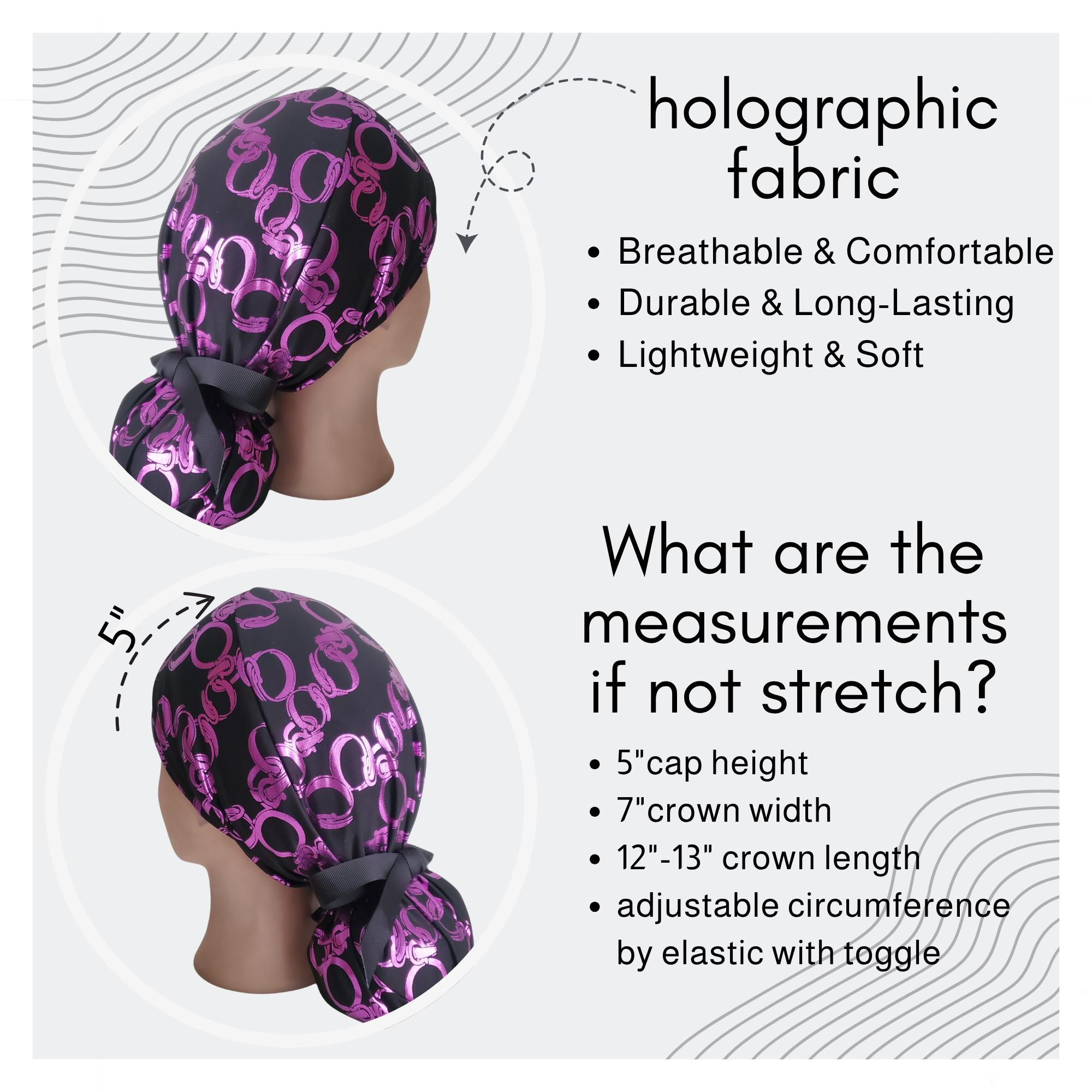 Make your work look fierce with this stretch ponytail scrub cap in a bold black metallic purple chain print. Made from soft, stretchy performance fabric, this cap delivers comfort with a luxury touch — shiny print, sleek fit, and zero-slip hold.