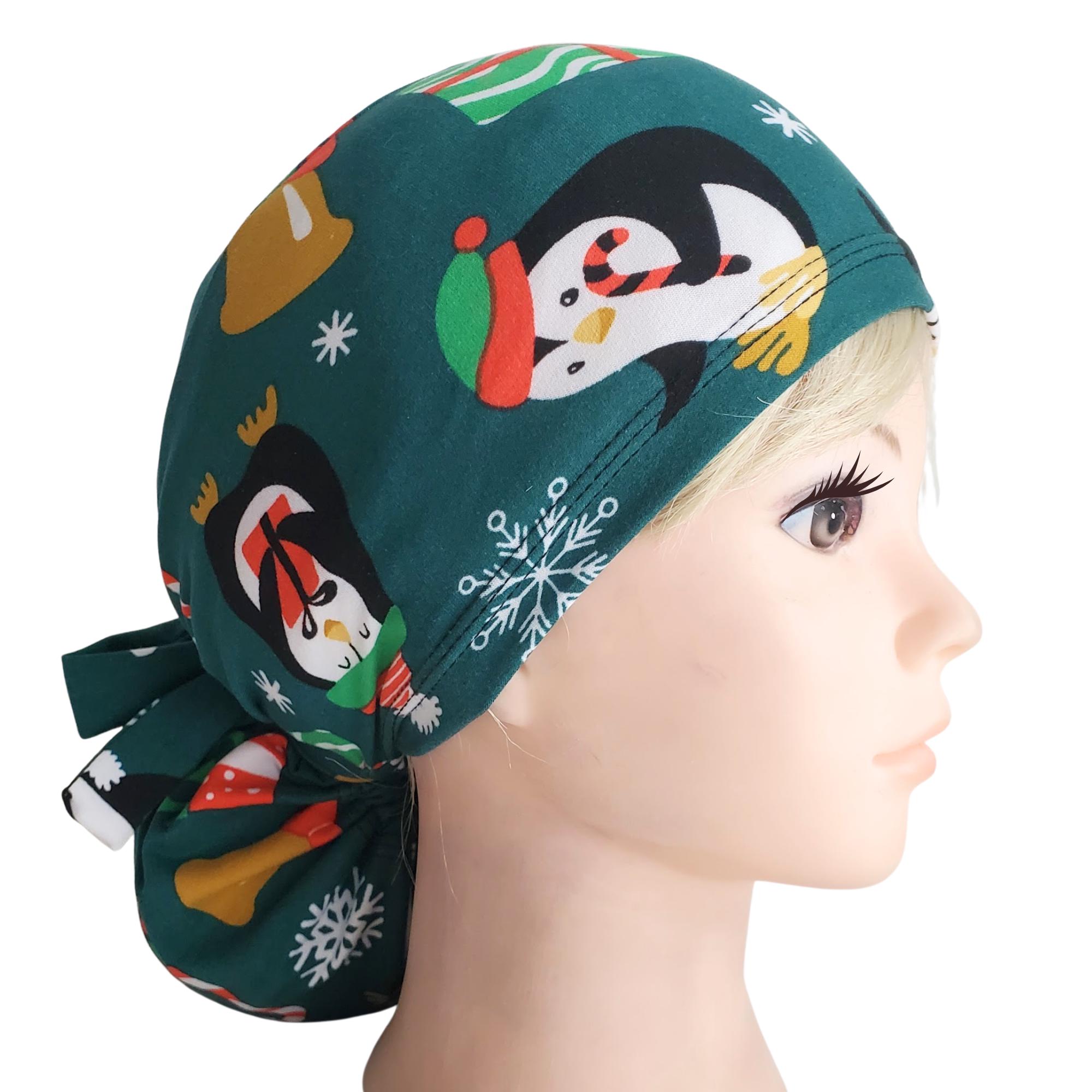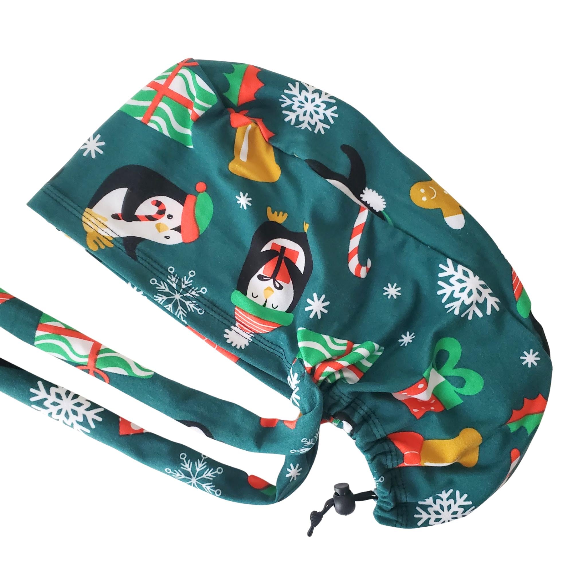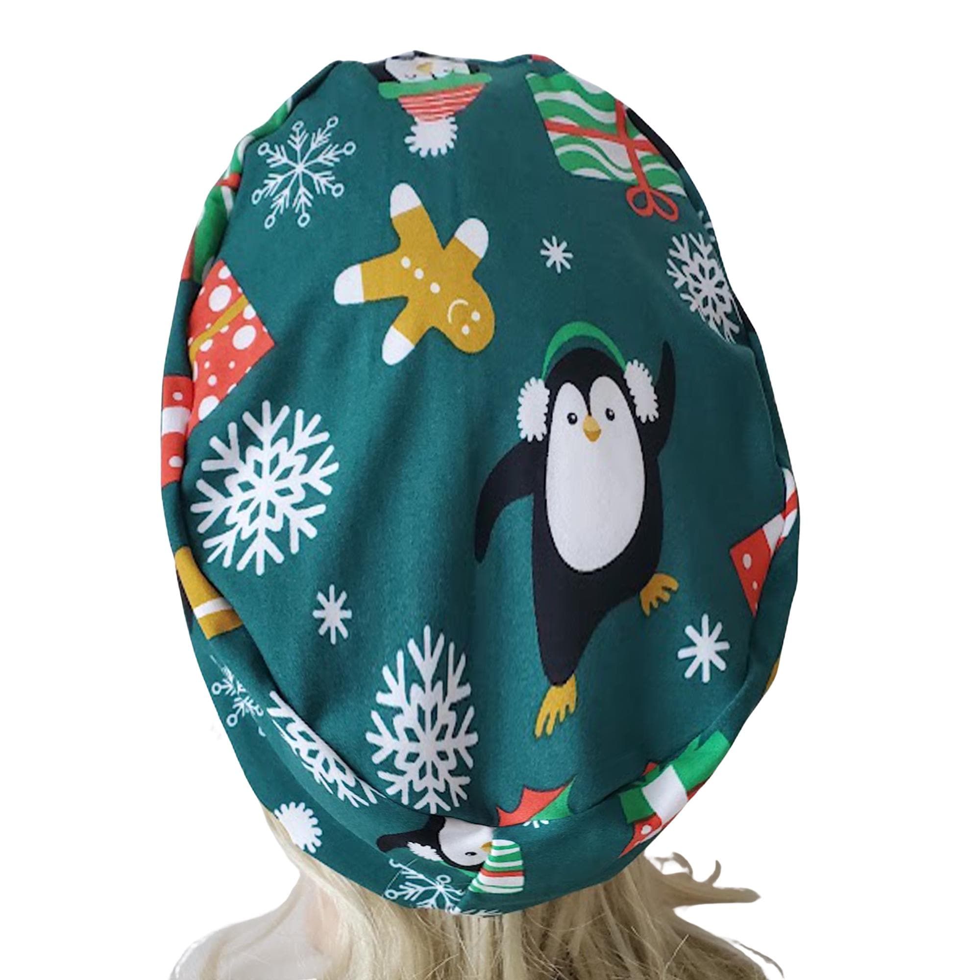 Bring cheerful winter spirit to your workday with this stretch ponytail scrub cap featuring a festive penguin and snowflake holiday print on a deep teal background.