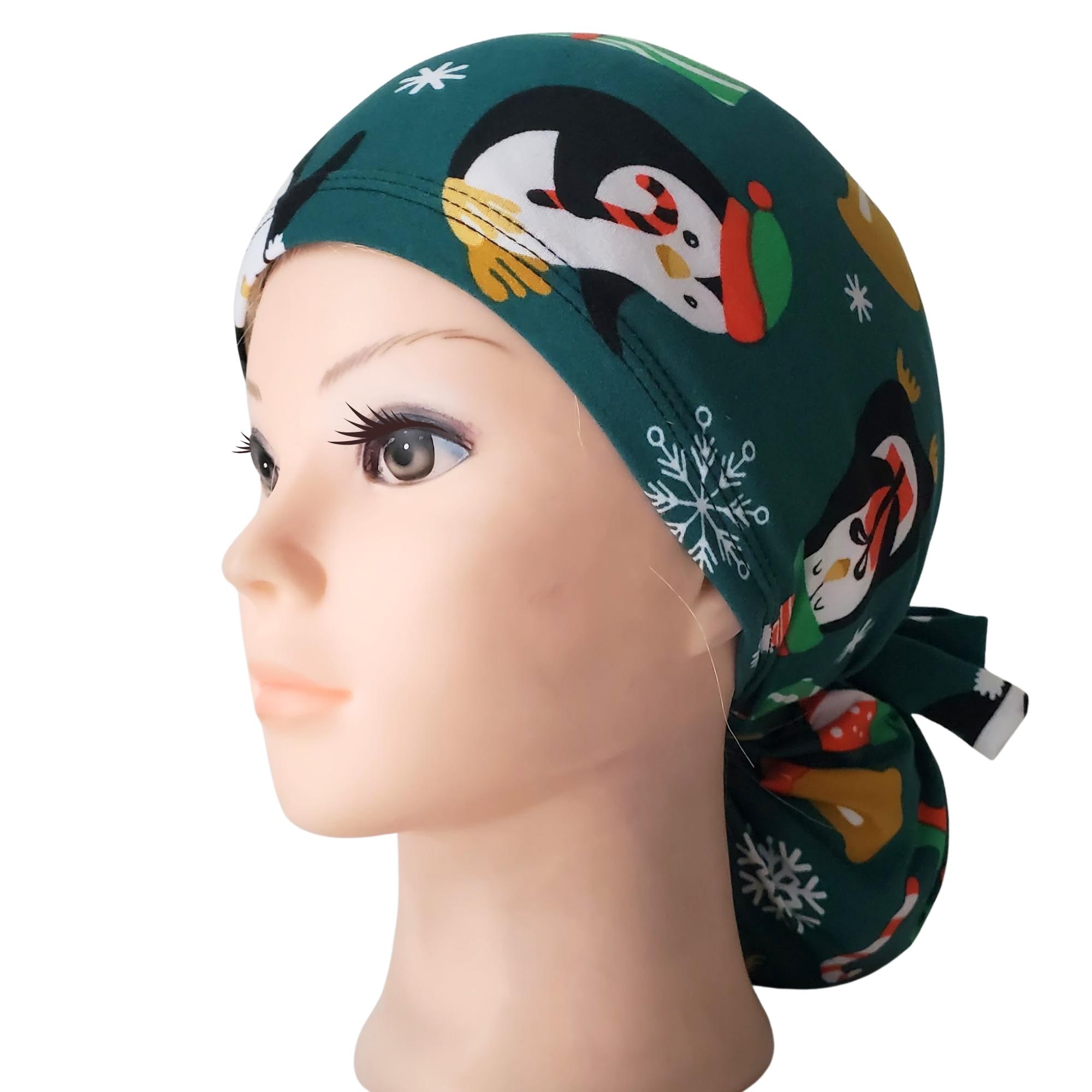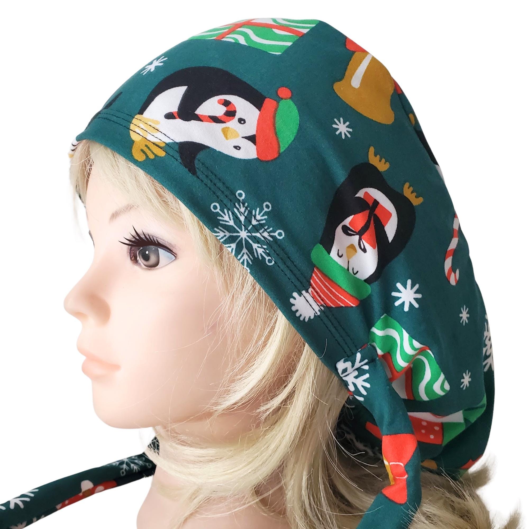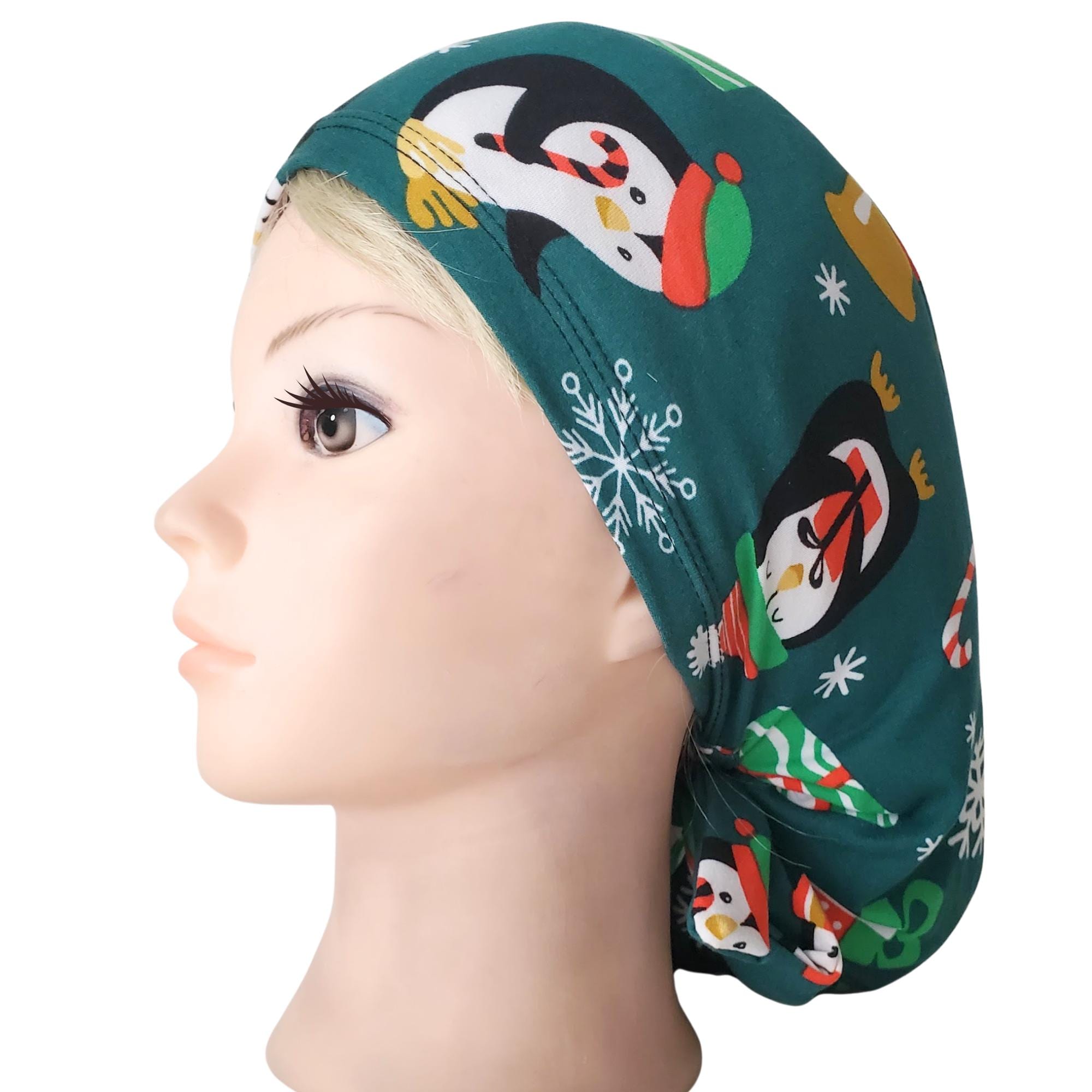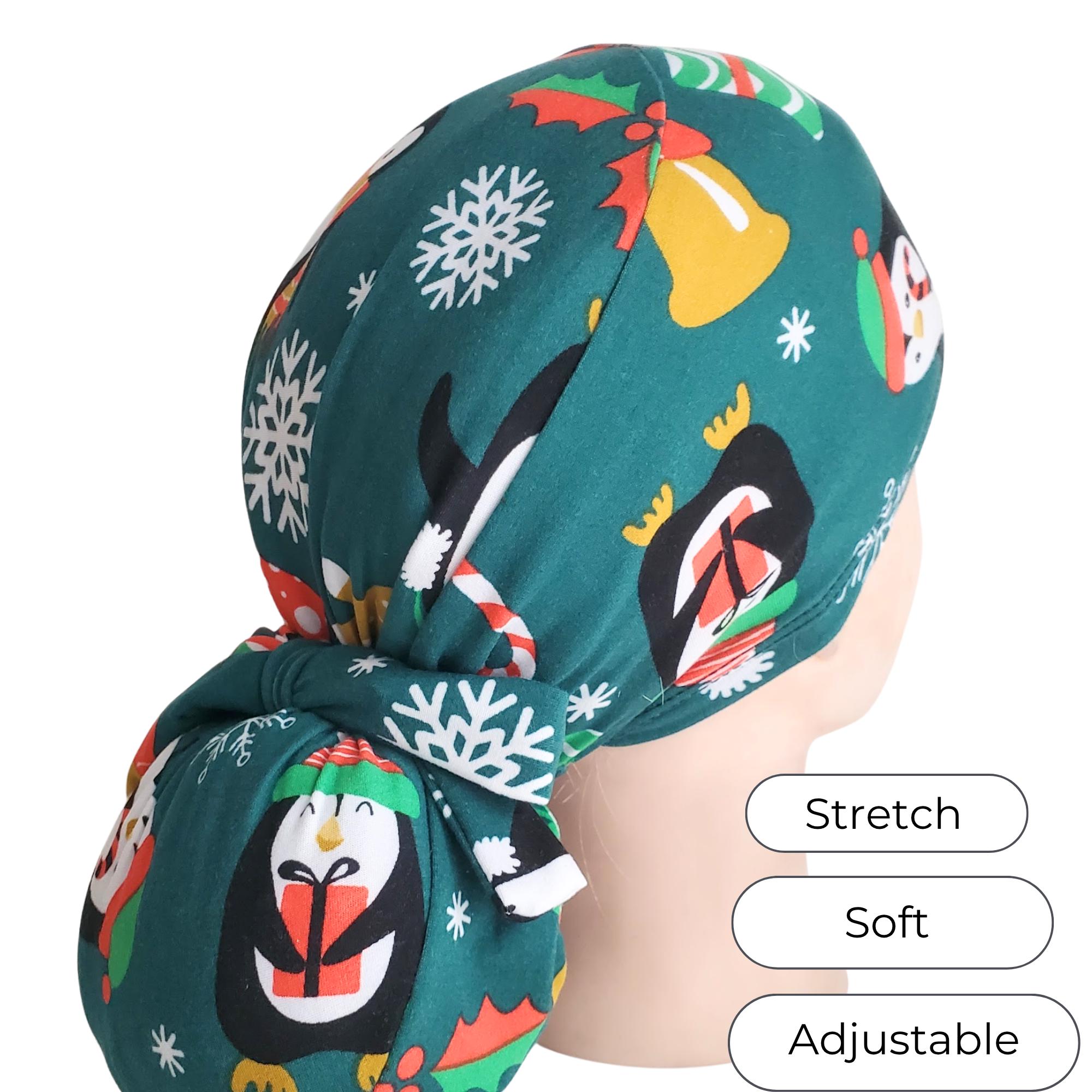 Bring cheerful winter spirit to your workday with this stretch ponytail scrub cap featuring a festive penguin and snowflake holiday print on a deep teal background.