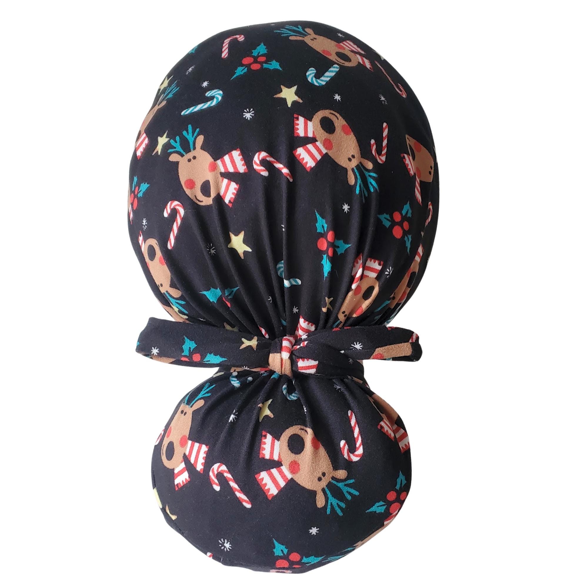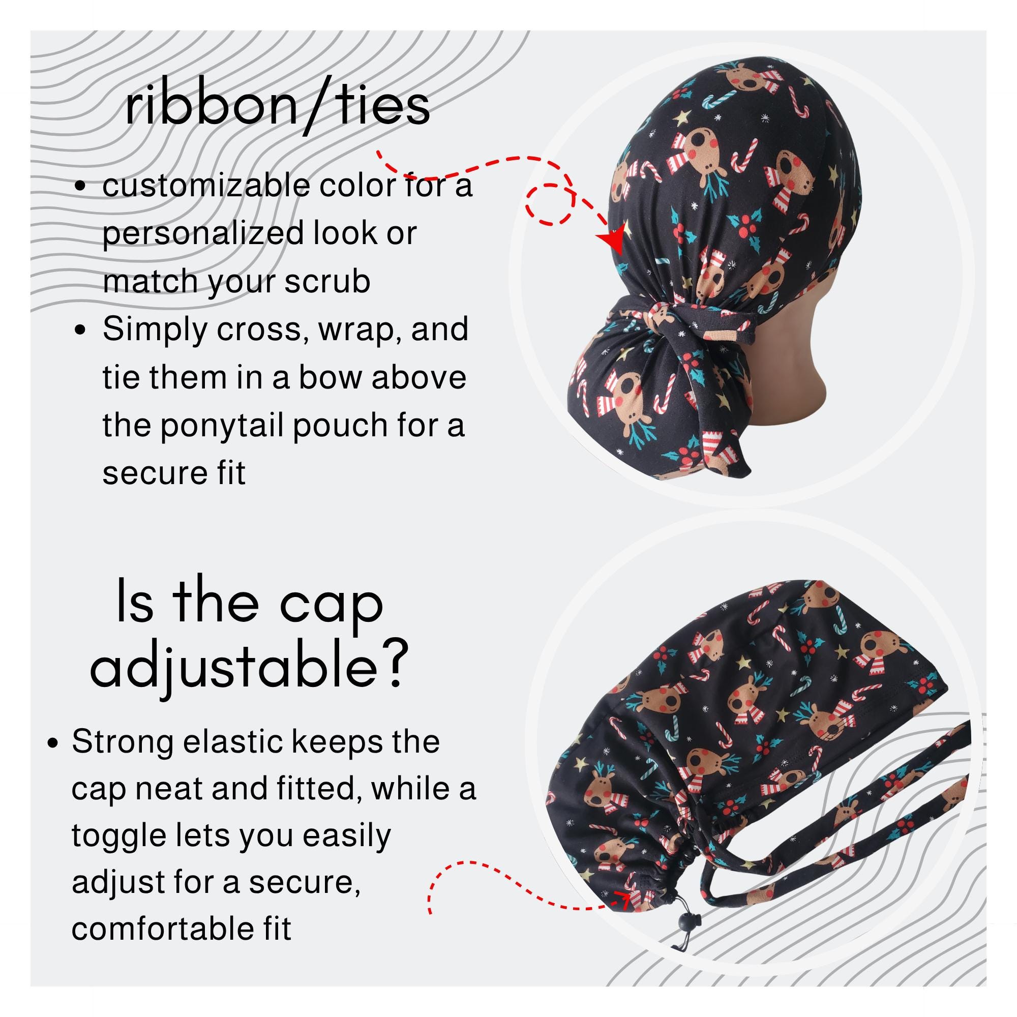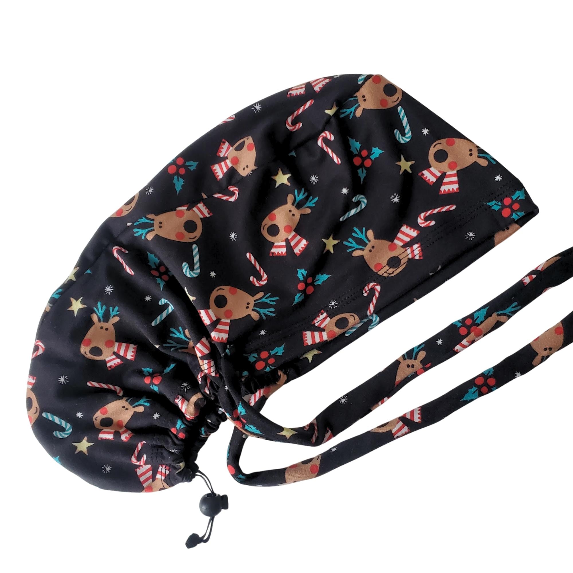 Add a playful winter touch to your scrubs with this stretch ponytail scrub cap featuring cozy reindeer, candy canes, holly, and stars on a rich black background. This print brings a festive feel without being over-the-top — perfect for holiday weeks, December shifts, and winter season cheer.