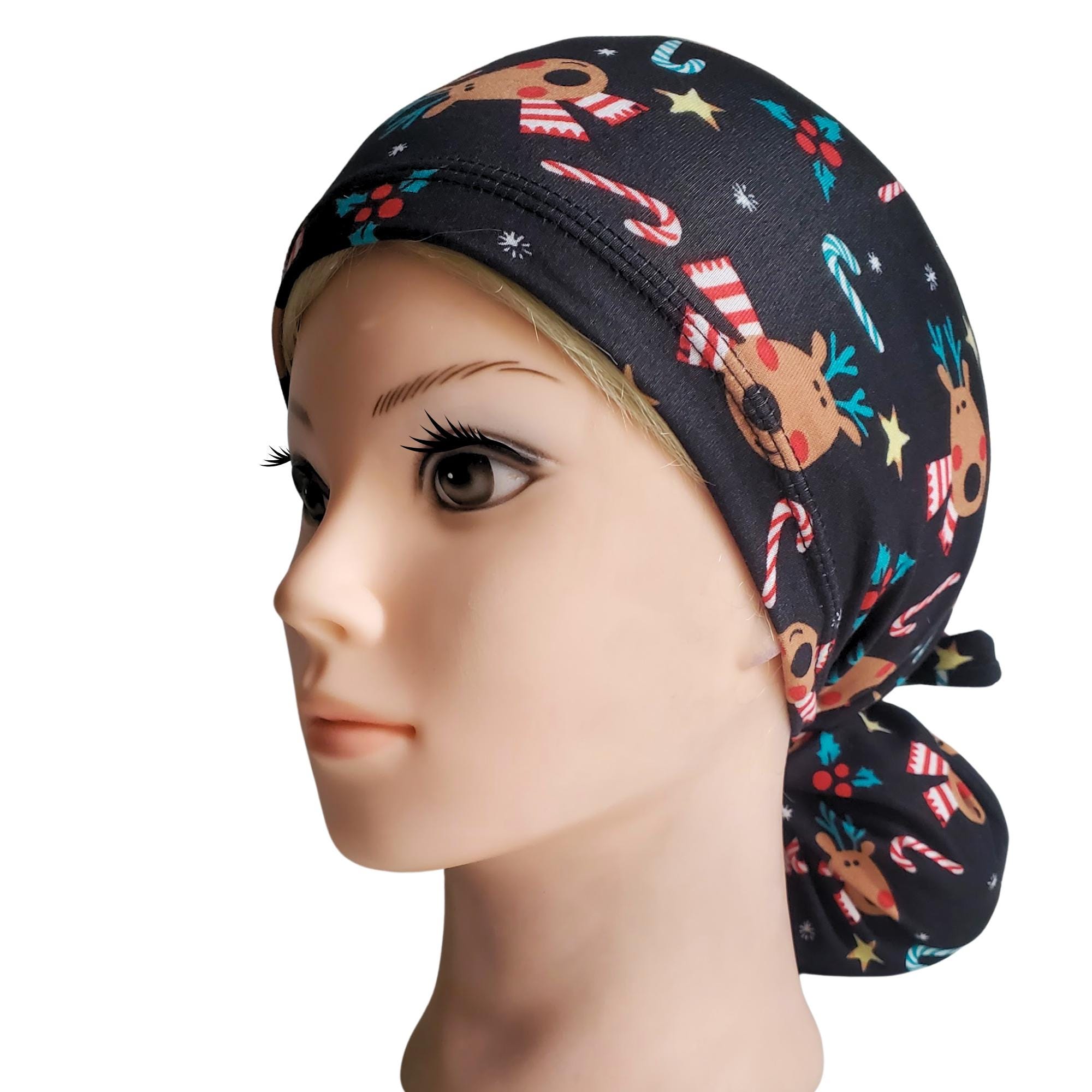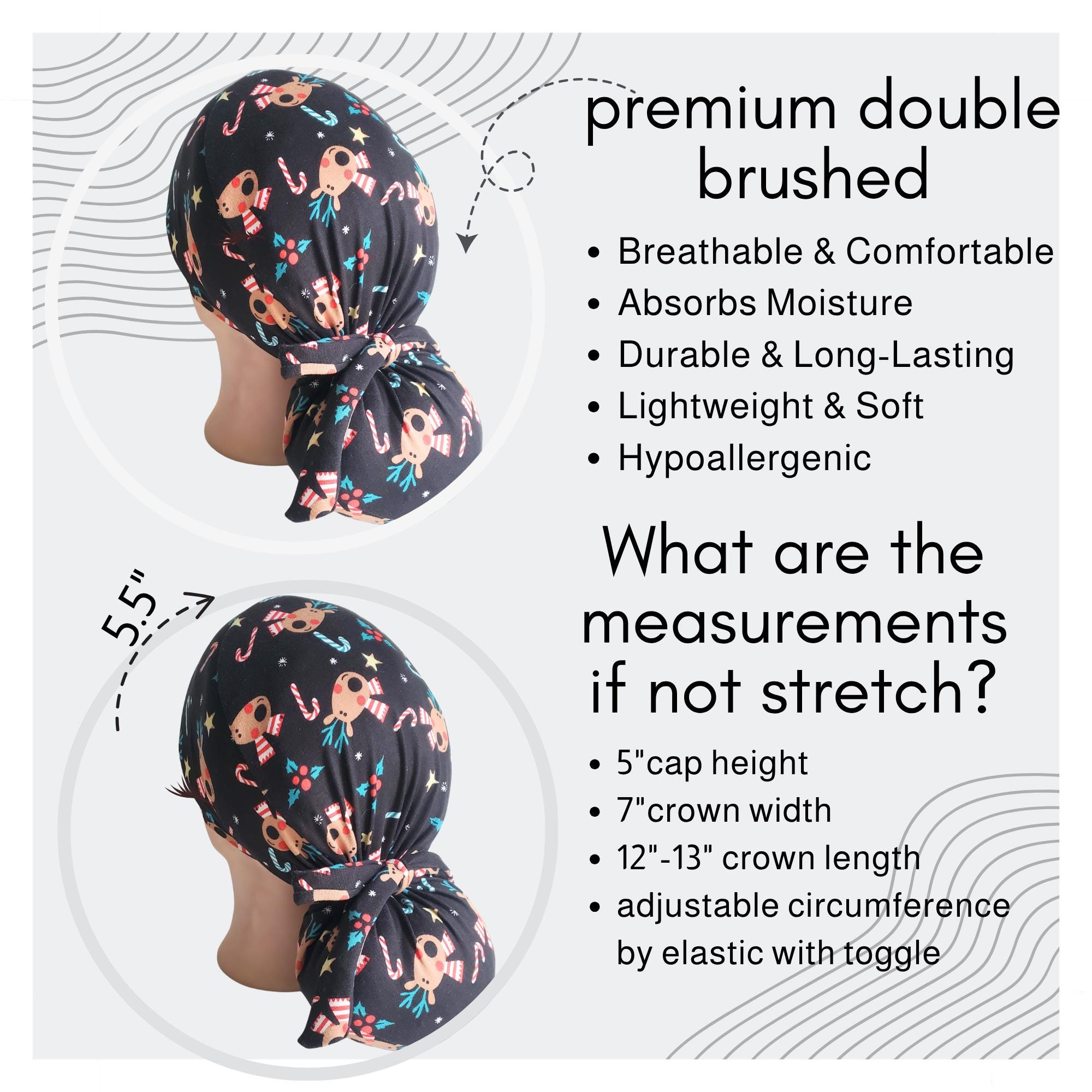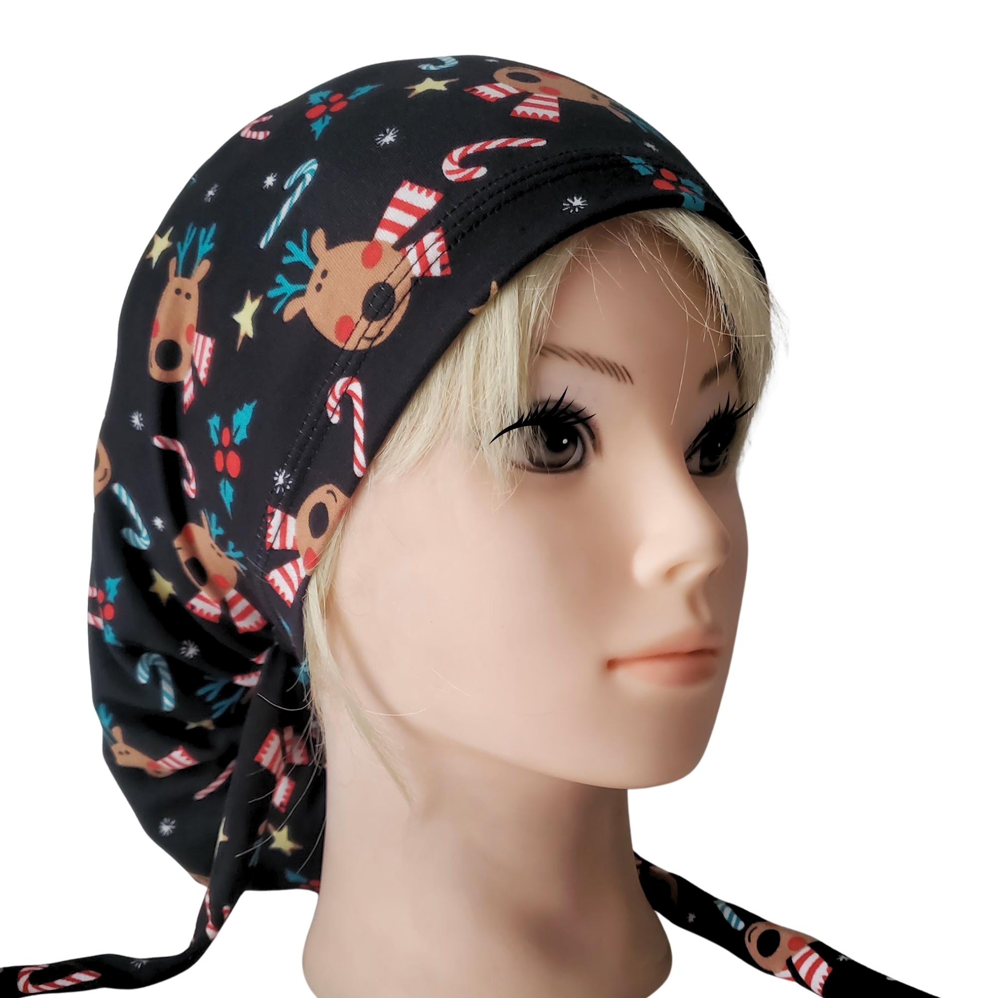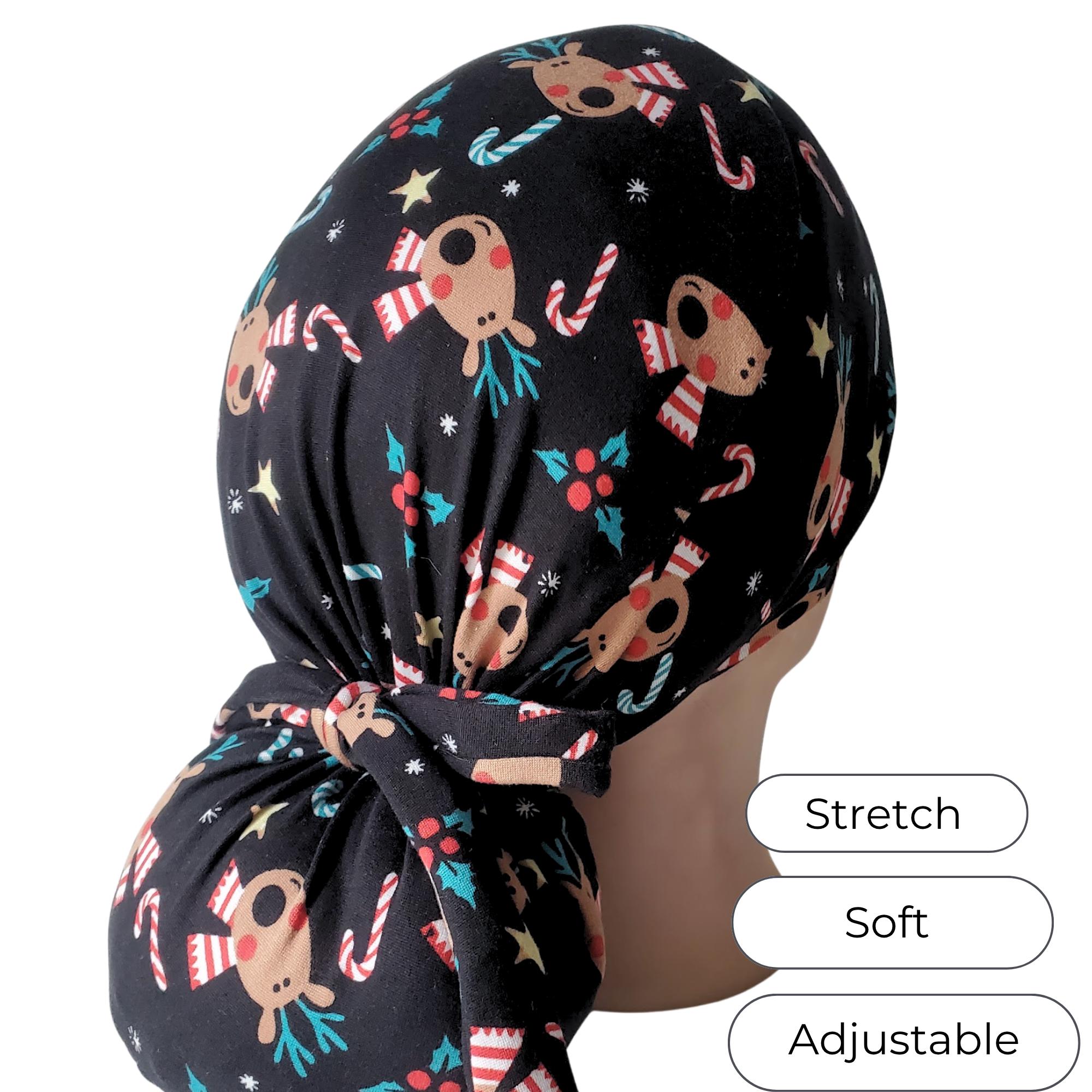 Add a playful winter touch to your scrubs with this stretch ponytail scrub cap featuring cozy reindeer, candy canes, holly, and stars on a rich black background. This print brings a festive feel without being over-the-top — perfect for holiday weeks, December shifts, and winter season cheer.