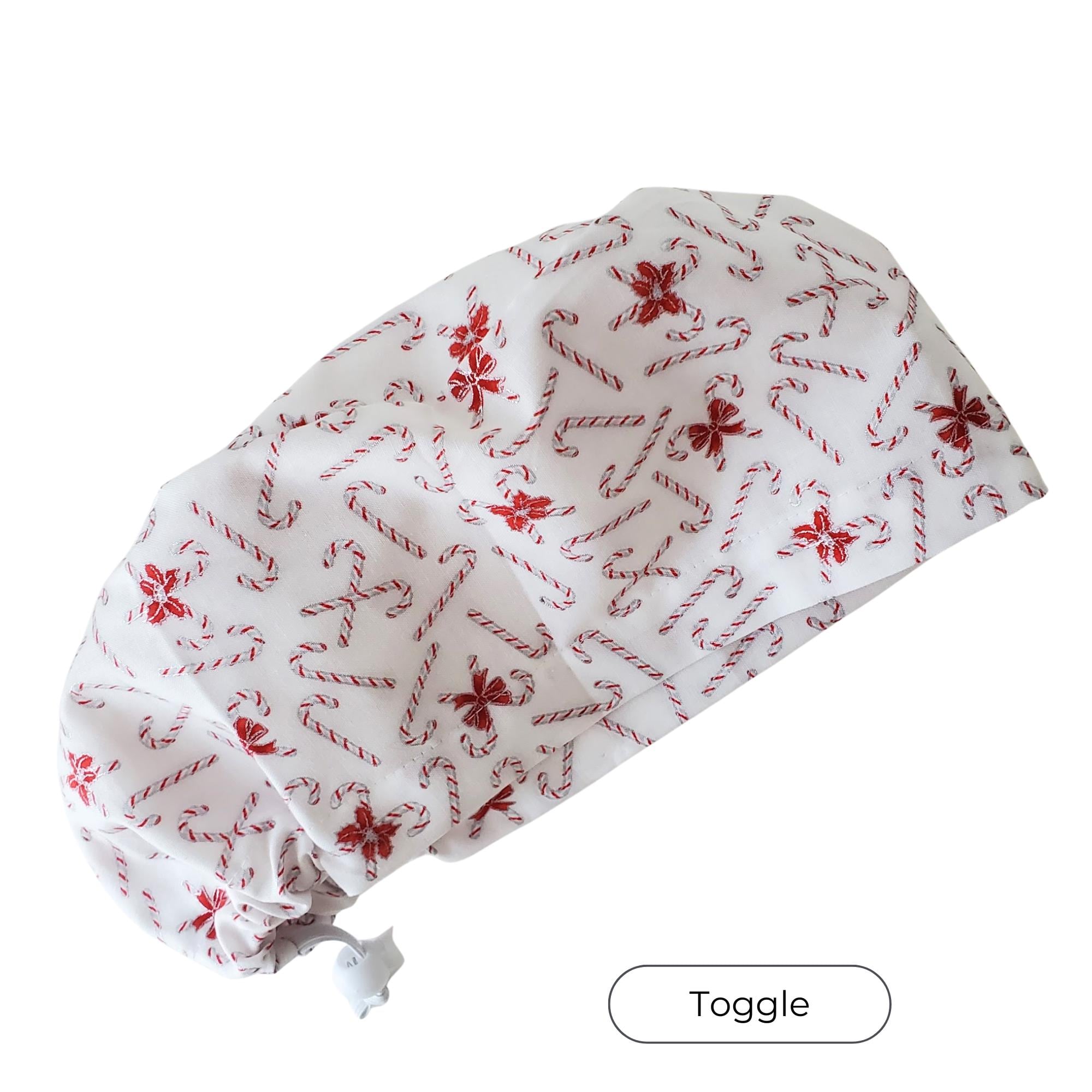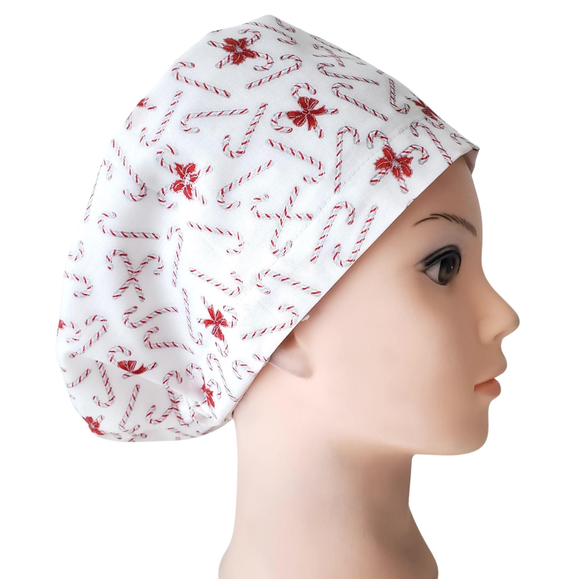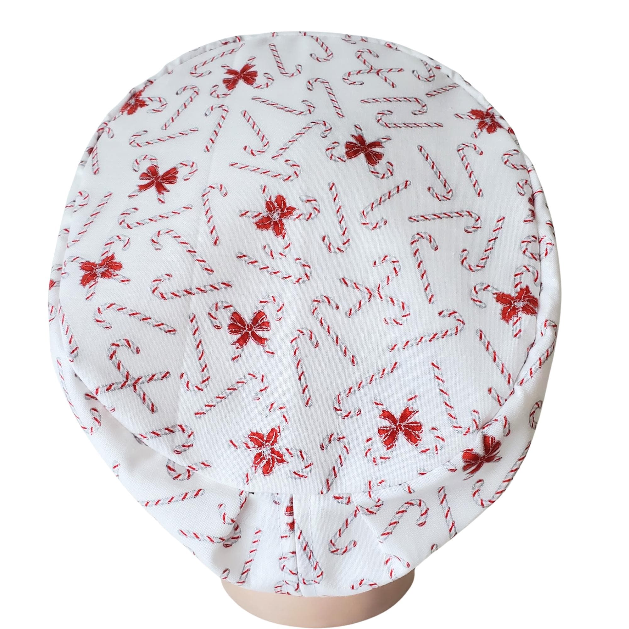 Add some festive cheer to your uniform with this Candy Cane Euro Scrub Cap. Designed with red-and-white candy canes and delicate bows on a crisp white background, this holiday scrub hat blends playful seasonal style with all-day comfort.