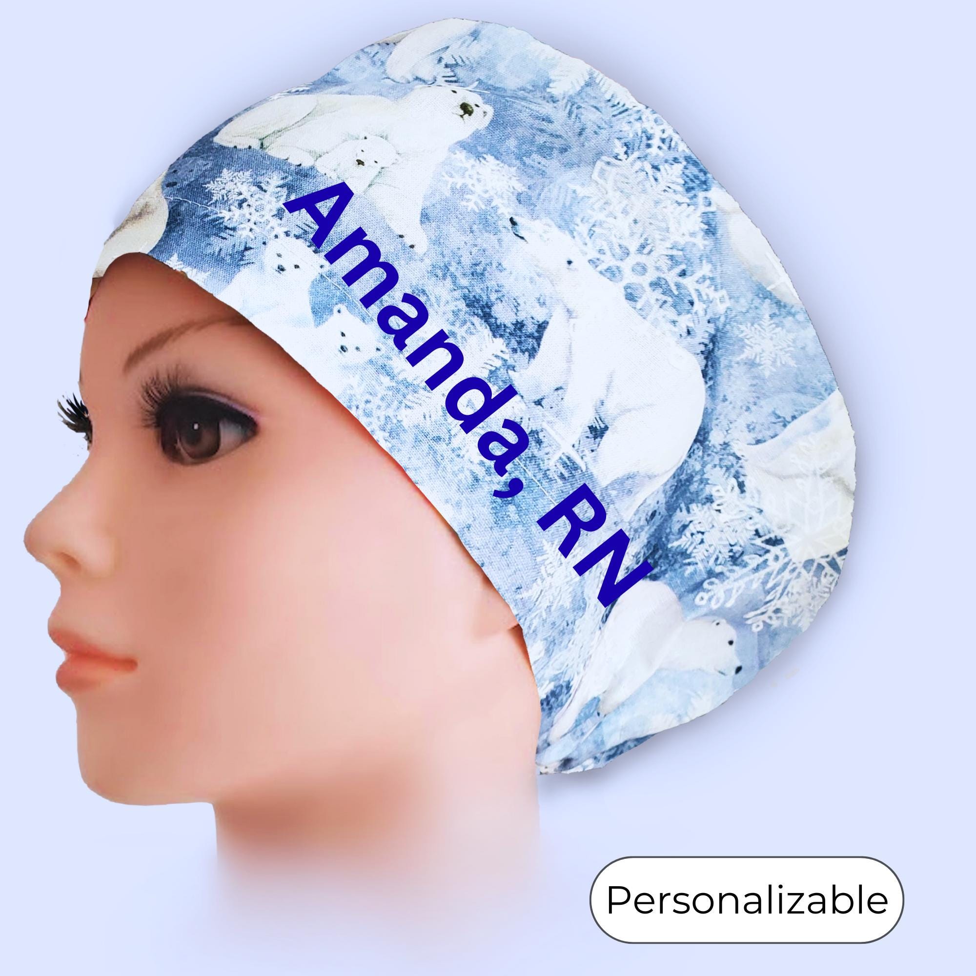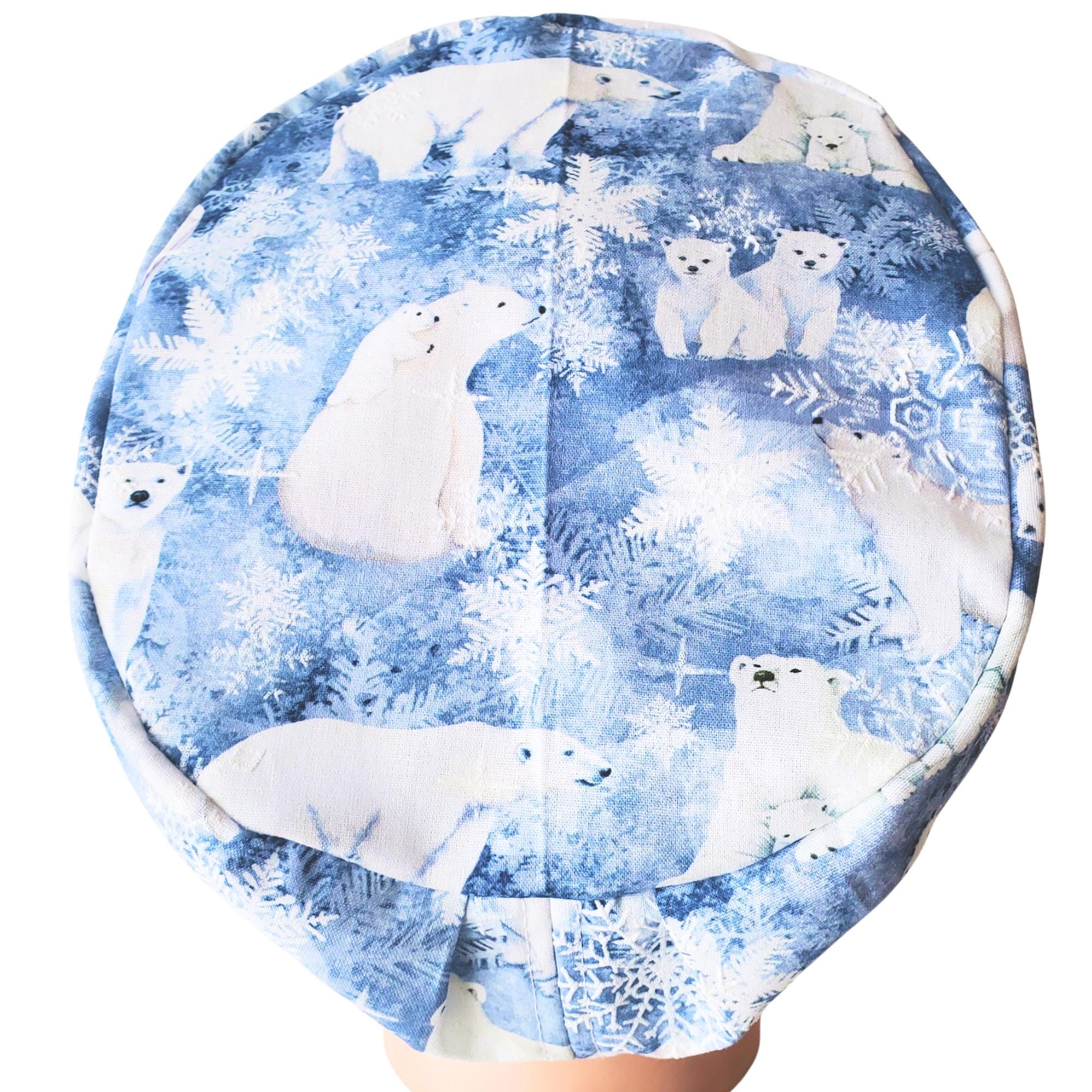 Add a cool winter vibe to your uniform with this polar bear euro style scrub cap. The icy blue background with soft white bears and snowflake details keeps your look fresh, calm, and professional.