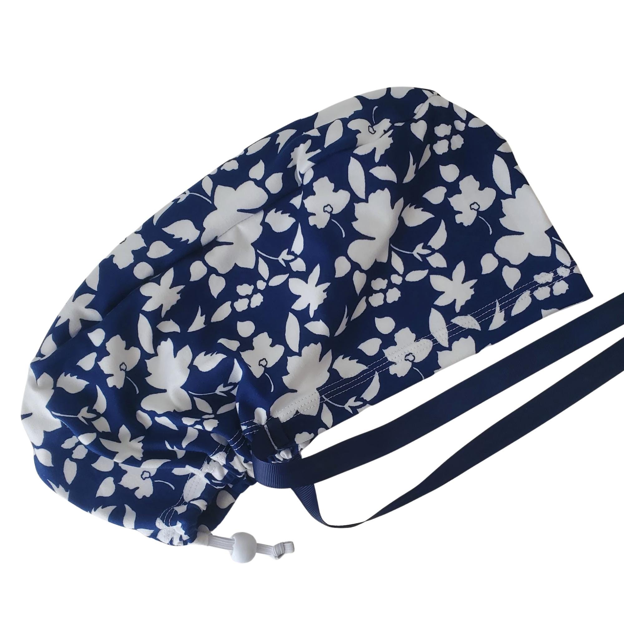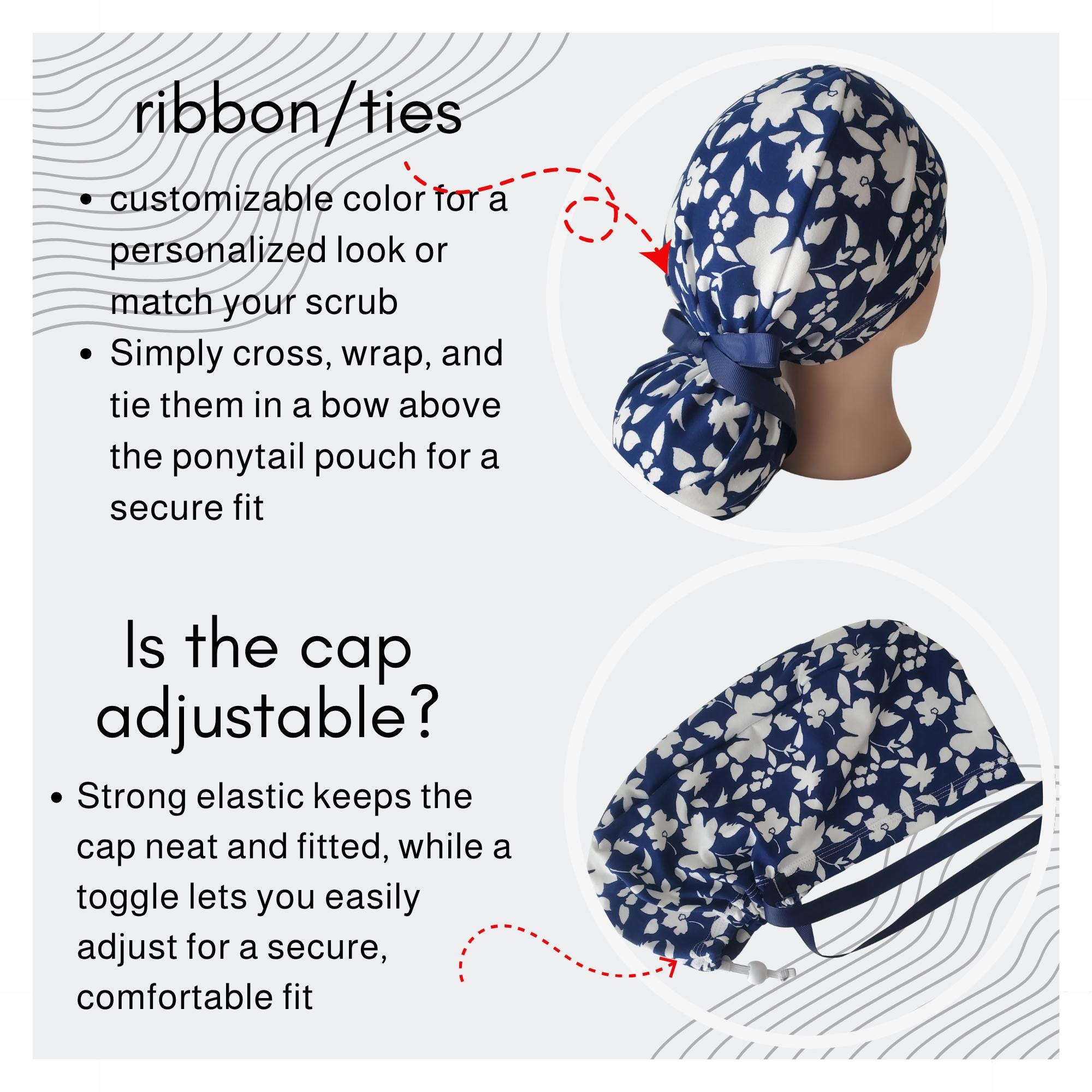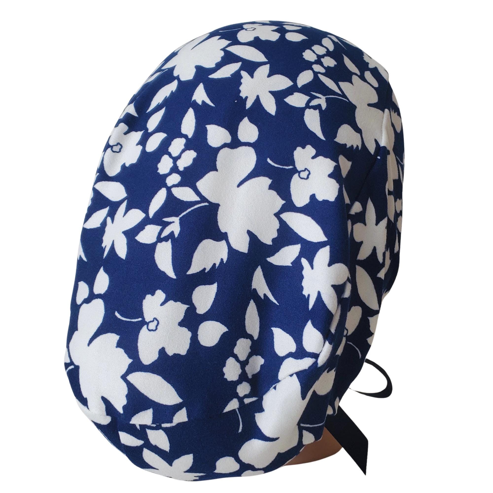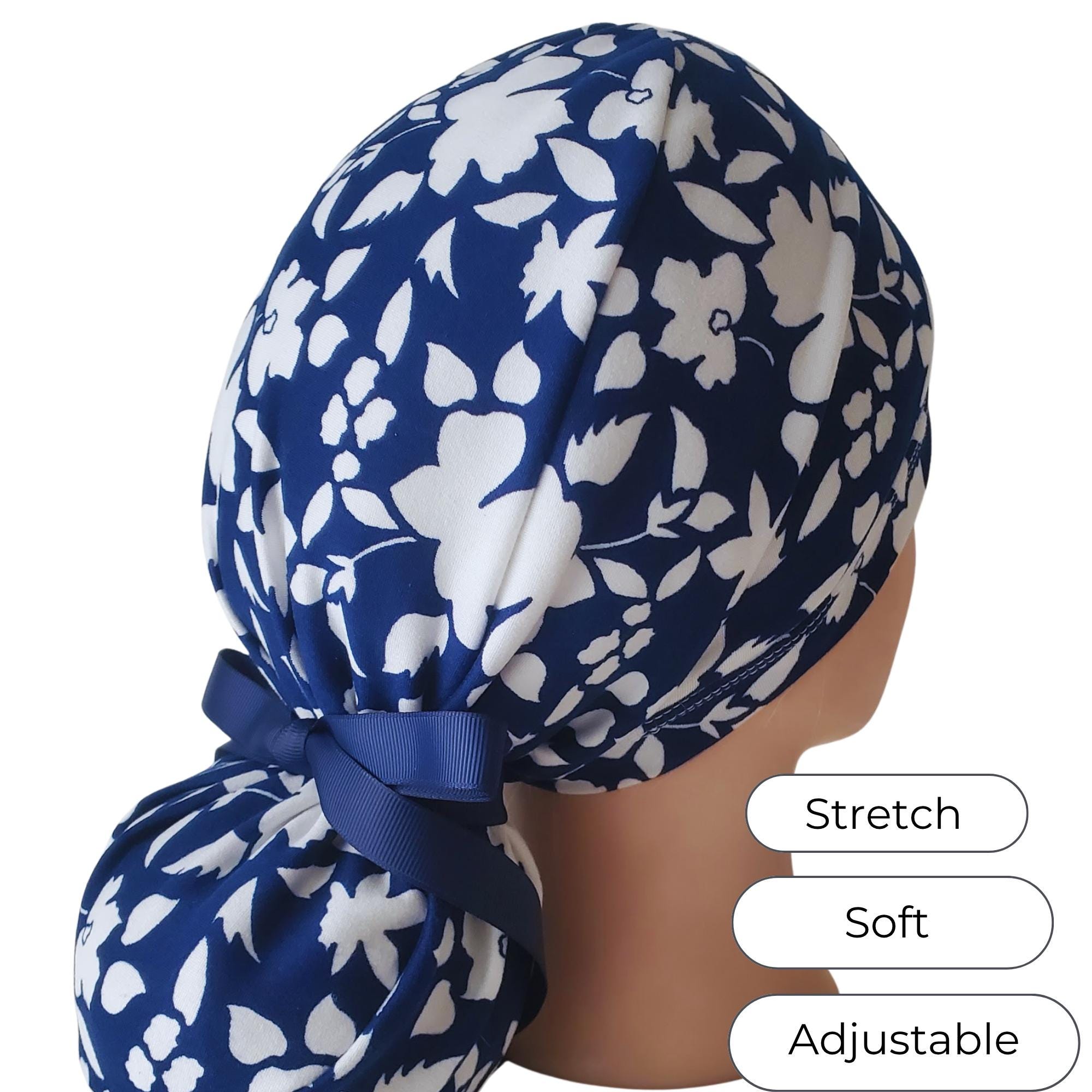 Stretch Ponytail Scrub Cap: Navy and White Floral Print, Soft Lightweight Fabric, Adjustable Toggle & Ribbon Tie for Long Hair