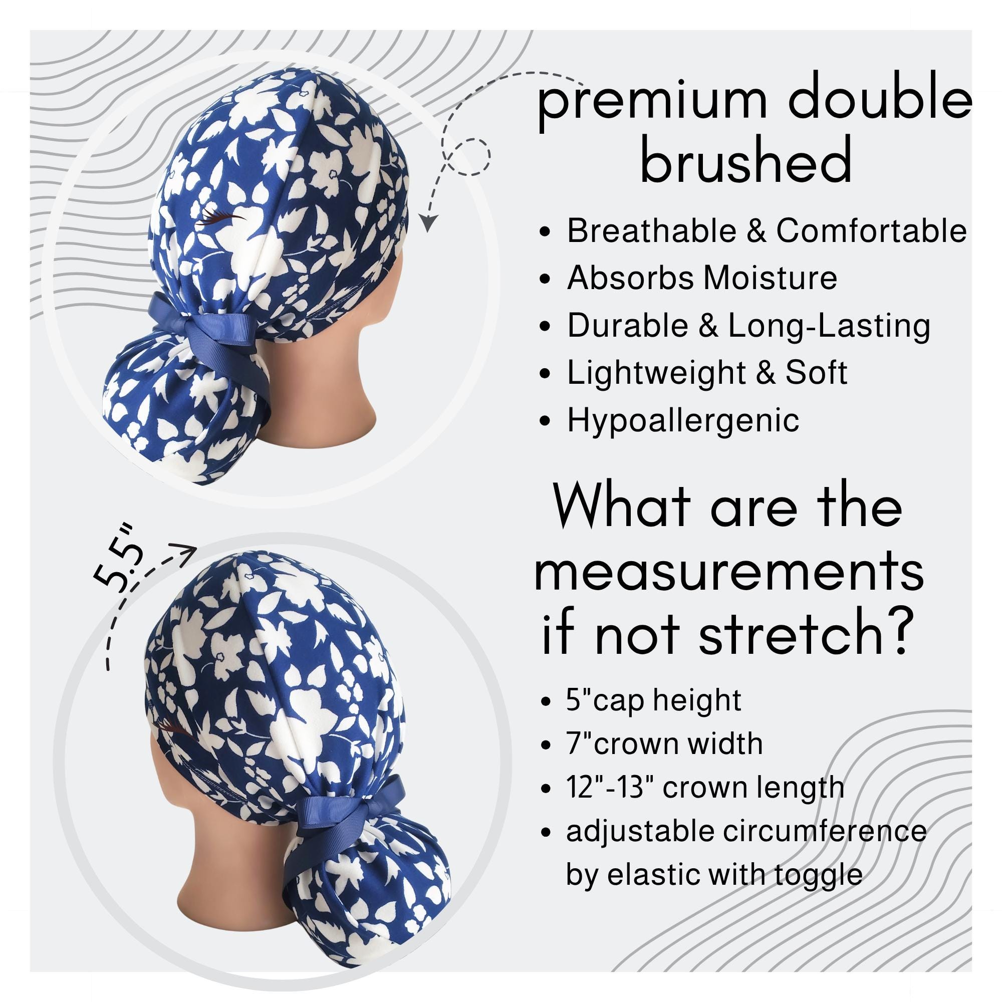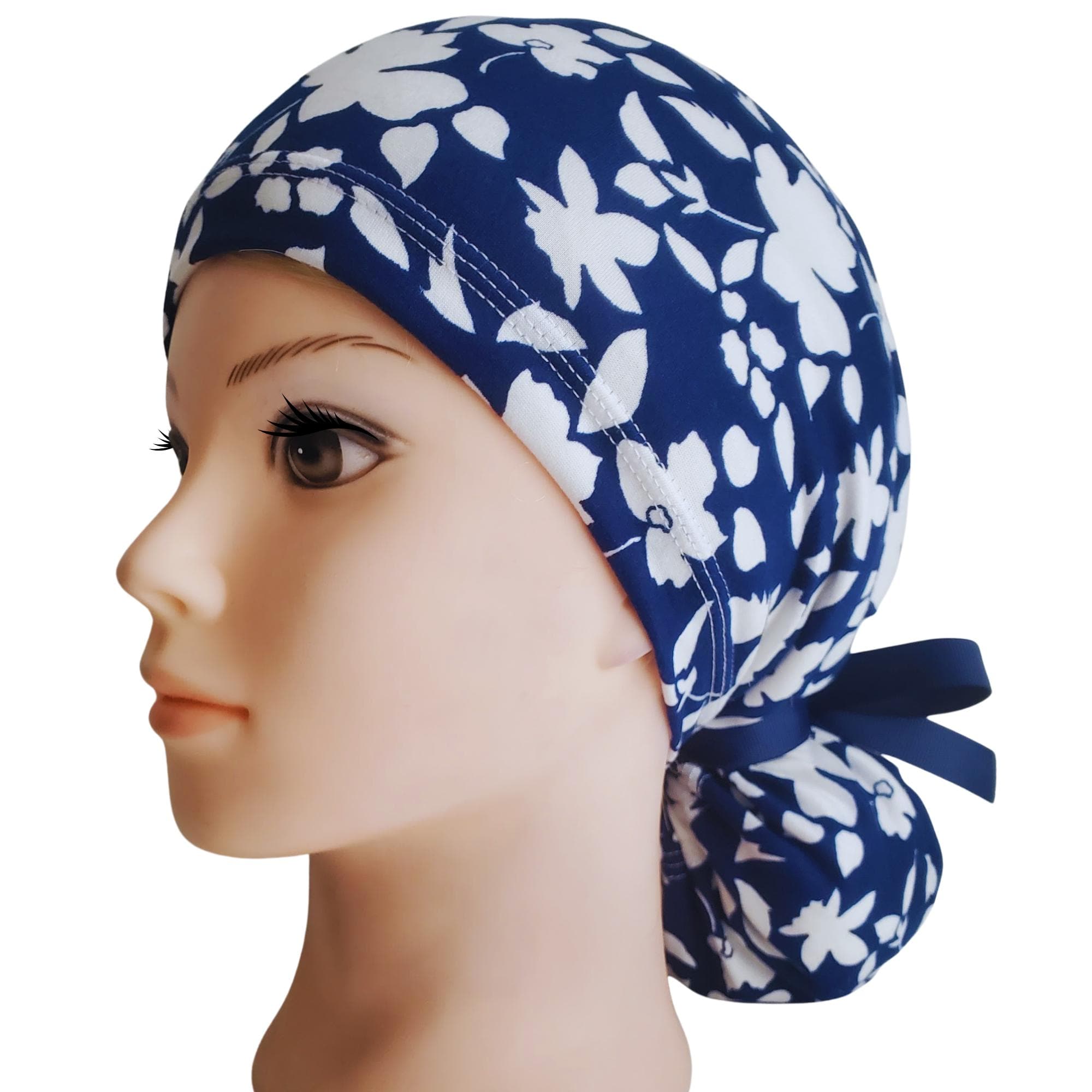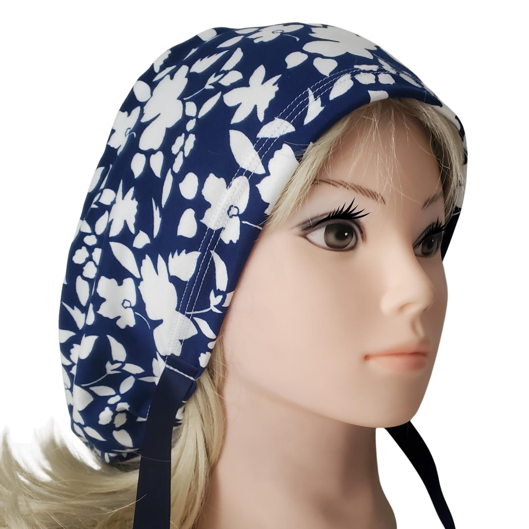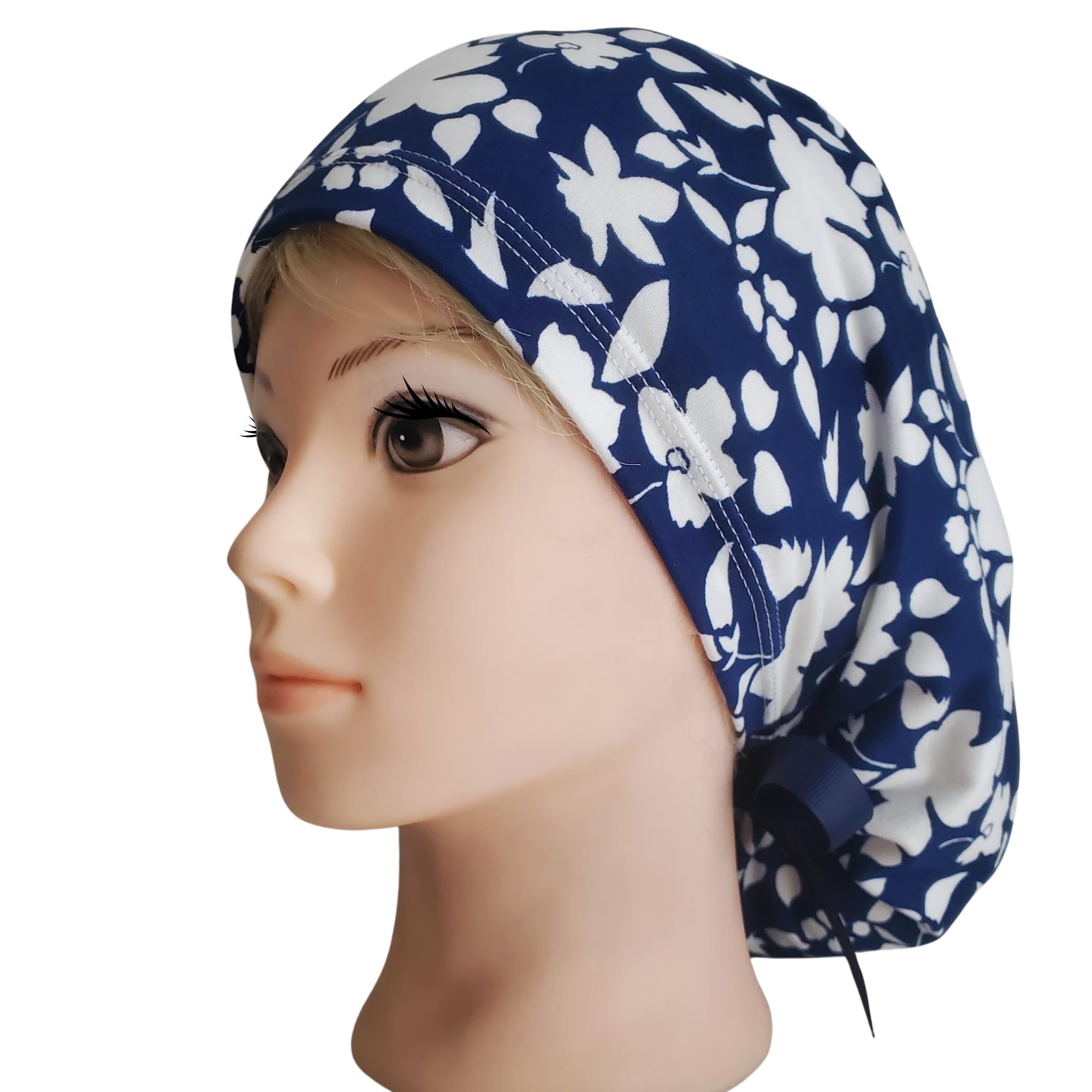 Stretch Ponytail Scrub Cap: Navy and White Floral Print, Soft Lightweight Fabric, Adjustable Toggle & Ribbon Tie for Long Hair