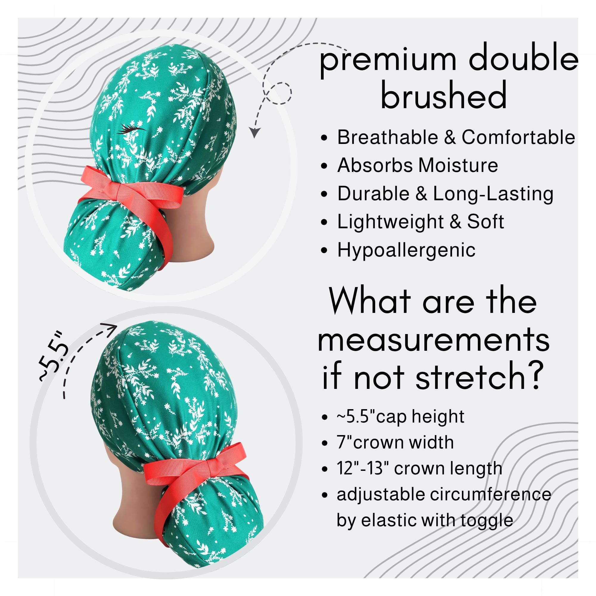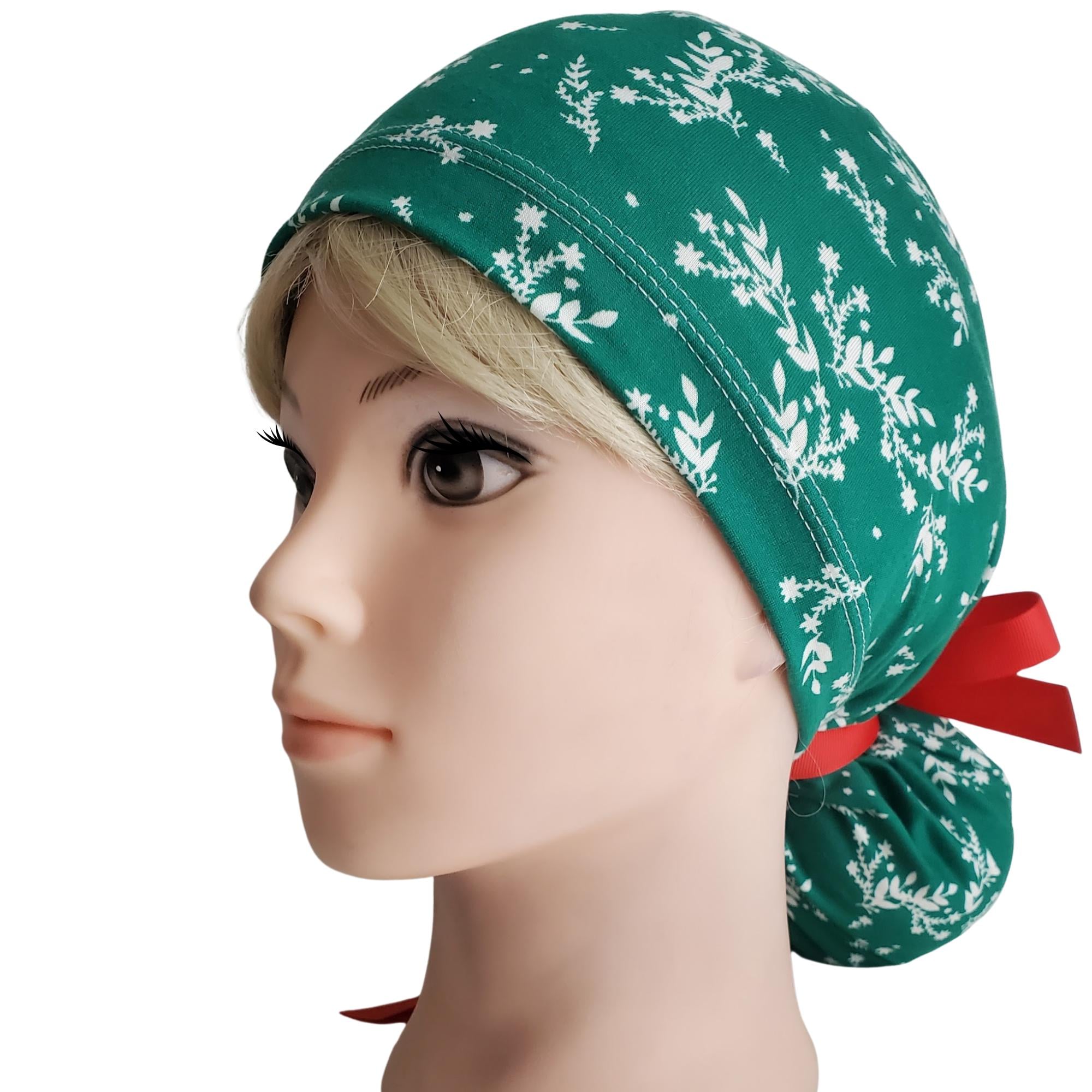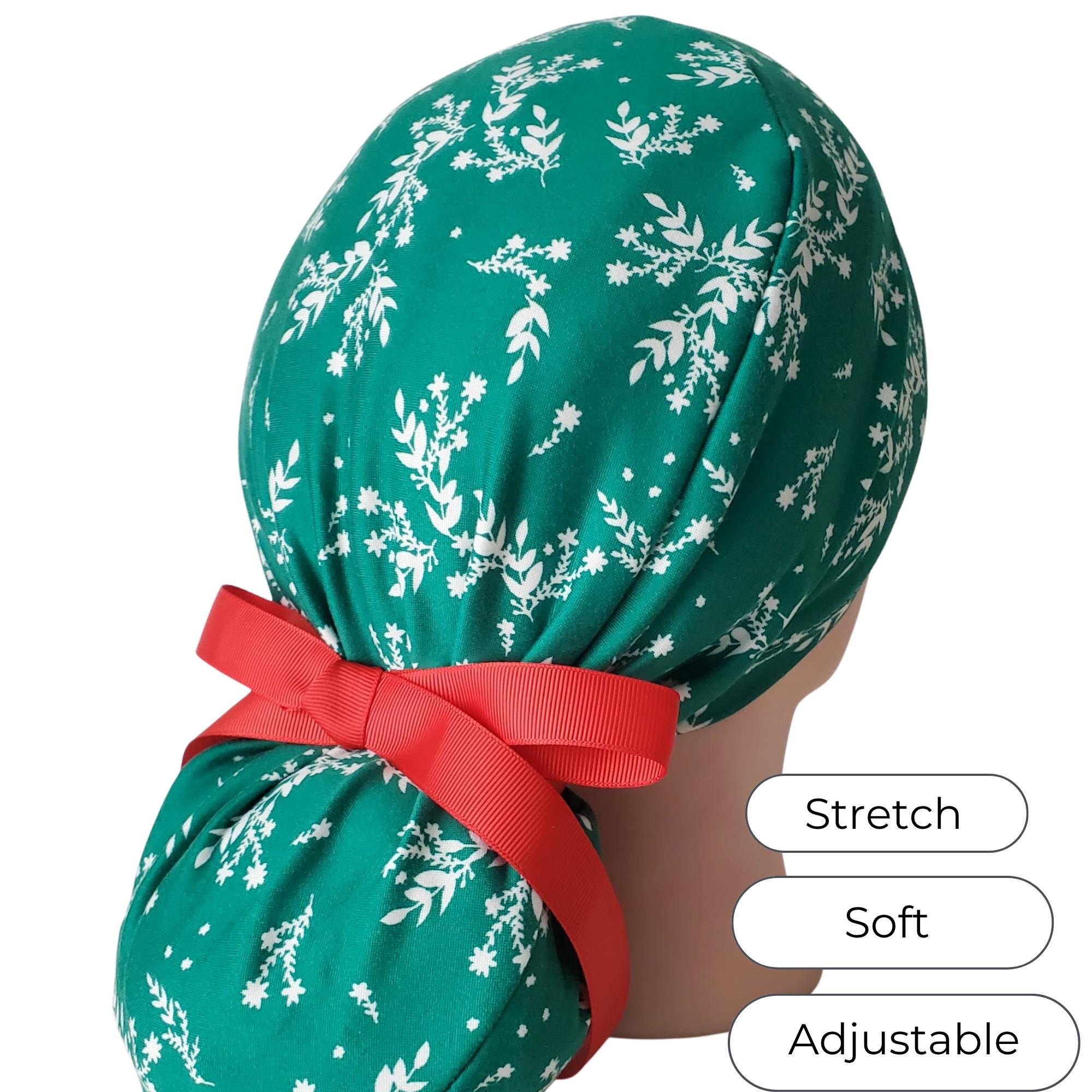 Add festive cheer to your shift with this stretch ponytail scrub cap in a Green Christmas print. Soft, breathable, and easy-care, this cap keeps you comfortable while bringing holiday spirit to the workplace.