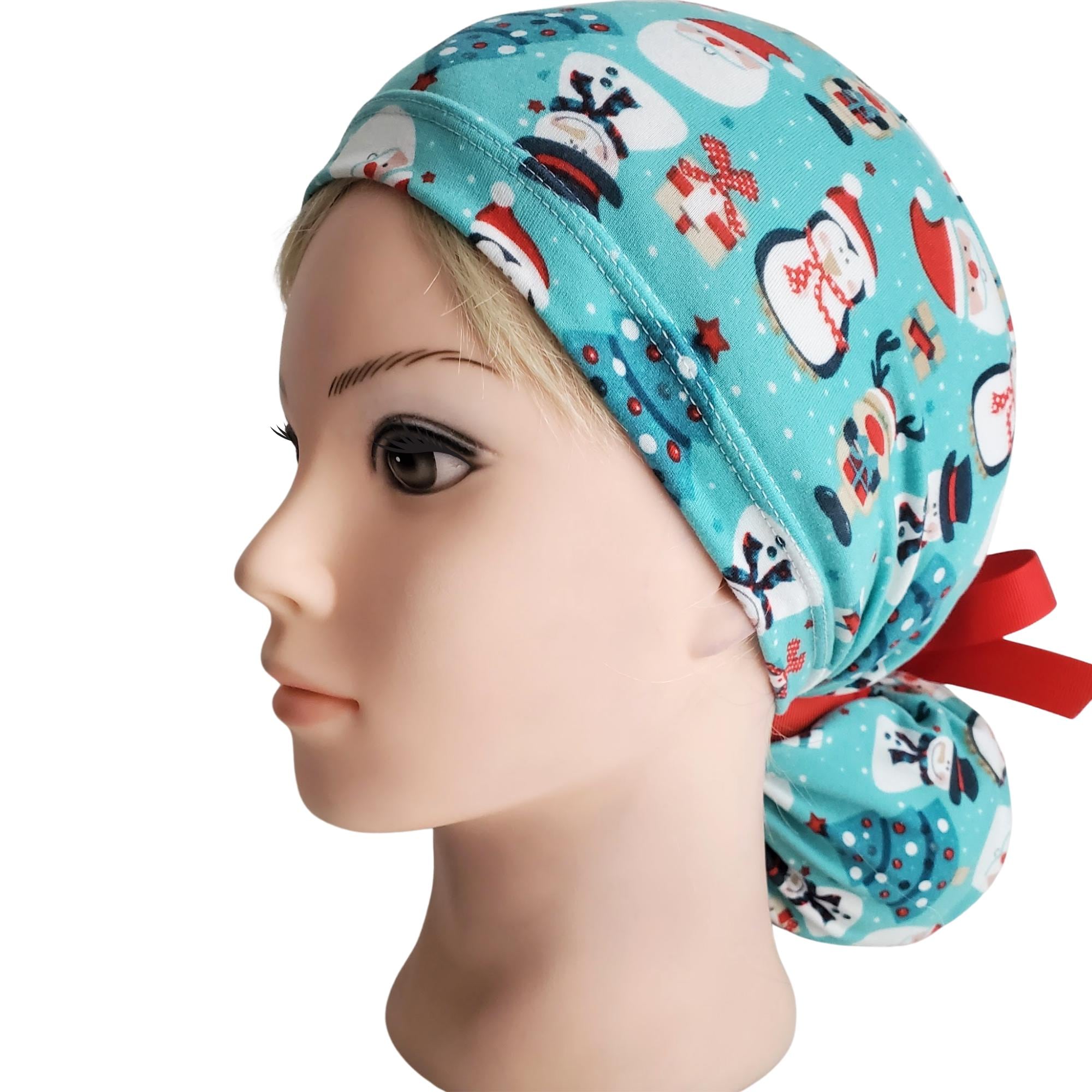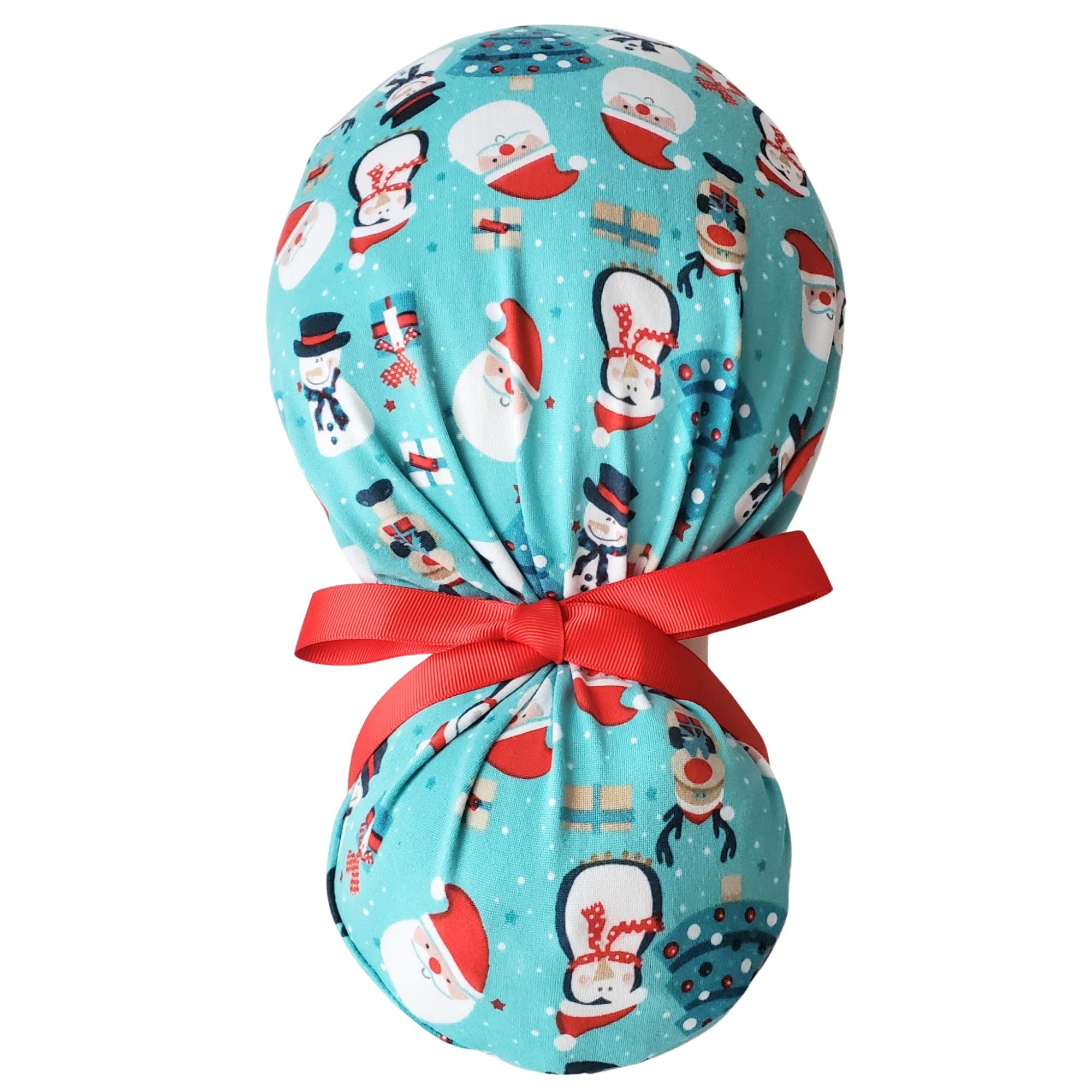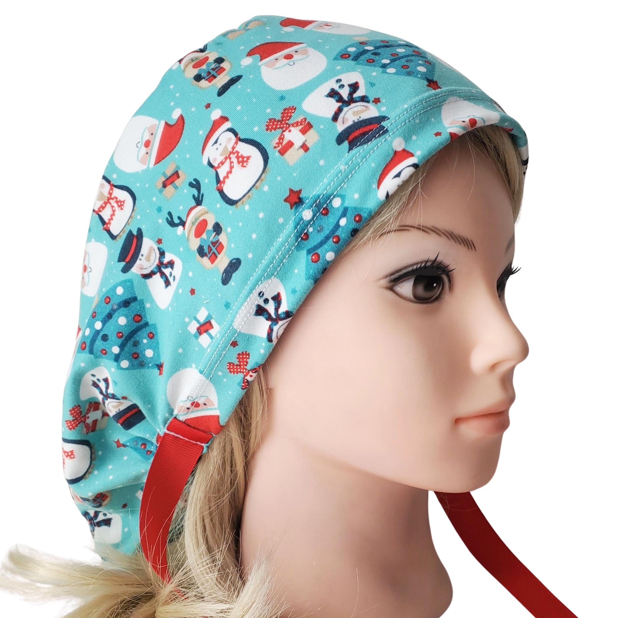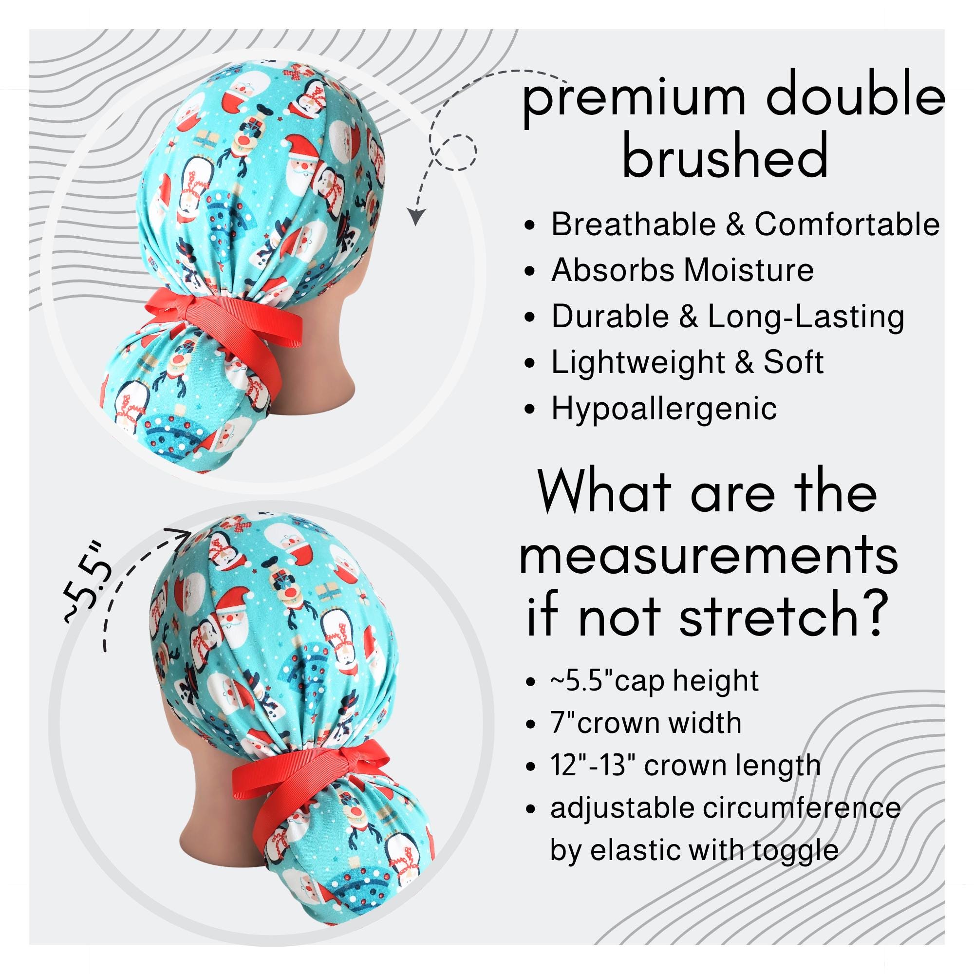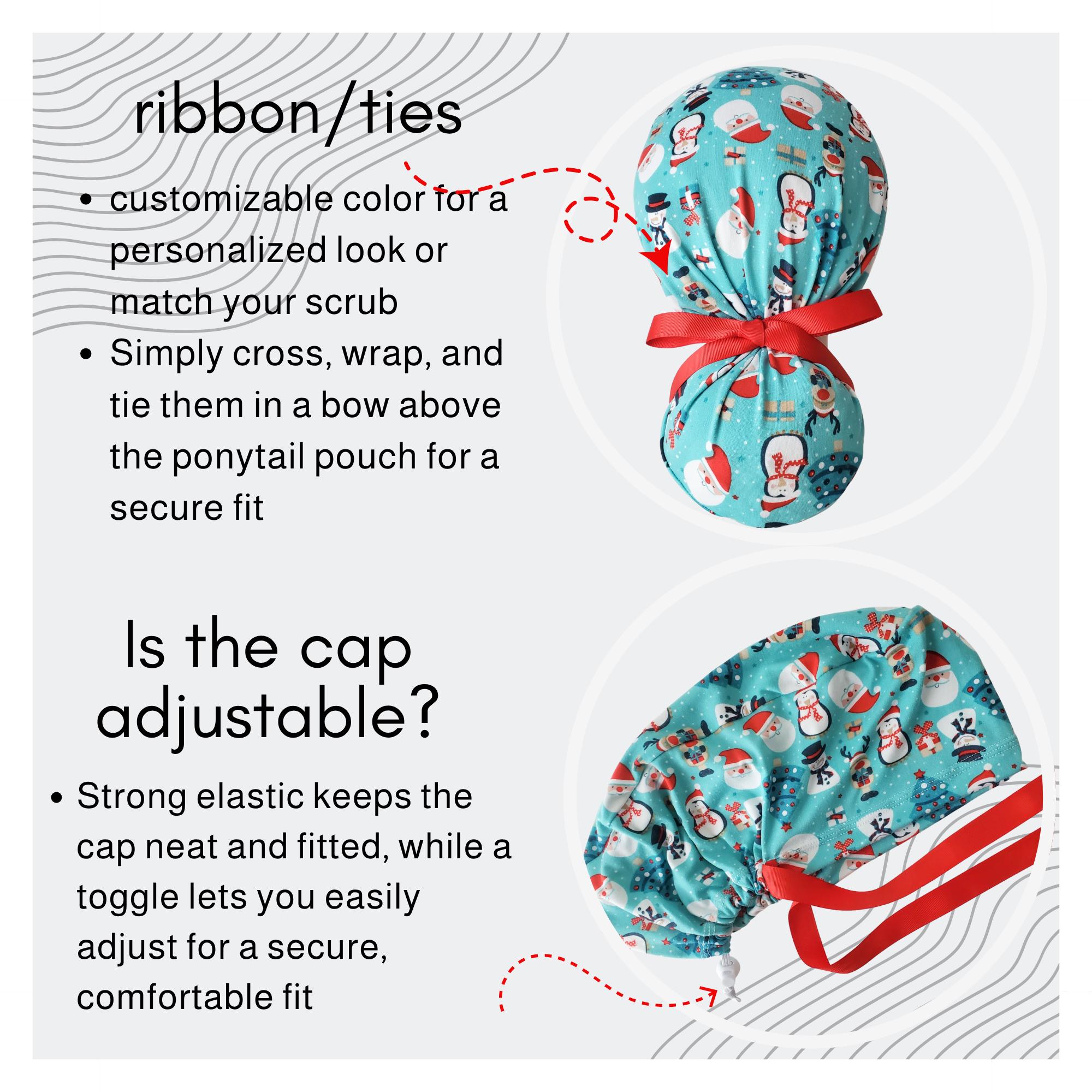 Bring a touch of holiday joy to your workday with this stretch ponytail scrub cap featuring a cheerful turquoise Christmas print. The playful pattern includes Santa, snowmen, and reindeer surrounded by gifts and snowflakes — a perfect way to brighten your shift. Made from soft breathable stretch fabric, this cap provides lasting comfort while maintaining a neat professional look. The roomy ponytail pouch fits long or thick hair, and the adjustable toggle allows for a perfect personalized fit. A red ribbon tie completes the design with a festive finish. Easy care and wrinkle free, this scrub cap is ideal for the busy season or adding holiday cheer to your uniform.