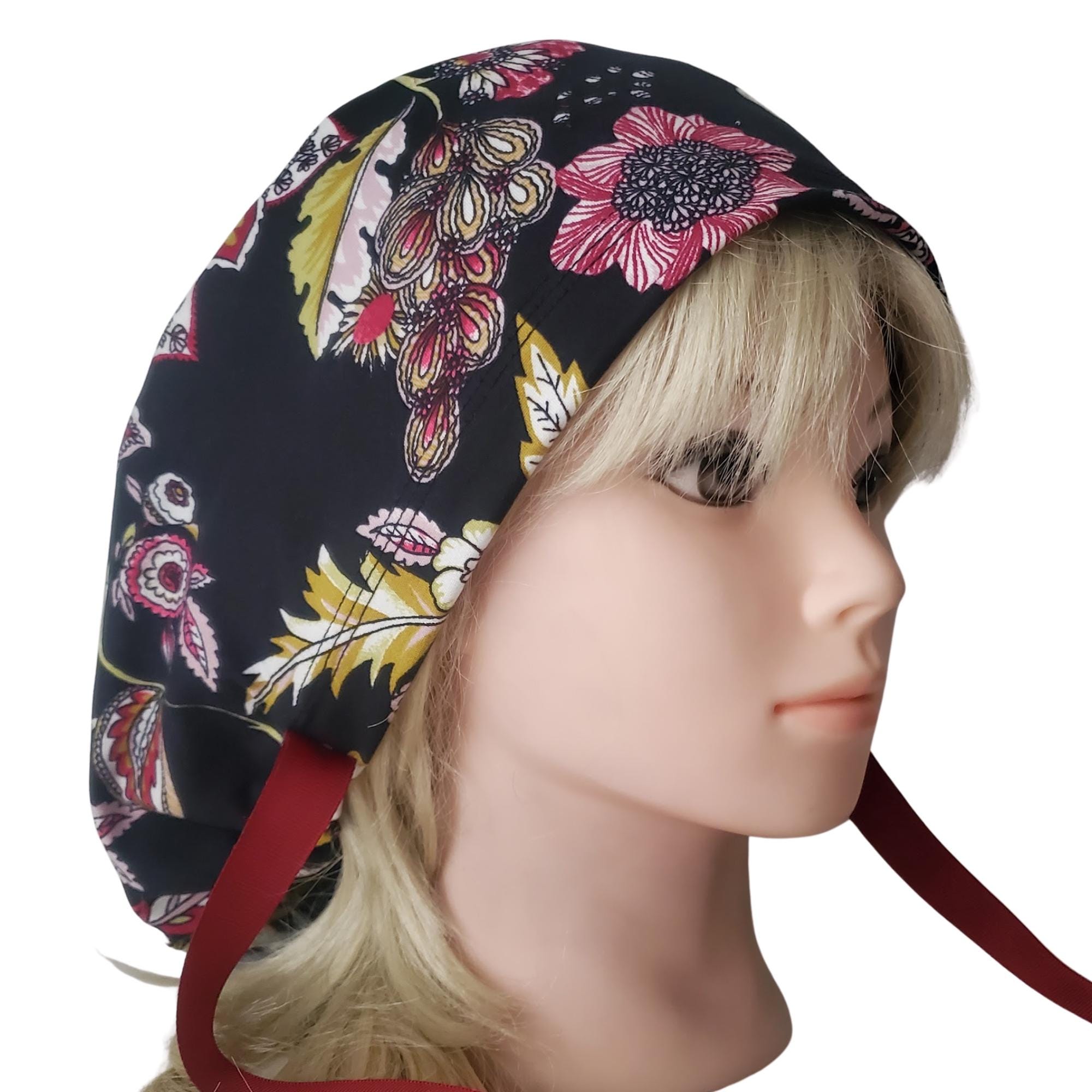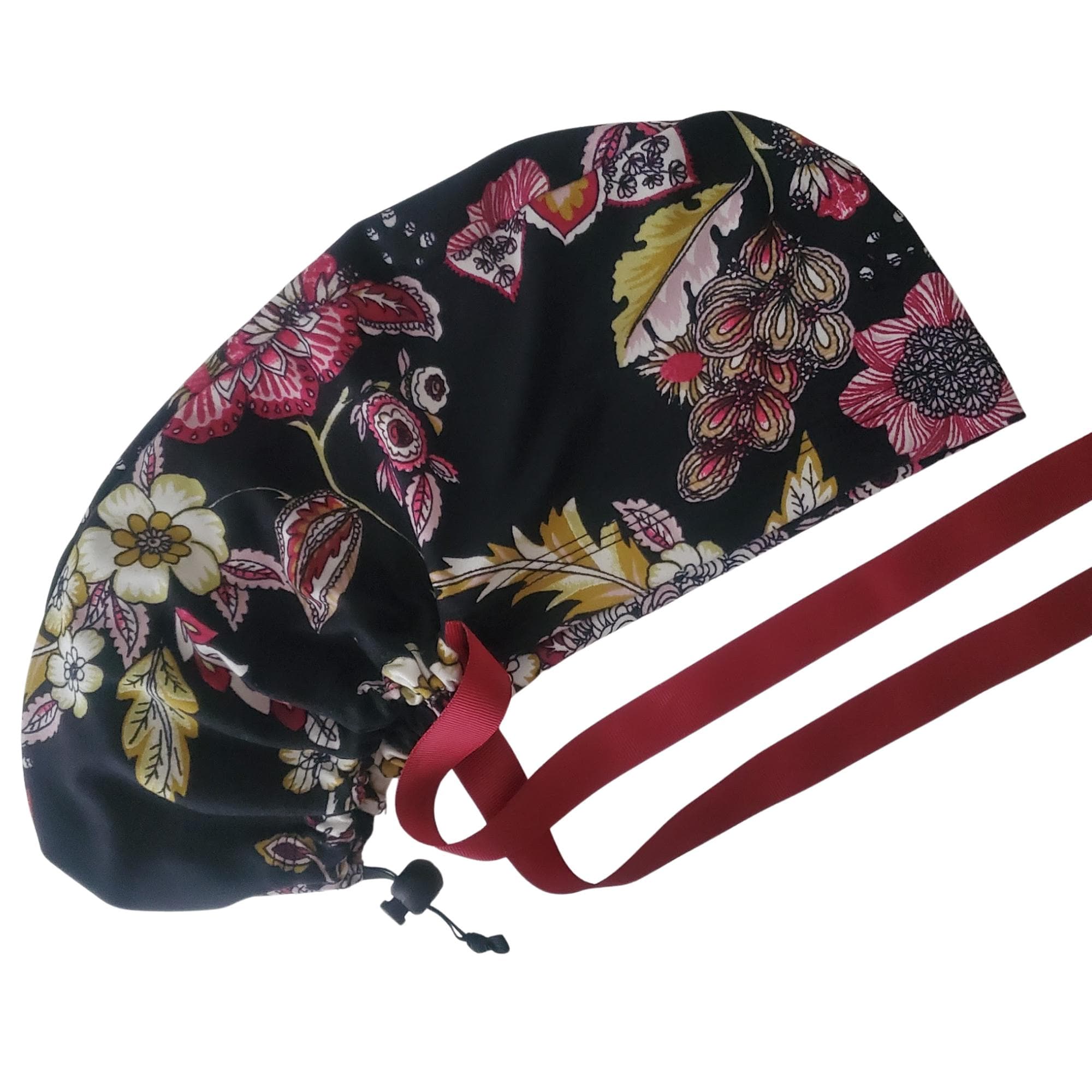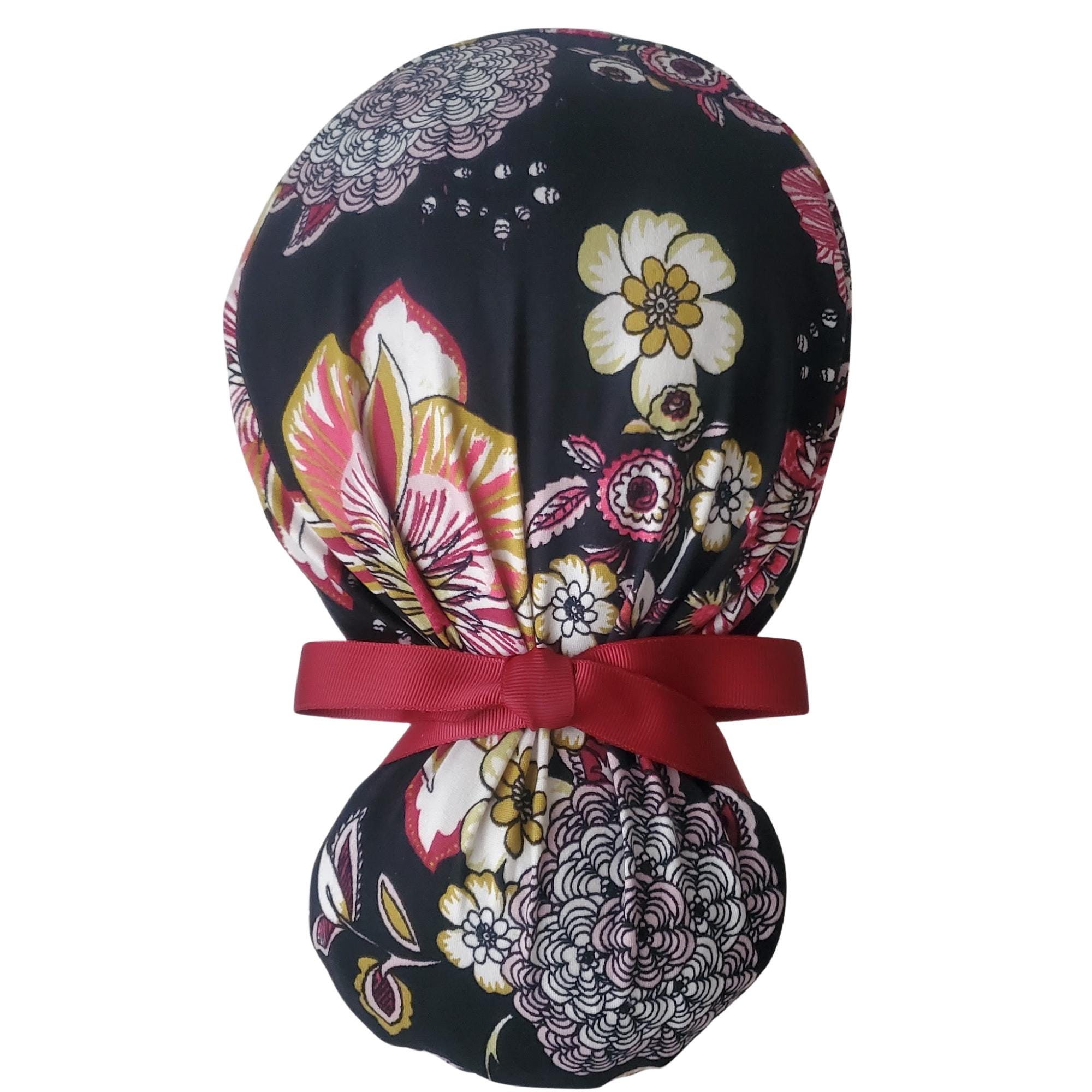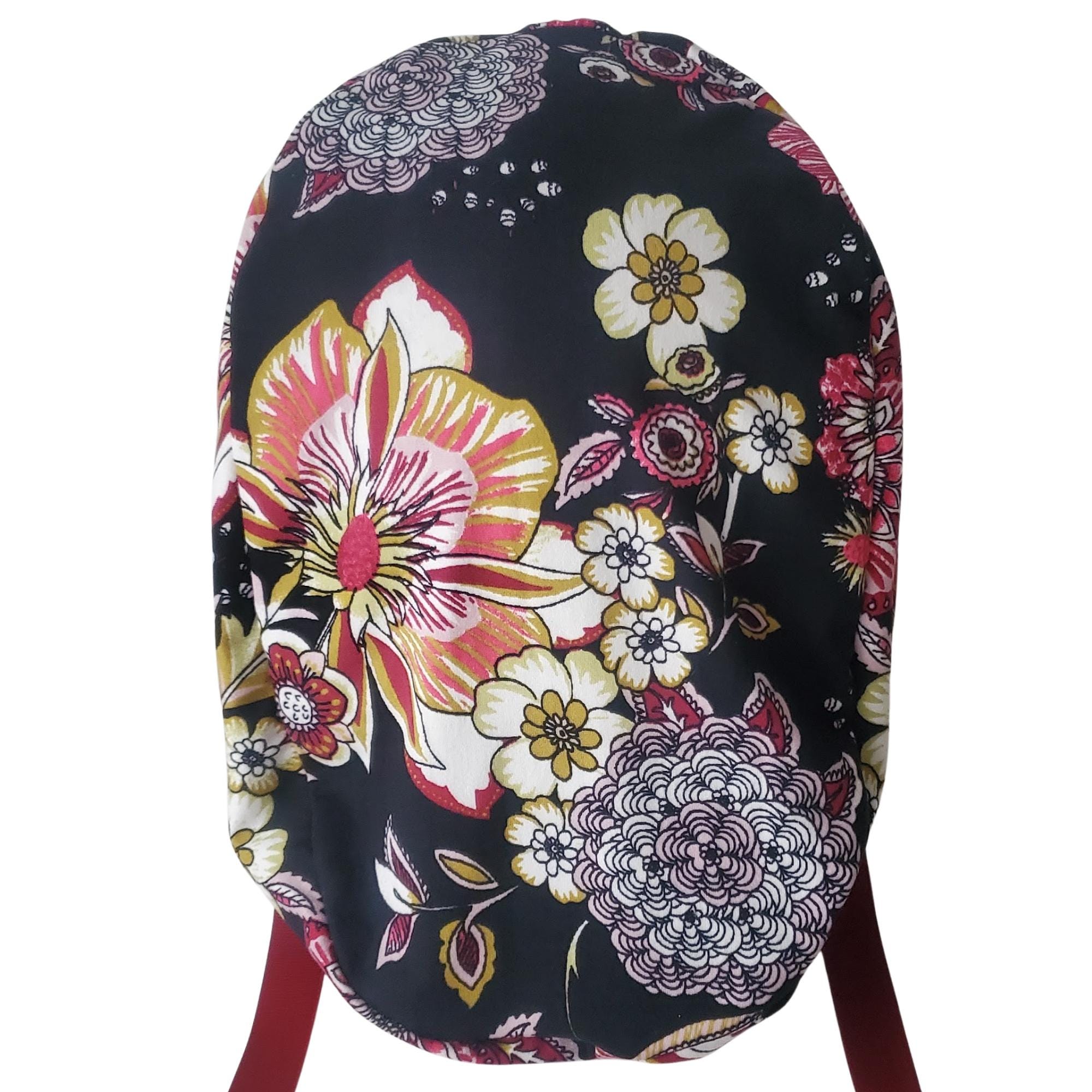 Add a refined floral touch to your uniform with this stretch ponytail scrub cap featuring a vibrant black background decorated with red, yellow, and white blossoms. Crafted from soft breathable stretch fabric, it stays comfortable through long shifts while maintaining a polished professional look. The deep ponytail pouch has room for long or thick hair, and the adjustable toggle ensures a secure custom fit. A bold vine ribbon tie finishes the cap with a clean, stylish accent. Wrinkle resistant and easy to wash, this scrub cap is perfect for nurses, doctors, vet techs, and healthcare professionals who enjoy a floral pattern that feels elegant and durable.