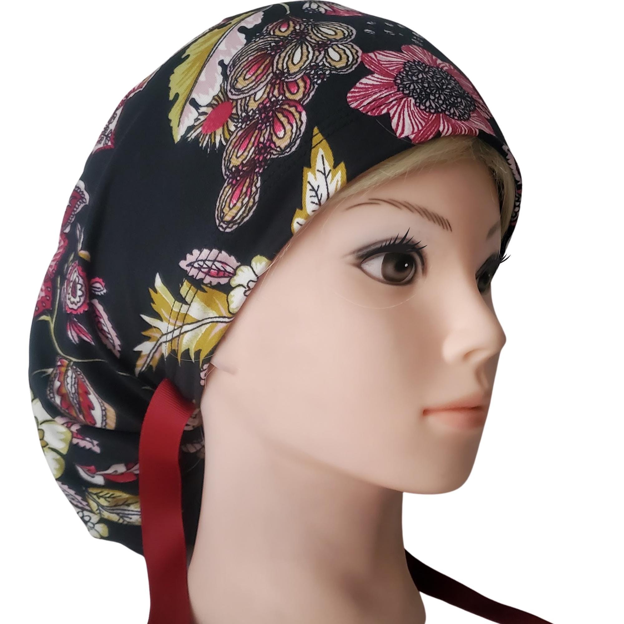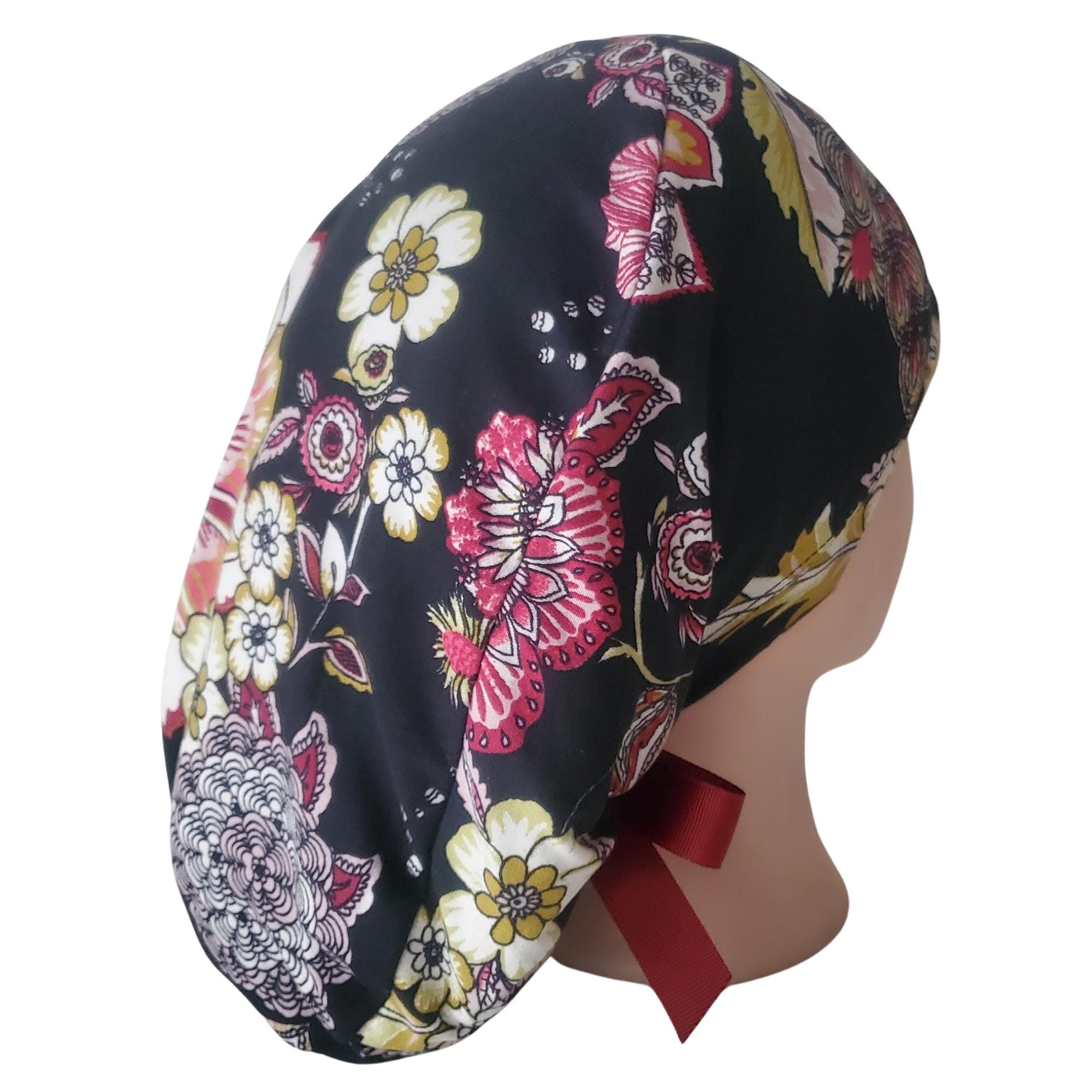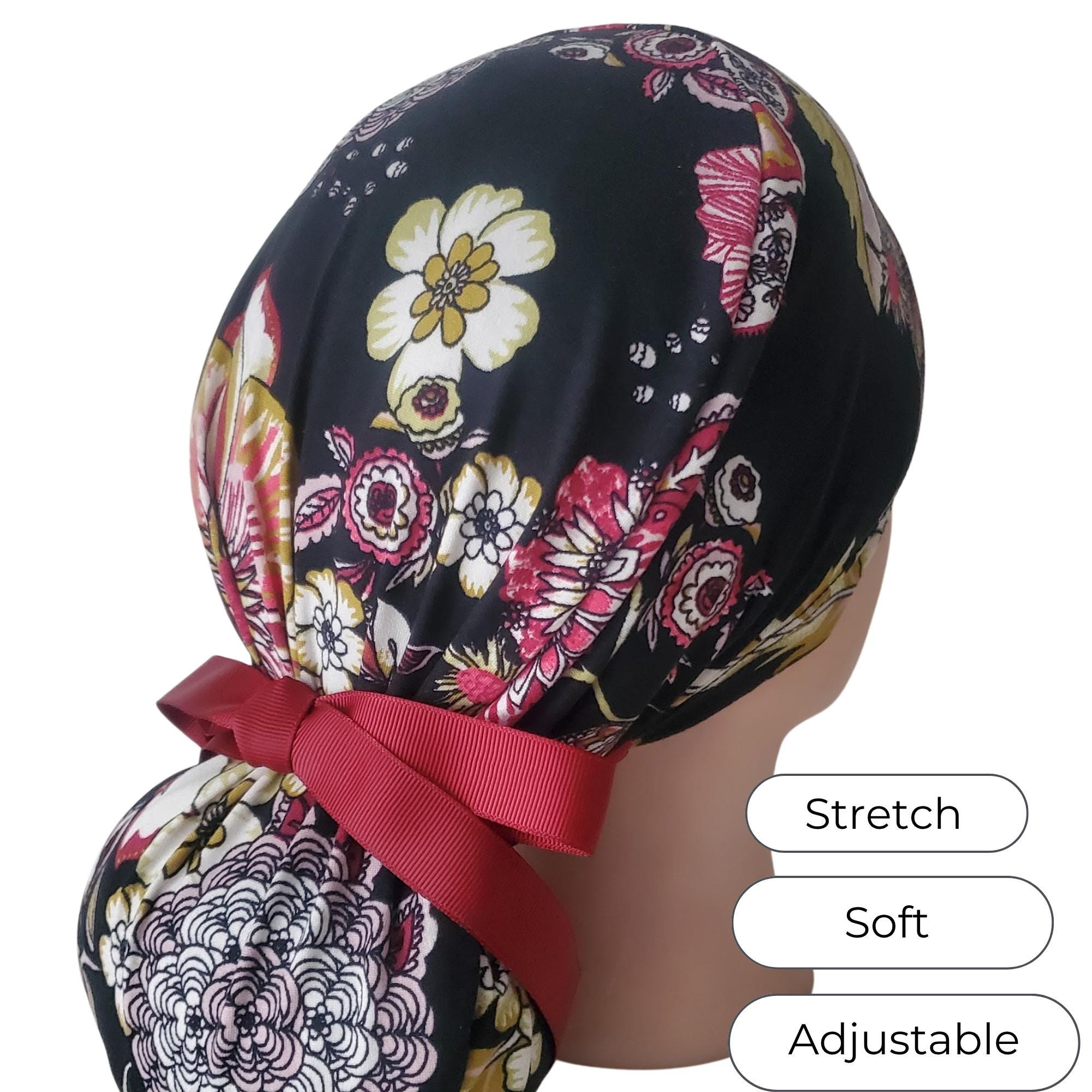 Add a refined floral touch to your uniform with this stretch ponytail scrub cap featuring a vibrant black background decorated with red, yellow, and white blossoms. Crafted from soft breathable stretch fabric, it stays comfortable through long shifts while maintaining a polished professional look. The deep ponytail pouch has room for long or thick hair, and the adjustable toggle ensures a secure custom fit. A bold vine ribbon tie finishes the cap with a clean, stylish accent. Wrinkle resistant and easy to wash, this scrub cap is perfect for nurses, doctors, vet techs, and healthcare professionals who enjoy a floral pattern that feels elegant and durable.