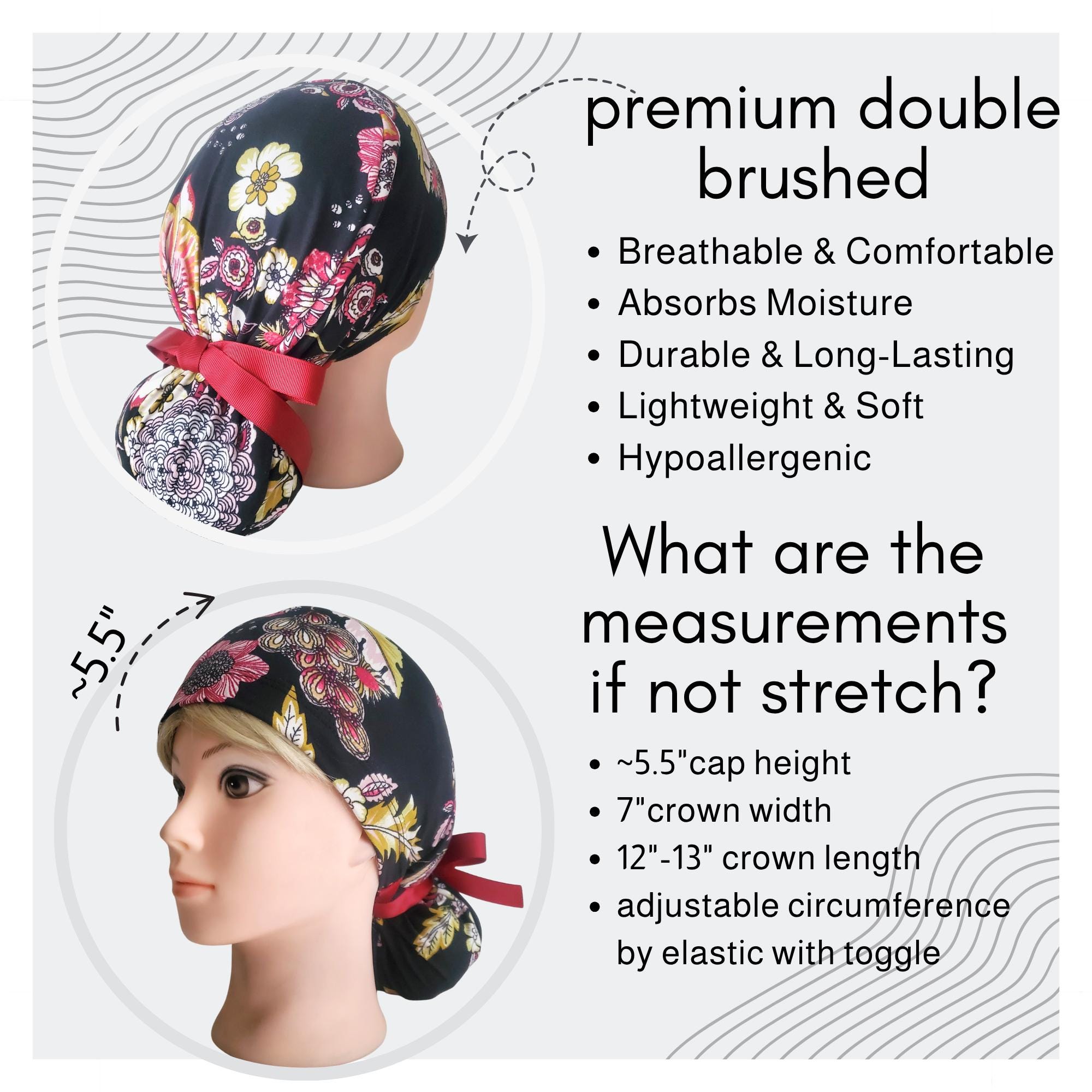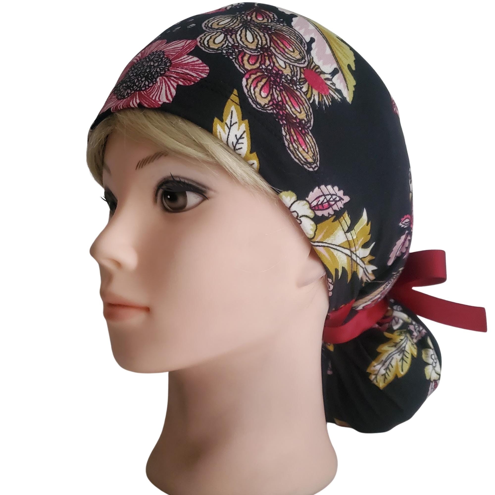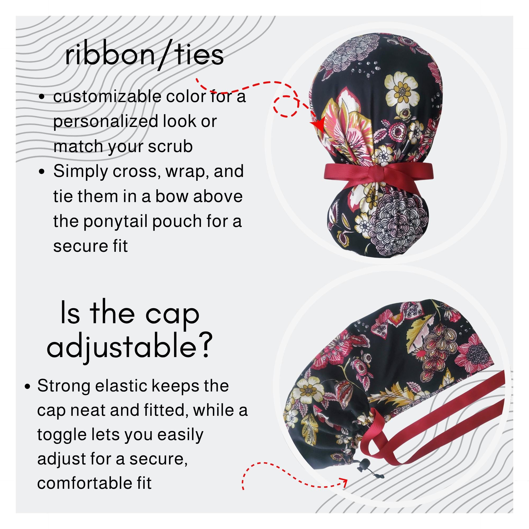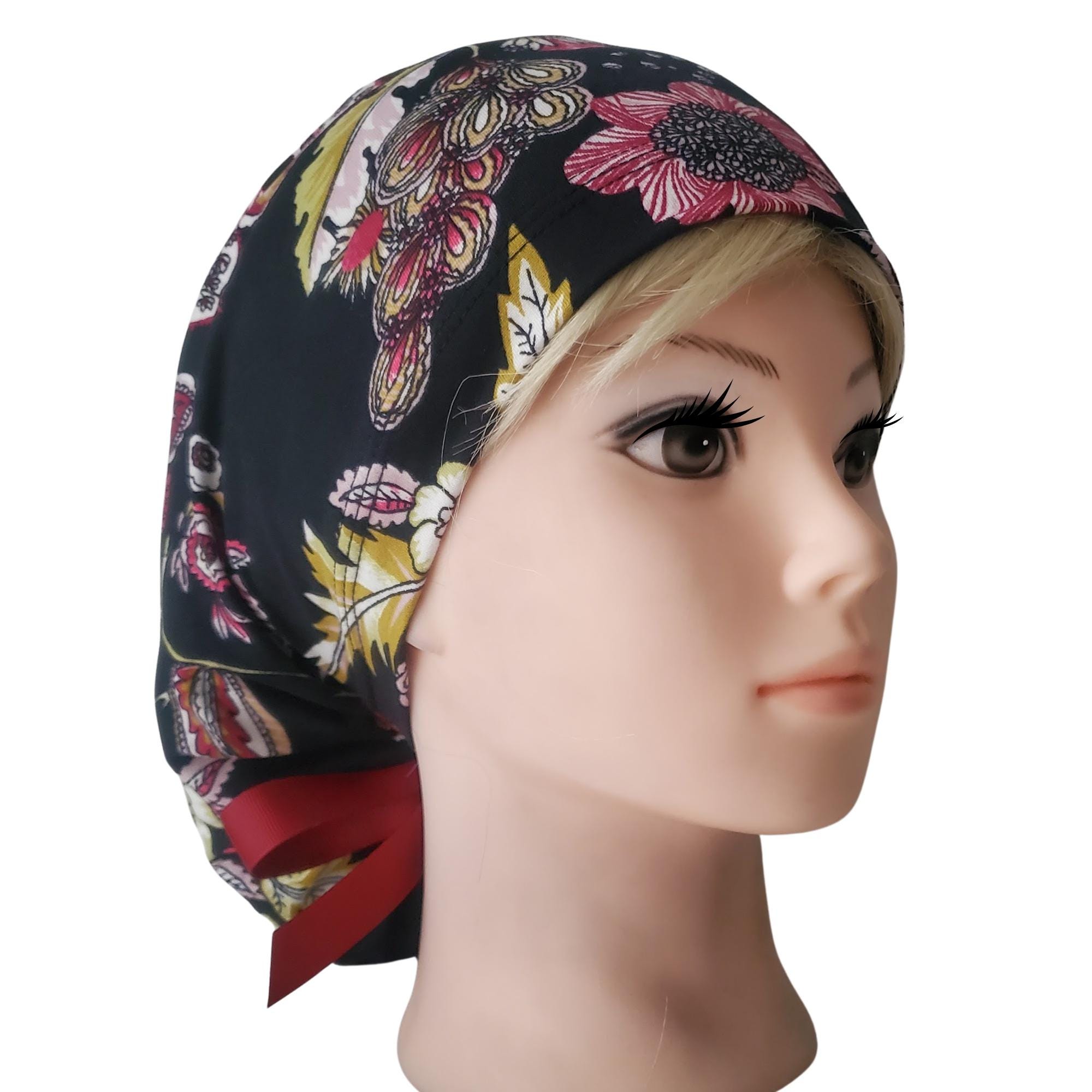 Add a refined floral touch to your uniform with this stretch ponytail scrub cap featuring a vibrant black background decorated with red, yellow, and white blossoms. Crafted from soft breathable stretch fabric, it stays comfortable through long shifts while maintaining a polished professional look. The deep ponytail pouch has room for long or thick hair, and the adjustable toggle ensures a secure custom fit. A bold vine ribbon tie finishes the cap with a clean, stylish accent. Wrinkle resistant and easy to wash, this scrub cap is perfect for nurses, doctors, vet techs, and healthcare professionals who enjoy a floral pattern that feels elegant and durable.