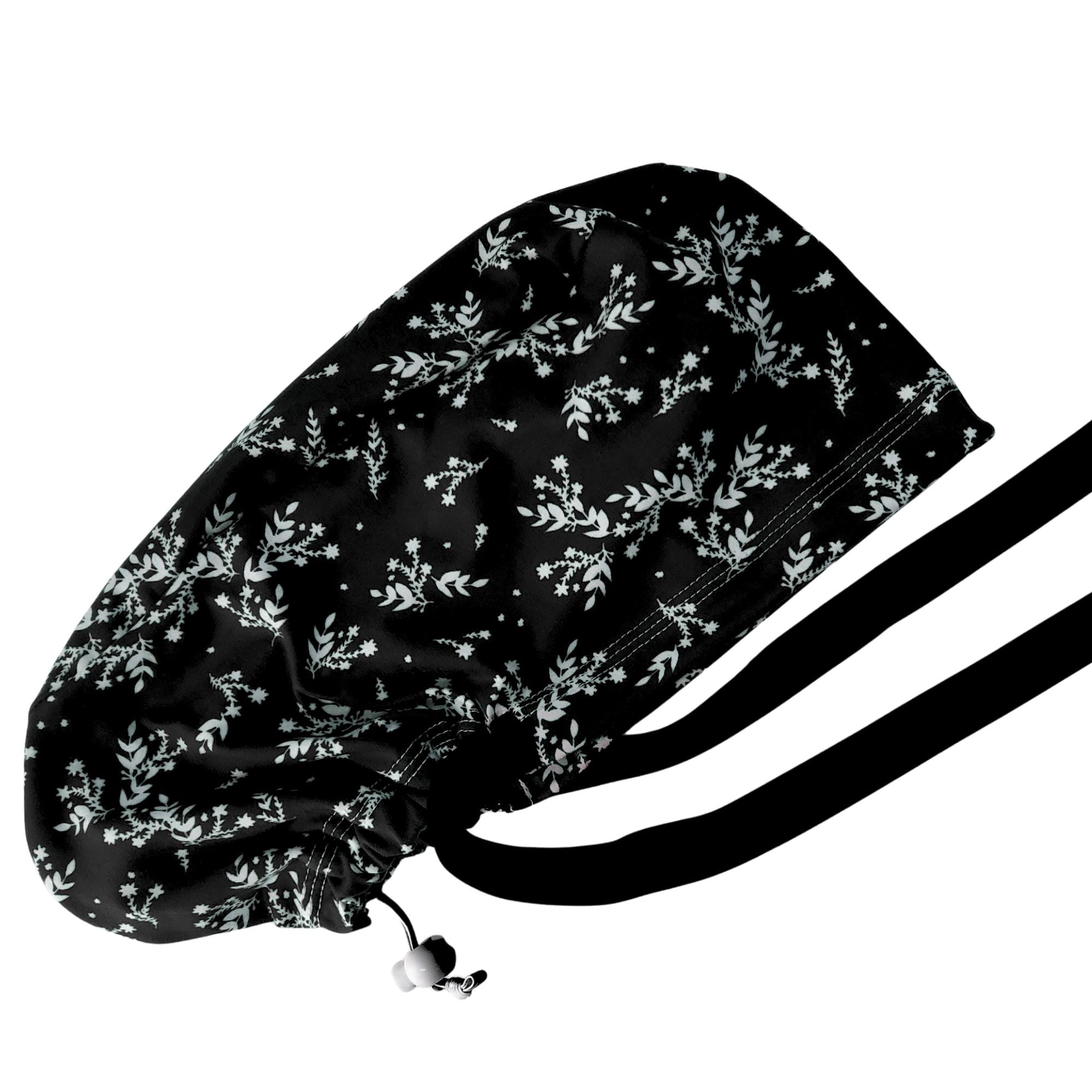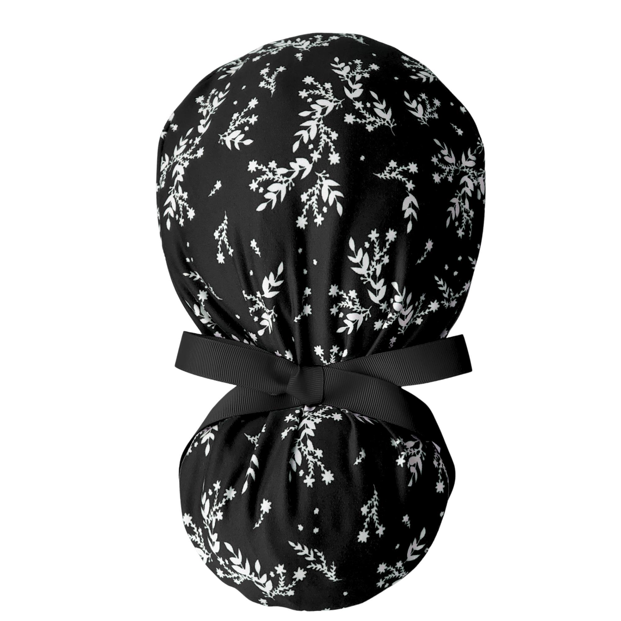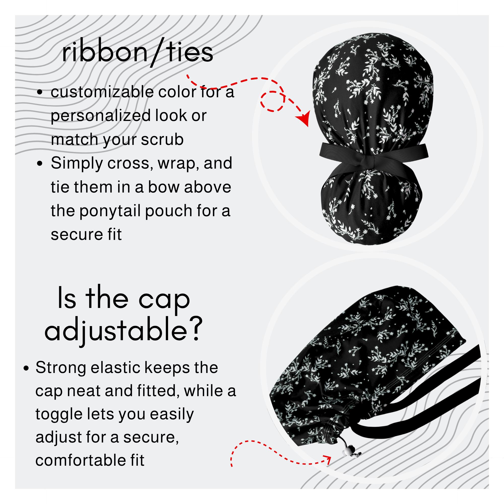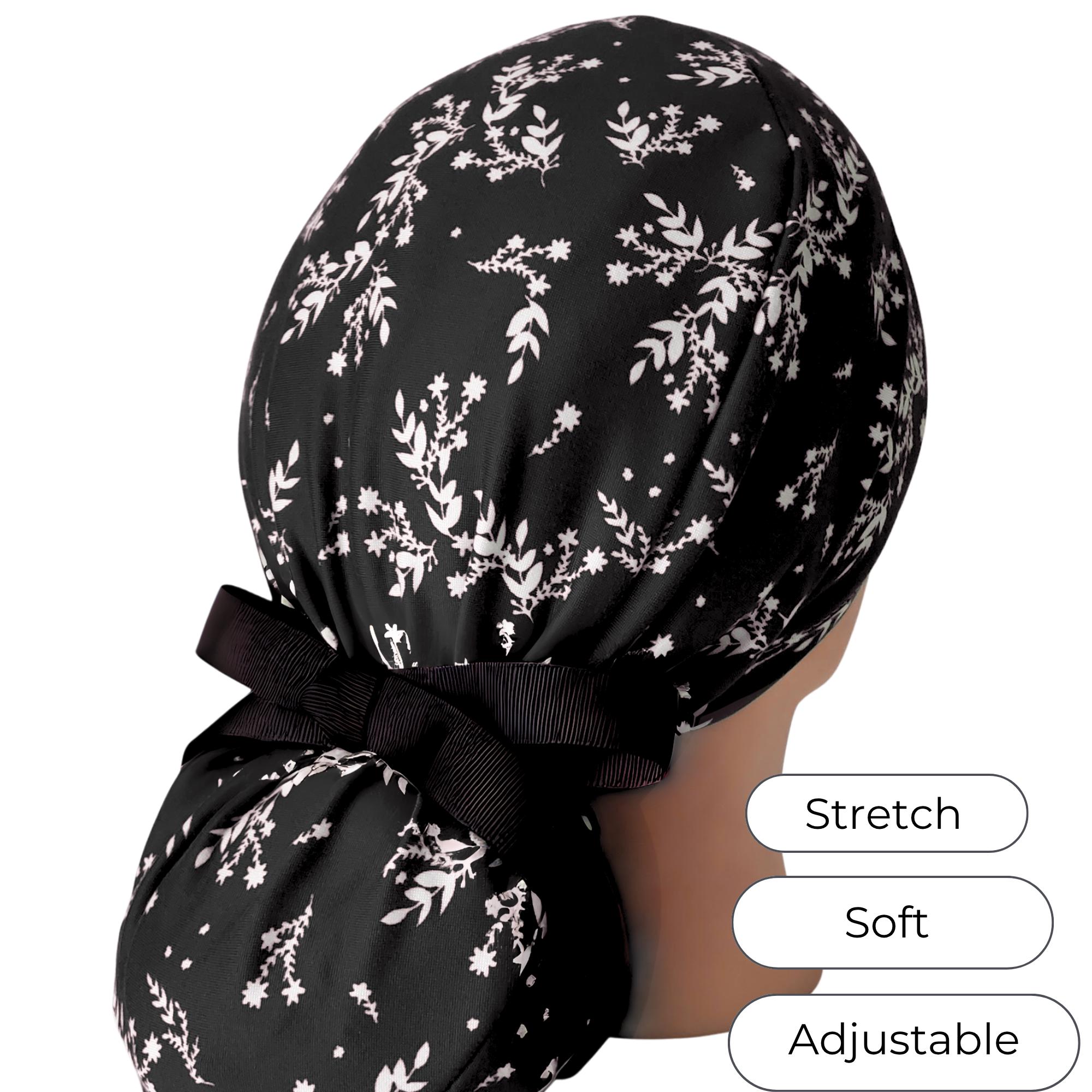Keep your look polished and minimal with this stretch ponytail scrub cap featuring a black background with soft dainty white floral sprigs. Made from smooth breathable stretch fabric, this cap stays comfortable through long shifts while keeping your hair neatly secured. The deep ponytail pouch fits long or thick hair easily, and the adjustable toggle allows for a secure personalized fit. A matching black ribbon tie completes the design with a clean professional finish. Wrinkle resistant and easy to care for, this cap is ideal for nurses, doctors, dental staff, and vet techs who prefer a simple elegant pattern that works with any uniform color.