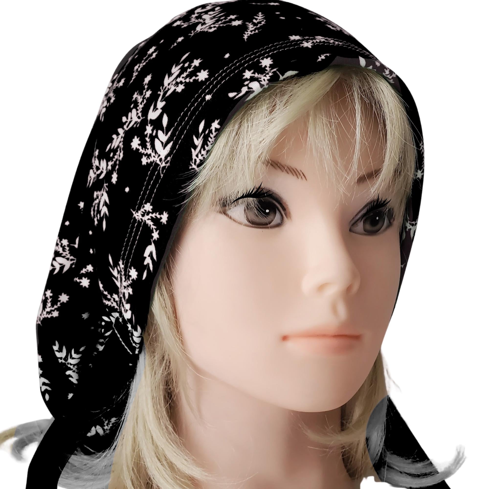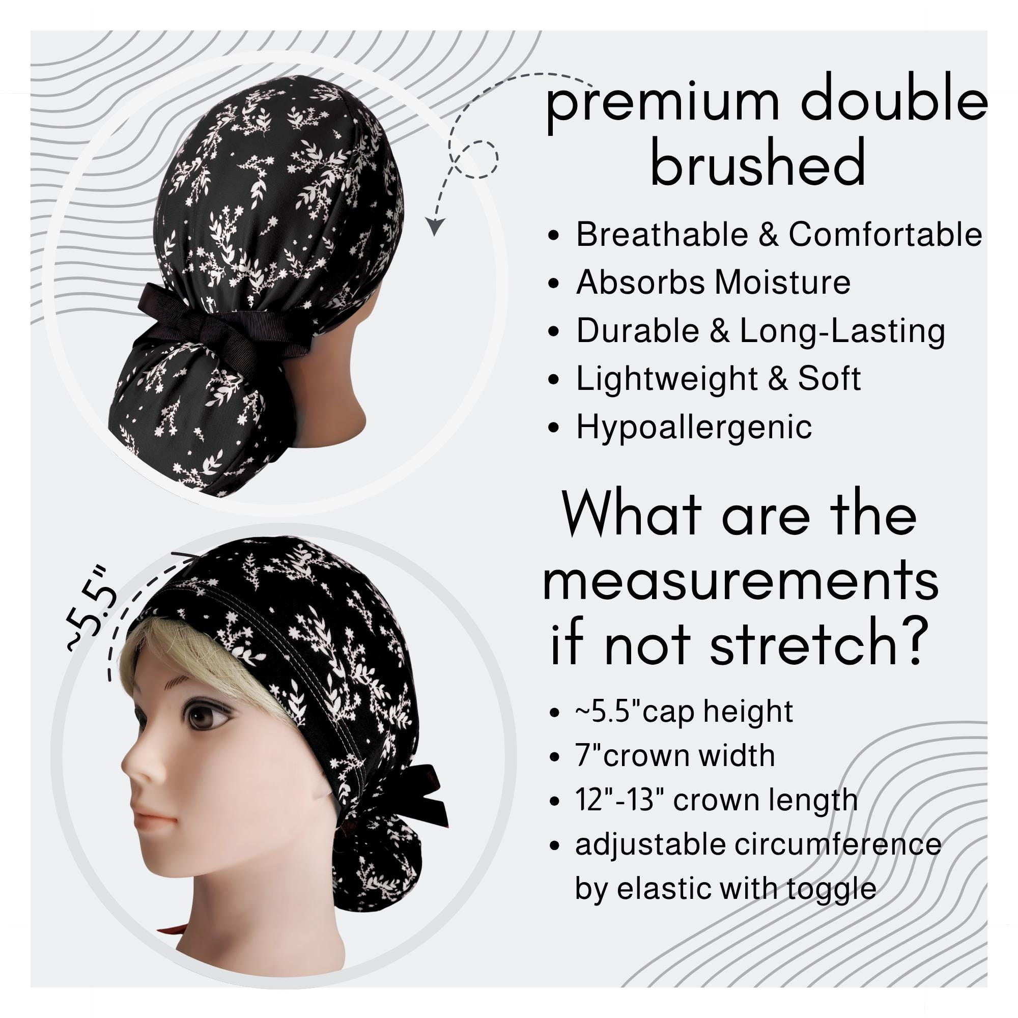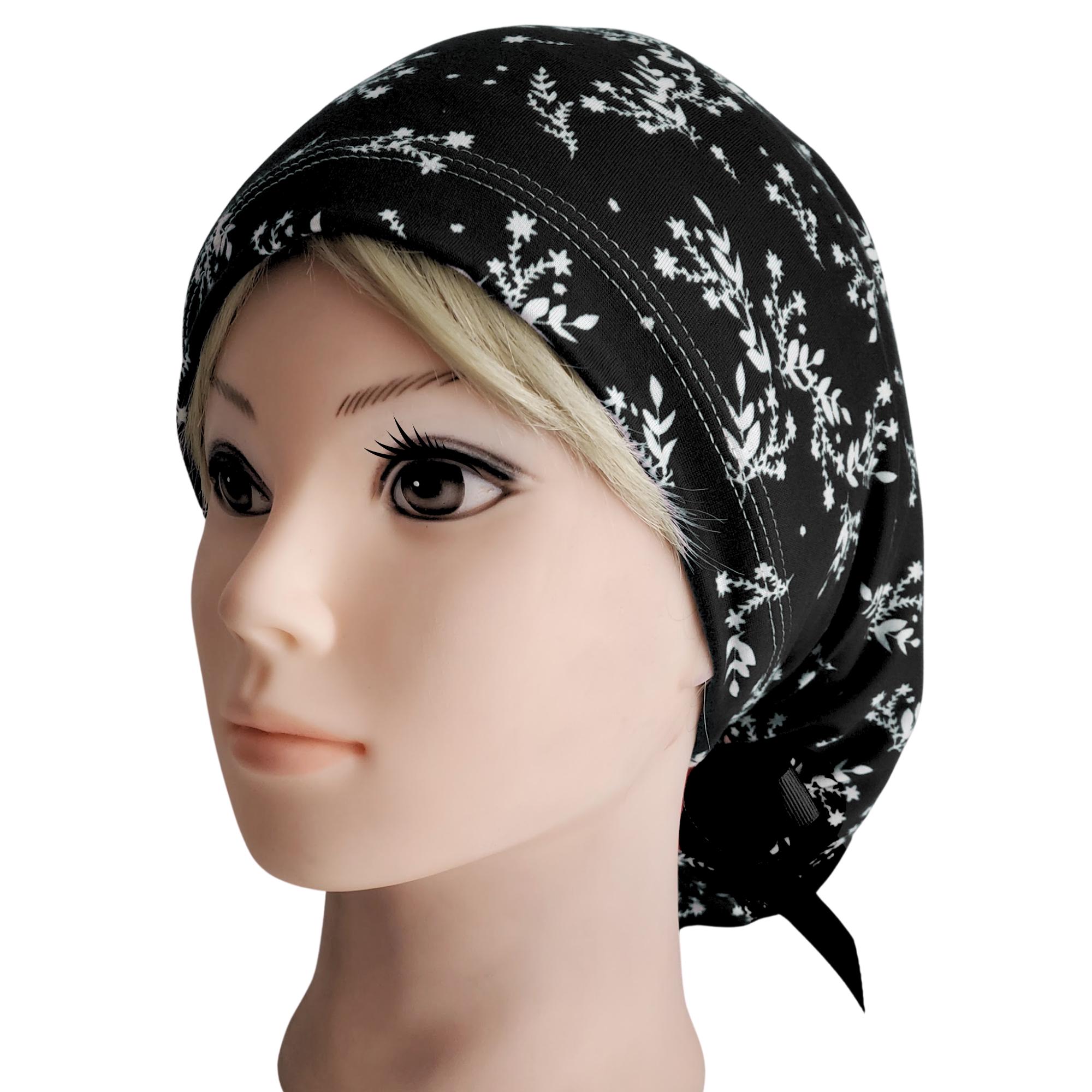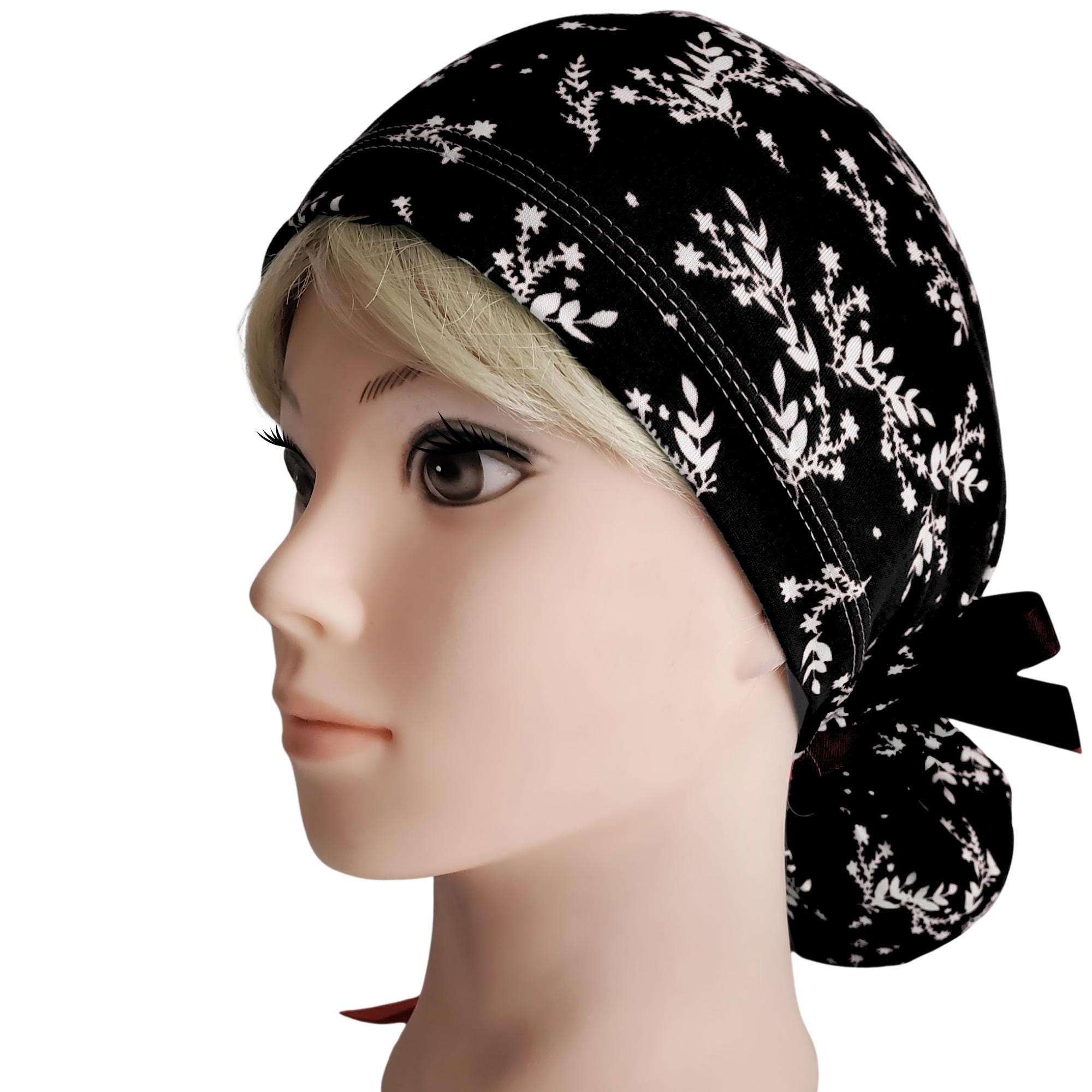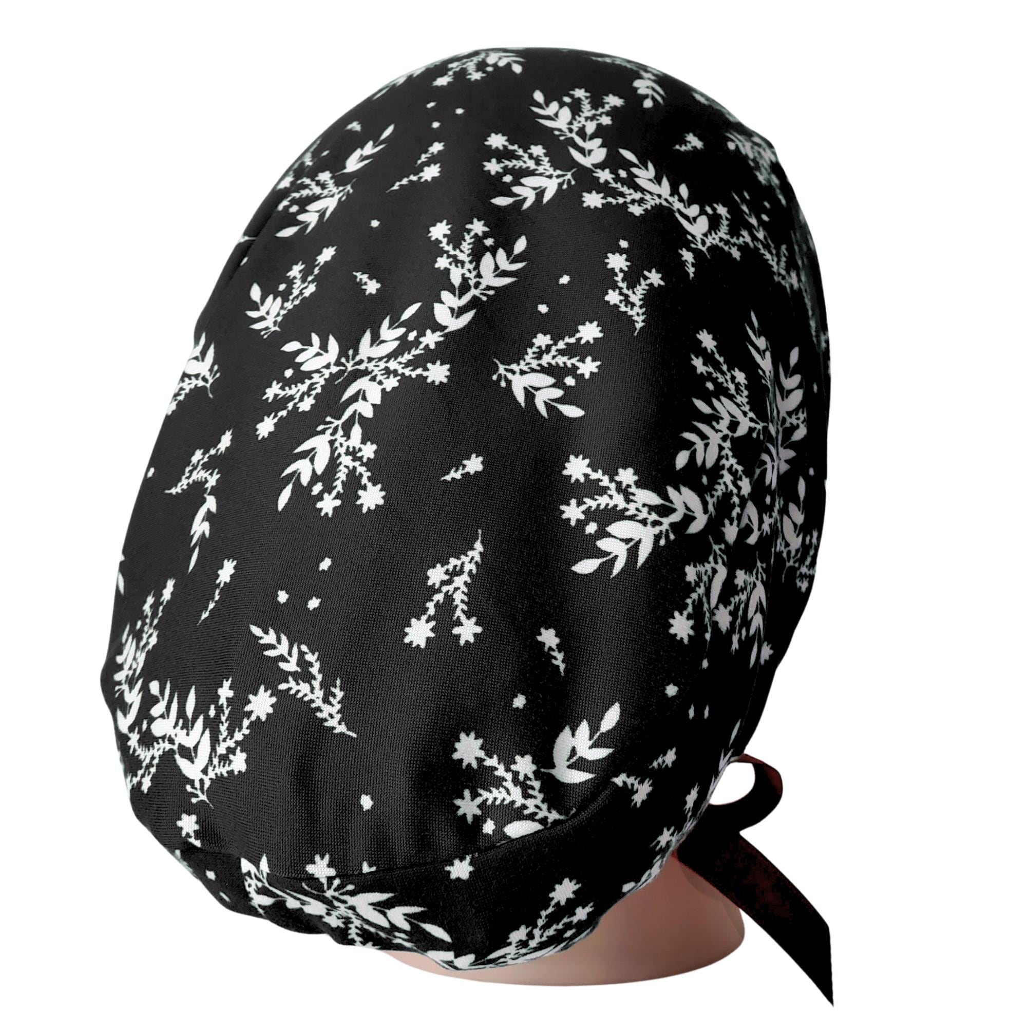 Keep your look polished and minimal with this stretch ponytail scrub cap featuring a black background with soft dainty white floral sprigs. Made from smooth breathable stretch fabric, this cap stays comfortable through long shifts while keeping your hair neatly secured. The deep ponytail pouch fits long or thick hair easily, and the adjustable toggle allows for a secure personalized fit. A matching black ribbon tie completes the design with a clean professional finish. Wrinkle resistant and easy to care for, this cap is ideal for nurses, doctors, dental staff, and vet techs who prefer a simple elegant pattern that works with any uniform color.
