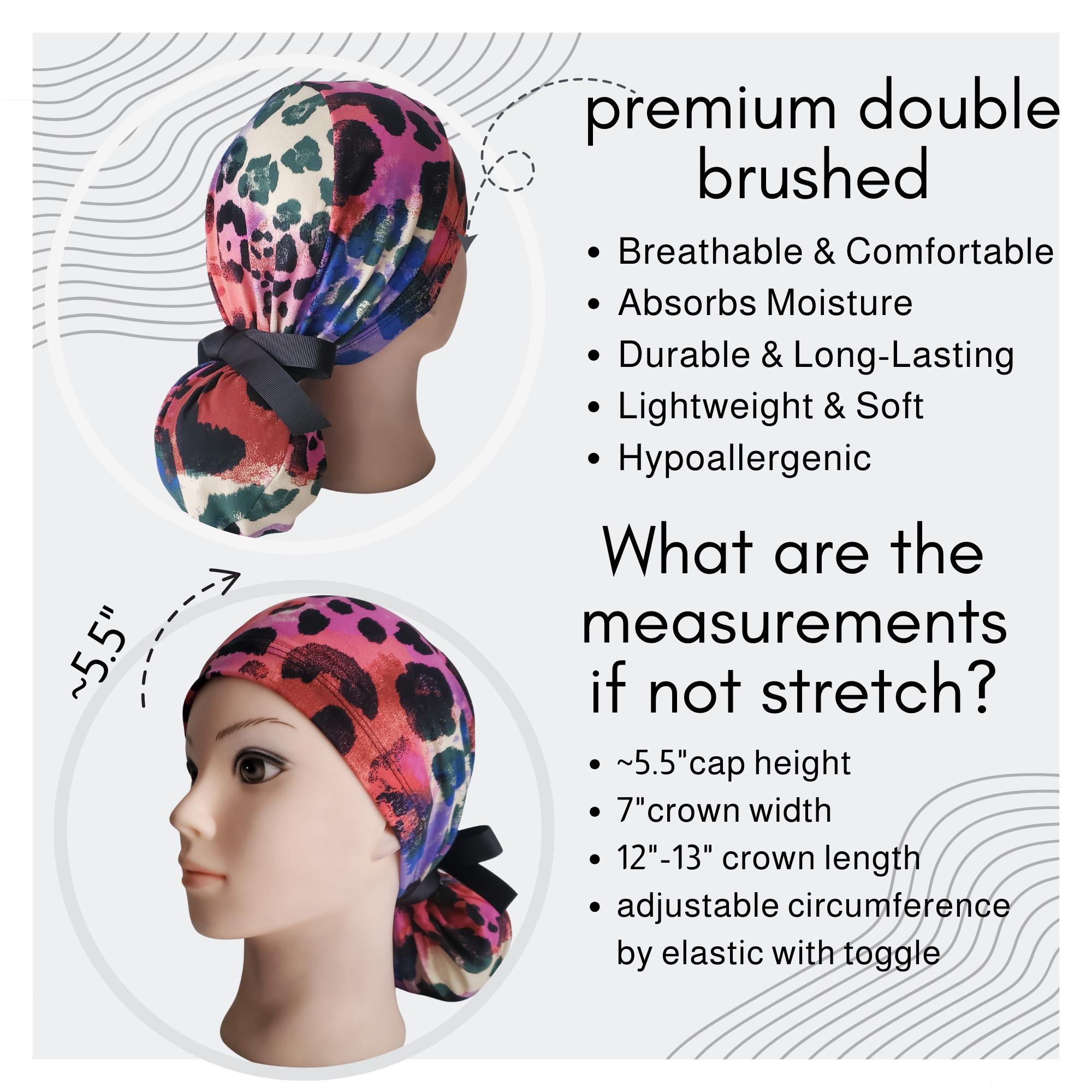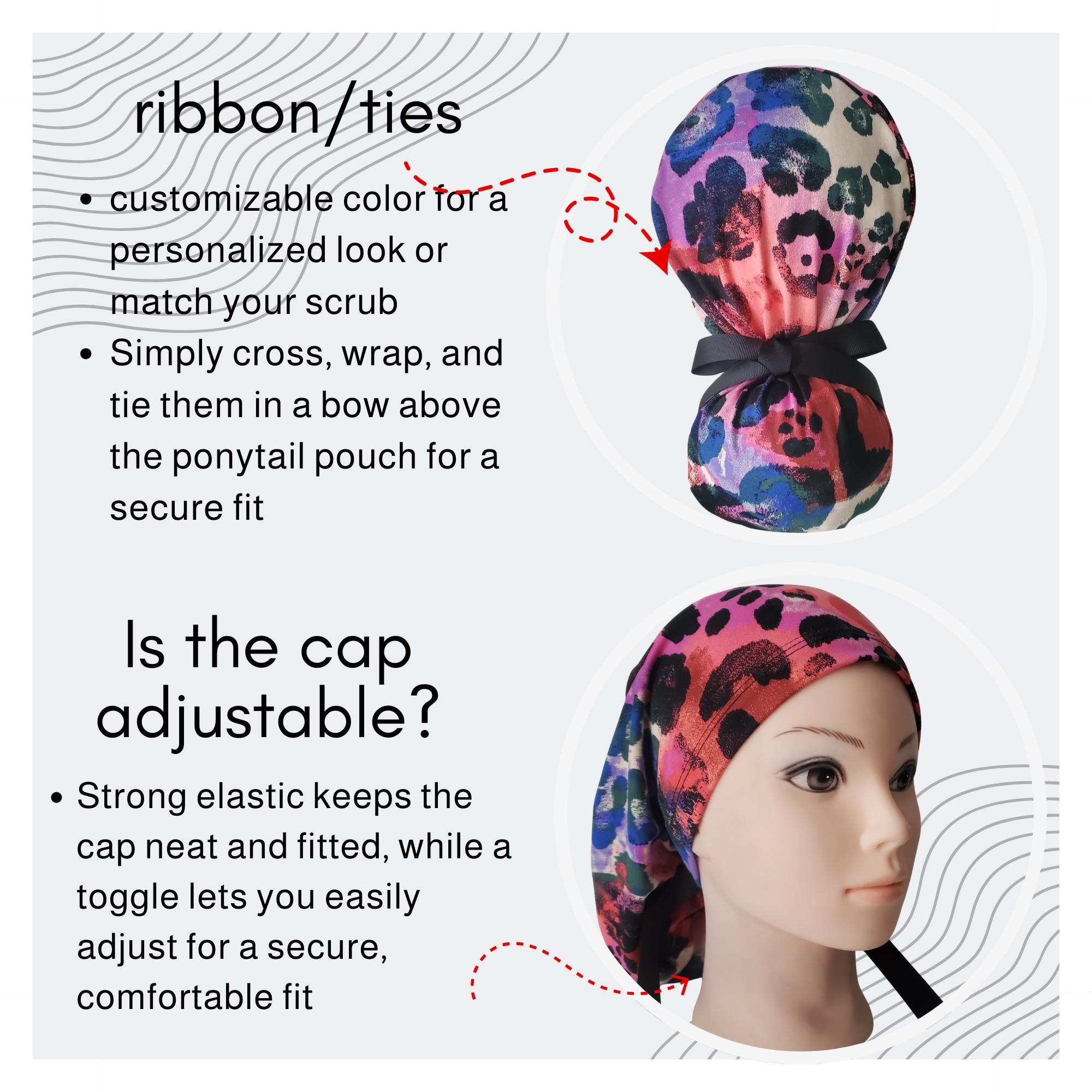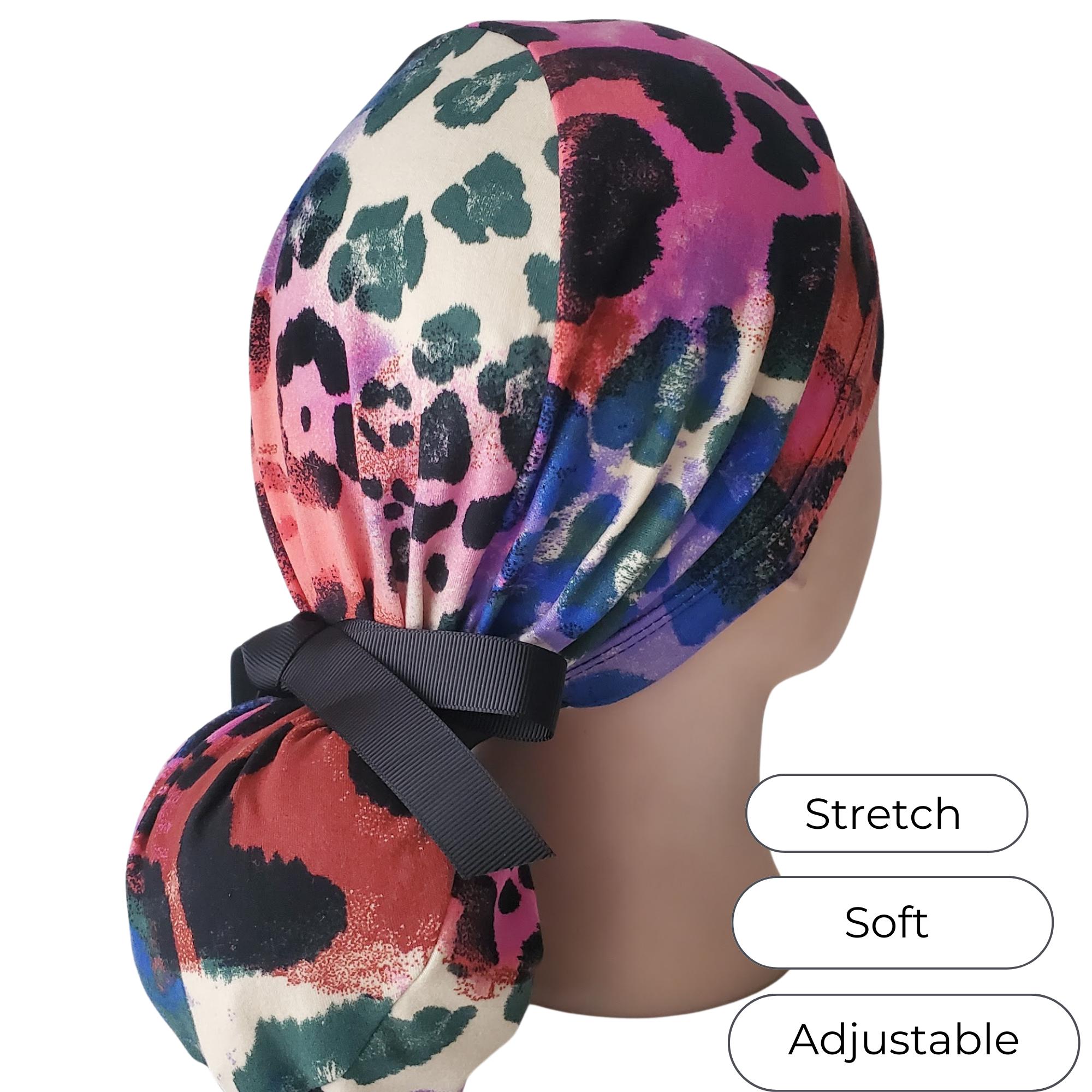 Bring bold personality to your uniform with this stretch ponytail scrub cap featuring a vibrant multicolor abstract leopard print. The soft performance fabric offers flexibility and comfort during long shifts, while the spacious ponytail pouch provides room for thick or long hair without bulk. An adjustable back tie ensures a secure custom fit, and the sleek black ribbon adds a polished finish. Ideal for nurses, doctors, dental staff, vet techs, and anyone who wants a fun yet professional look. Lightweight, quick drying, and easy to care for, this scrub cap keeps you comfortable and confident throughout your day.