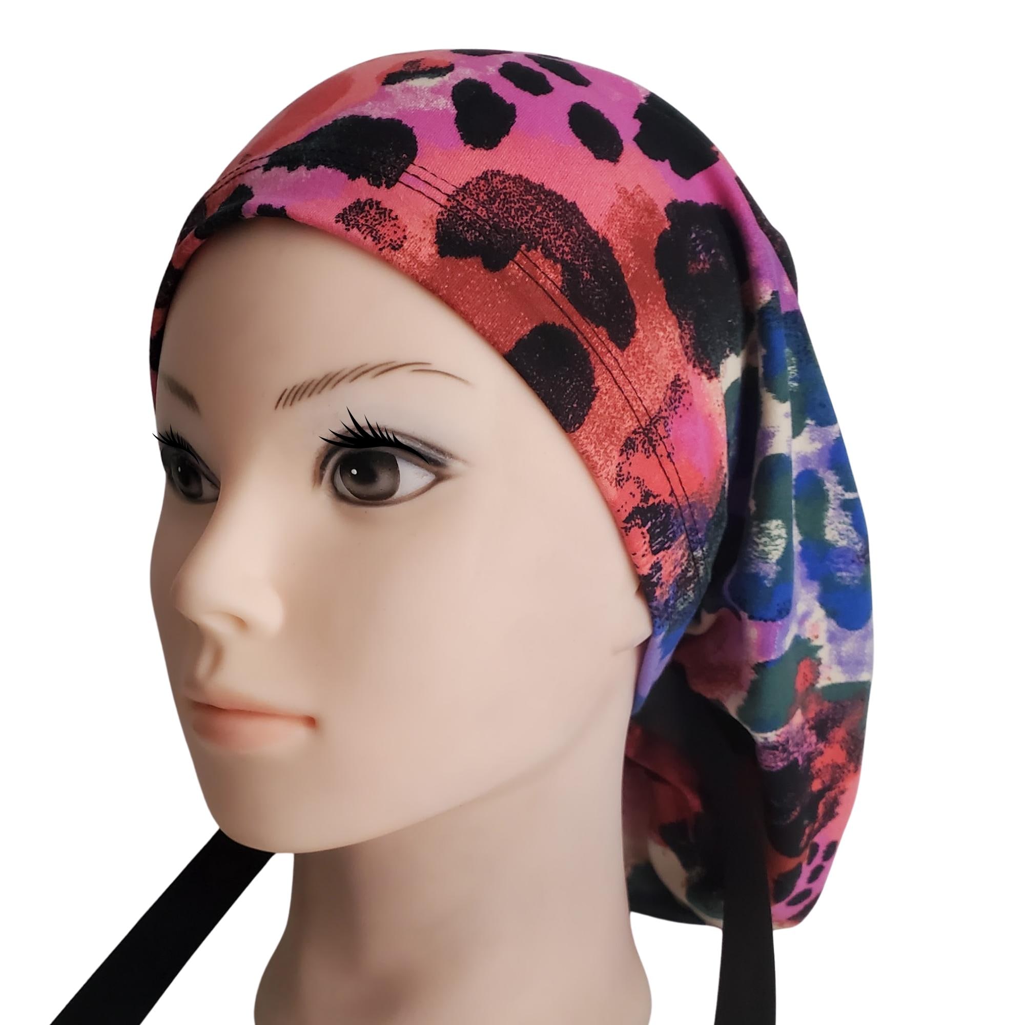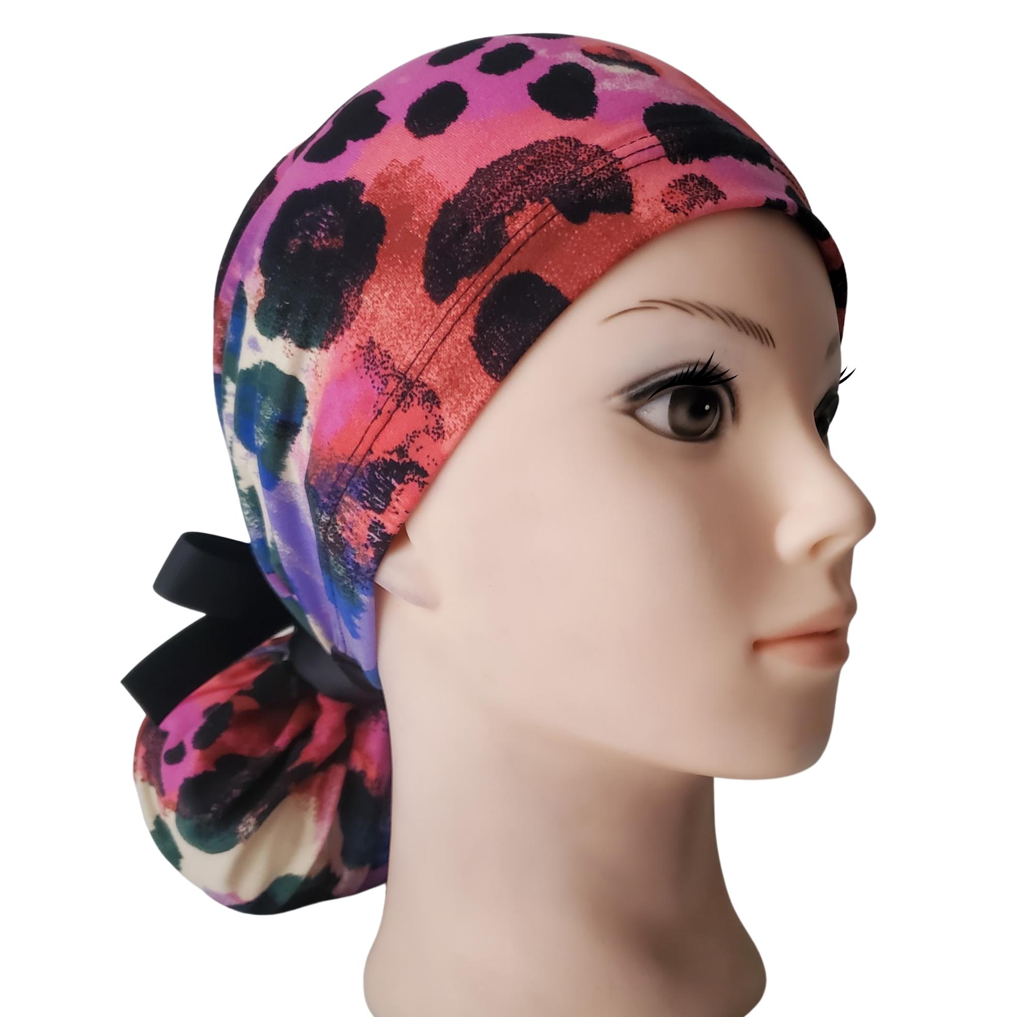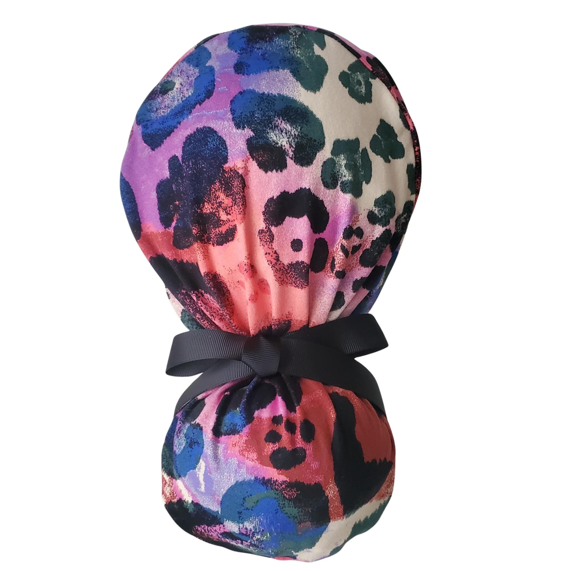 Bring bold personality to your uniform with this stretch ponytail scrub cap featuring a vibrant multicolor abstract leopard print. The soft performance fabric offers flexibility and comfort during long shifts, while the spacious ponytail pouch provides room for thick or long hair without bulk. An adjustable back tie ensures a secure custom fit, and the sleek black ribbon adds a polished finish. Ideal for nurses, doctors, dental staff, vet techs, and anyone who wants a fun yet professional look. Lightweight, quick drying, and easy to care for, this scrub cap keeps you comfortable and confident throughout your day.