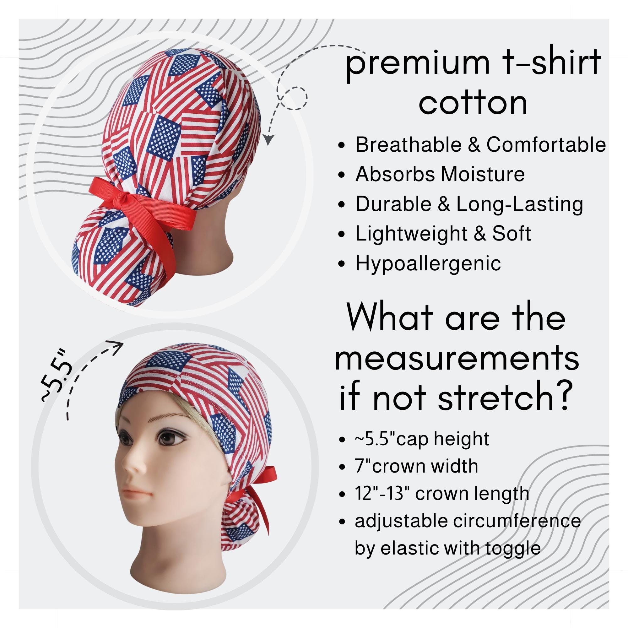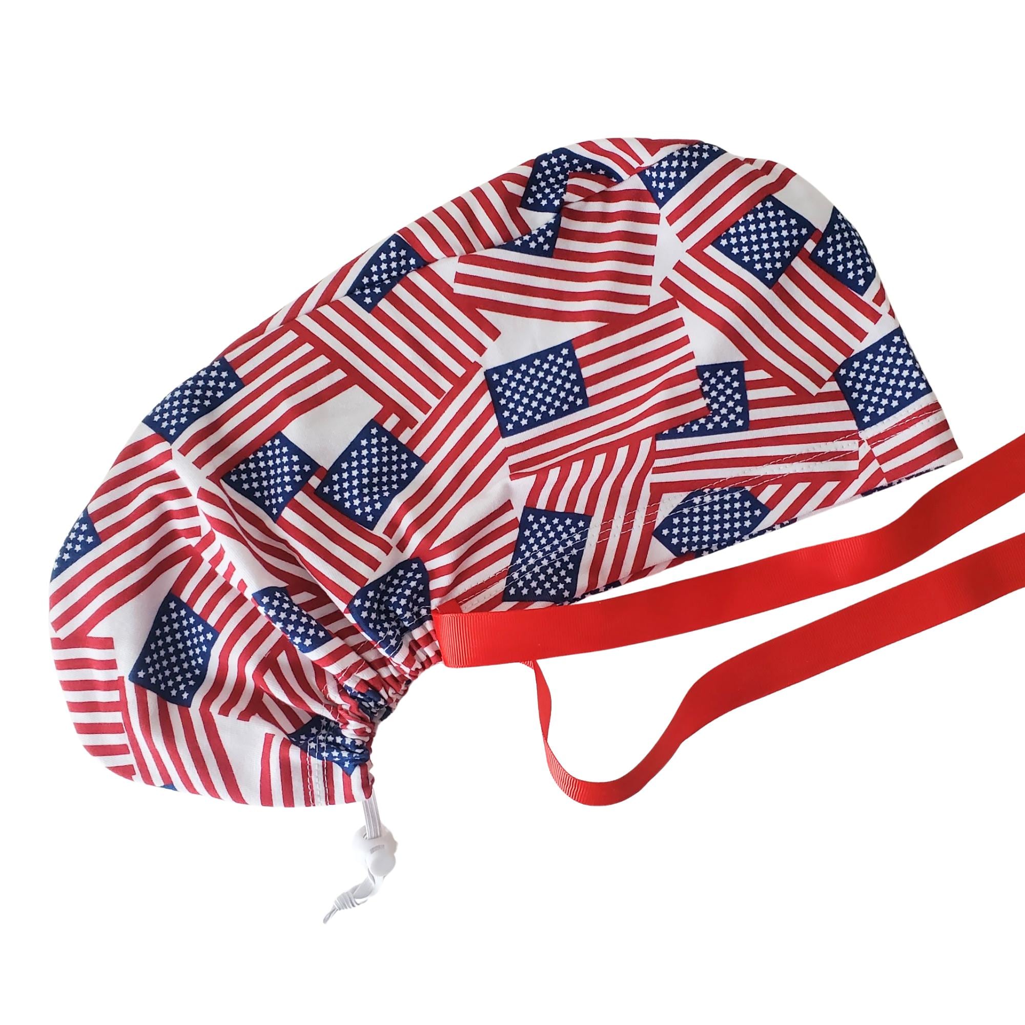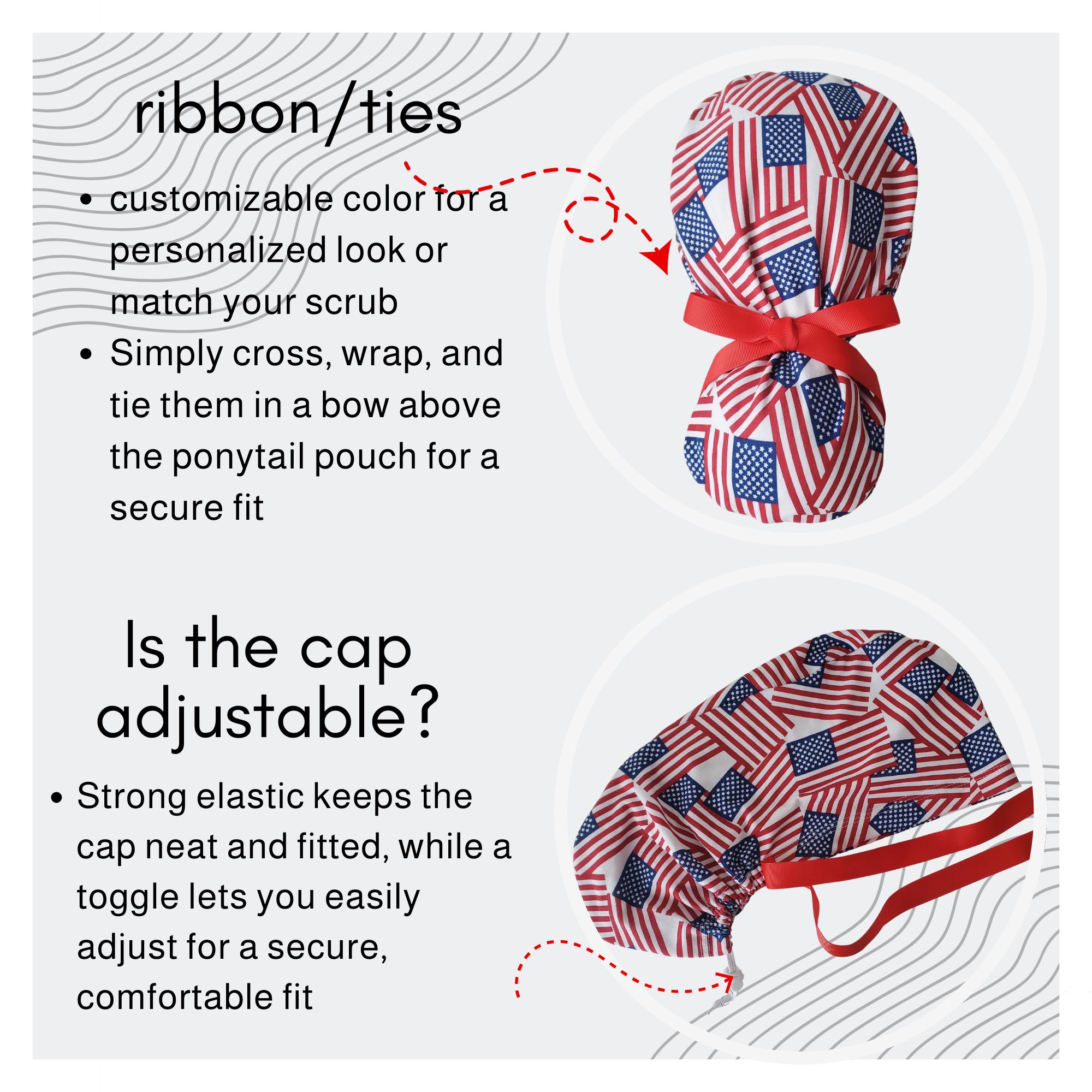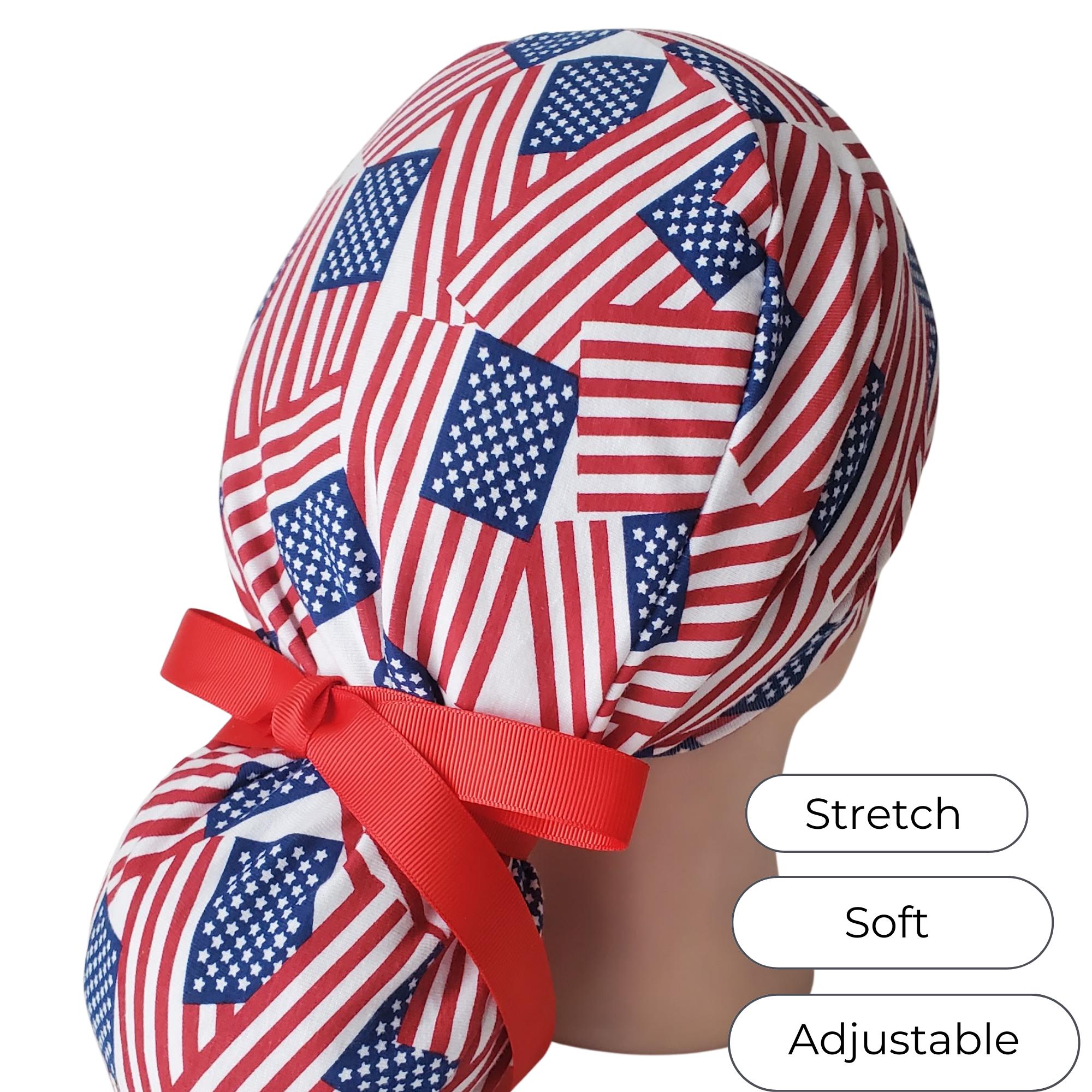 Show your patriotic spirit at work with this stretch ponytail scrub cap featuring a bold red white and blue American flag print. Made from soft breathable stretch fabric, this cap keeps you comfortable through long shifts while maintaining a secure fit. The roomy ponytail pouch provides generous space for long or thick hair, and the adjustable back tie ensures a custom fit that stays in place. A bright red ribbon adds a clean polished finish.