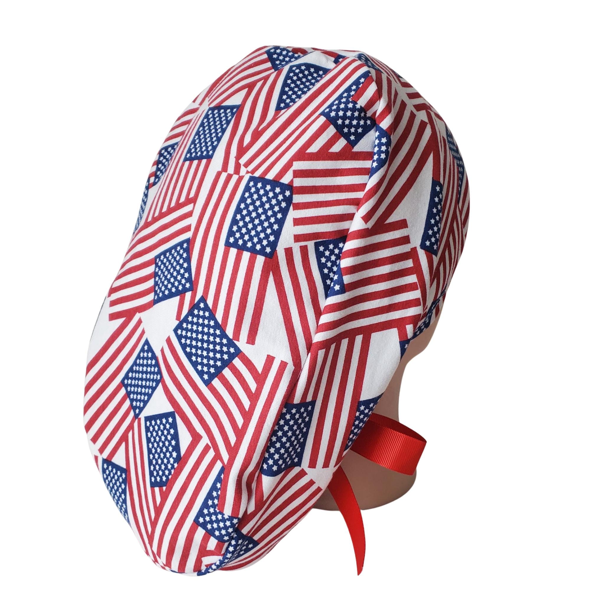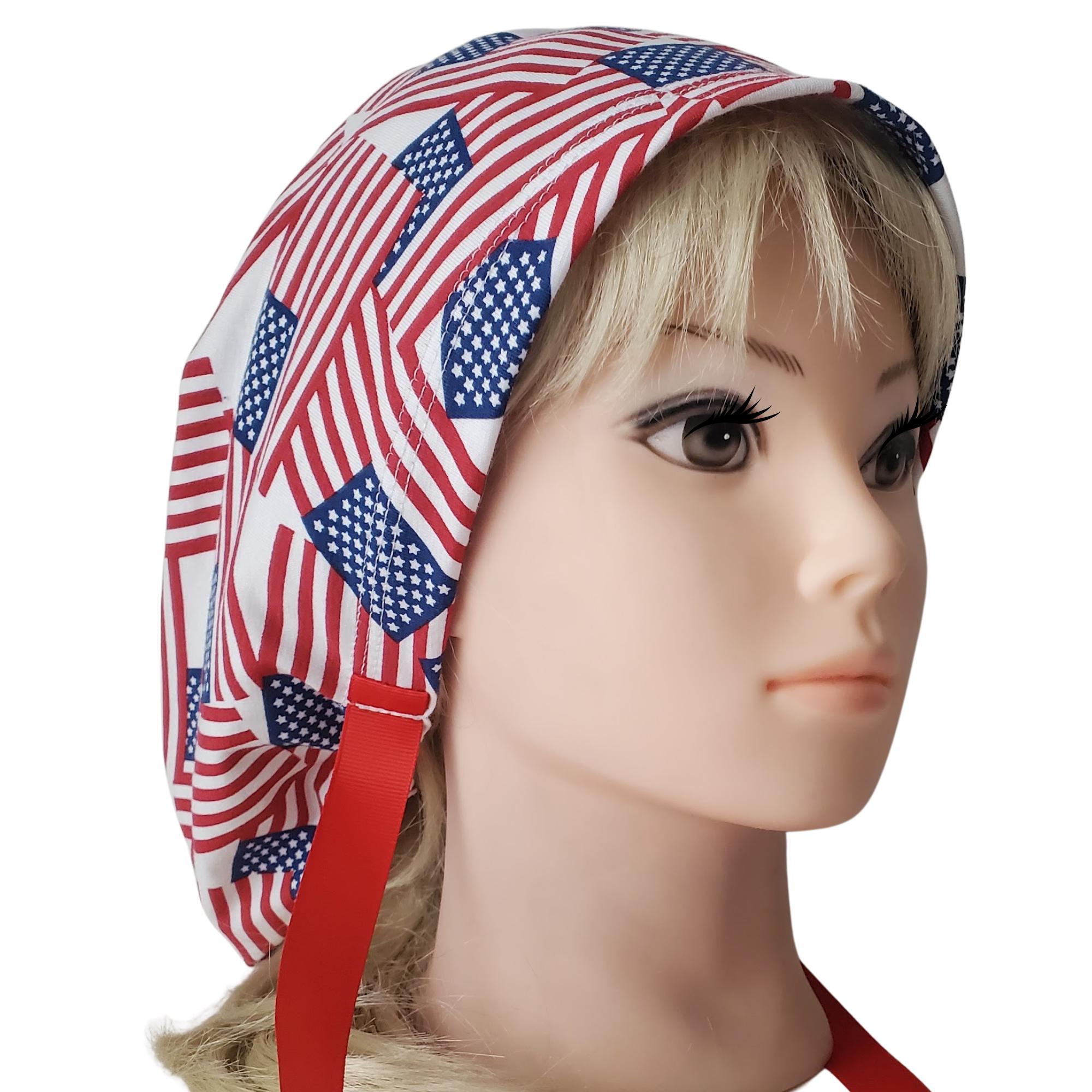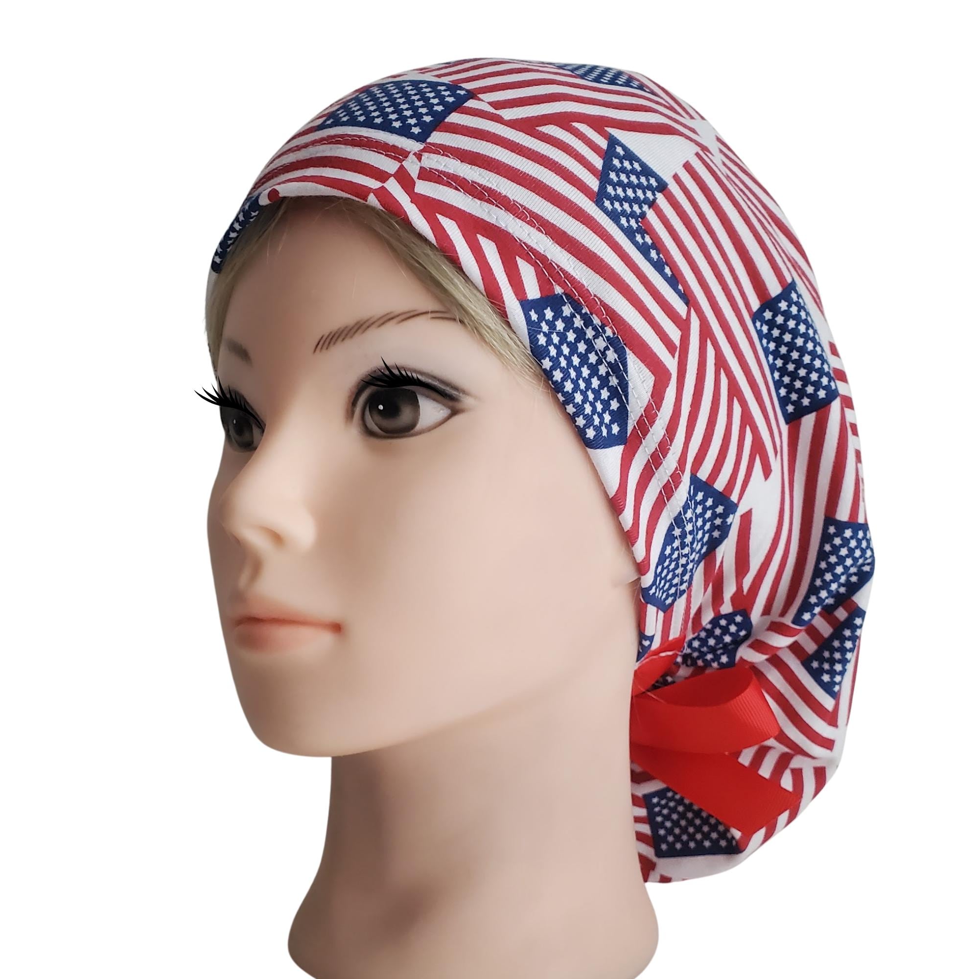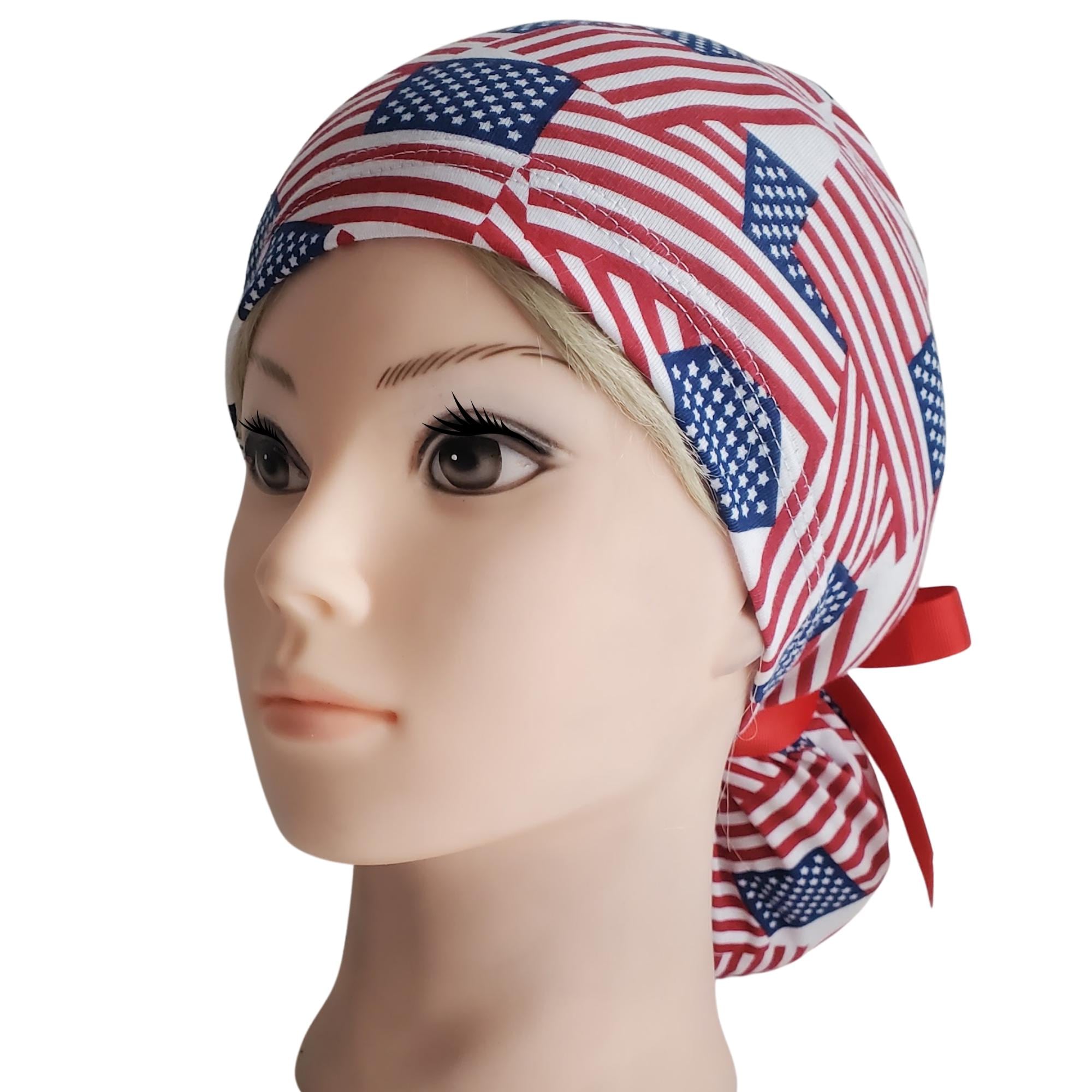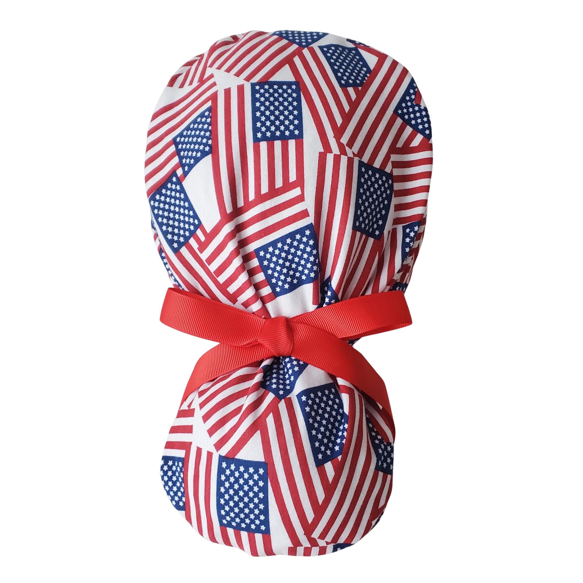 Show your patriotic spirit at work with this stretch ponytail scrub cap featuring a bold red white and blue American flag print. Made from soft breathable stretch fabric, this cap keeps you comfortable through long shifts while maintaining a secure fit. The roomy ponytail pouch provides generous space for long or thick hair, and the adjustable back tie ensures a custom fit that stays in place. A bright red ribbon adds a clean polished finish.