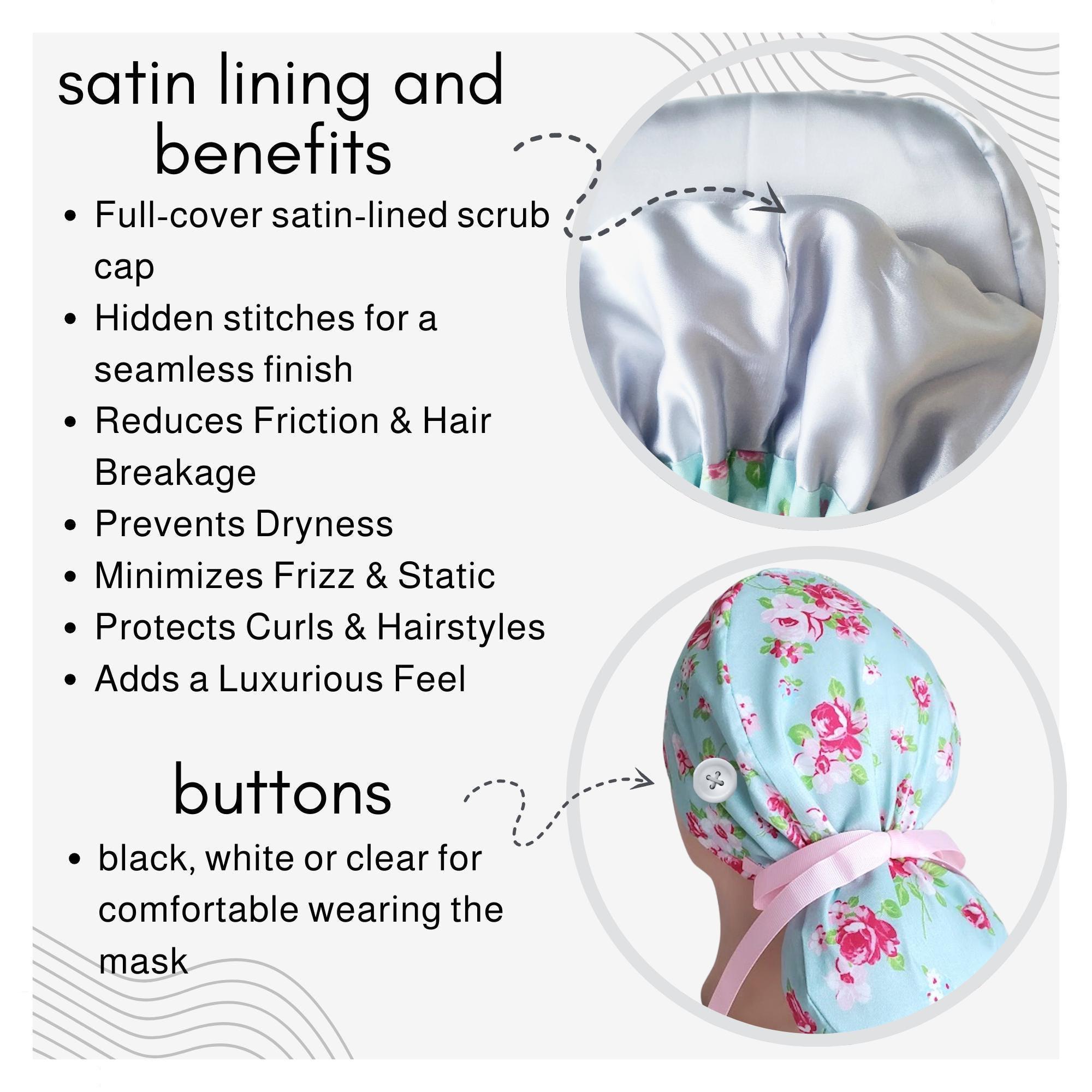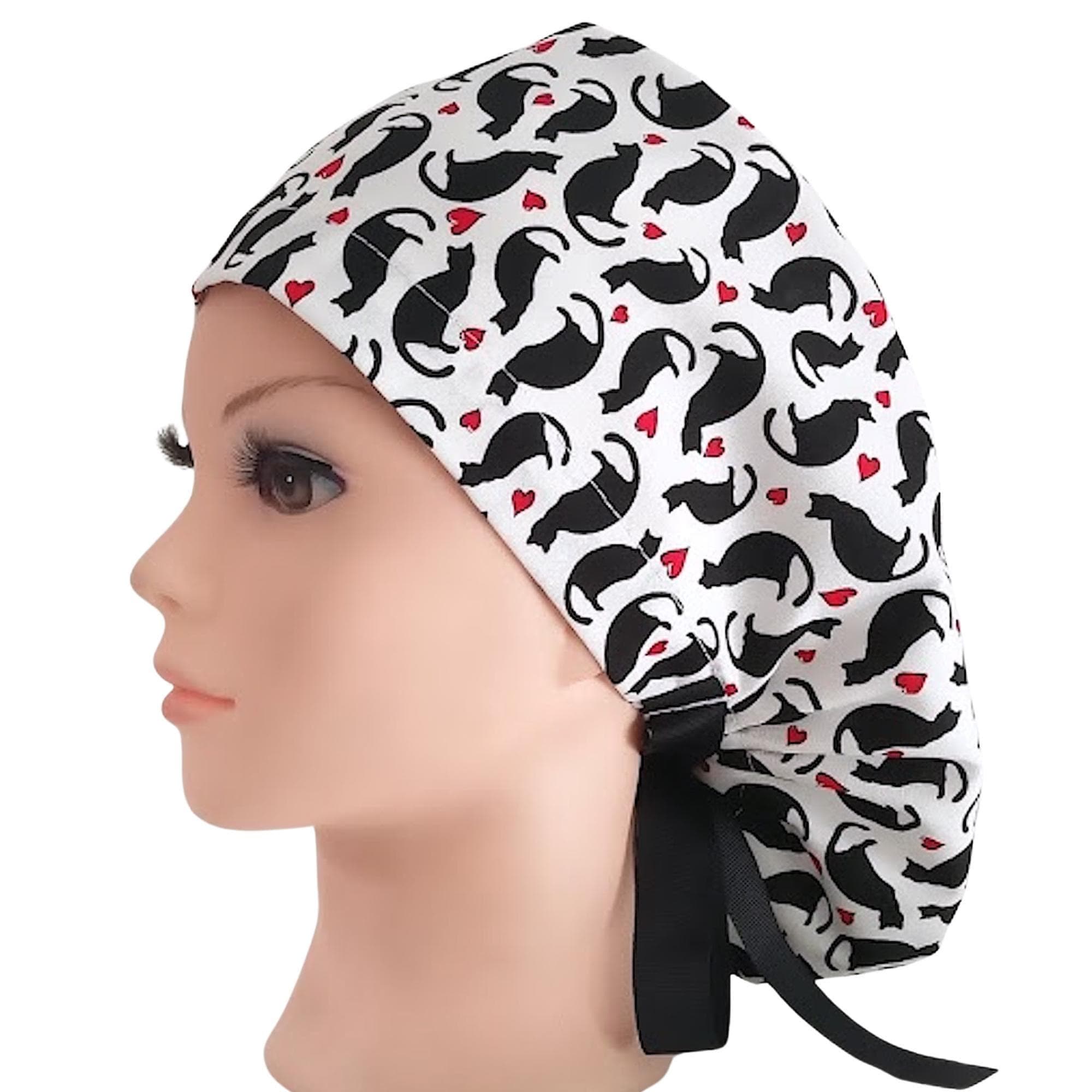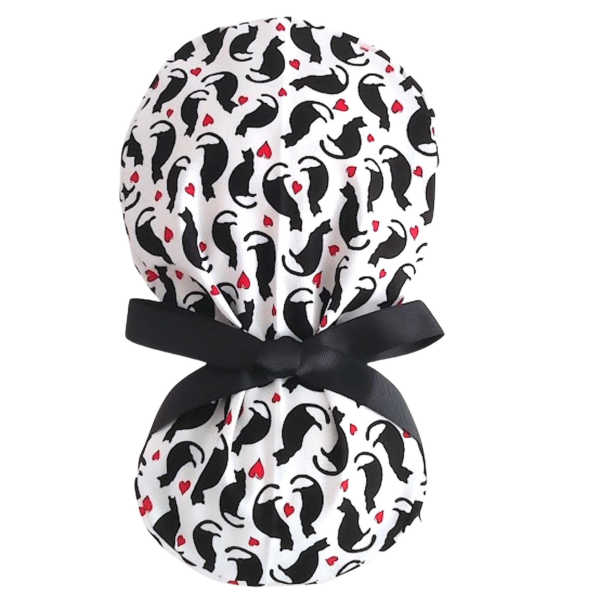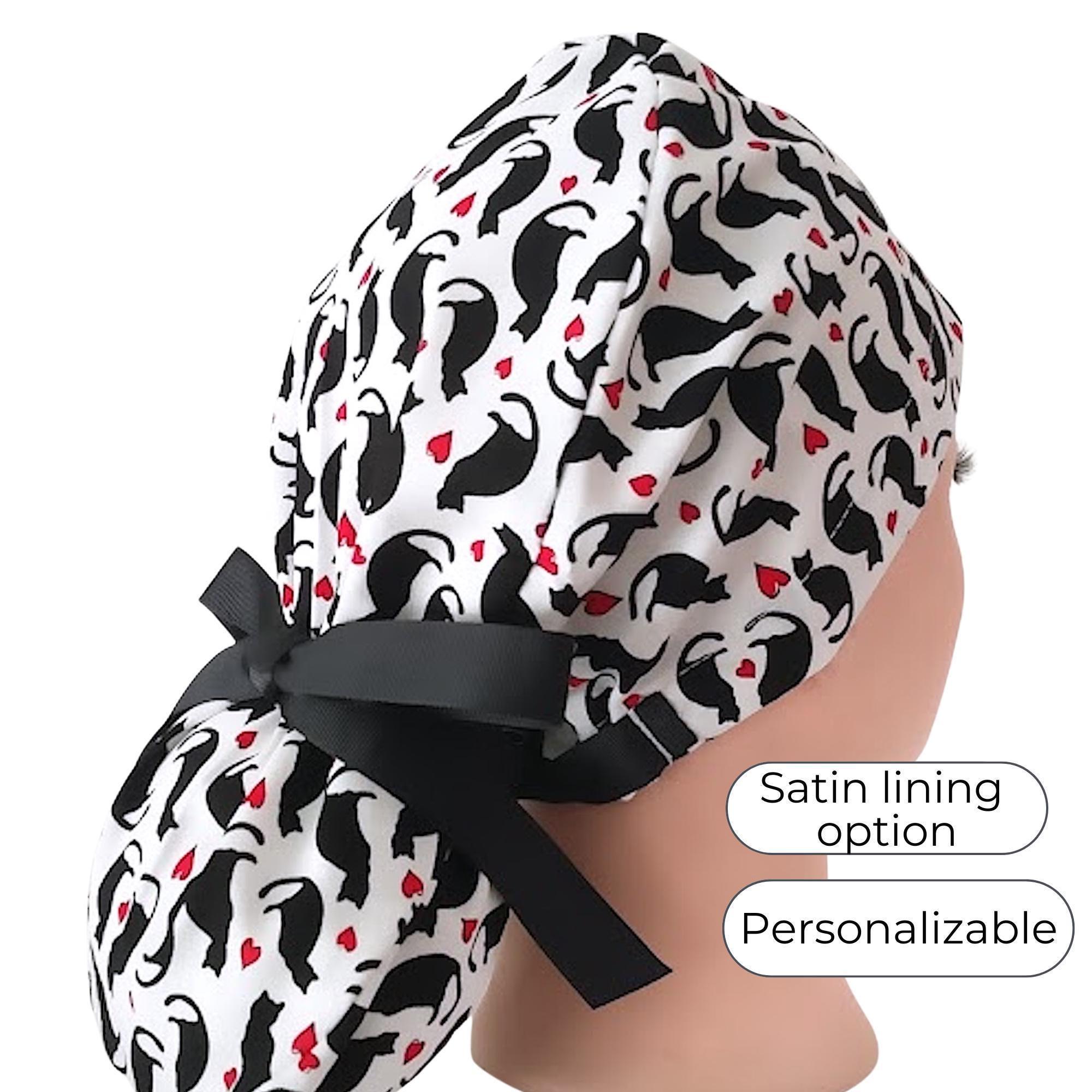 Add a playful yet practical touch to your work wardrobe with this black cat scrub cap featuring charming red hearts. Designed as a ponytail cap, it effortlessly accommodates long or thick hair, making it a favorite among nurses and veterinary professionals alike. Crafted with care, this cute scrub hat combines style and function, while the optional satin lining helps protect your hair from breakage during long shifts.