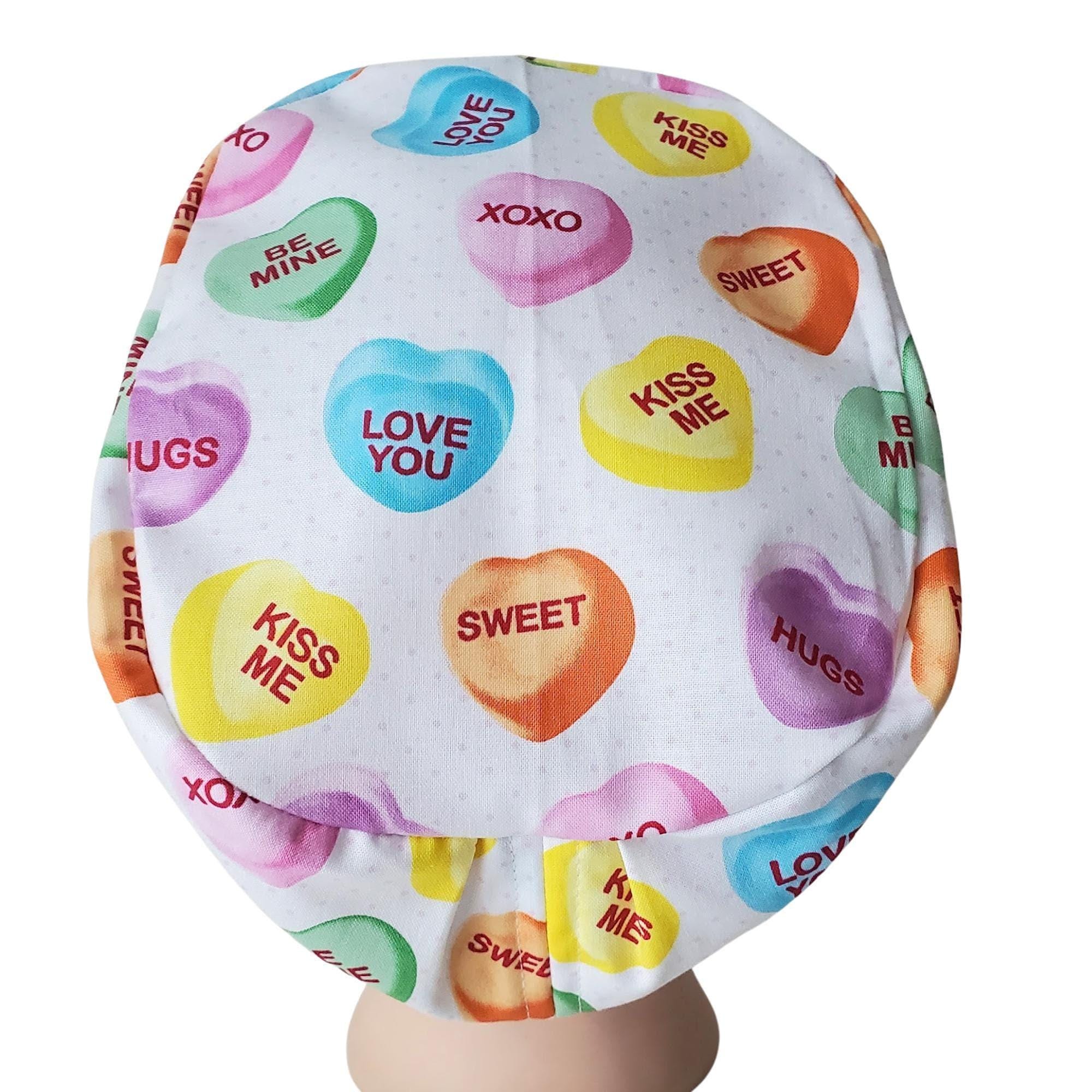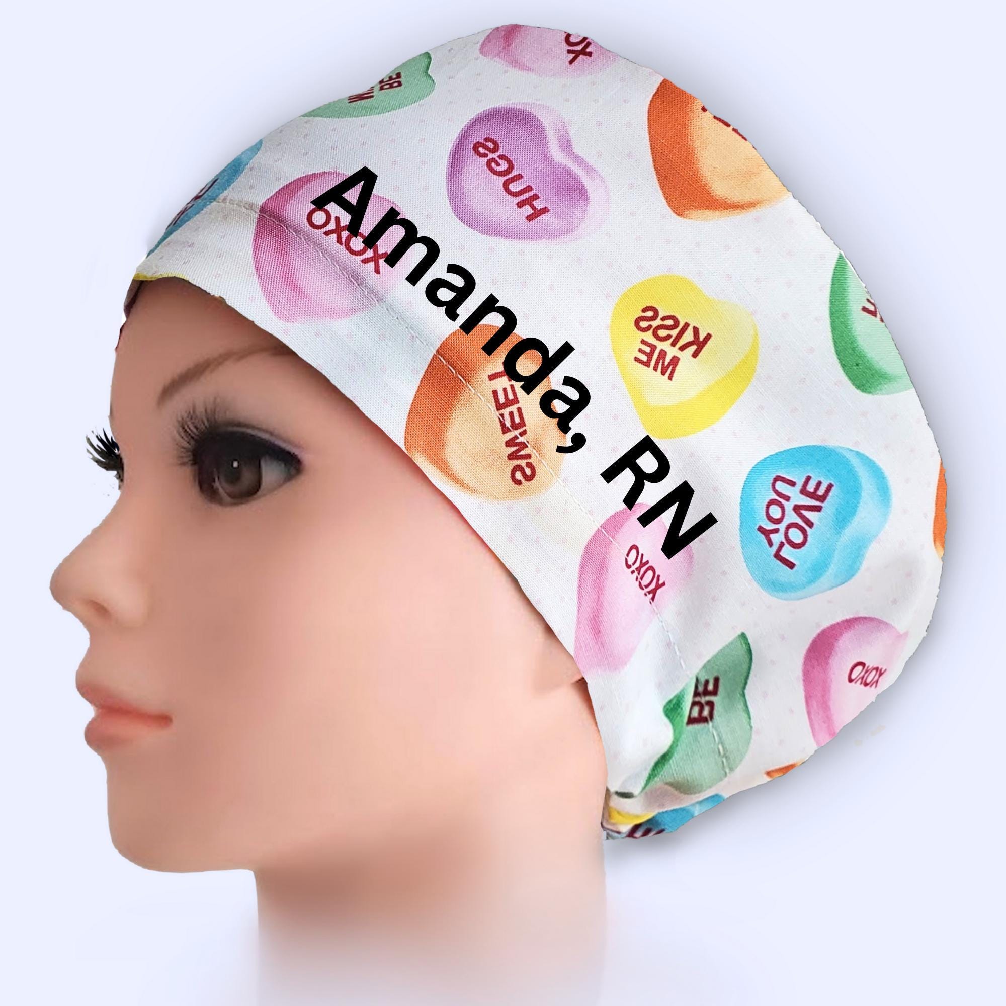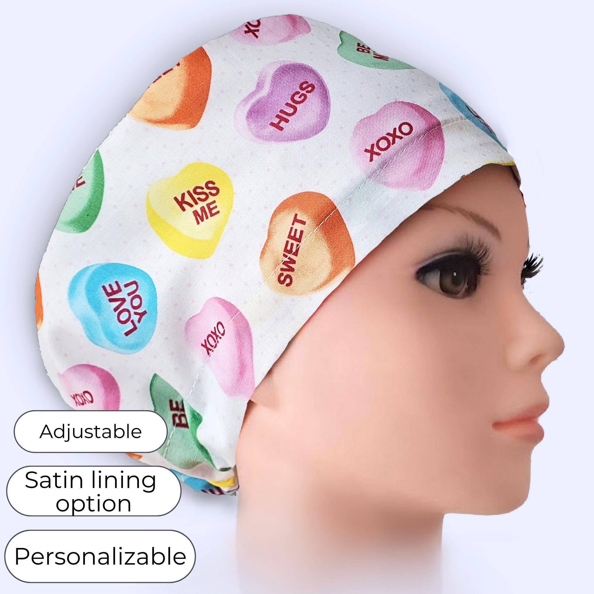 Celebrate your unique style with this charming scrub hat featuring a delightful candy heart pattern, perfect for brightening up your workday. Designed with the versatile euro scrub cap fit, it ensures comfort and professionalism for every nurse or medical professional. The satin lined cap adds a touch of luxury by protecting your hair while you focus on caring for others.