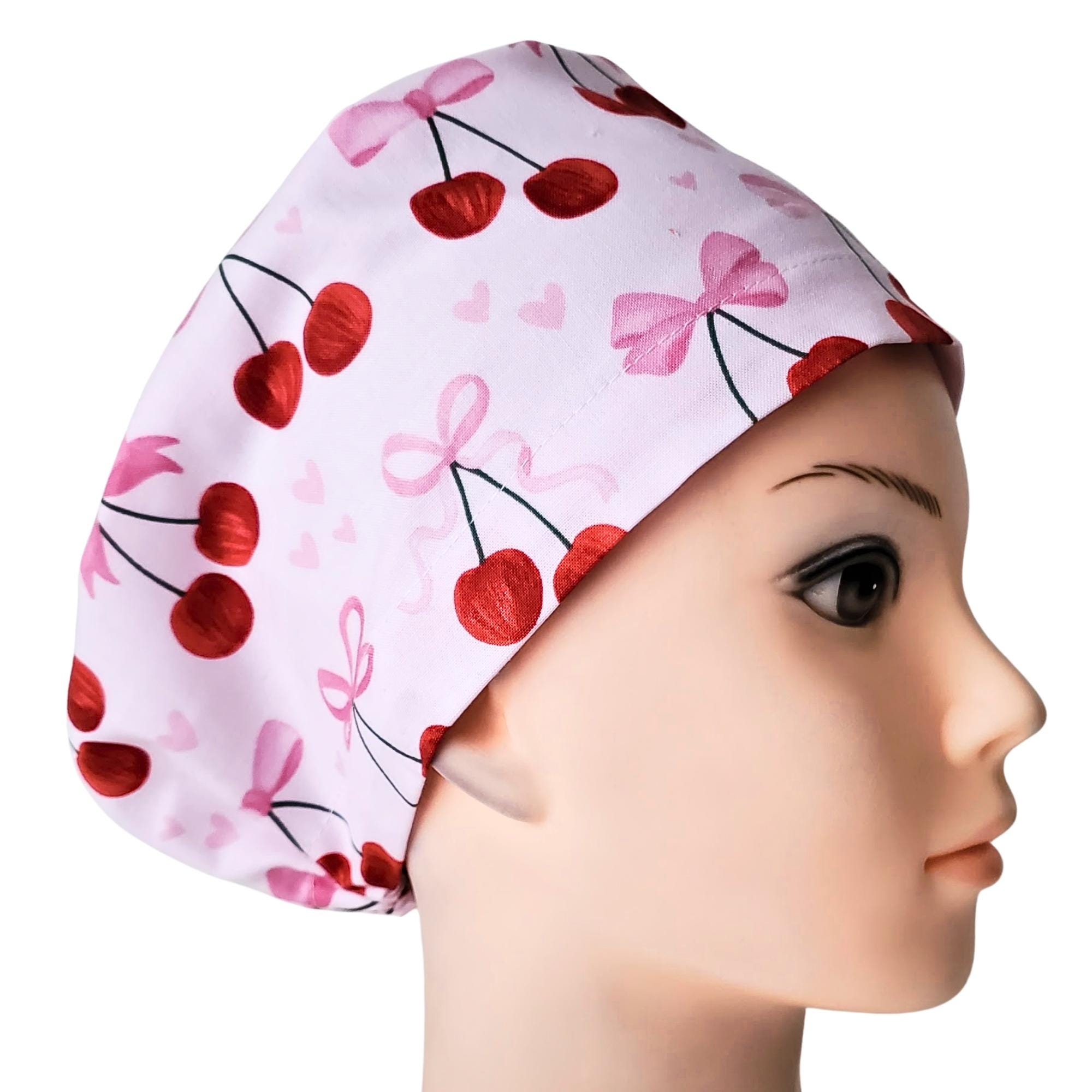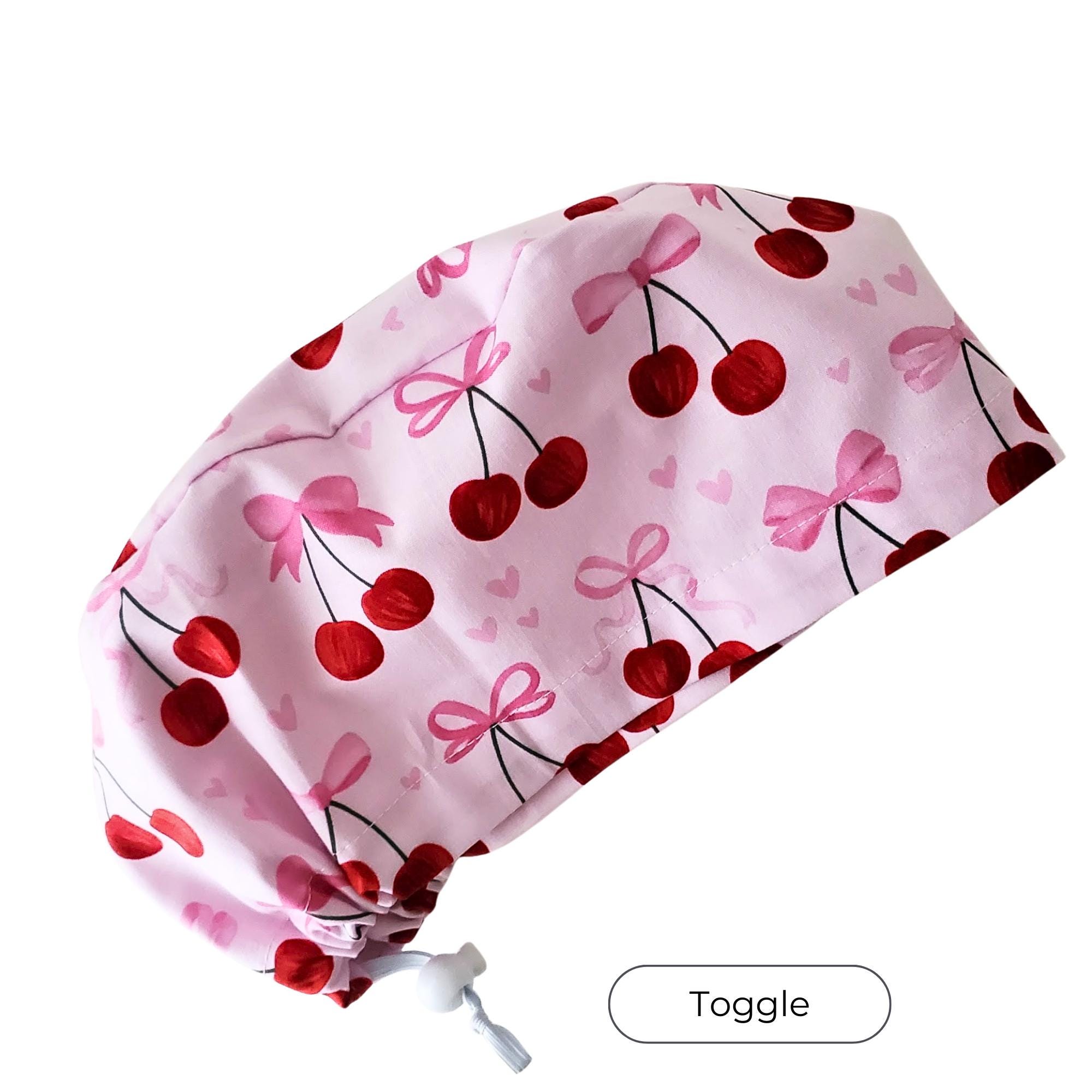 Pattern: A playful Valentine-inspired cherry and heart print on a soft pink background, blending sweetness with a polished medical aesthetic.